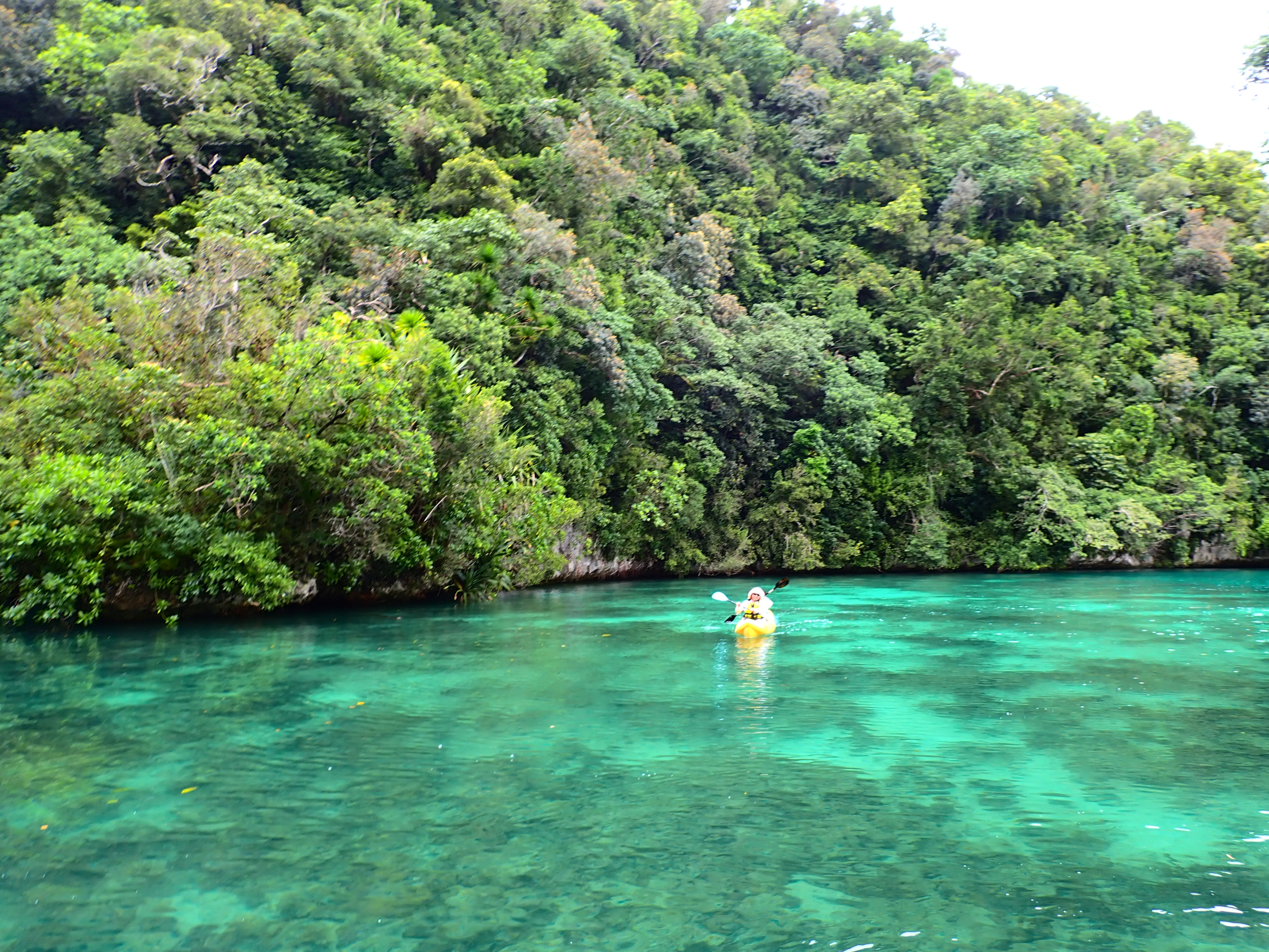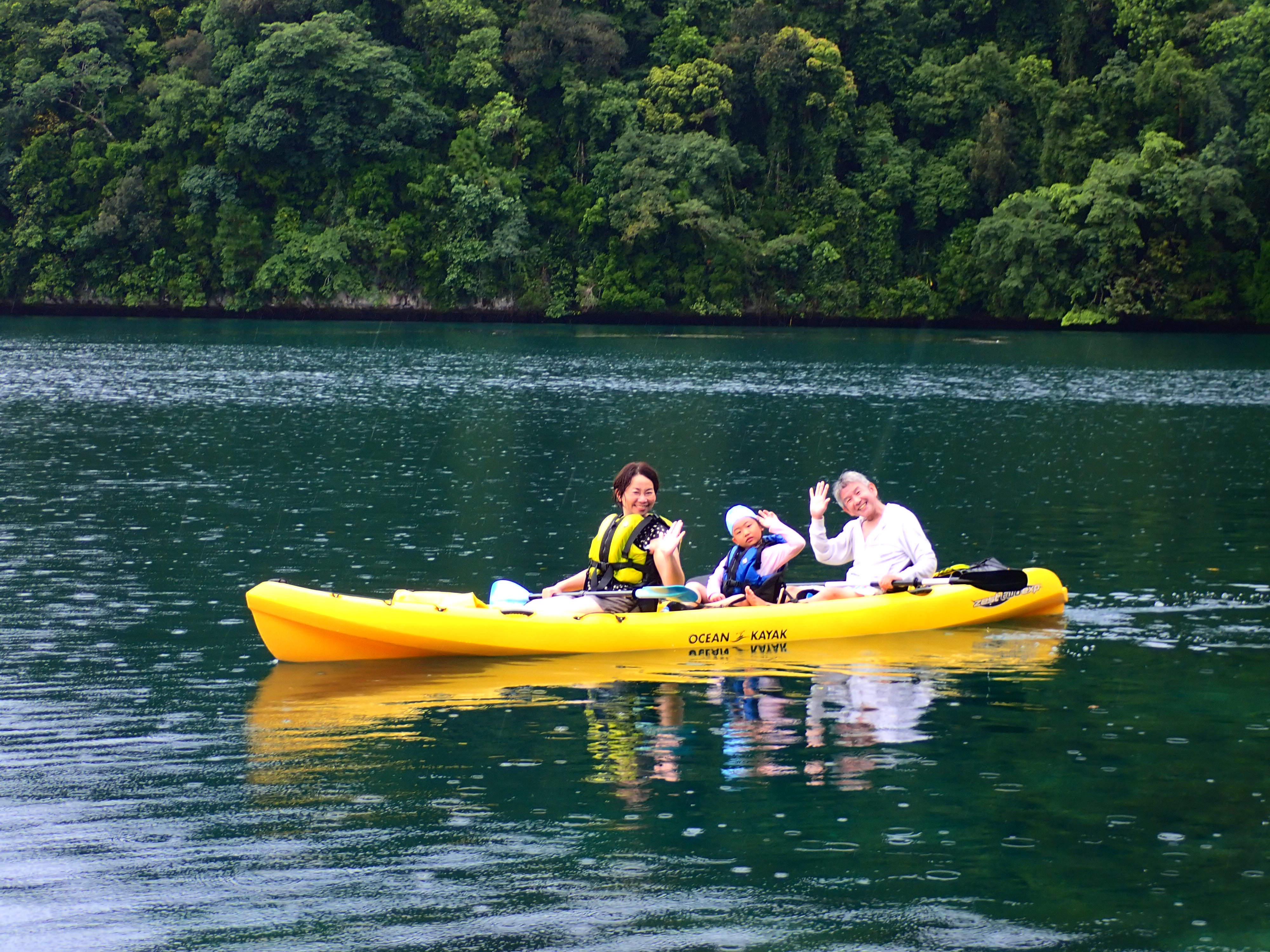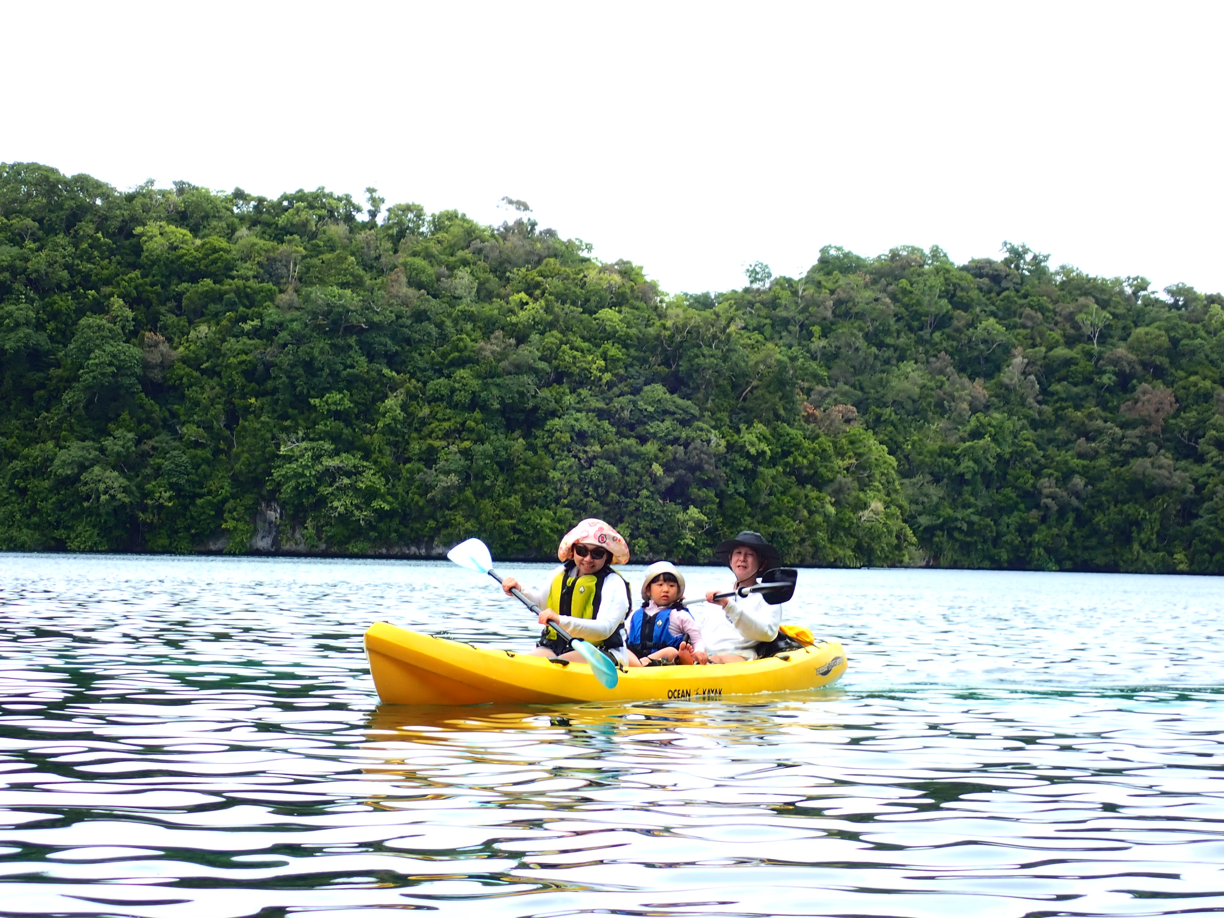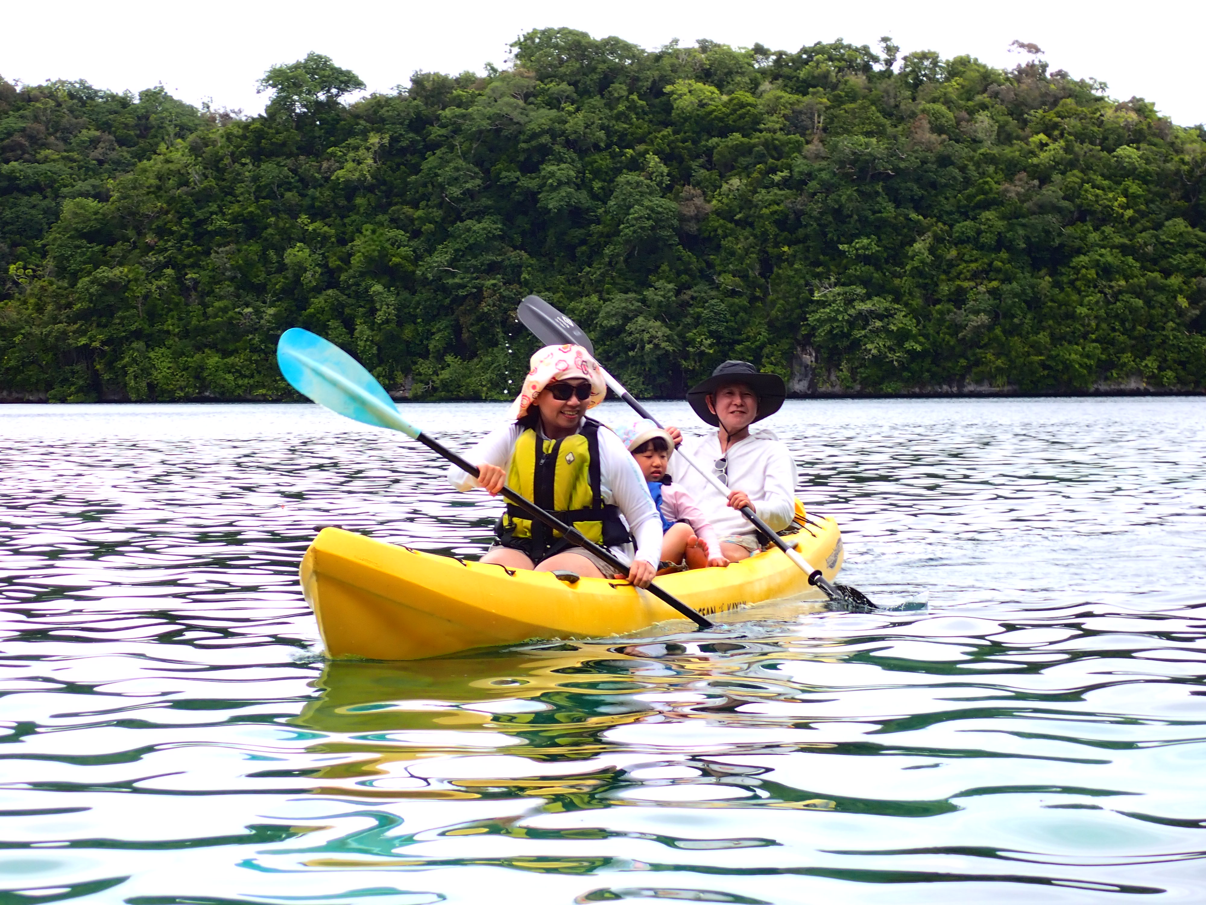 今日は久しぶりのファミリーでのご参加のゲスト。先ずは記念撮影して、港でパドリング練習。カヤックは初めてとの事でしたが、出だしは好調。パラオ松島をゆっくりと漕ぎ出します。