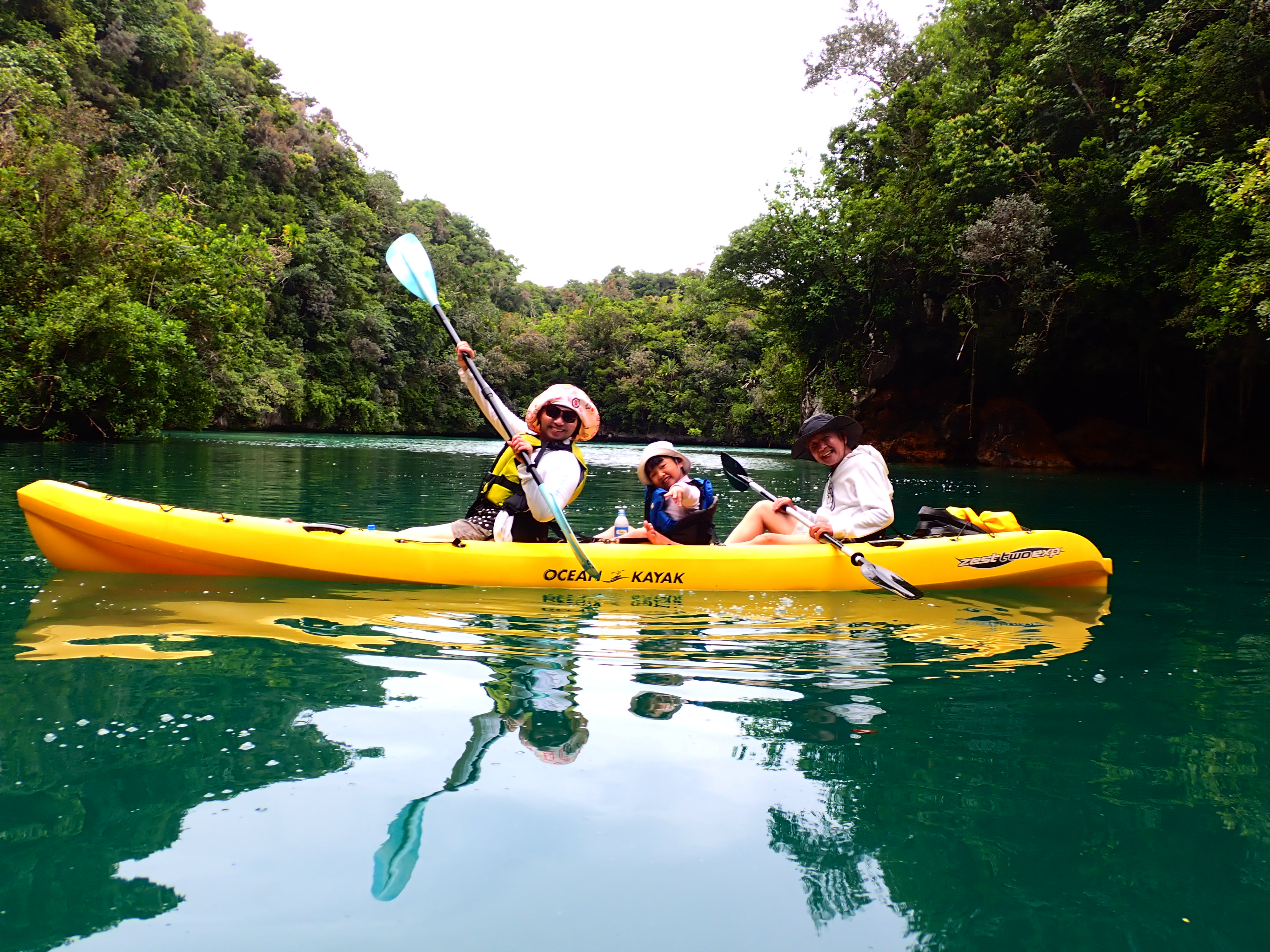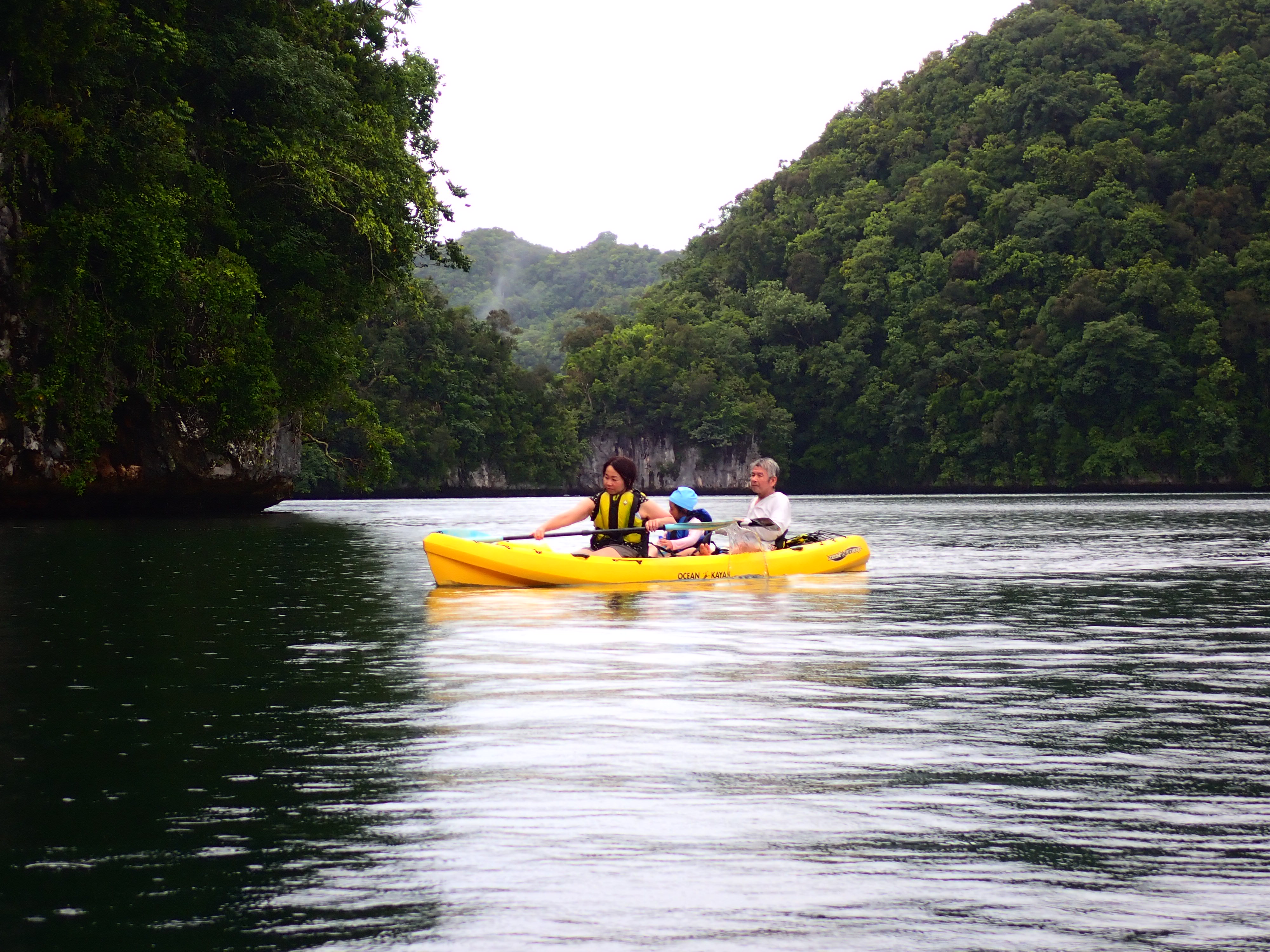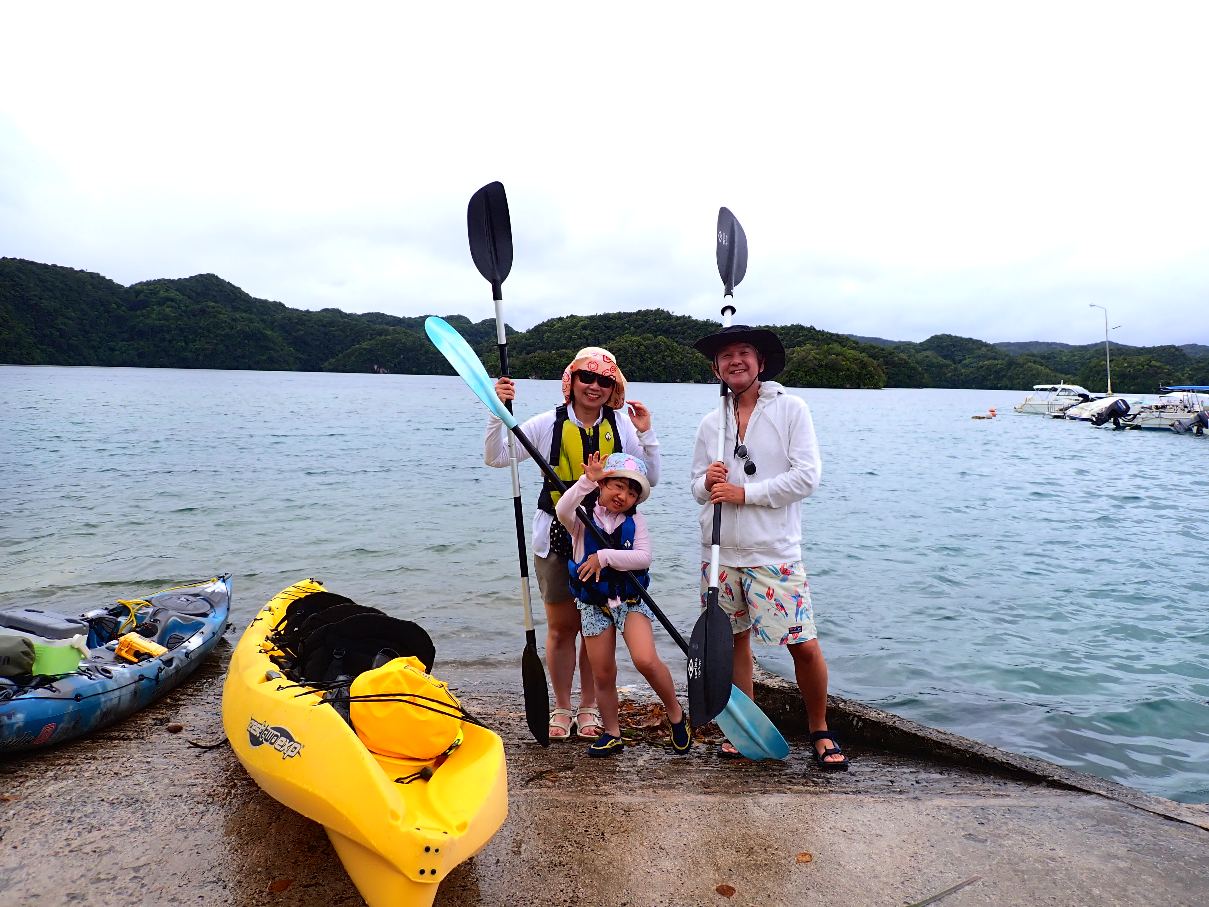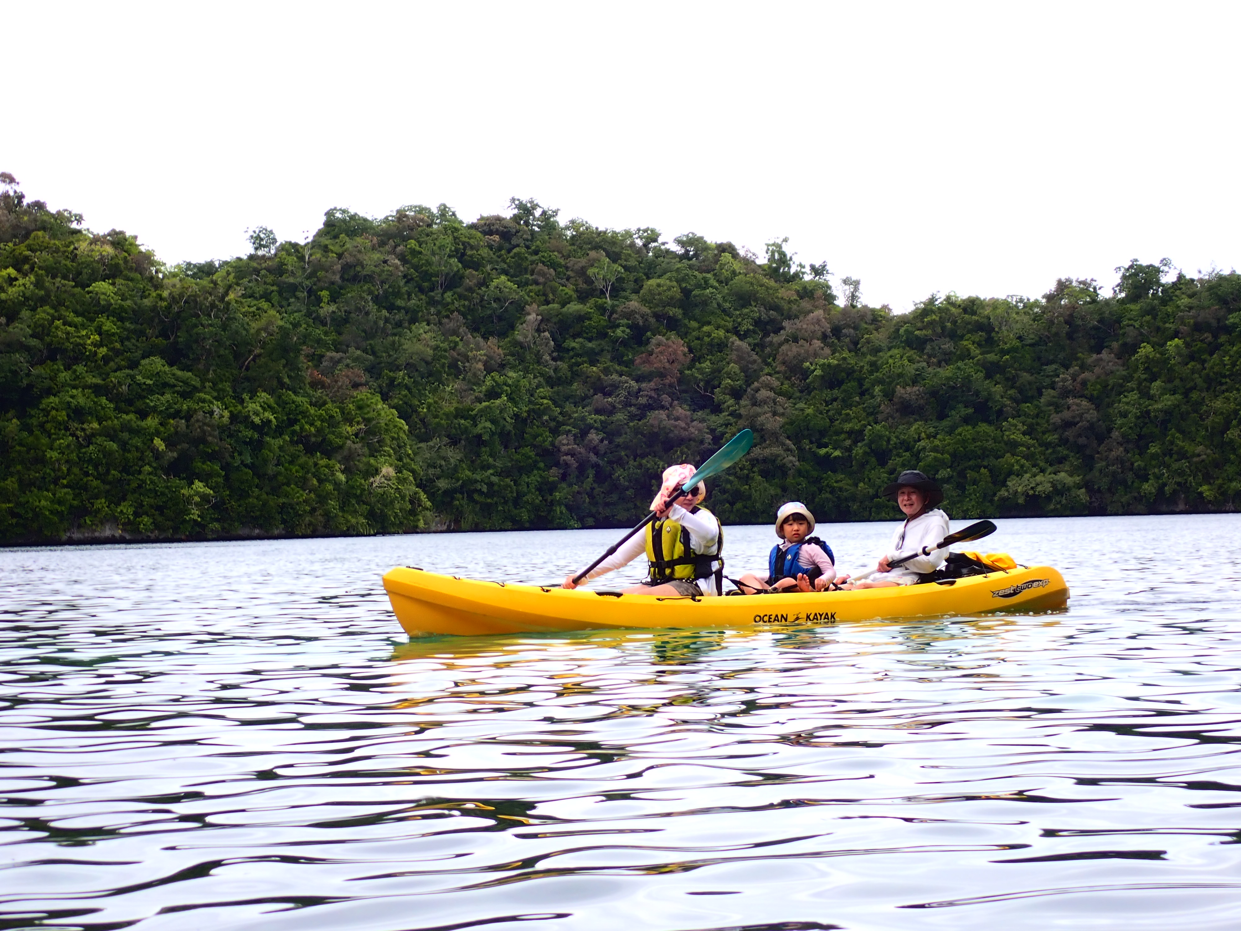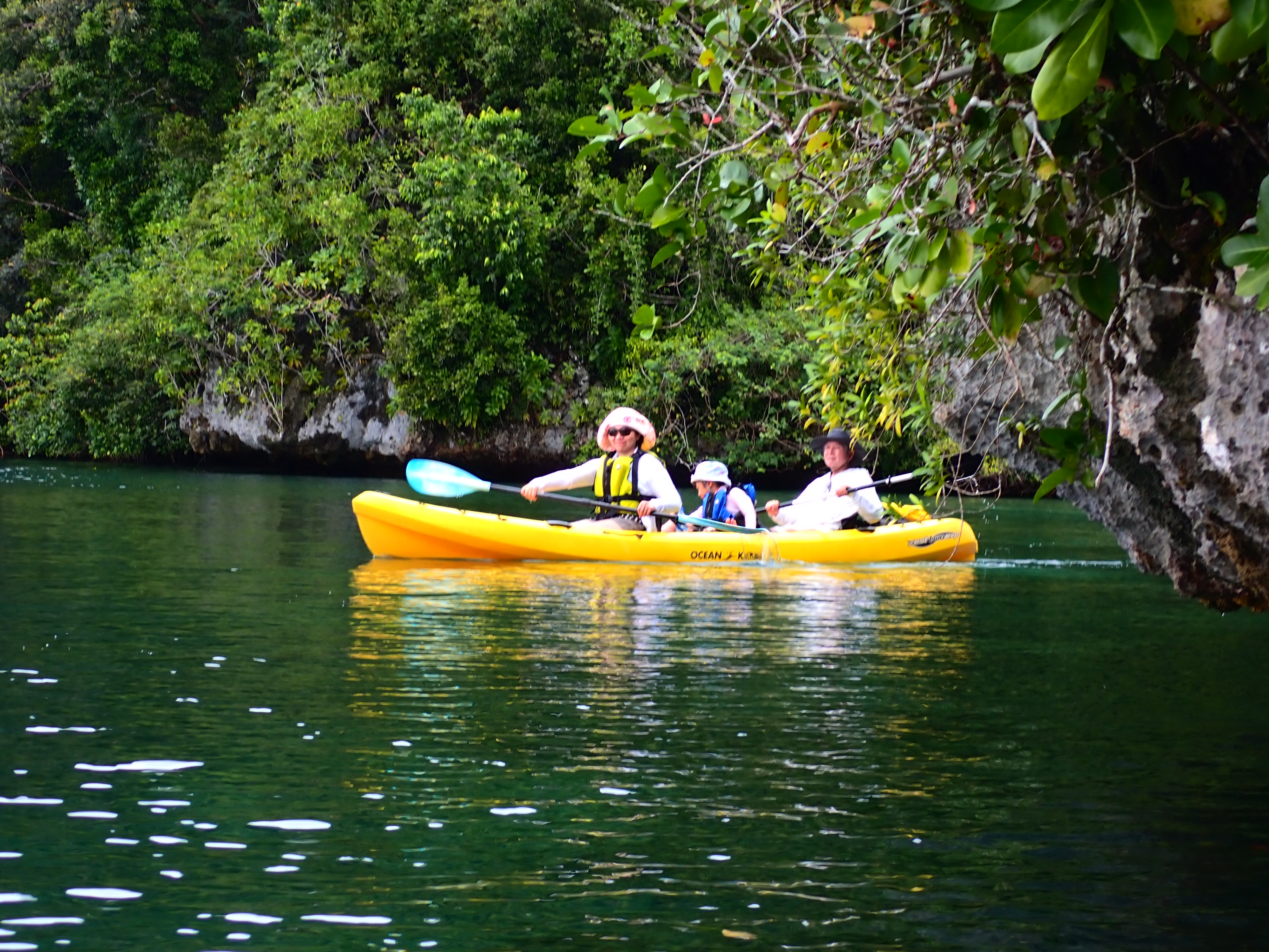 今日は久しぶりのファミリーでのご参加のゲスト。先ずは記念撮影して、港でパドリング練習。カヤックは初めてとの事でしたが、出だしは好調。パラオ松島をゆっくりと漕ぎ出します。