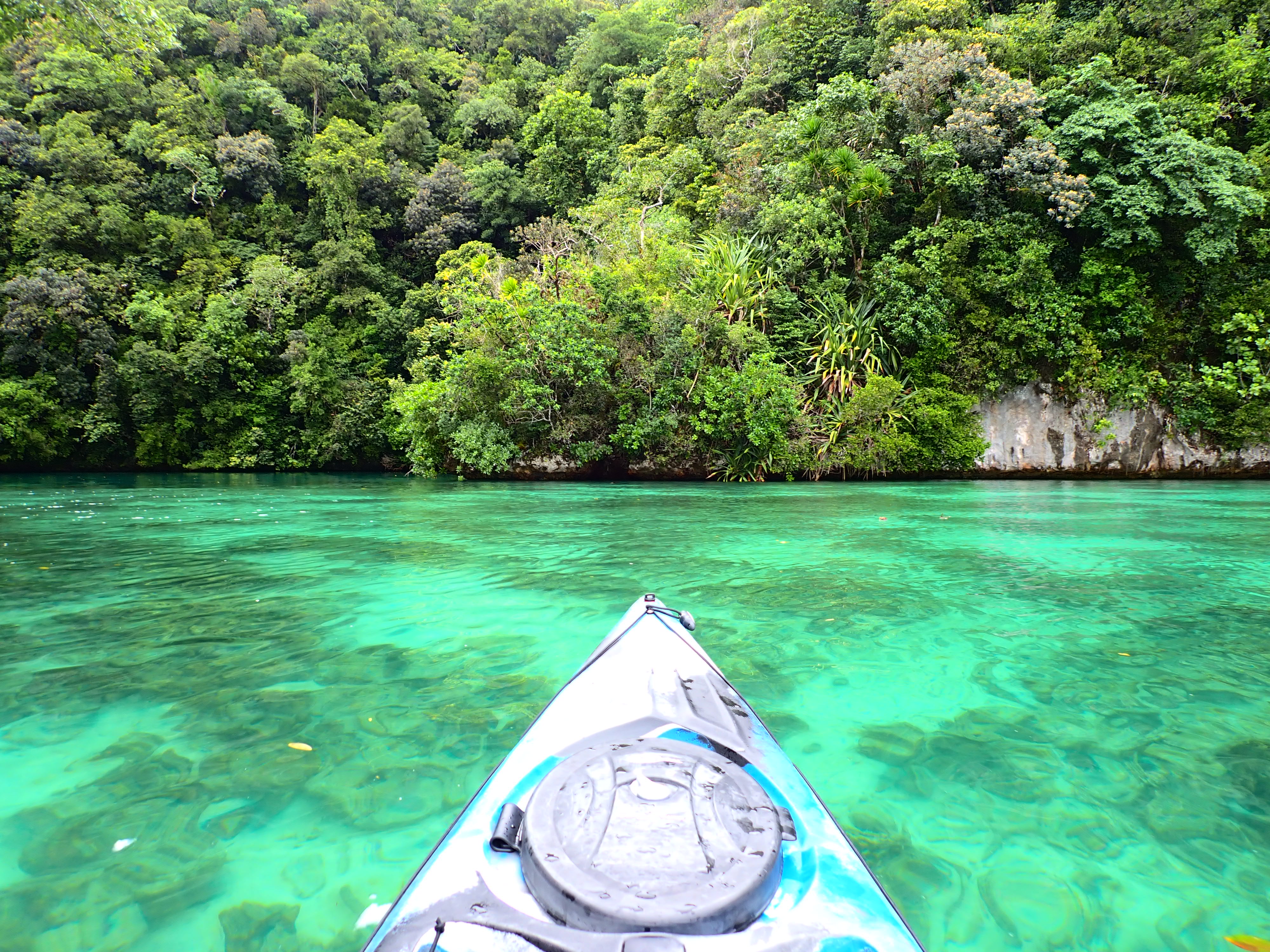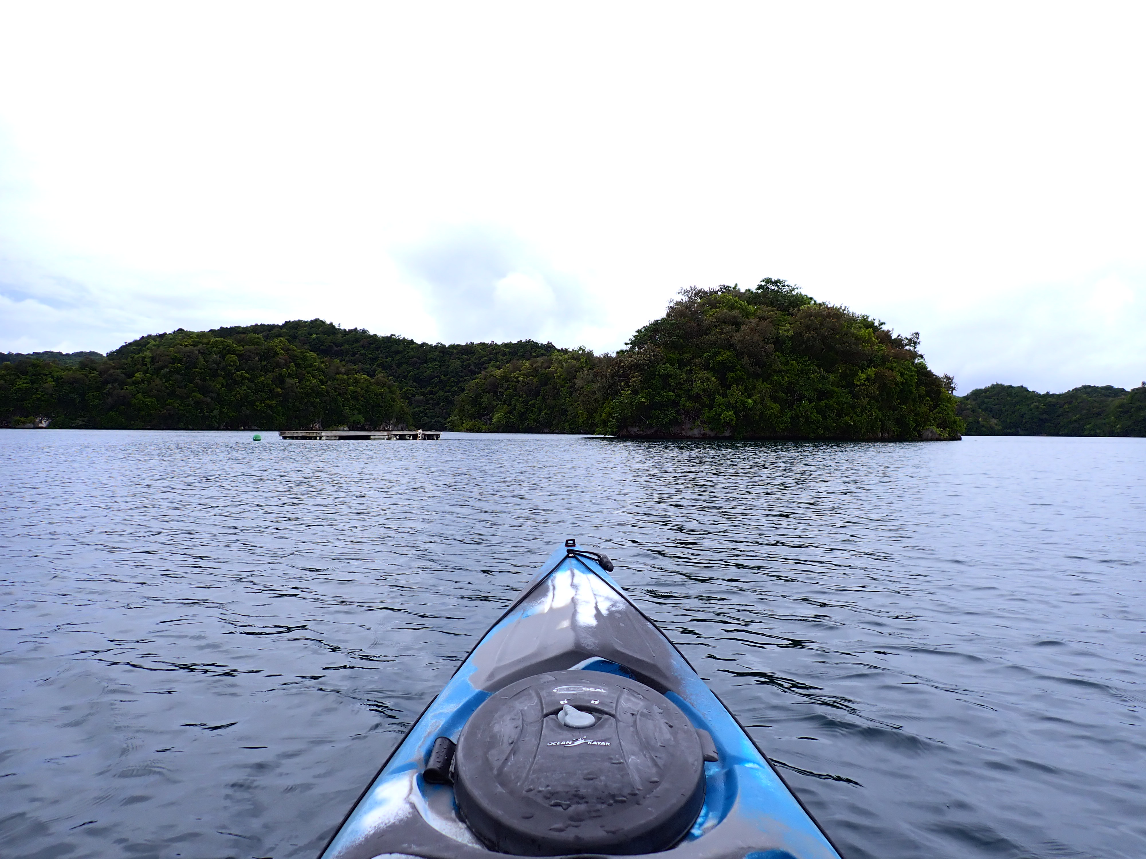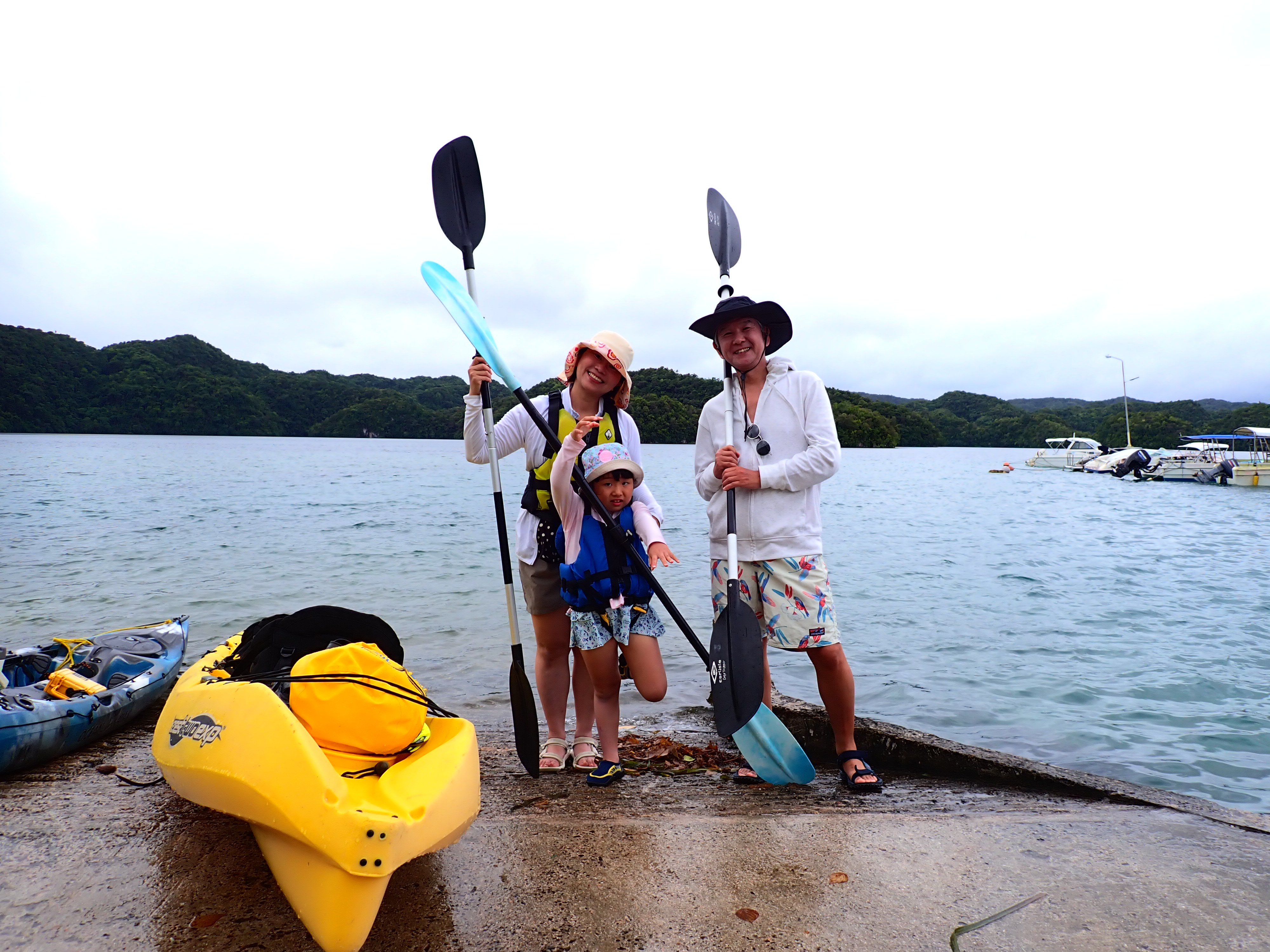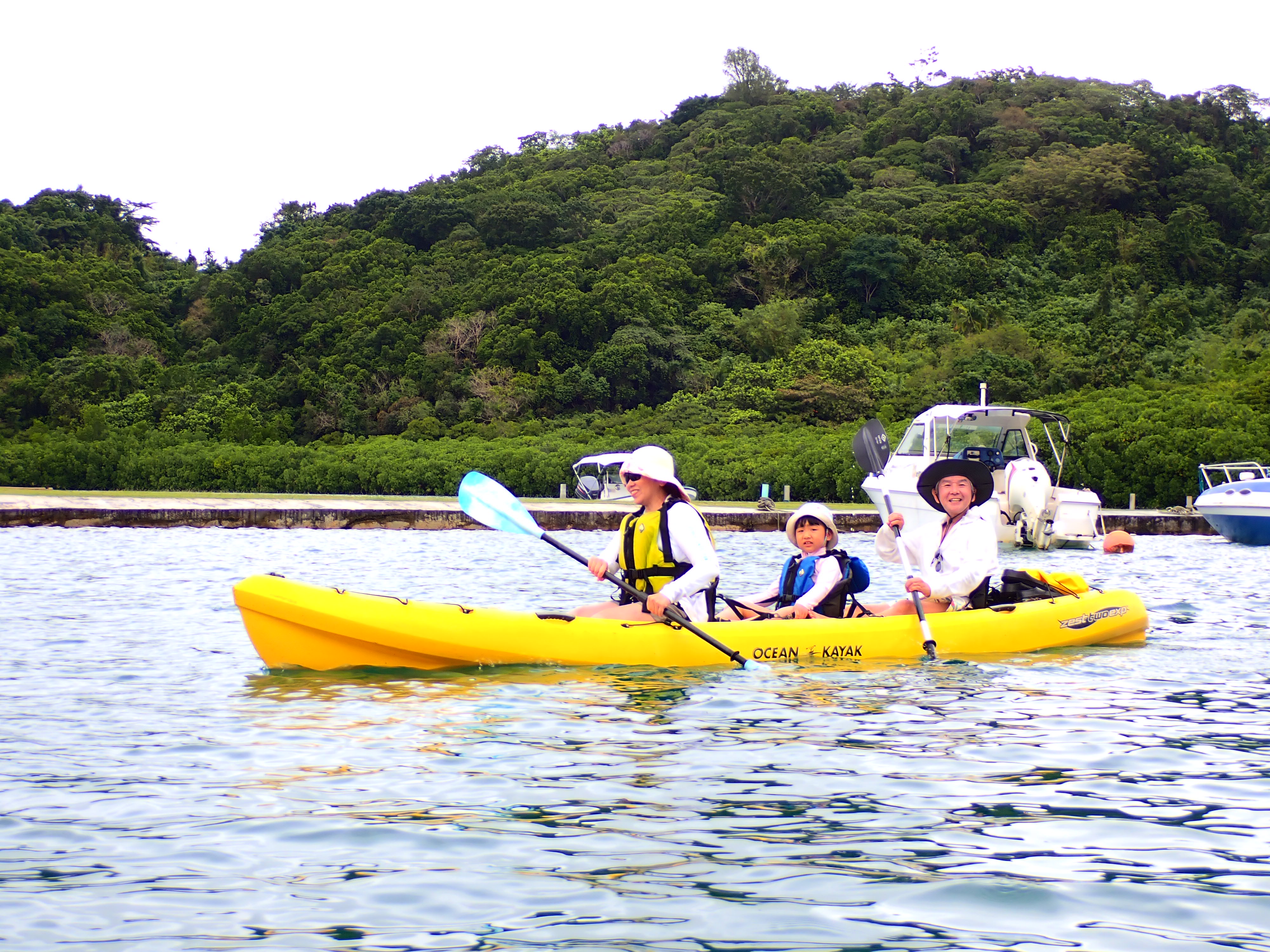 今日は久しぶりのファミリーでのご参加のゲスト。先ずは記念撮影して、港でパドリング練習。カヤックは初めてとの事でしたが、出だしは好調。パラオ松島をゆっくりと漕ぎ出します。
