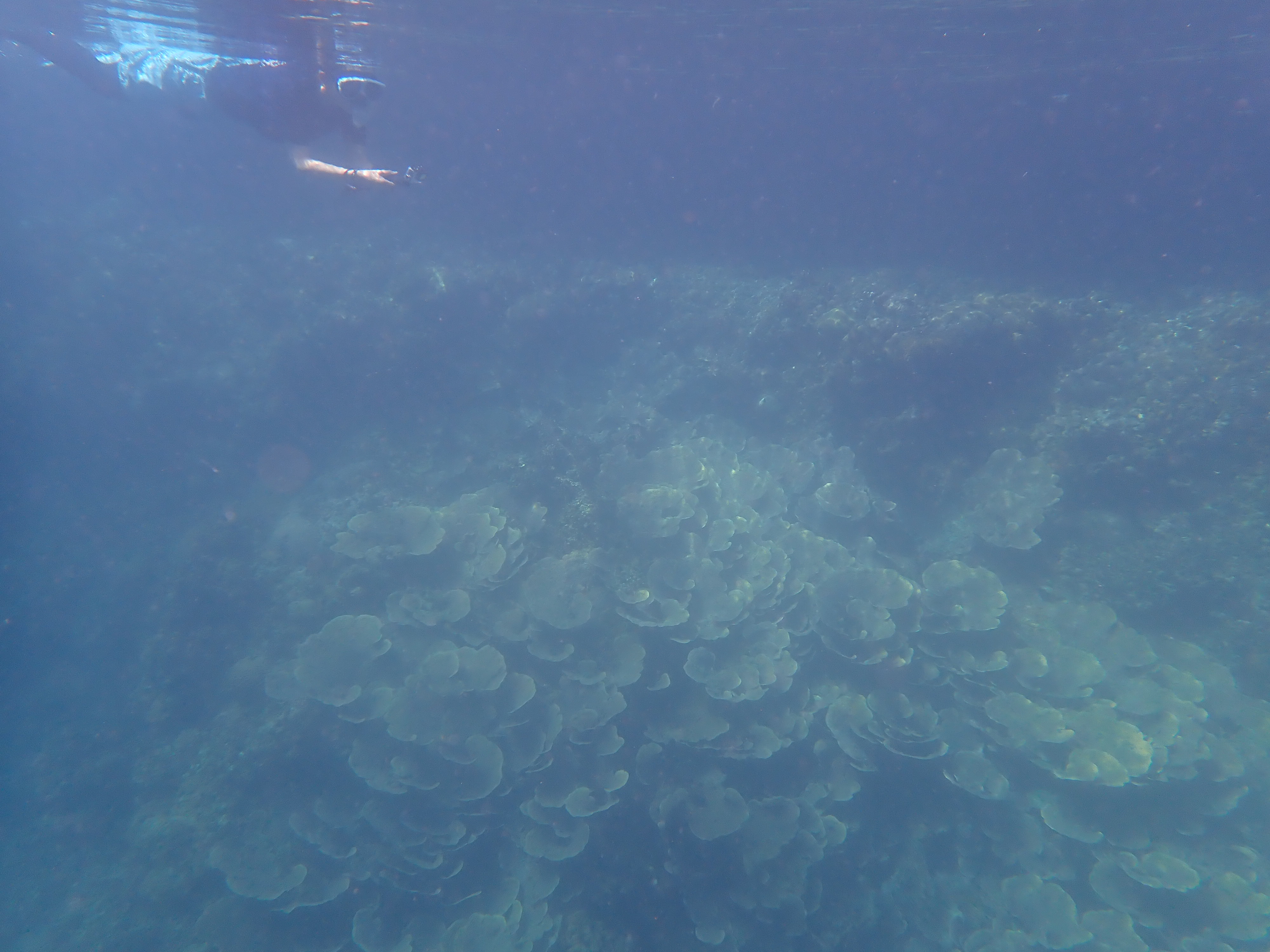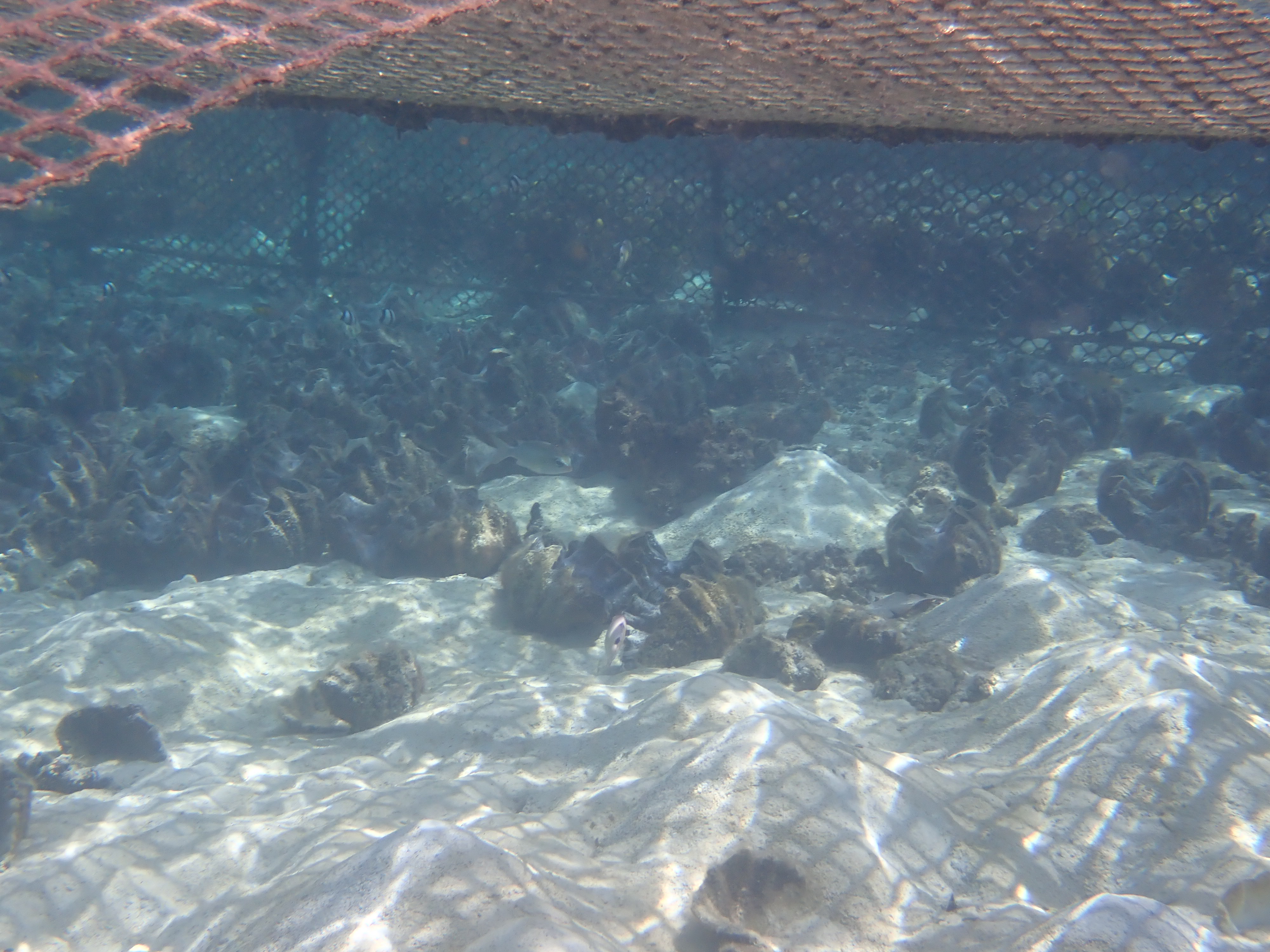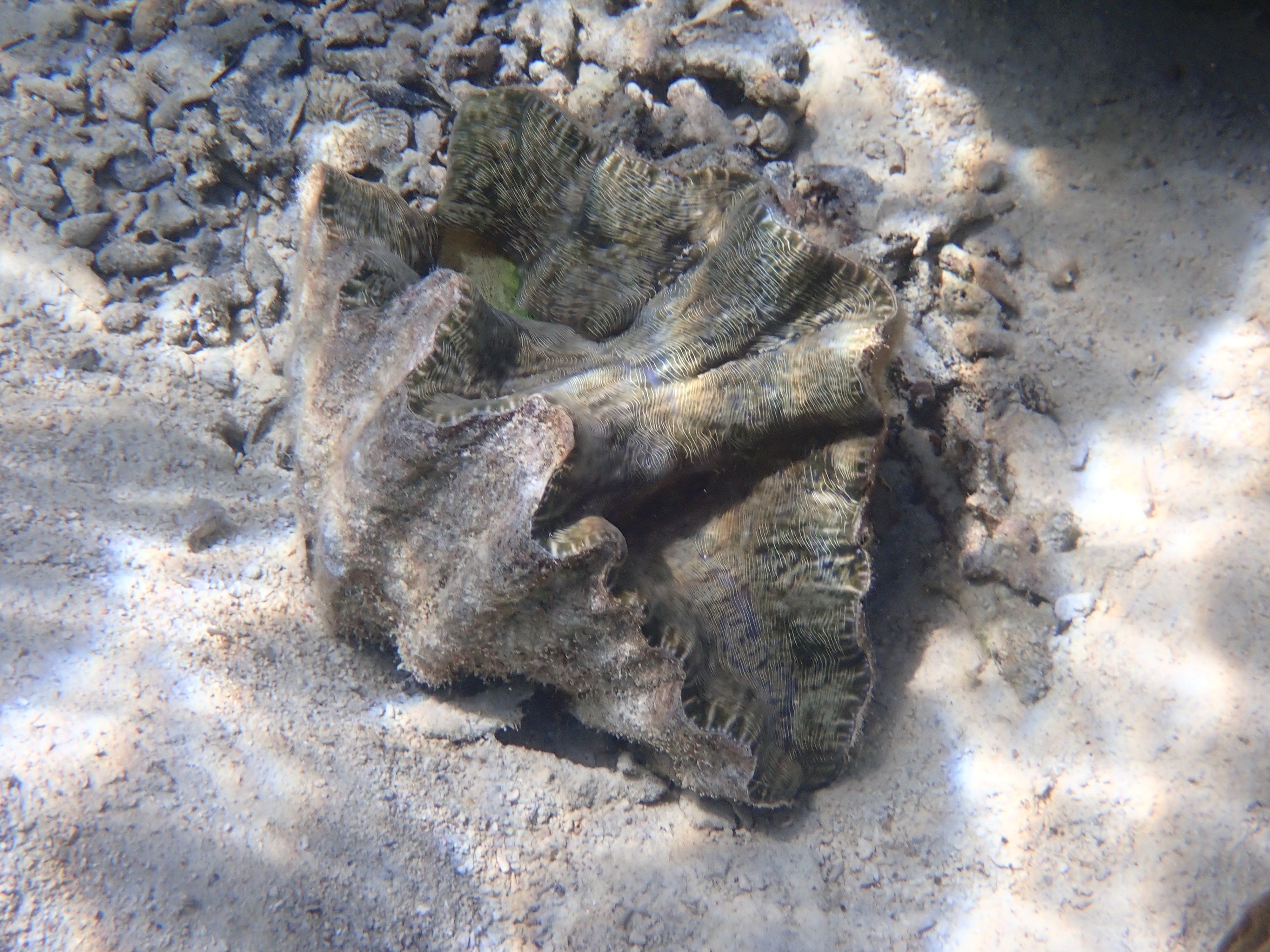 カヤックから降りて、さっそくひと泳ぎ。地元ローカルの海中シャコガイファームをプチ社会科見学。シャコガイを観察する時は足元に注意が必要です。