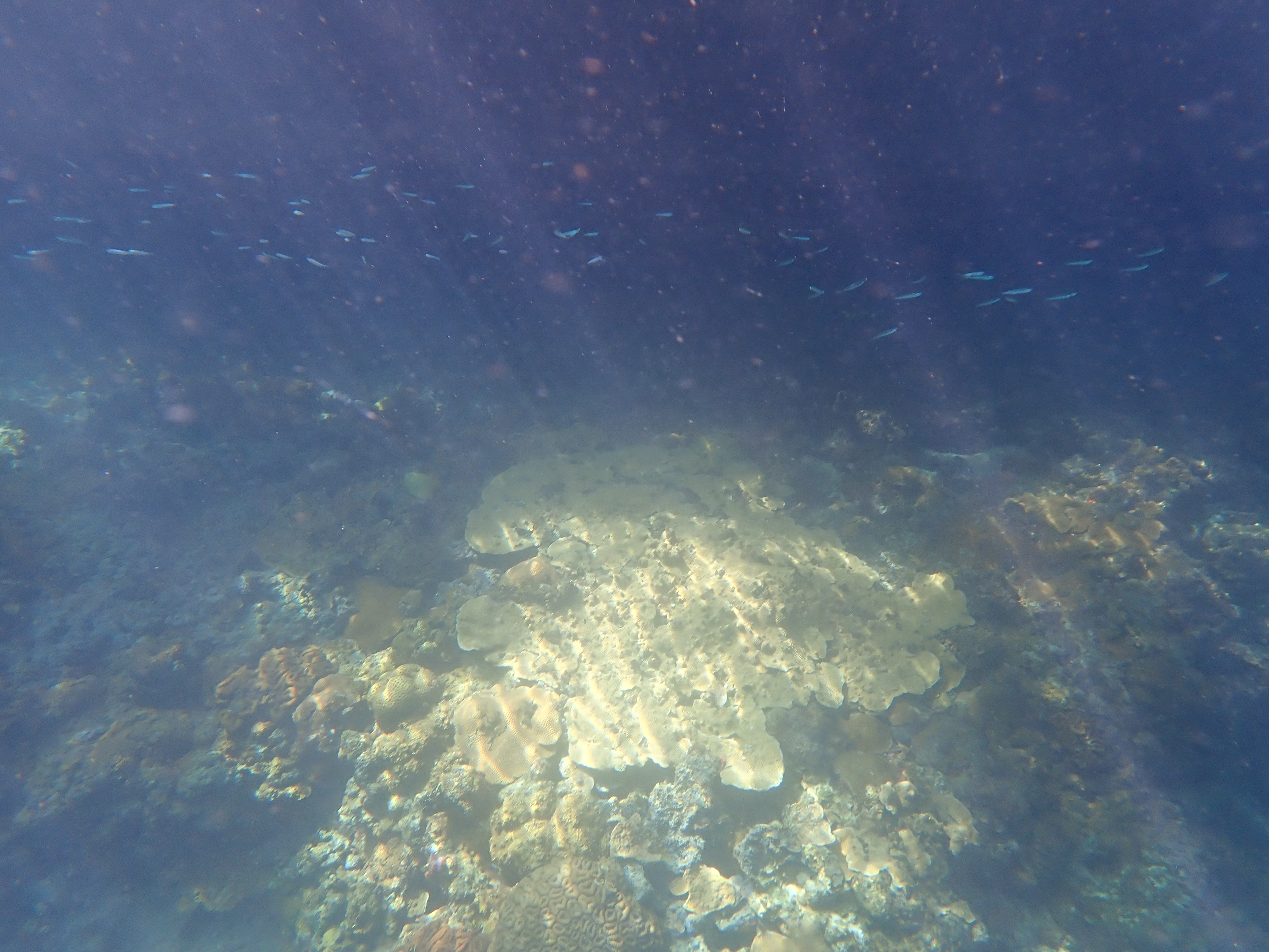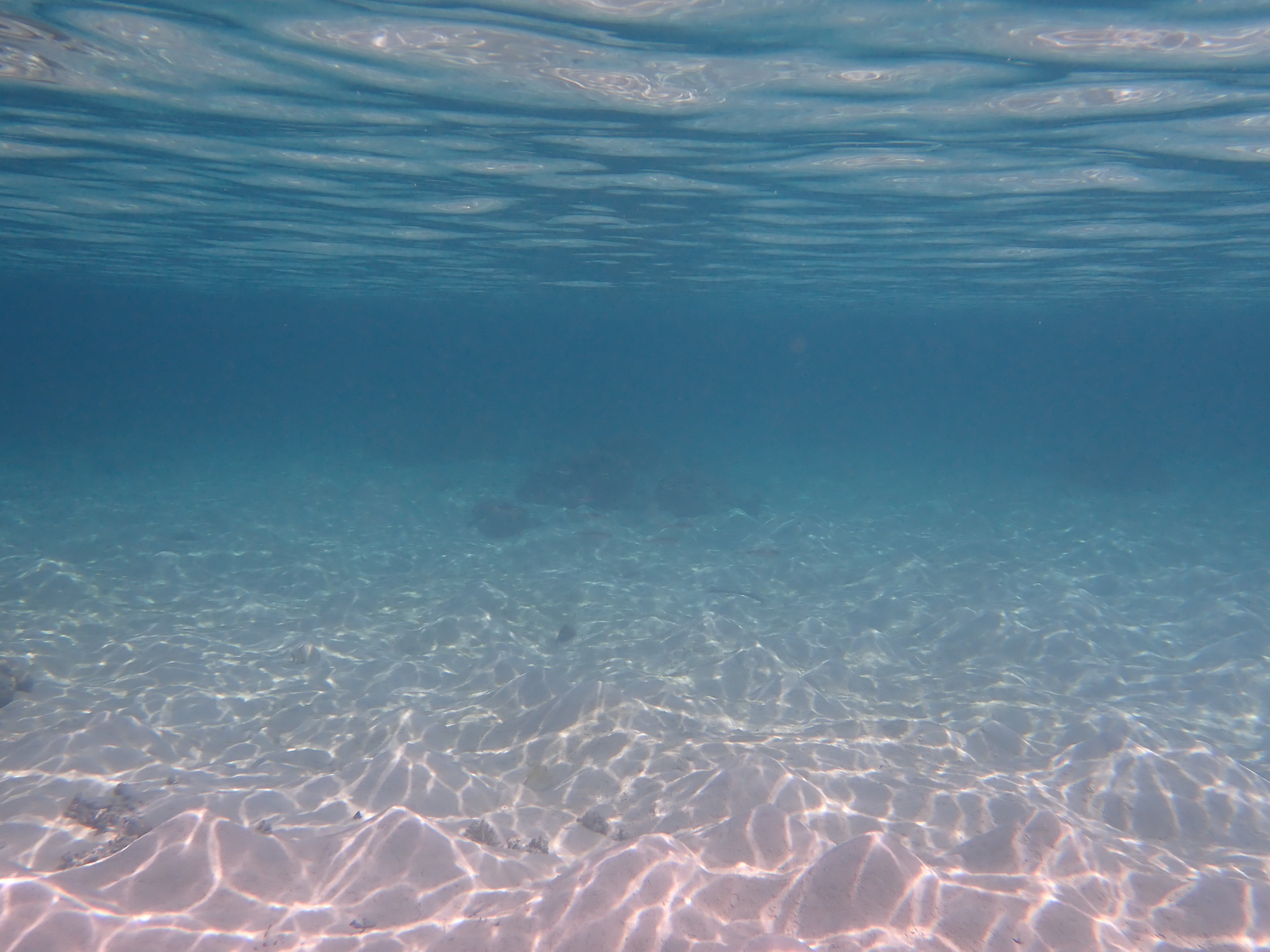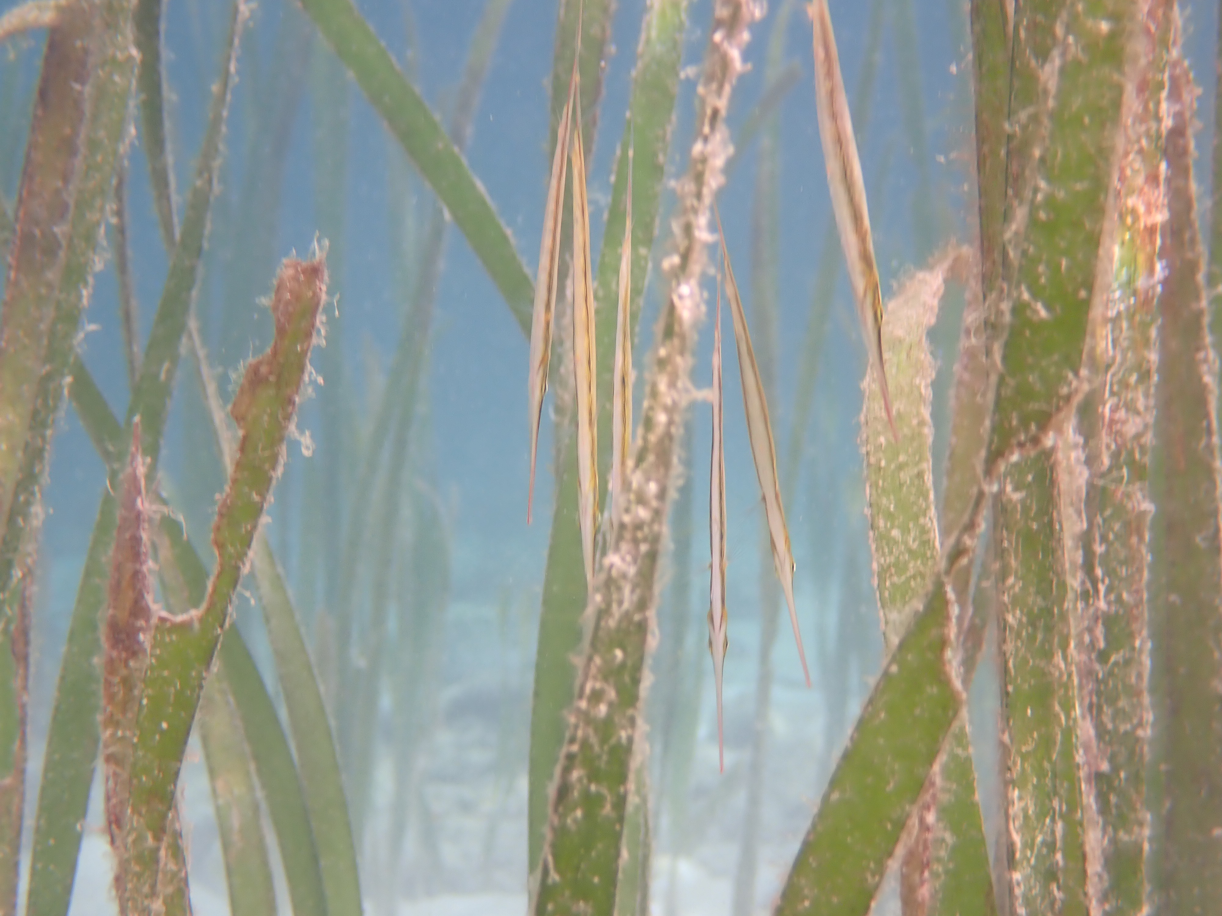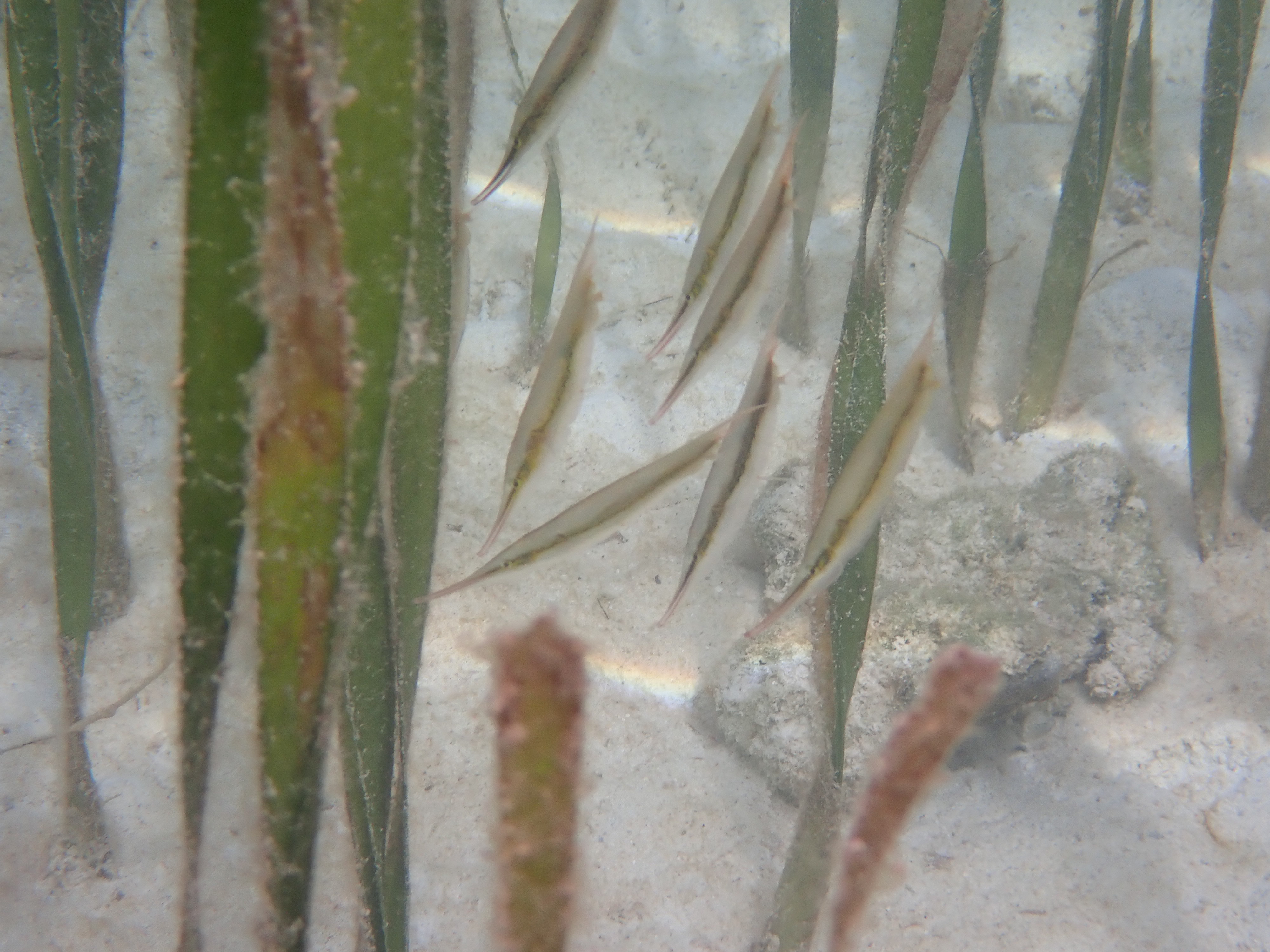 続いて浅瀬の砂地でのスノーケル。アマモ(海草)に擬態しているお魚が目当てです。写真でも見つけにくく、実際に海の中で見るとさらに見つけづらいヘコアユというこの魚。大きさは5~15cm程、今日見つけた群れは7cmぐらいでした。