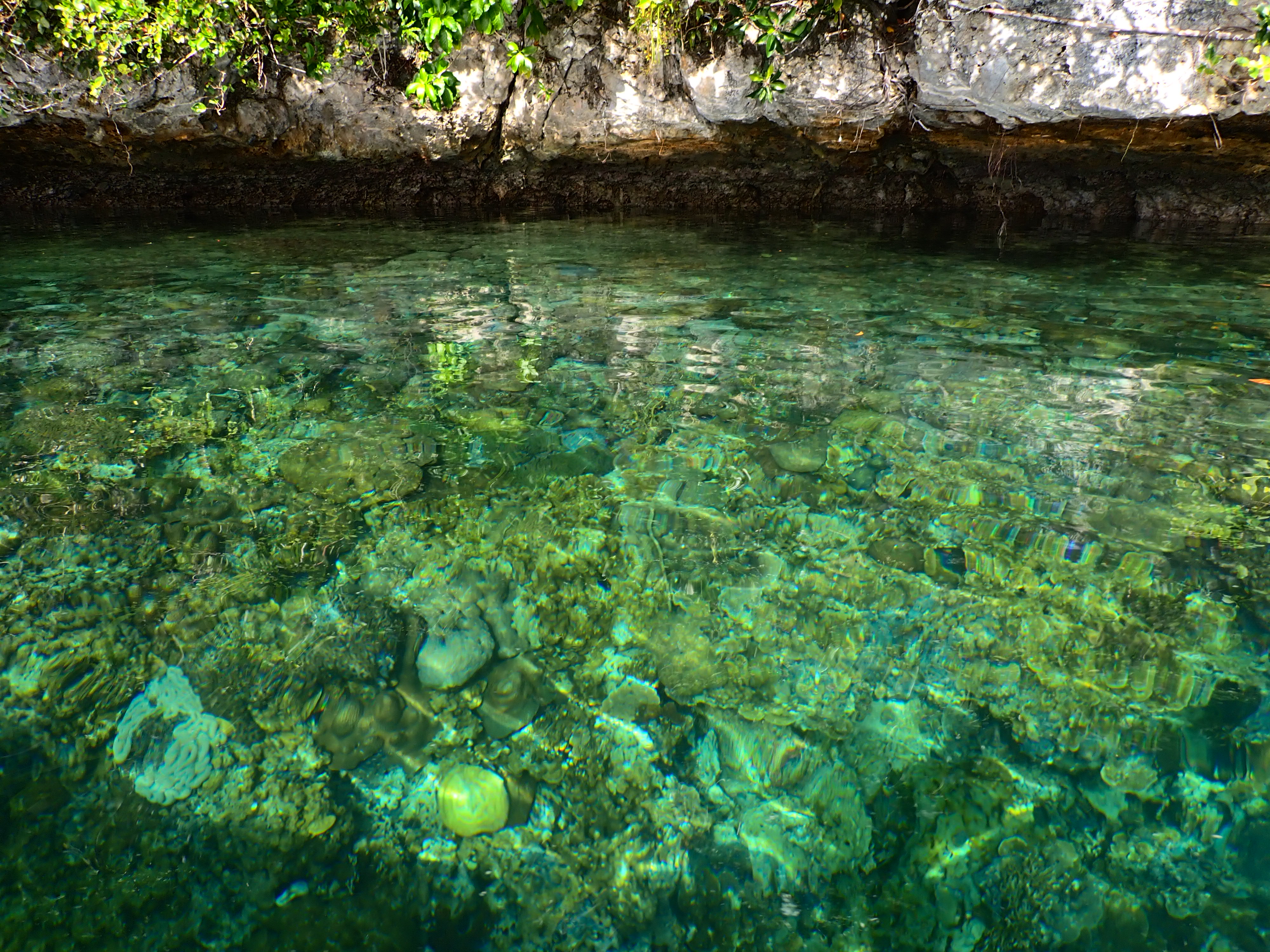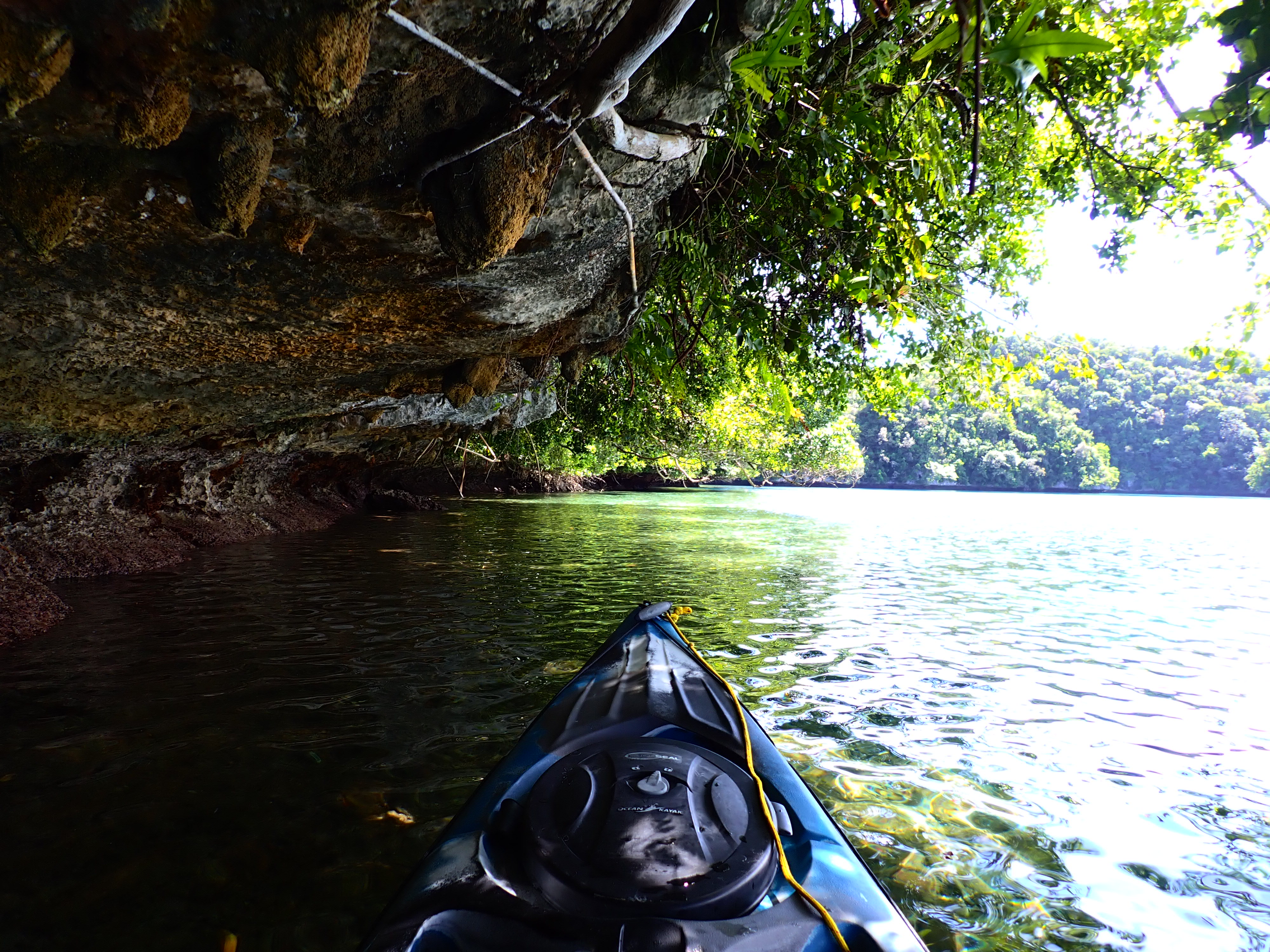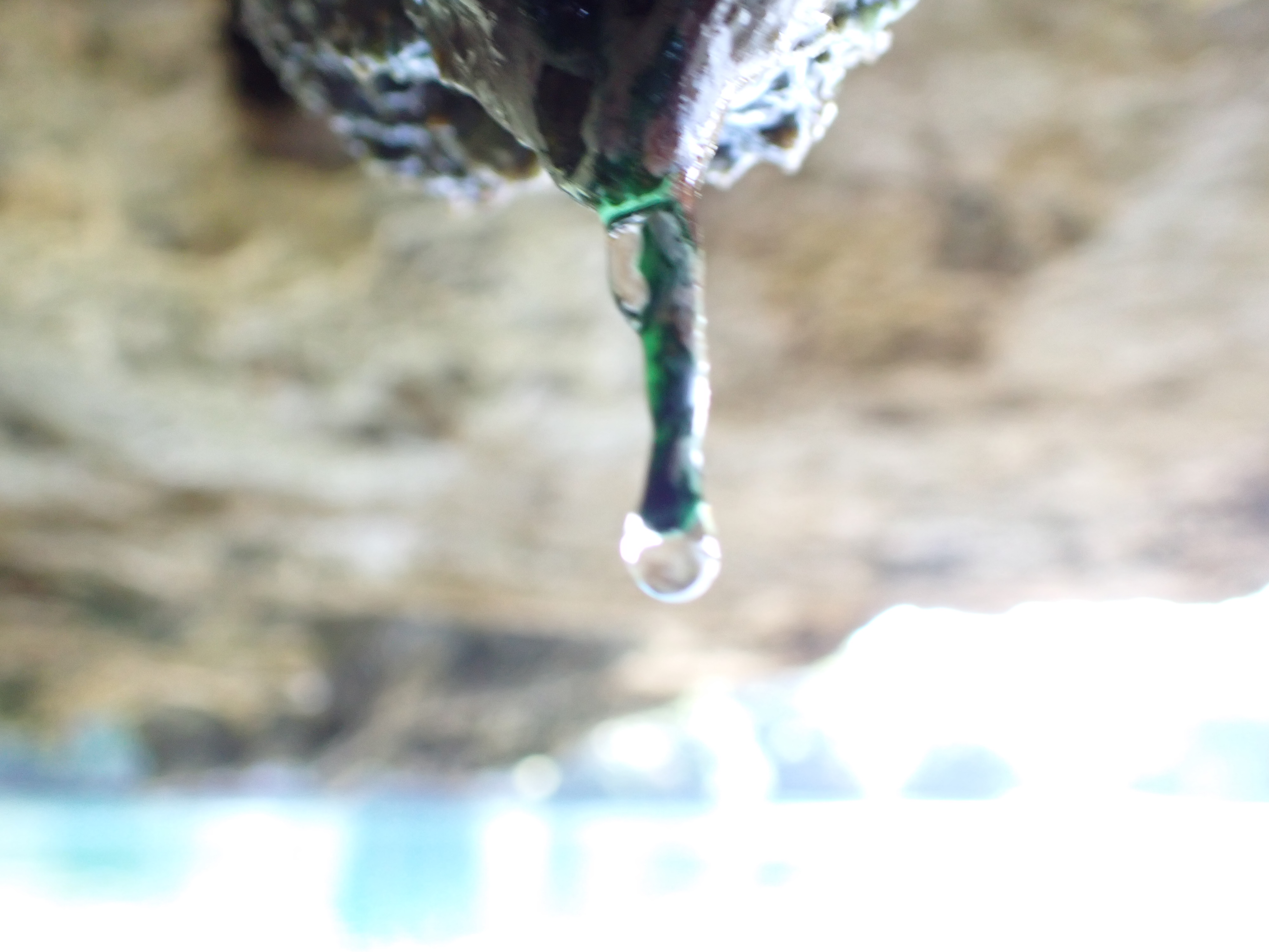 ロックアイランドに沿って漕ぐと日陰を通る事が出来るのでおすすめです。よく、見るとロックアイランドから垂れ下がる小さな鍾乳石の先端から水滴が零れていました。この水滴にミネラル成分があるので、こうして、少しずつ鍾乳石は成長していきます。