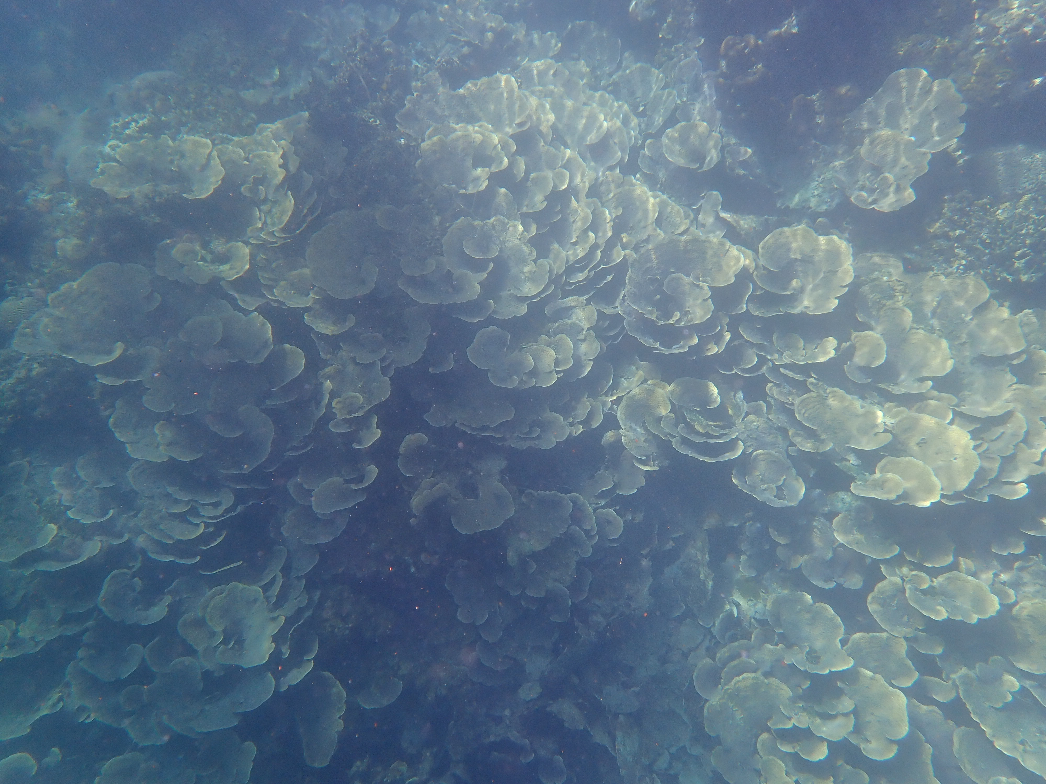 再びカヤックから降りてスノーケルタイム。今度はロックアイランドの珊瑚礁に沿って泳ぎます。パラオ松島は穏やかな内湾なので内湾性の珊瑚種が多く、彩は決して派手ではありません。脳サンゴやキャベッジコーラル等、外海では見かけない珊瑚種を見る事が出来るのが特徴です。