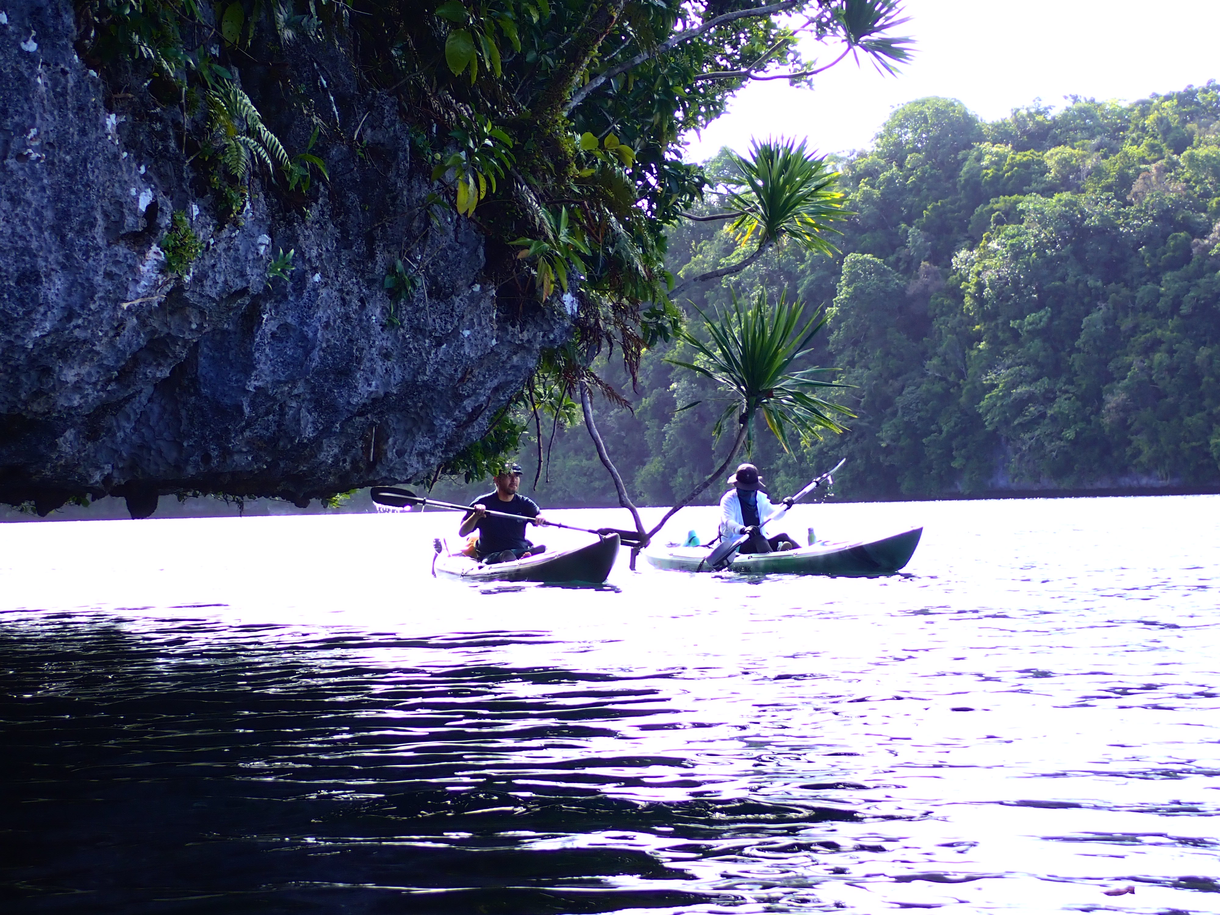 本日はパラオ松島ことニッコーベイでカヤッキング。久しぶりに訪れましたが、相変わらずカヤックに易しいフィールドです。港から少し漕いで、小さな島の近くまで行けば綺麗な珊瑚礁が広がり、所々にある砂地の上では透明感のある海を楽しめます。