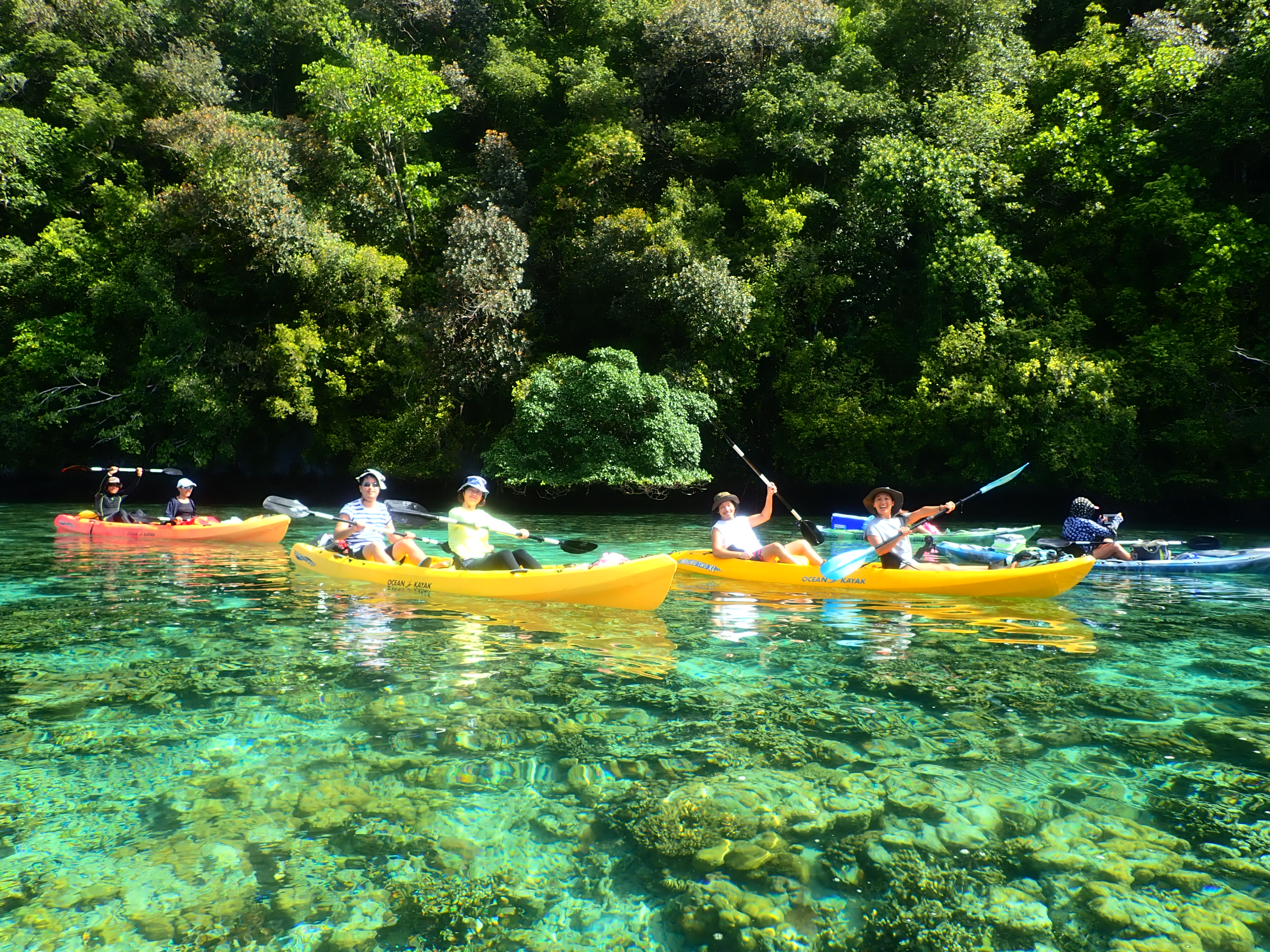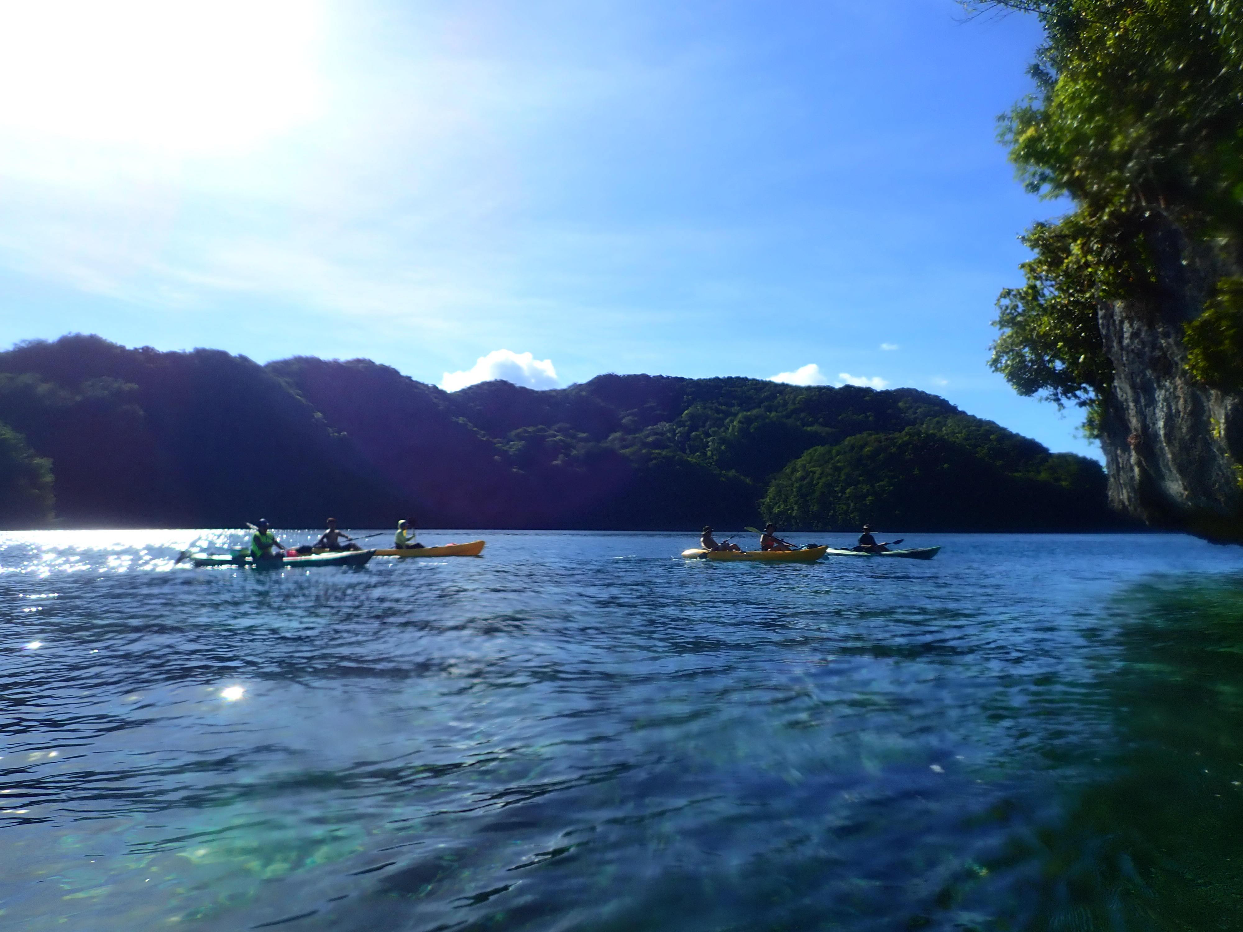 パラオ松島の魅力は入り組んだ島々をカヤックで巡る探検感と透明感のある浅瀬の美しさ。カヤック上からでも珊瑚を見る事が出来、場所によって変わる海の色合いも素敵です。