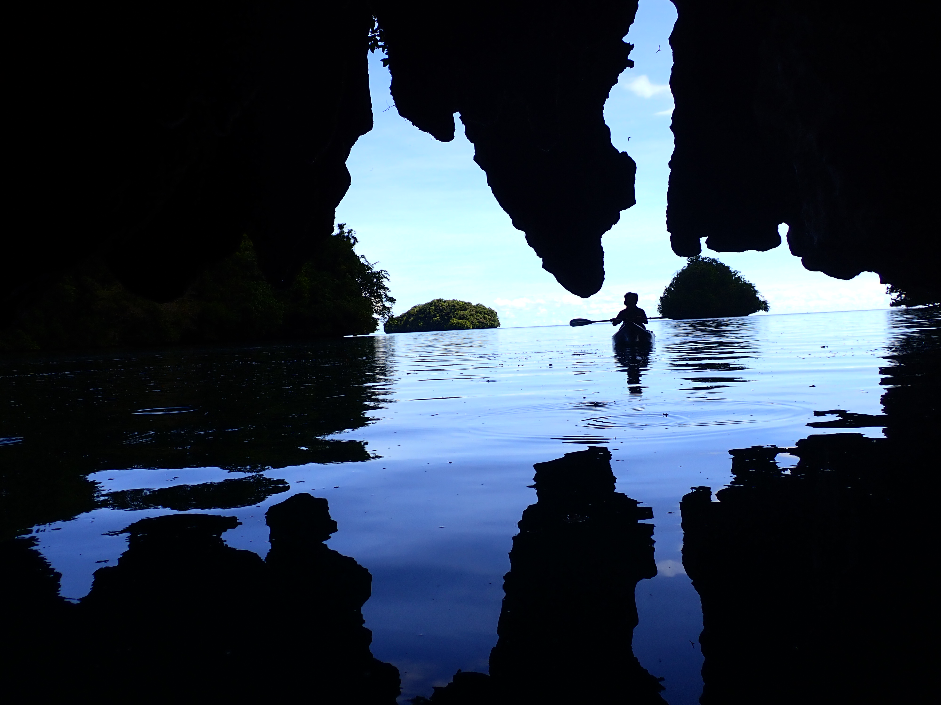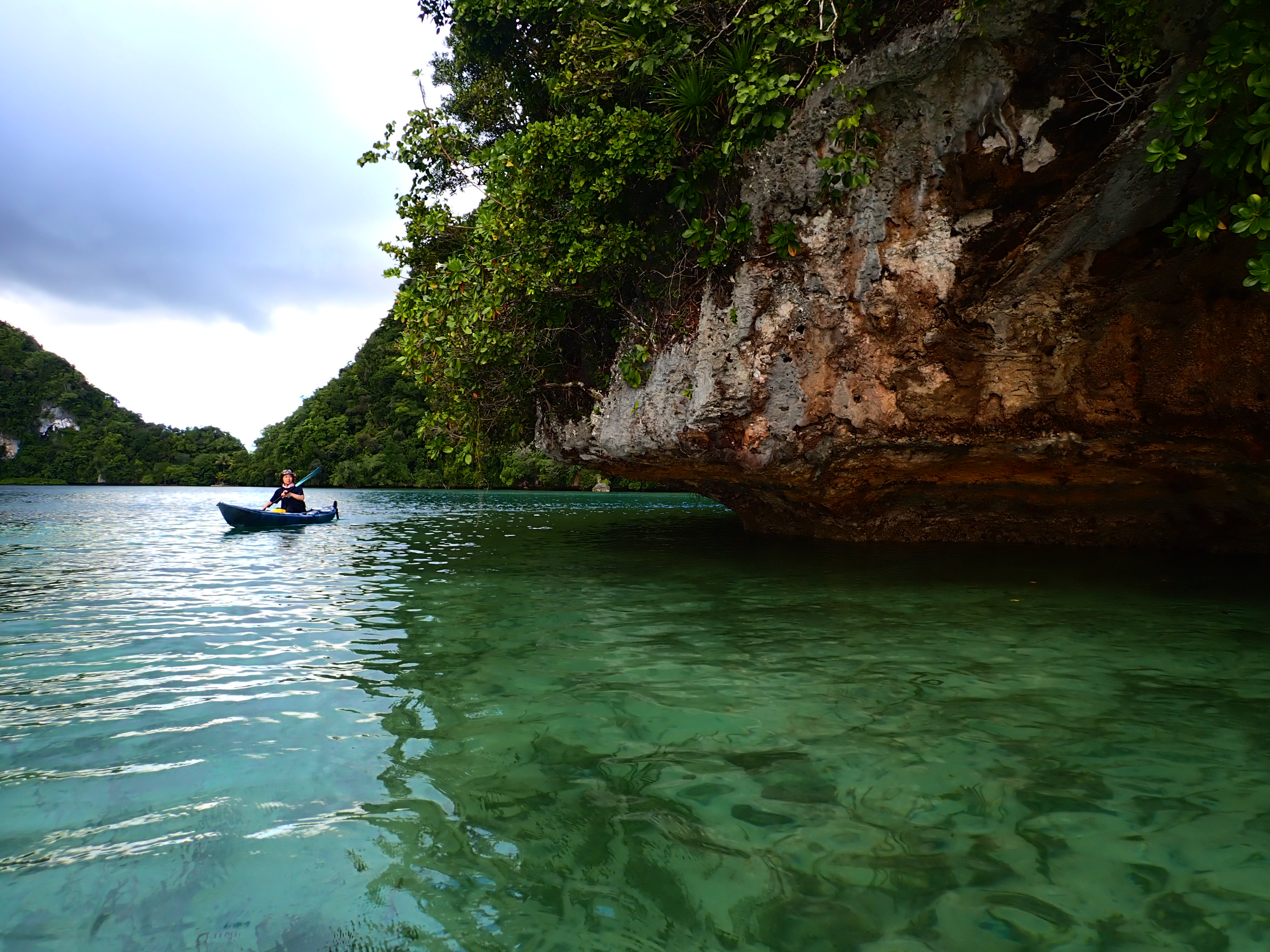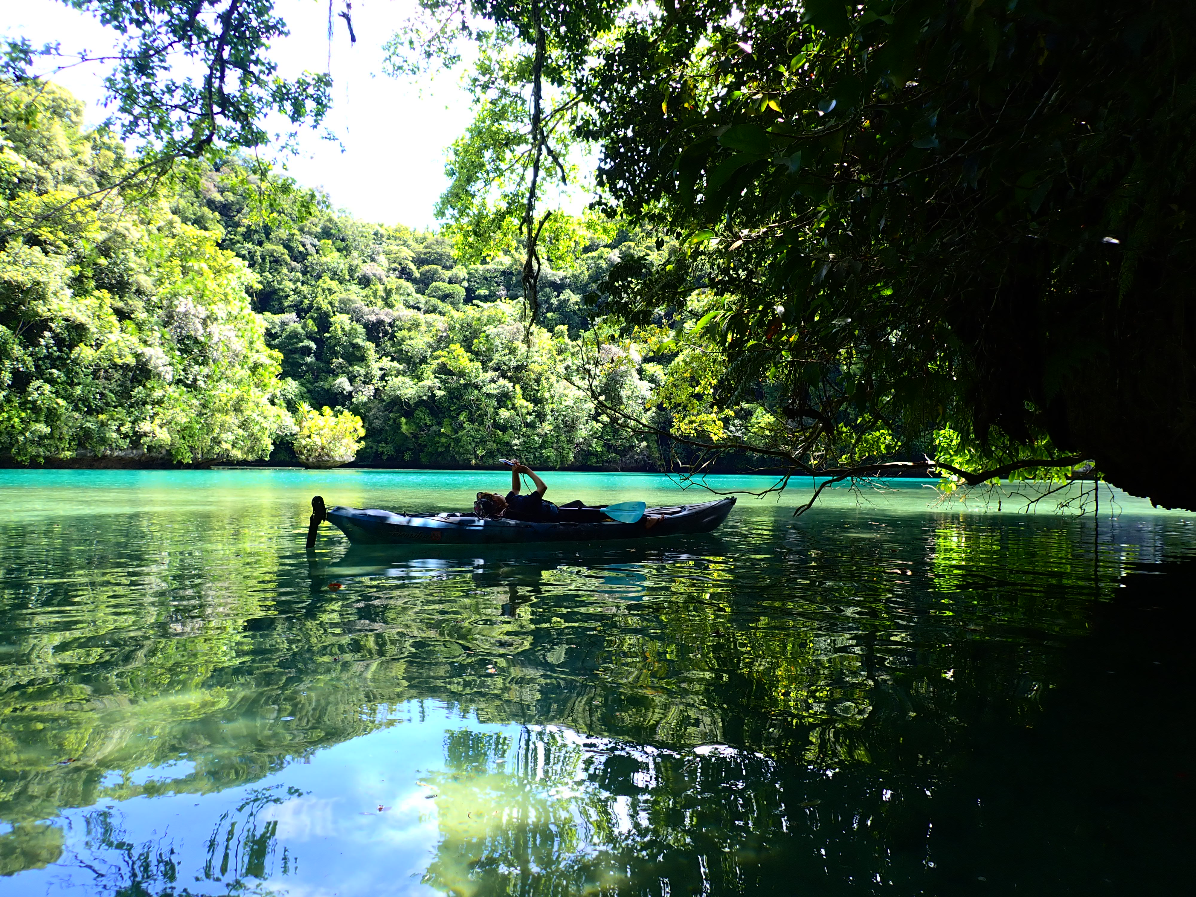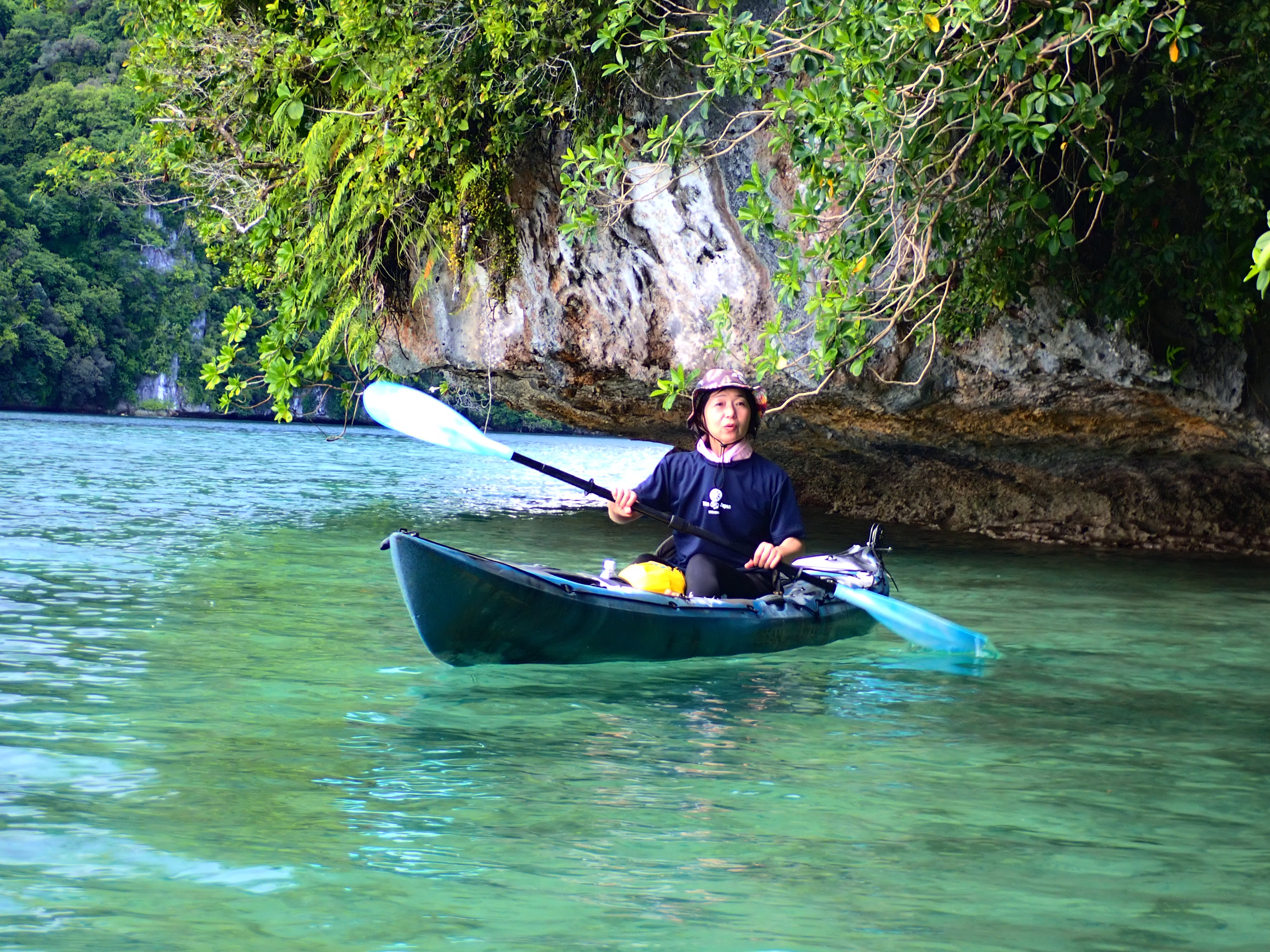 少し疲れたら、カヤックの上に寝そべってブレイクタイム。パラオでのカヤッキングはこの時間が一番心地よいと言っても良いぐらい、癒されます。ツアーの方は格納庫洞窟と三座式水上偵察機のエンジン部分を見学。