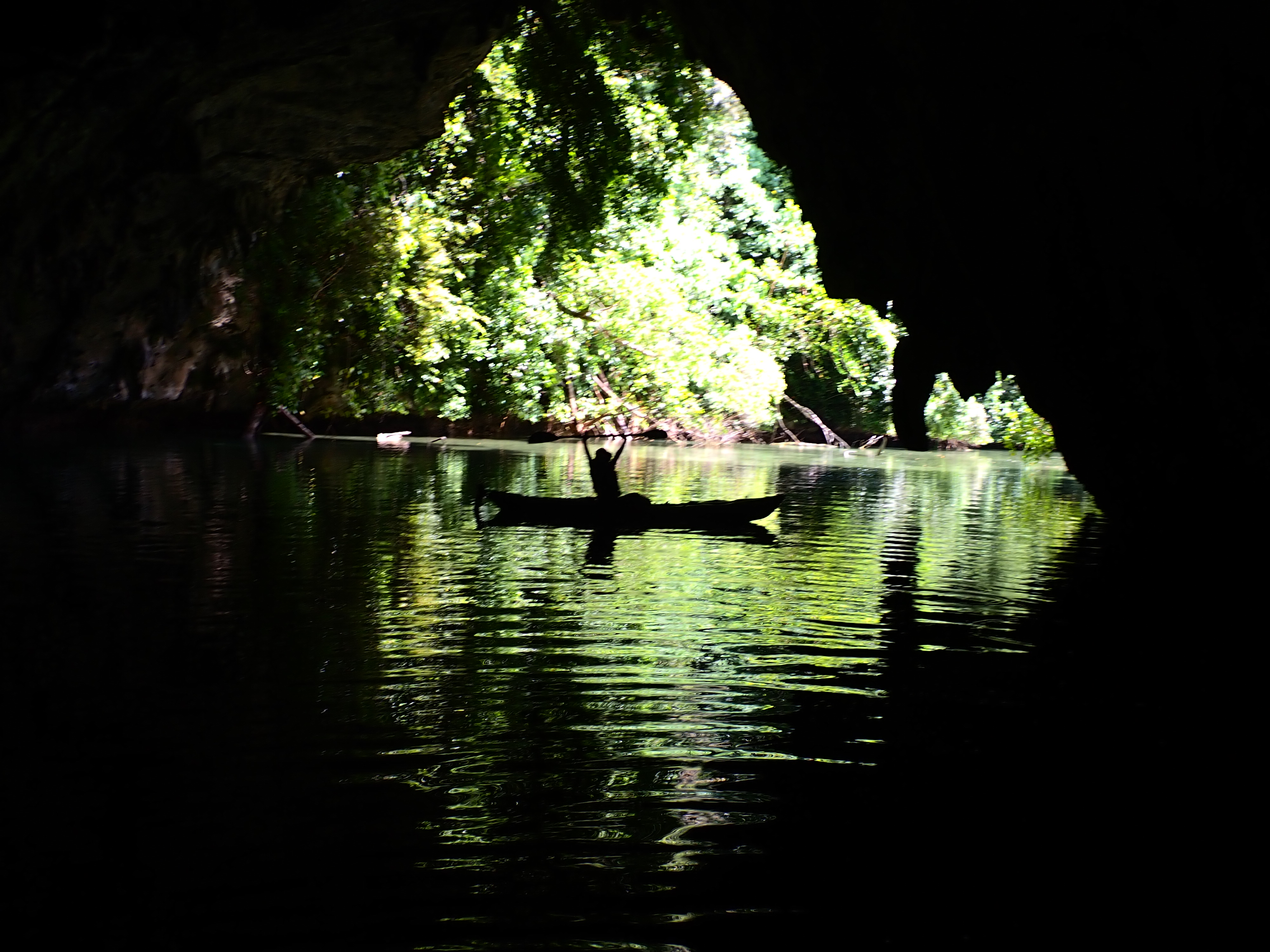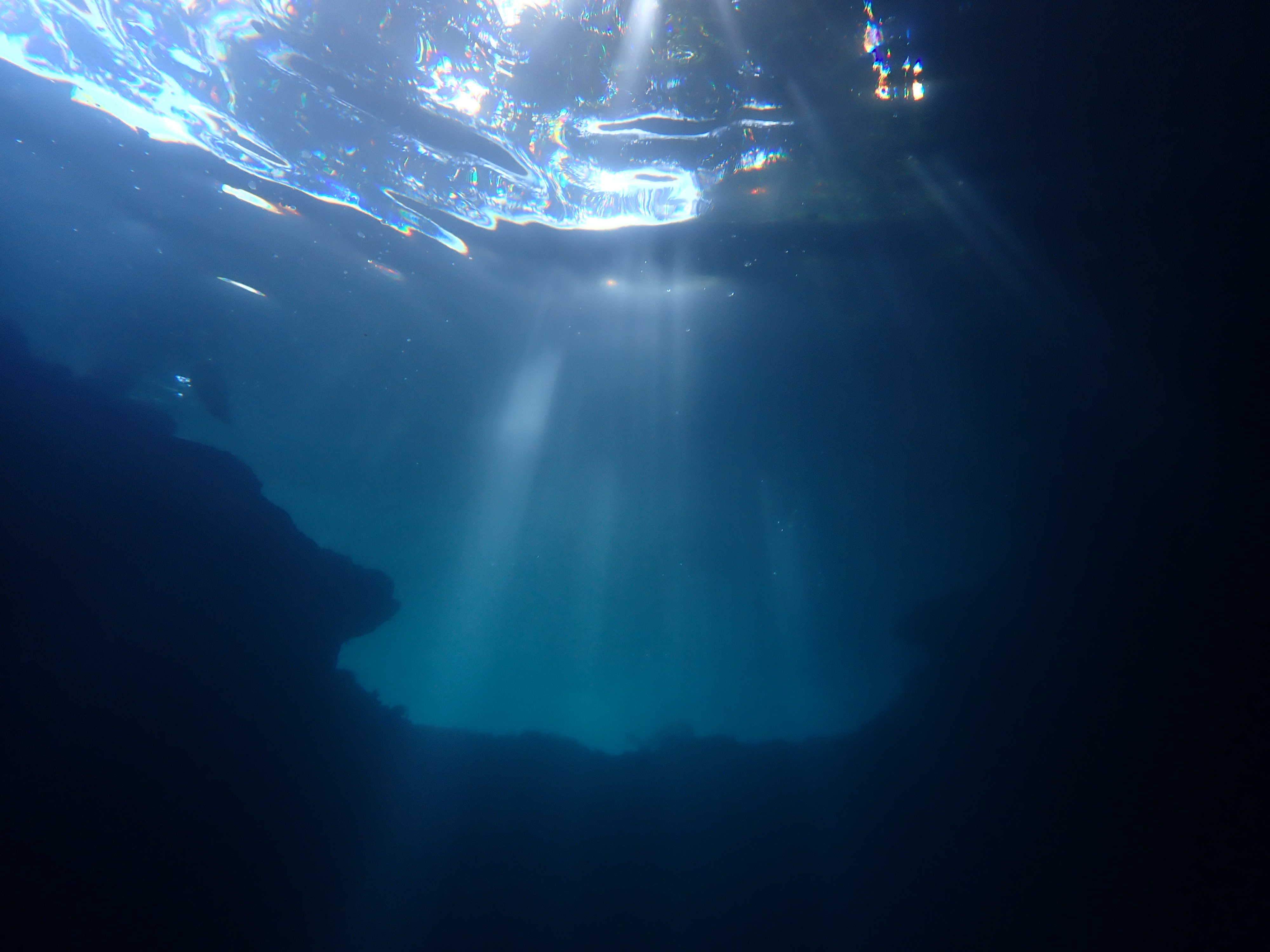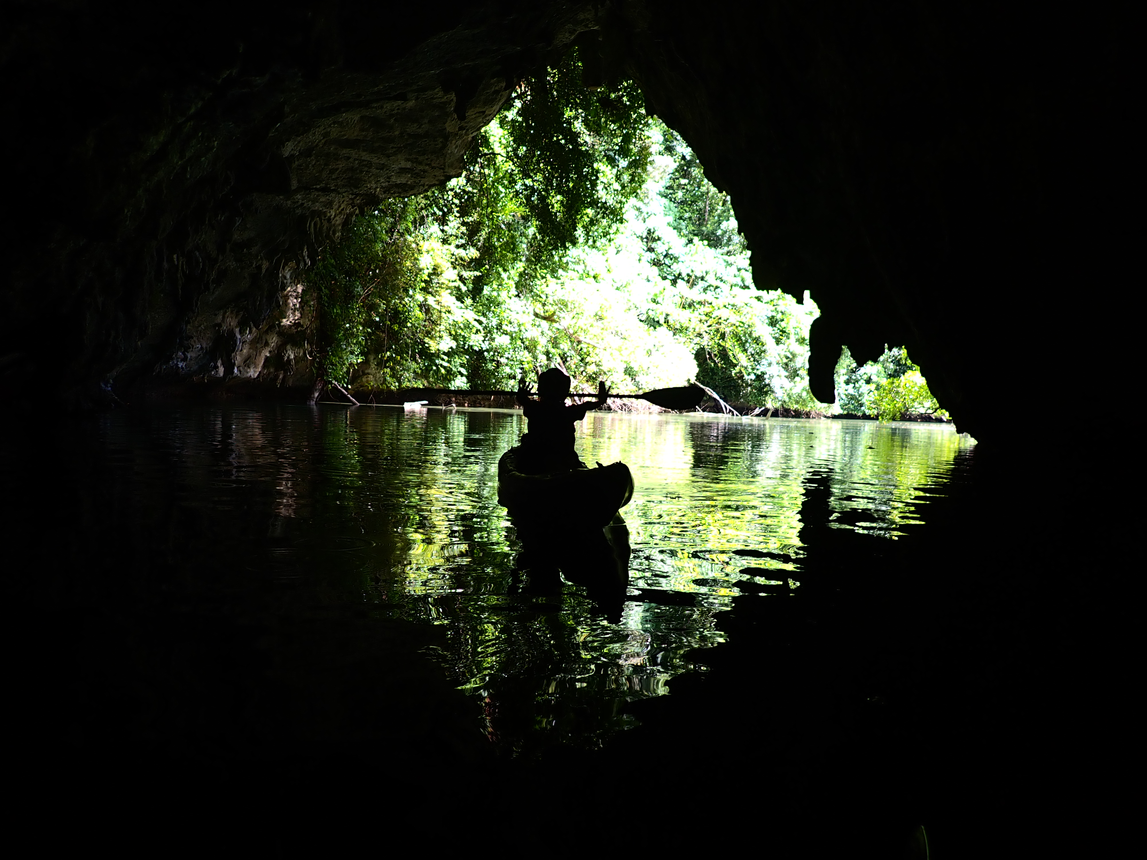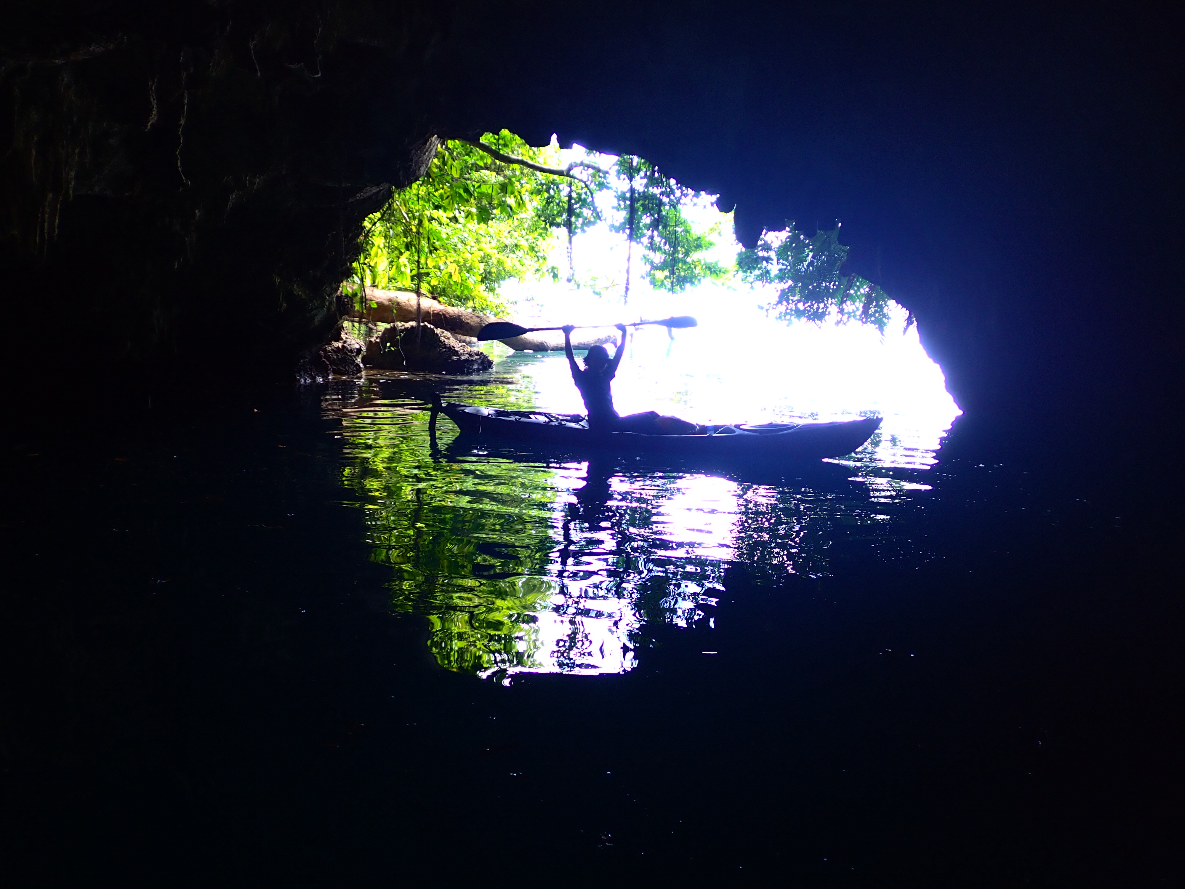 最後に小さな青の洞窟へ。ここは太陽の光が差し込むと、水面が美しいブルーに見えるのですが、今日はなかなか太陽が出てくれず、カヤックの上で休憩し、太陽待ち。何とか光が差し込み、洞窟内の奥から外を見る際は美しい色合いを見る事が出来ました。