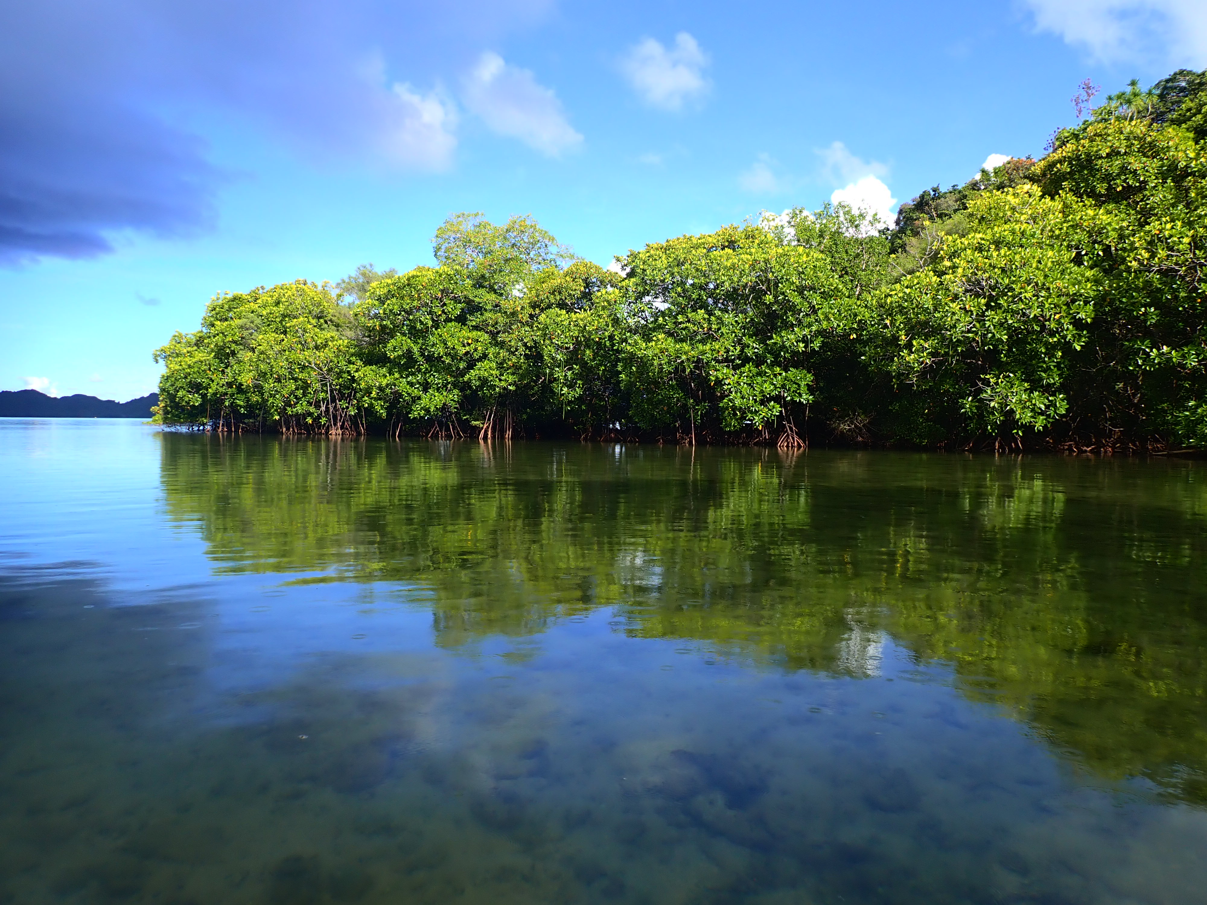 少し、流れのある難所を越えて、マングローブ帯に戻ると、風が凪ぎ、鏡面反射の美しい景色が待っていました。海に青空と雲が映るコンディションが良い日しか見れない光景です。