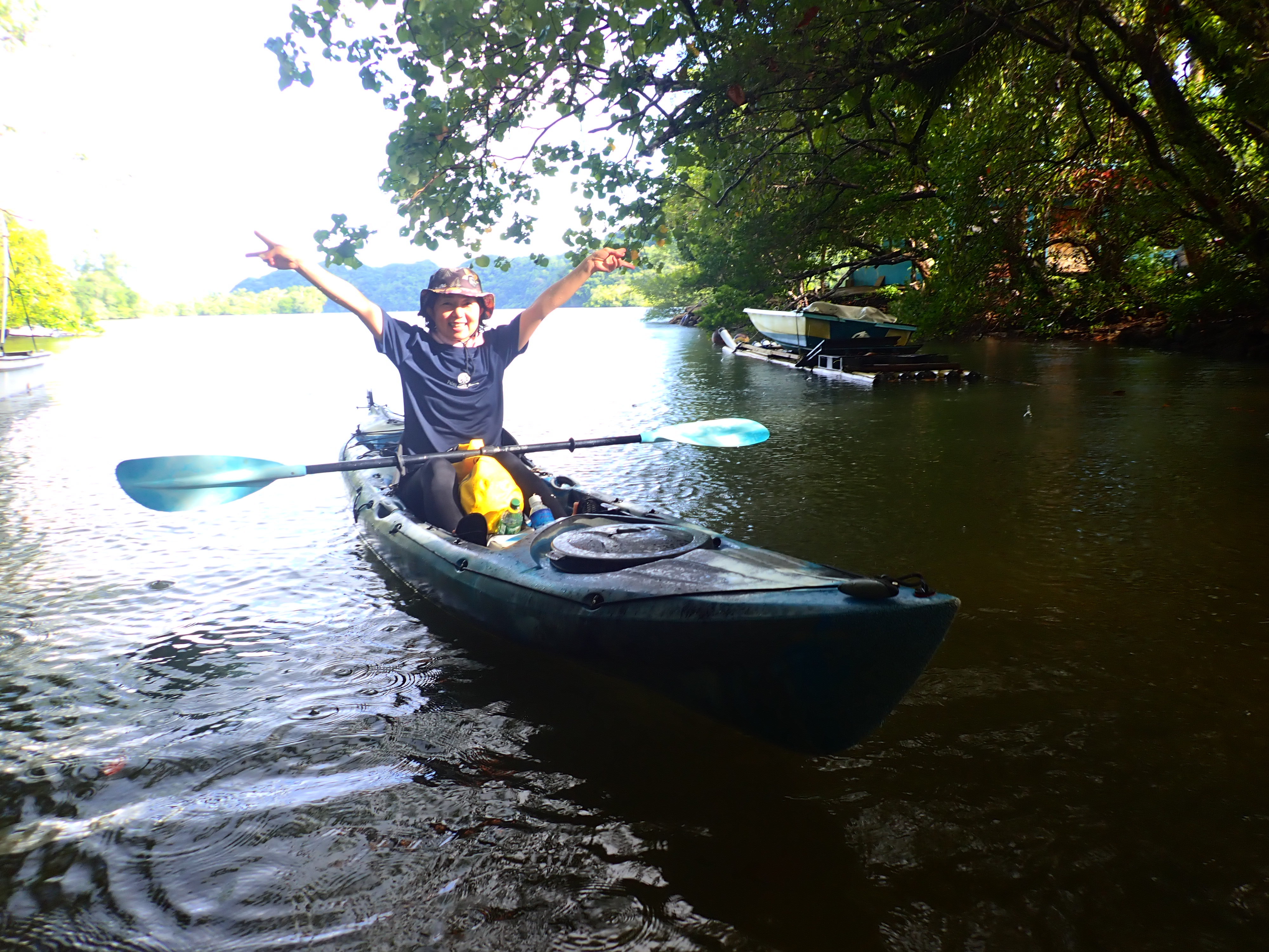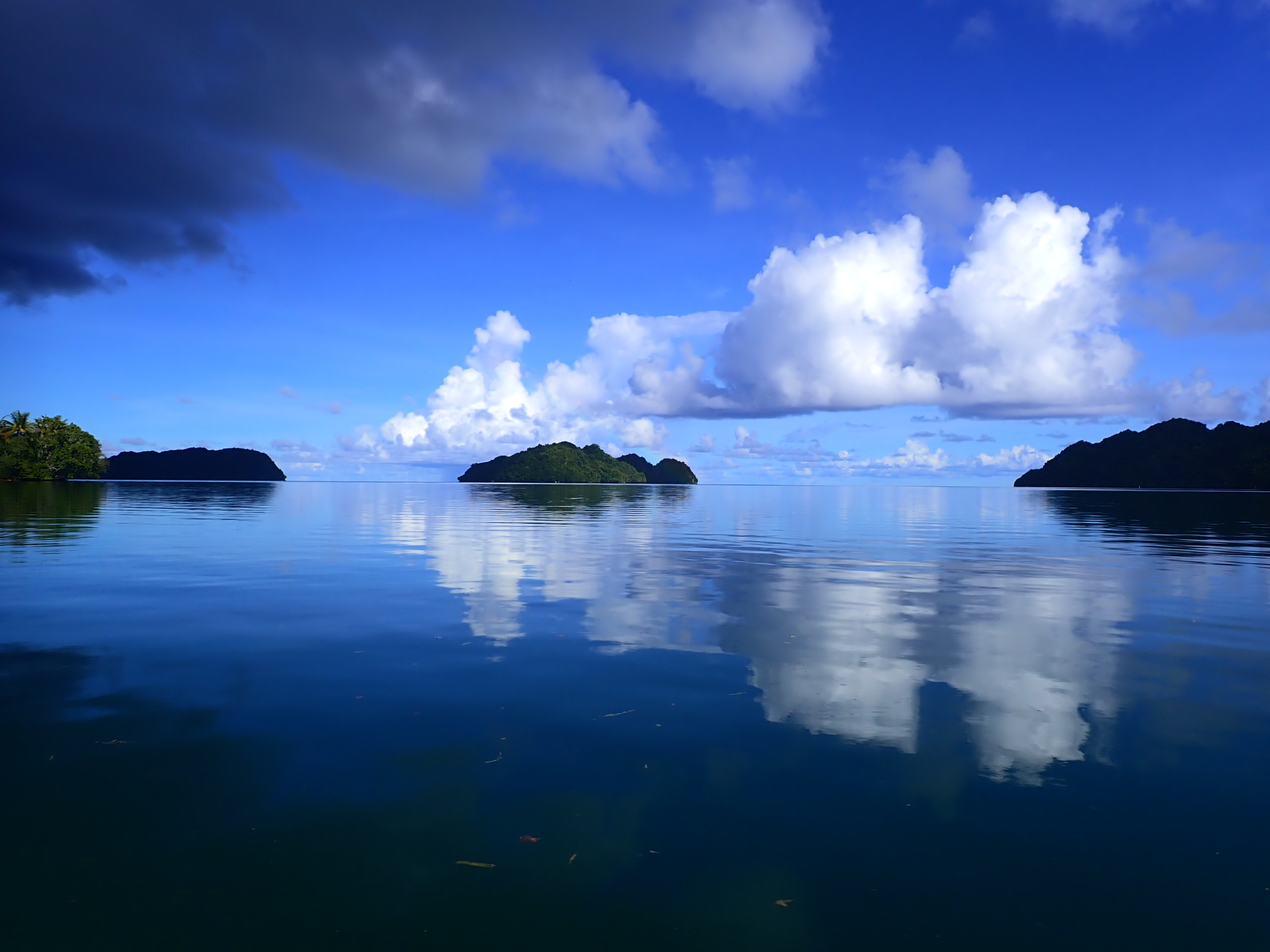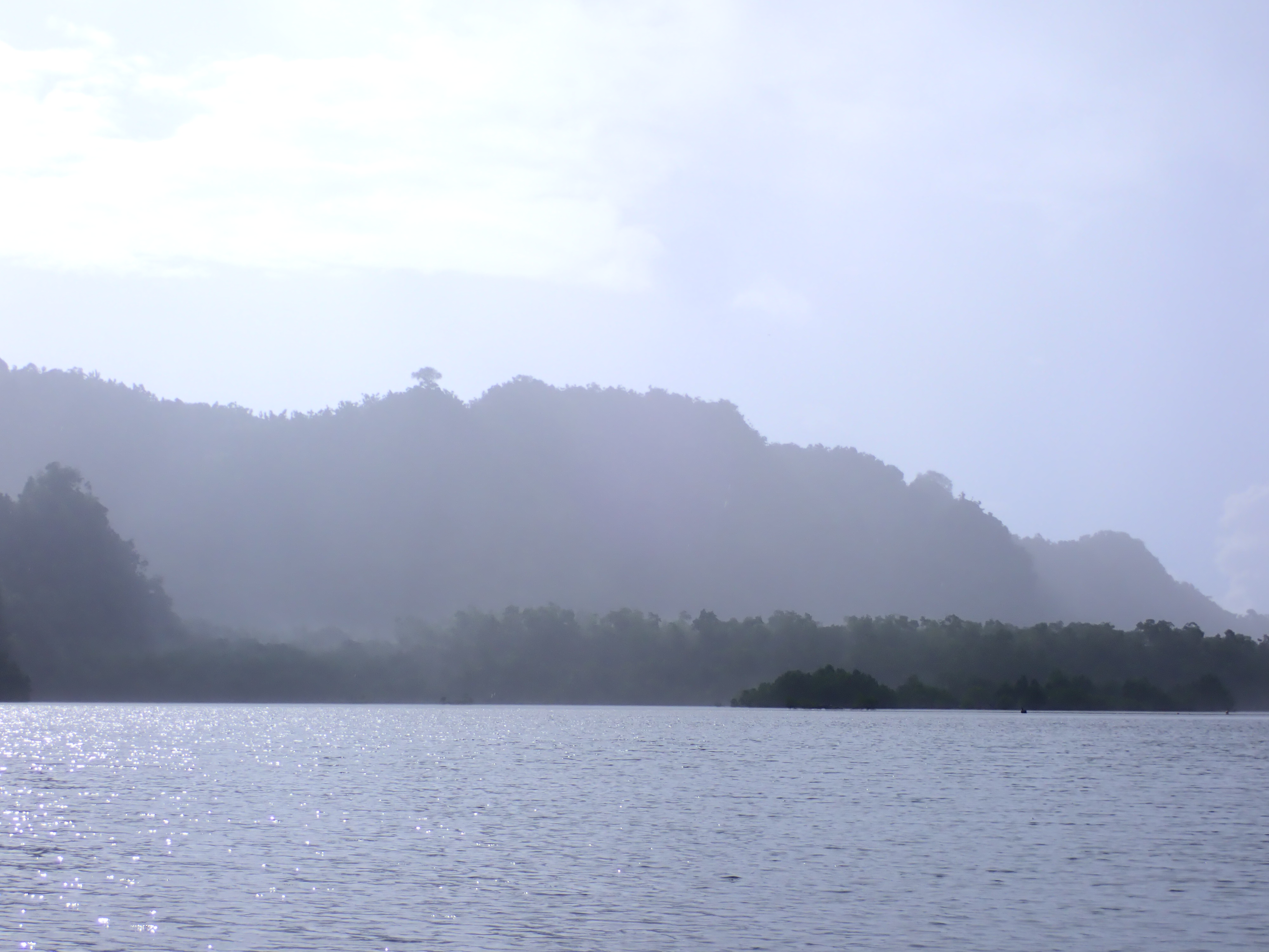 港に着く寸前、少し離れた場所で雨が降り出しました。パラオでは30~50メートル離れた先で雨が降っているという事がよくあります。耳を澄ますと、雨が降っている場所からは、滝が流れているかのような、激しい水の音。と雨の音を楽しみながら、港へ帰着。お疲れさまでした!