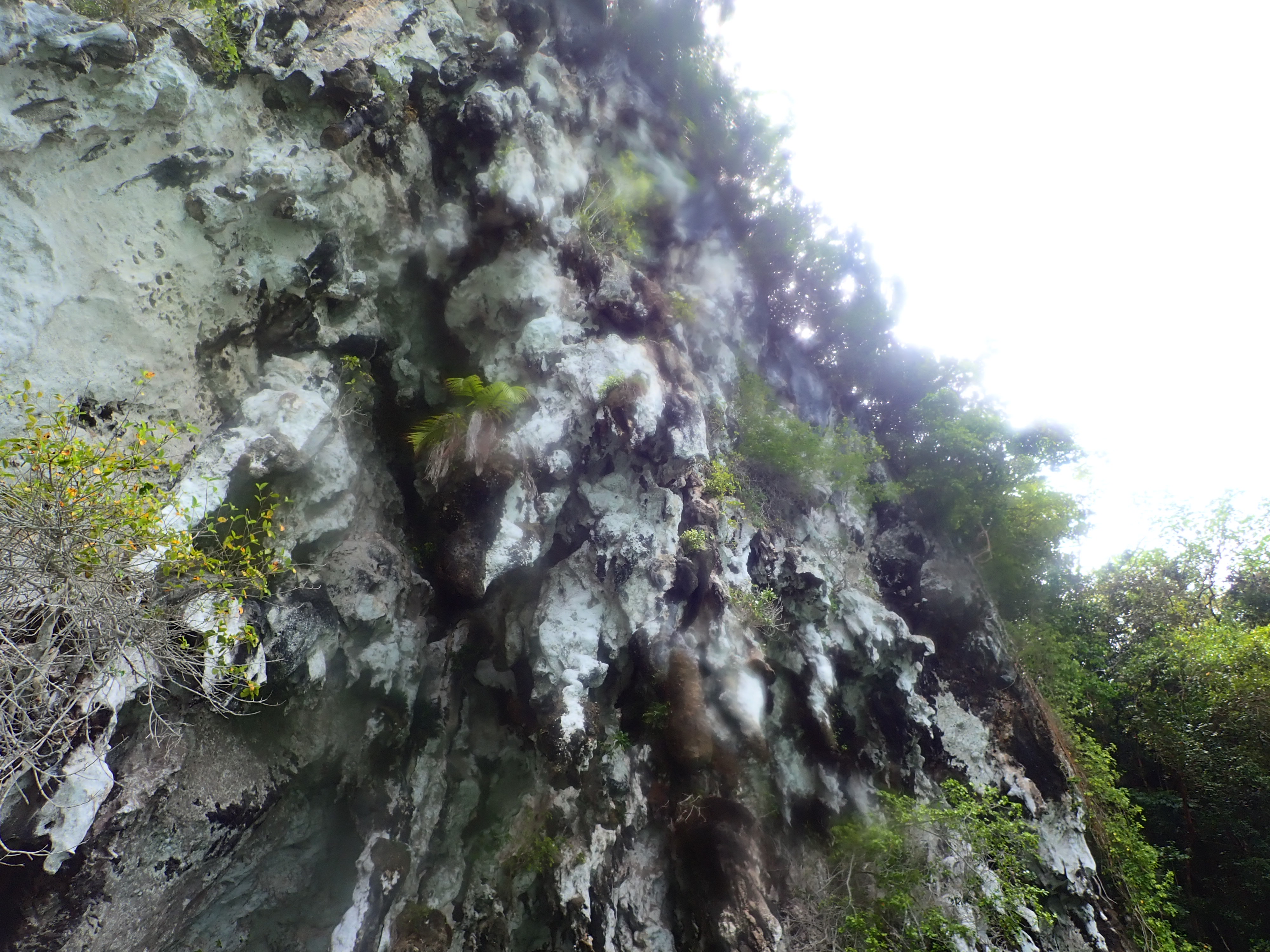 大昔、海面が下がり、その際に流れ込んだ雨水が浸食し、洞窟を形成、そして海面が再び上がった事で、海中に水没した海中洞窟と陸上にある洞窟が出来上がります。このホワイトウォールは後者で、洞窟と呼ぶほどではありませんが、浸食によって出来た巨大な鍾乳石を海上から見上げる事が出来ます。