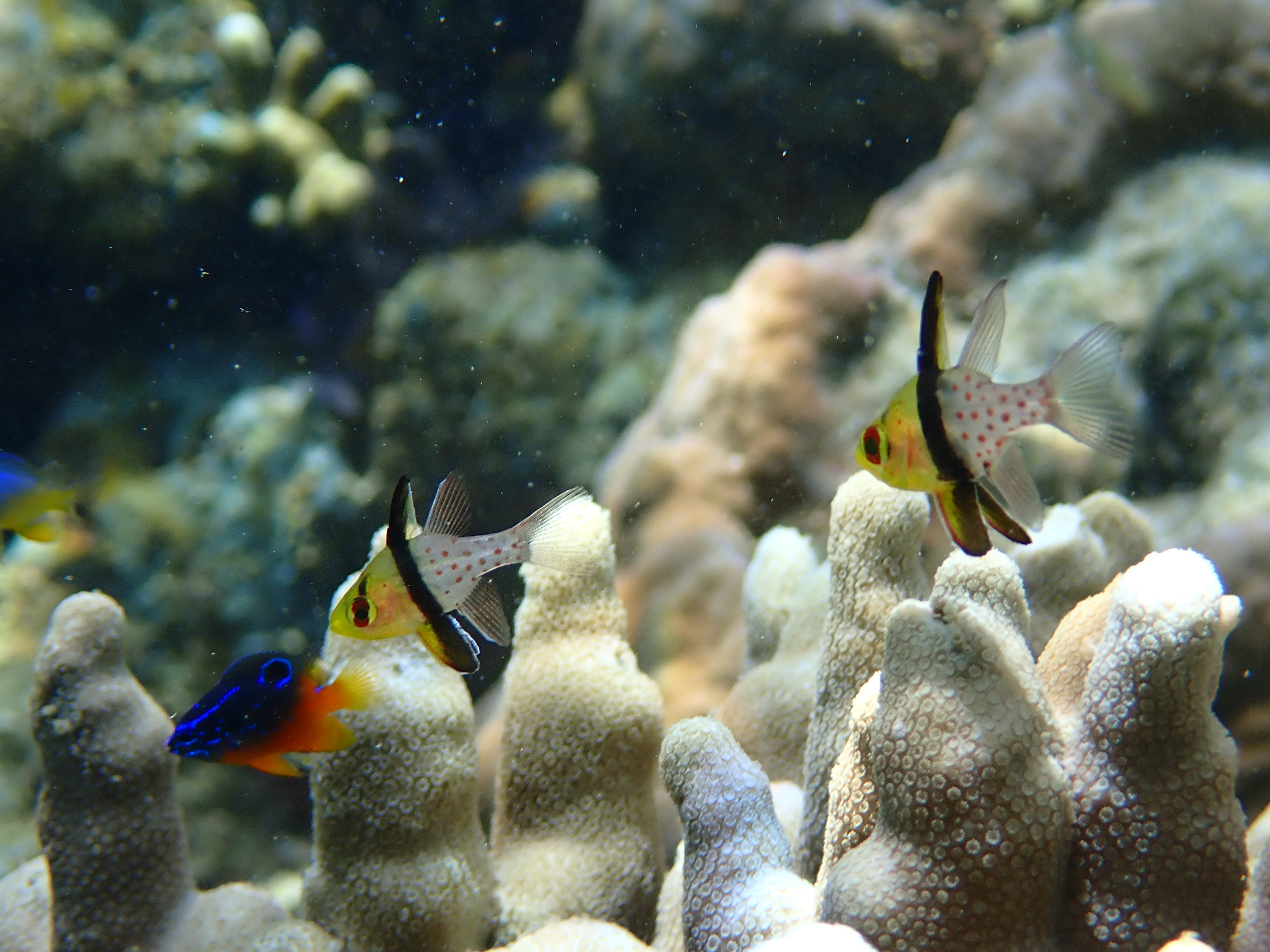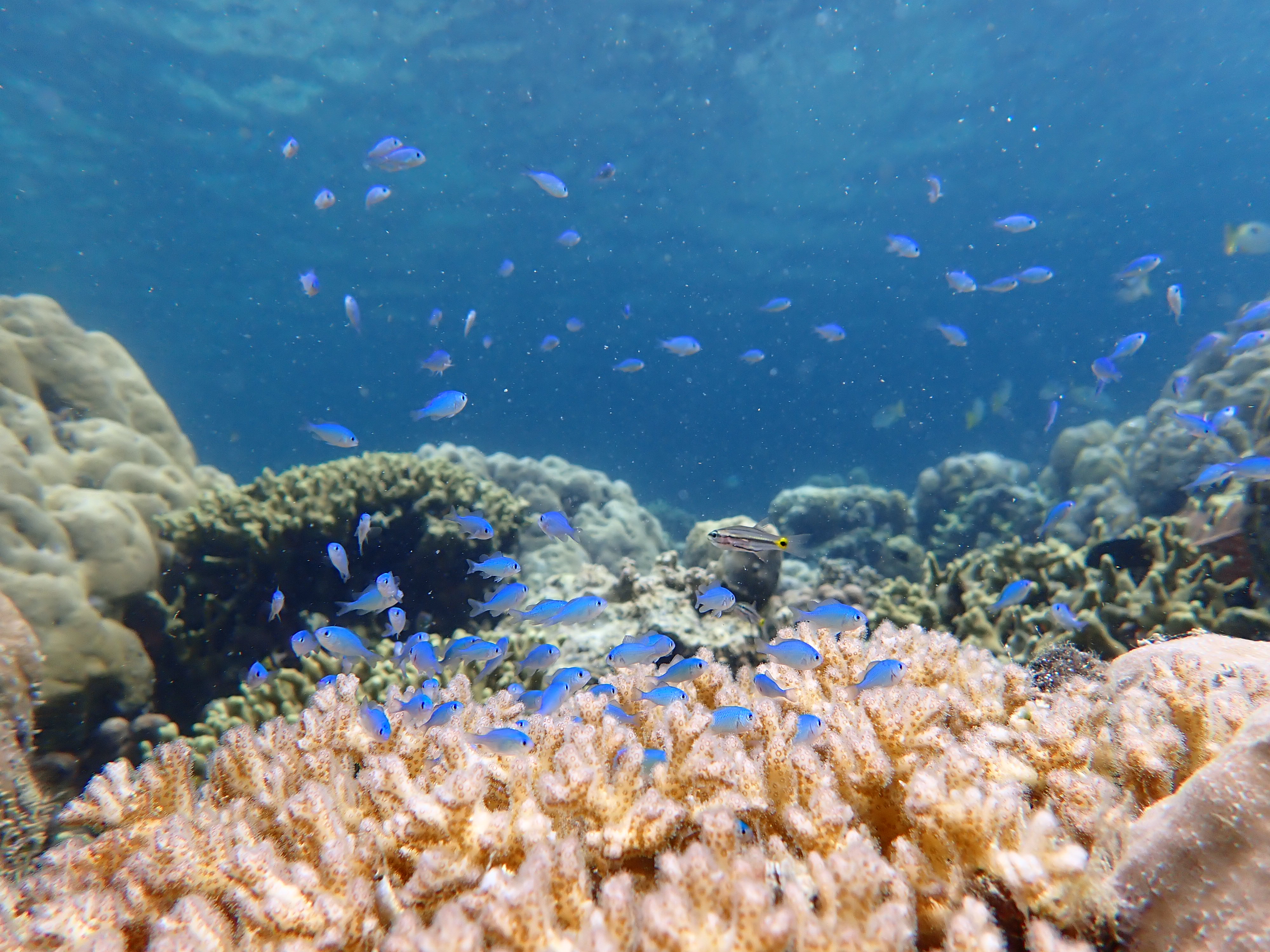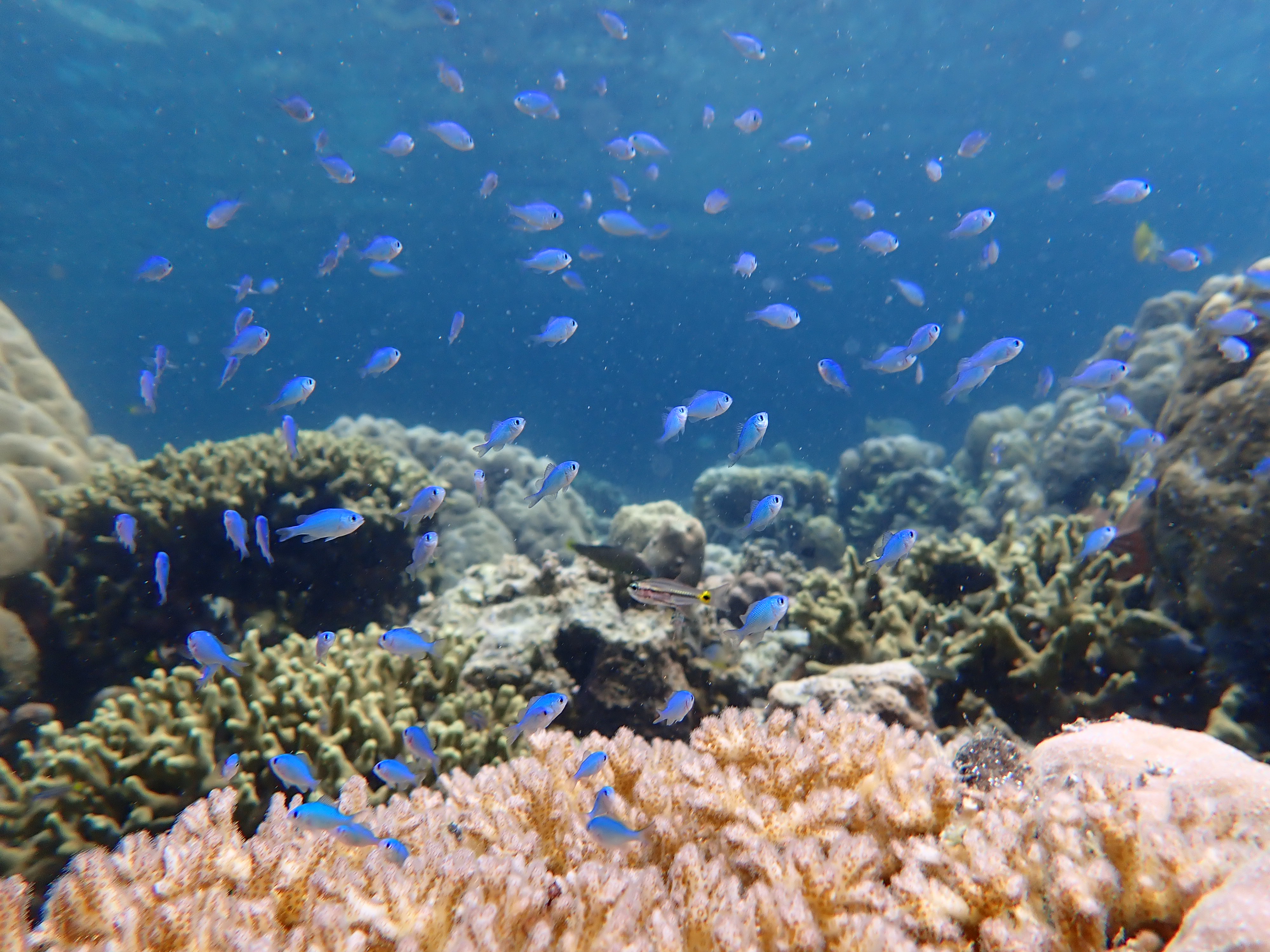 The bay of Nikko Bay is inhabited by small fish. Although not as dynamic as the ocean outside, the lack of waves and fast currents makes for a relaxing snorkeling experience.