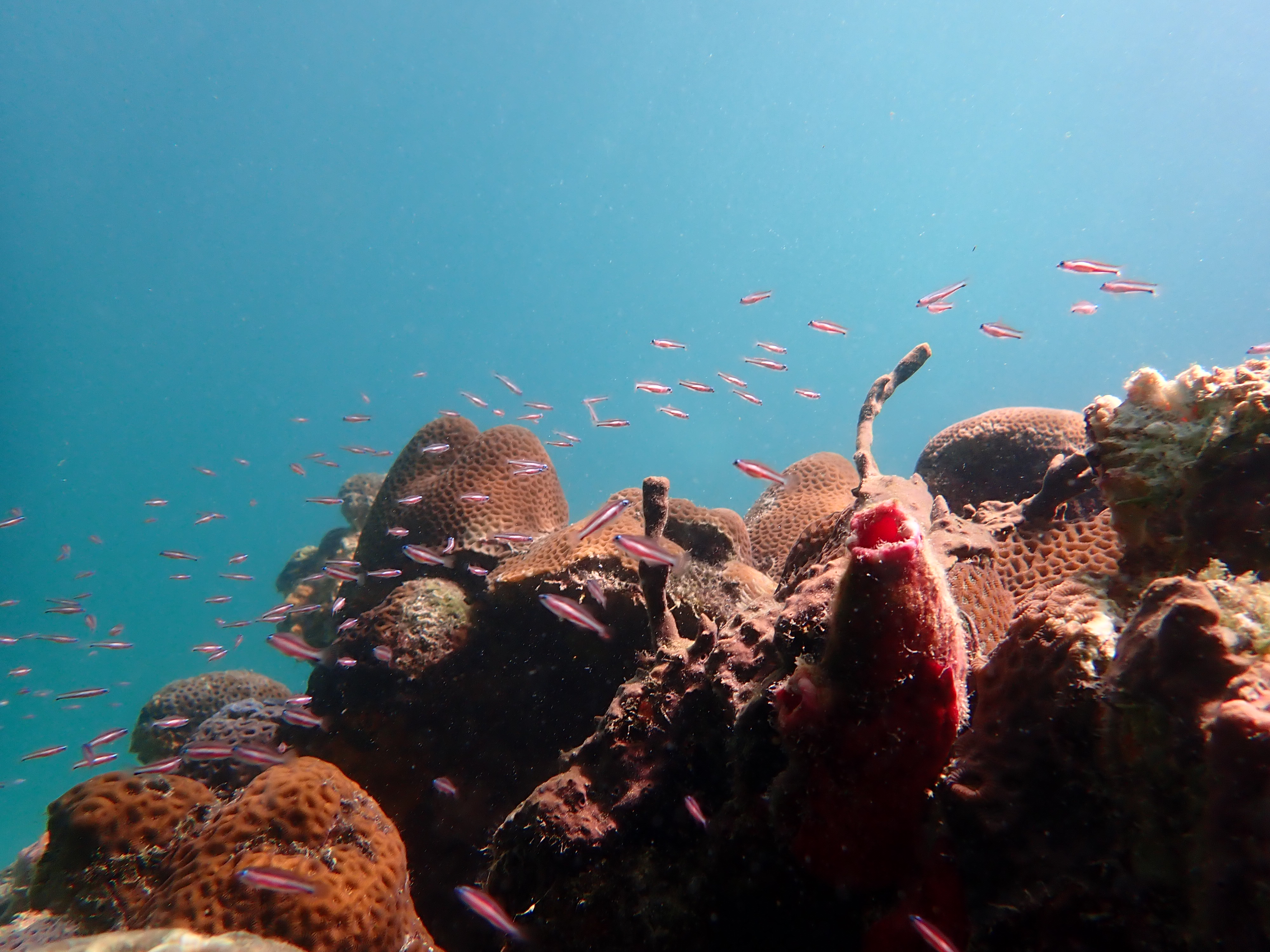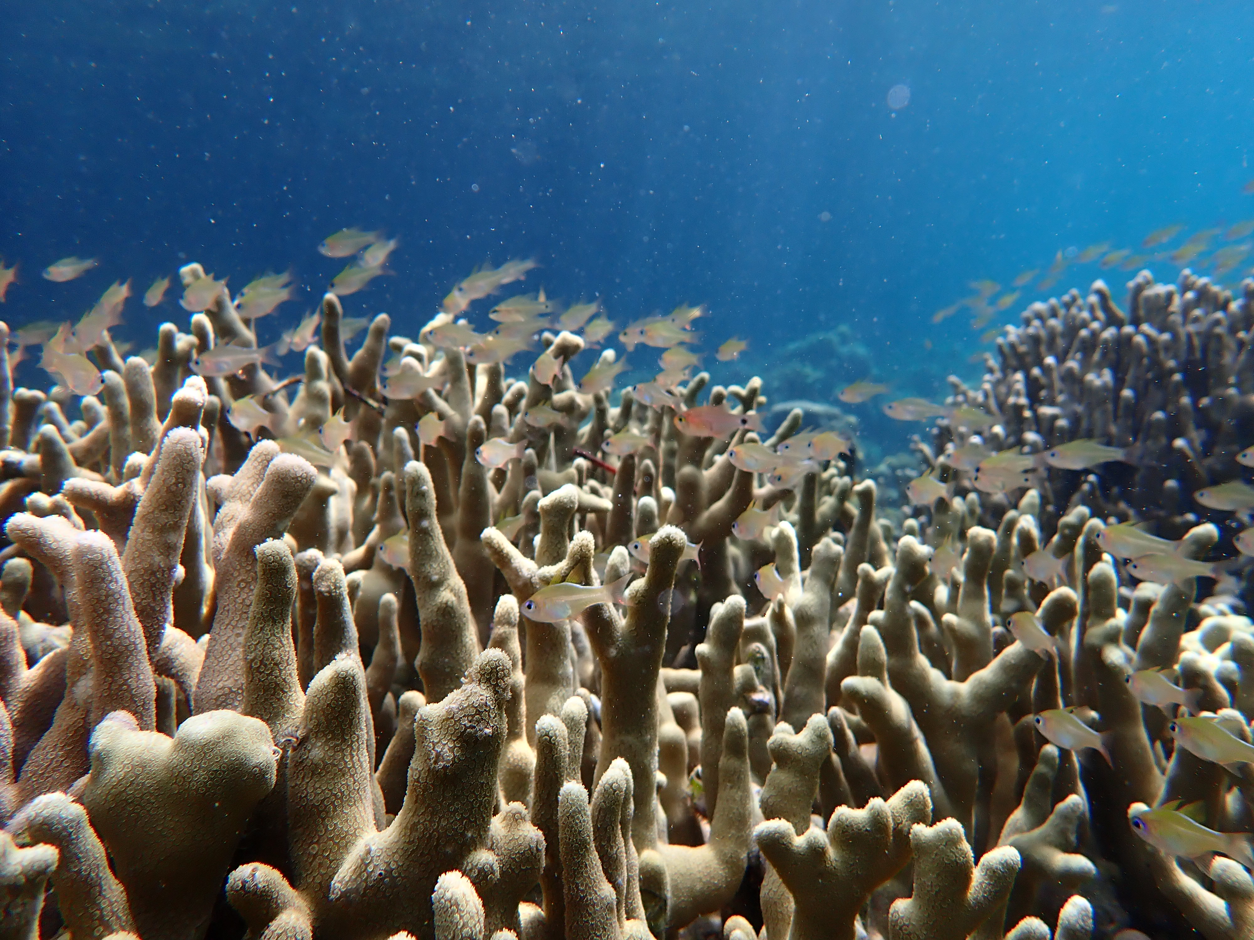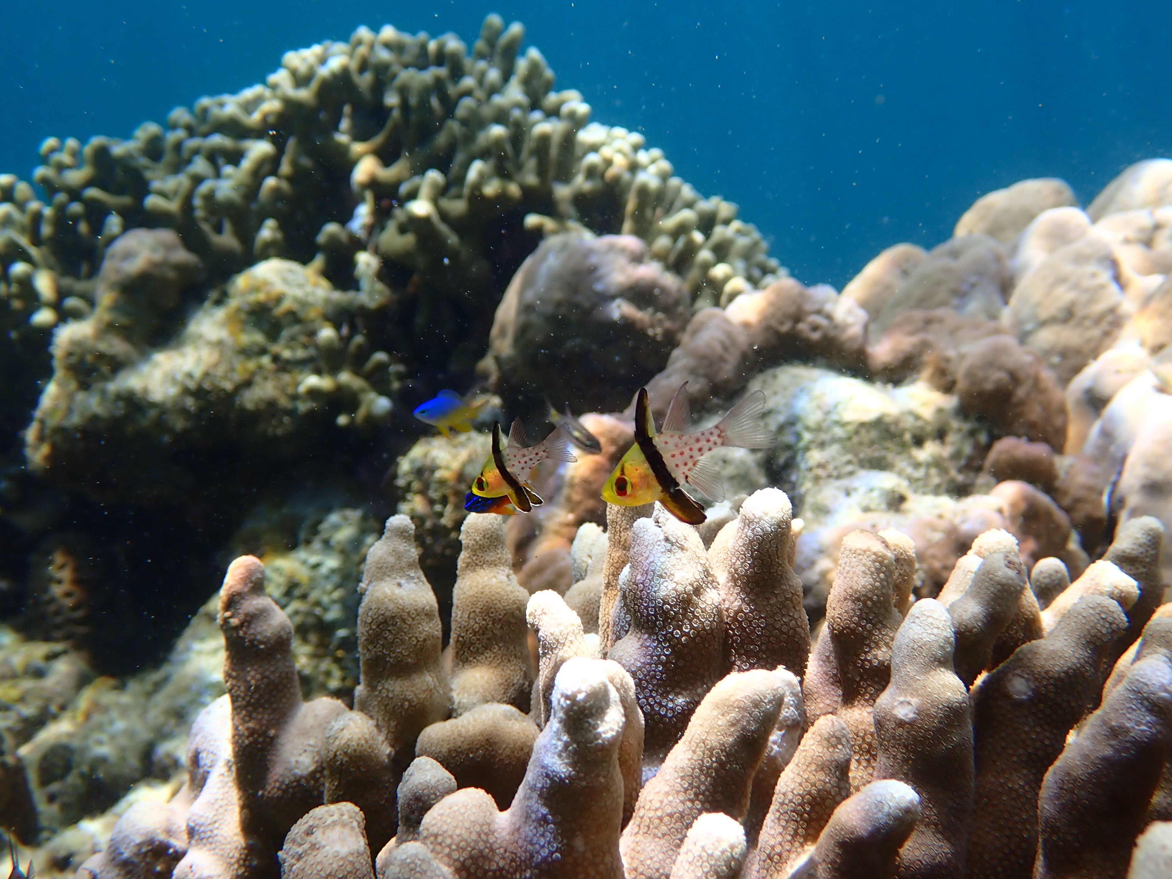 The bay of Nikko Bay is inhabited by small fish. Although not as dynamic as the ocean outside, the lack of waves and fast currents makes for a relaxing snorkeling experience.