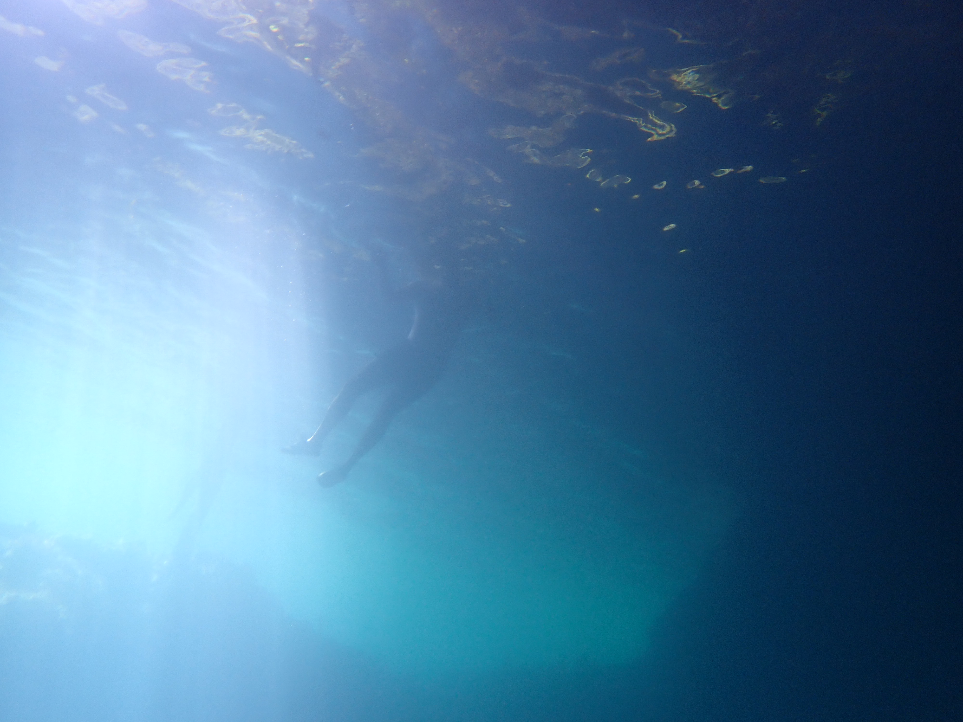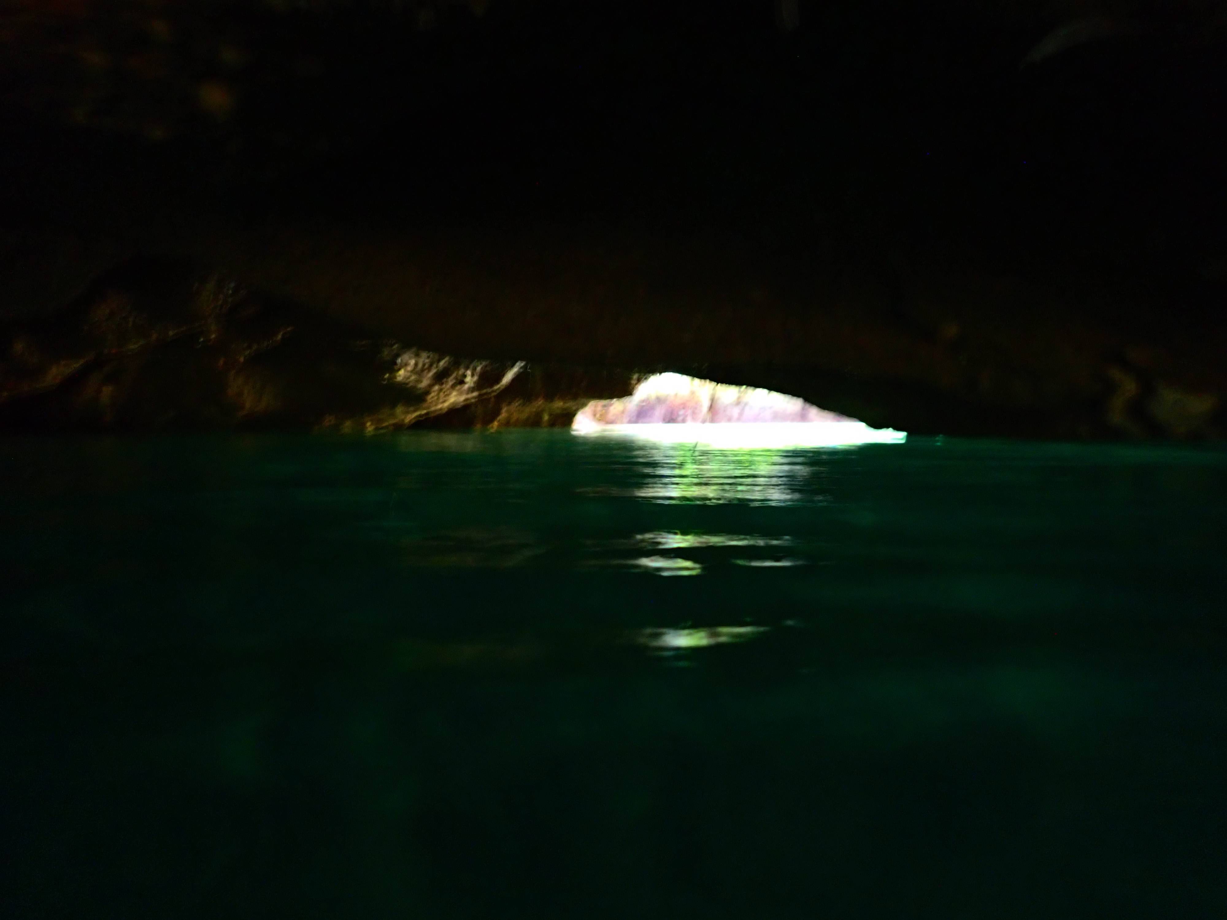 After paddling for about 15 minutes, we arrived at Emerald Cave. This cave offers beautiful ocean tones when the sun shines through. However, clouds hid the sun when we arrived, so we swam and waited for the sun to come out.