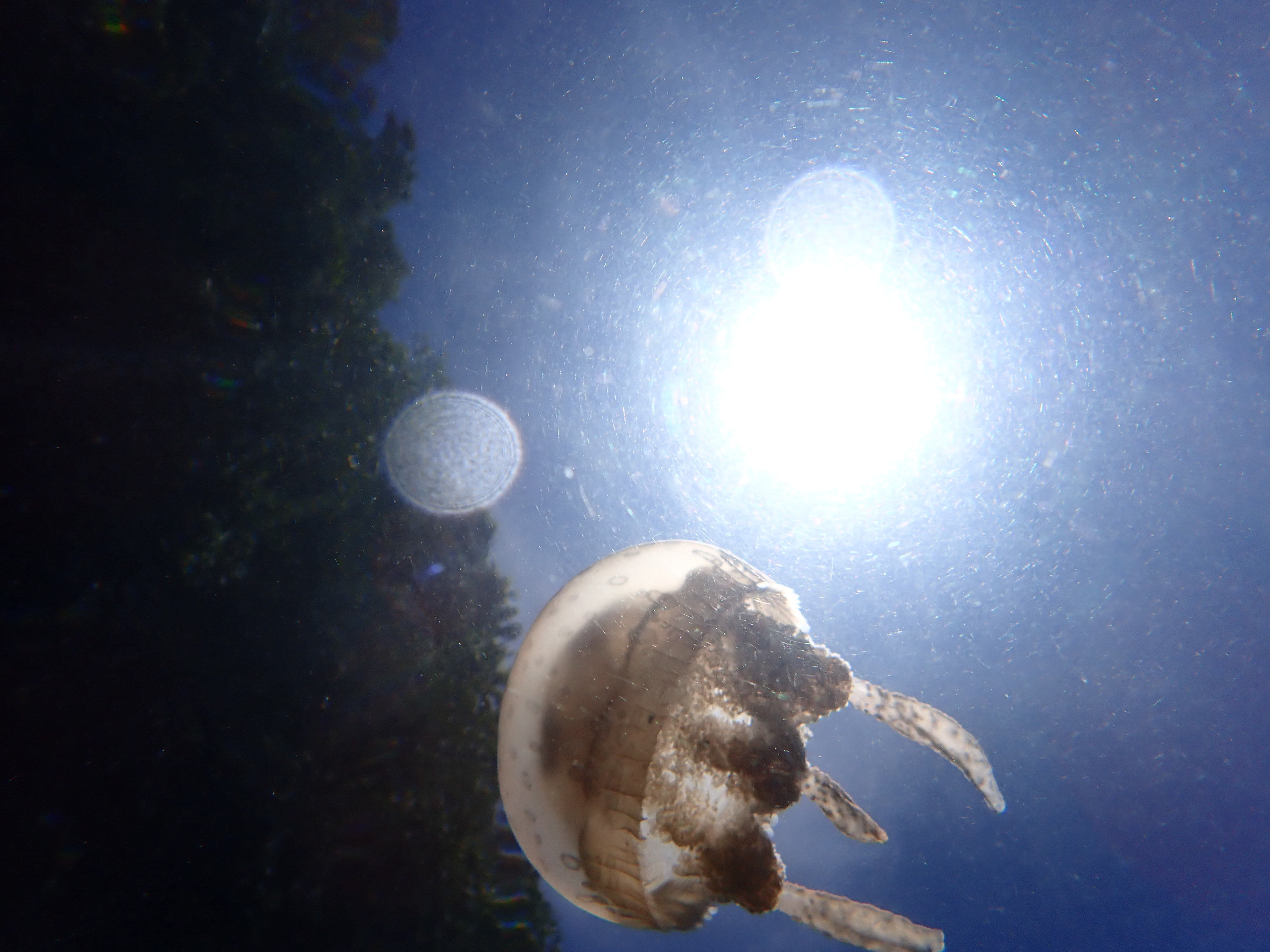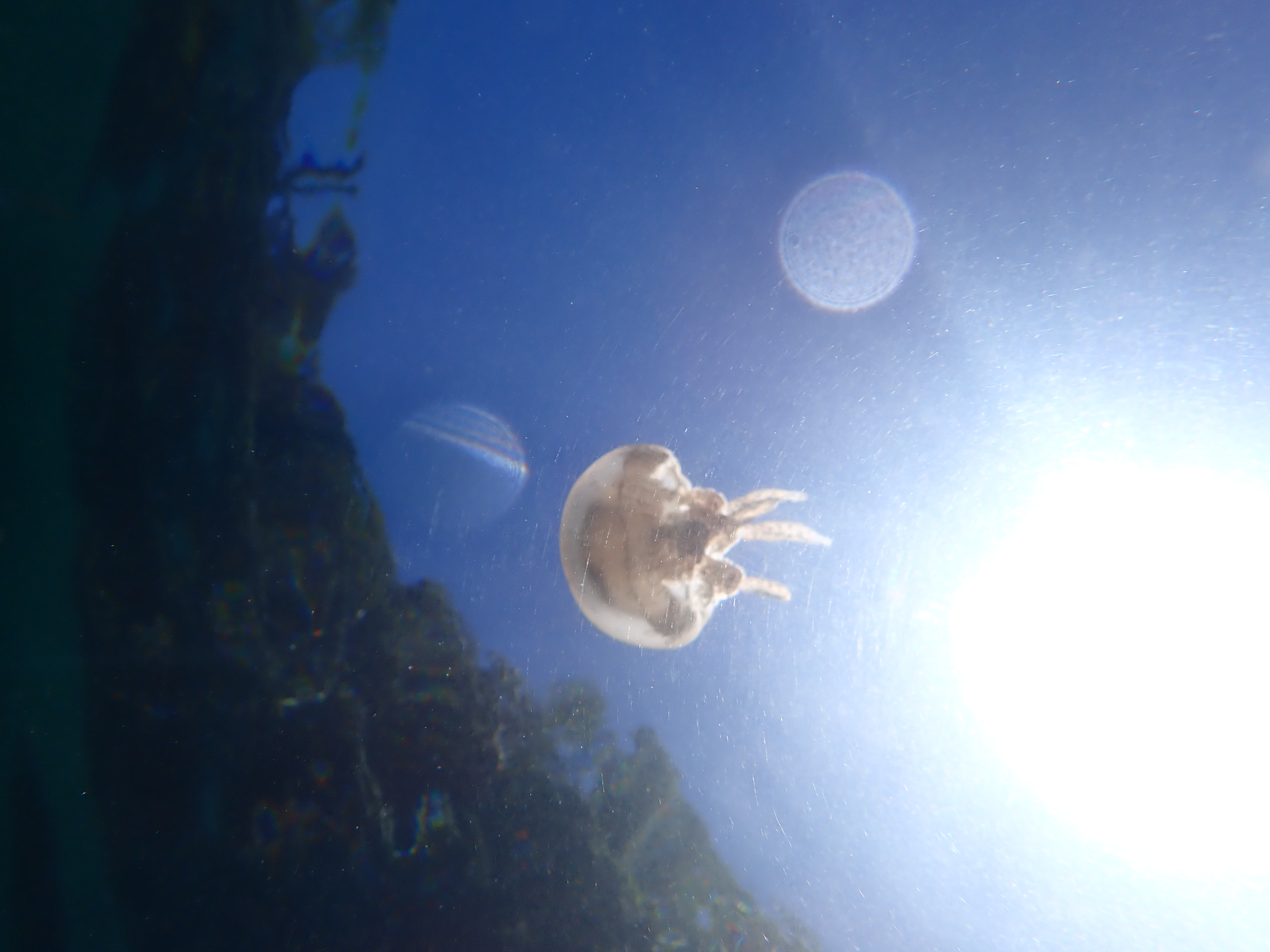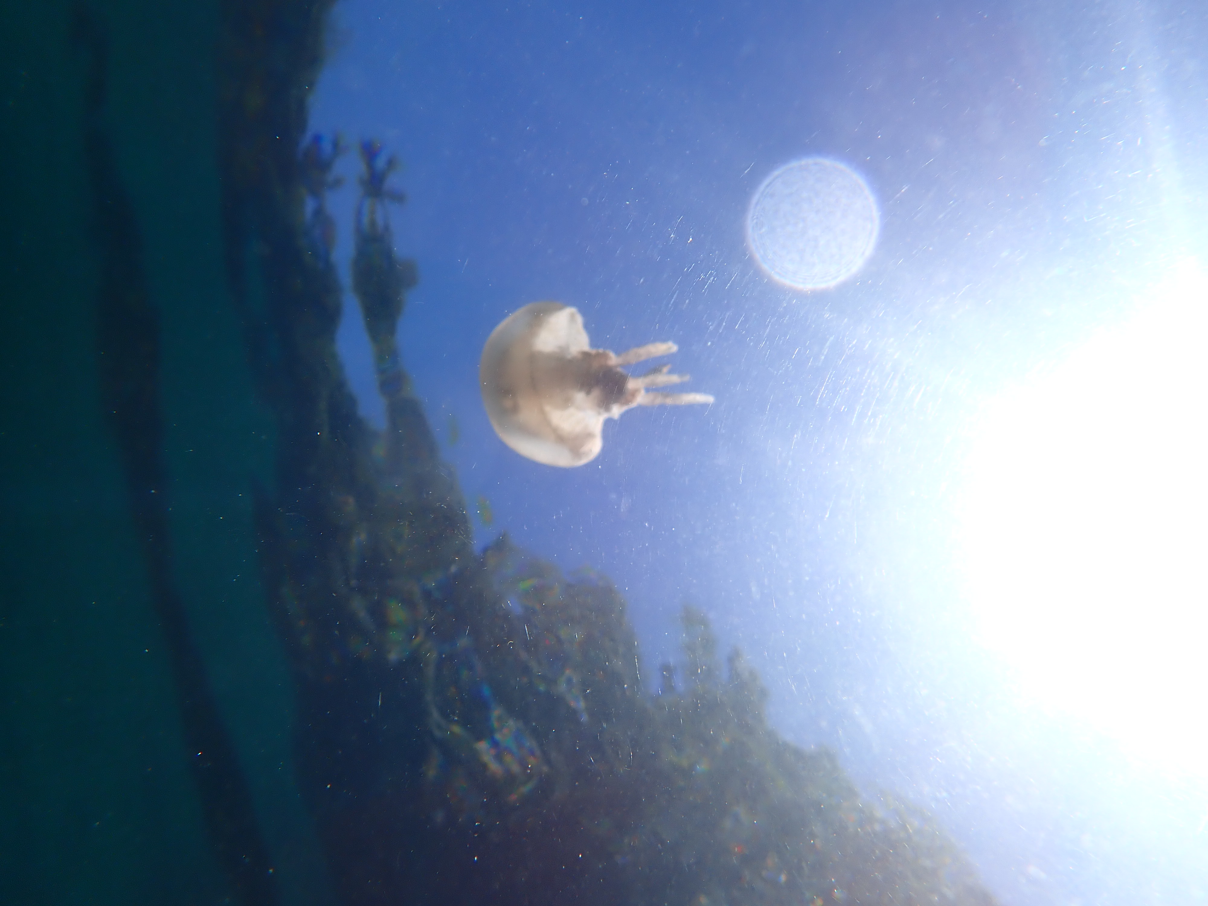 One jellyfish welcomed guests.Jellyfish are my favorite subject to photograph because they look like they are flying in the sky when photographed from underwater.
