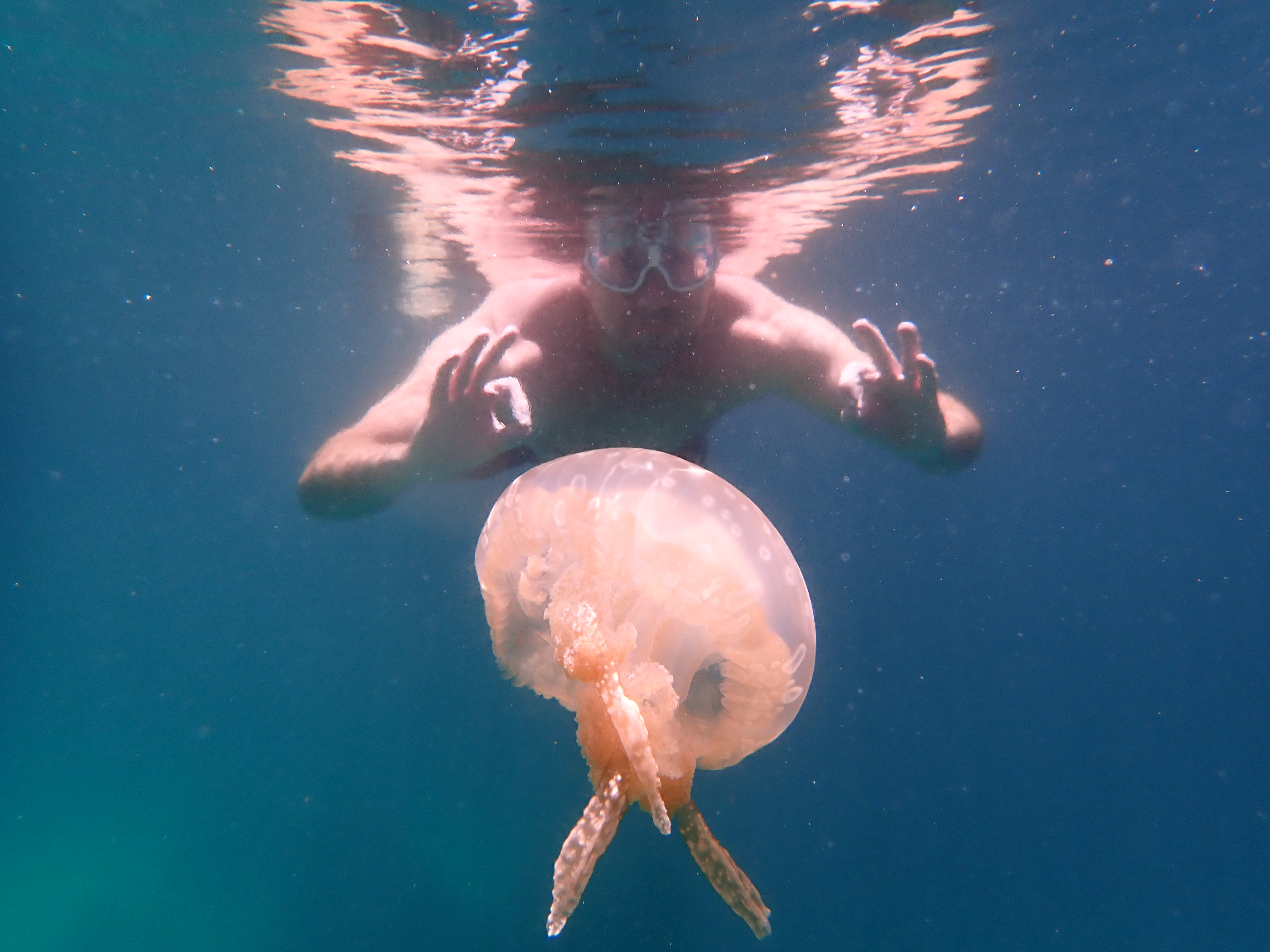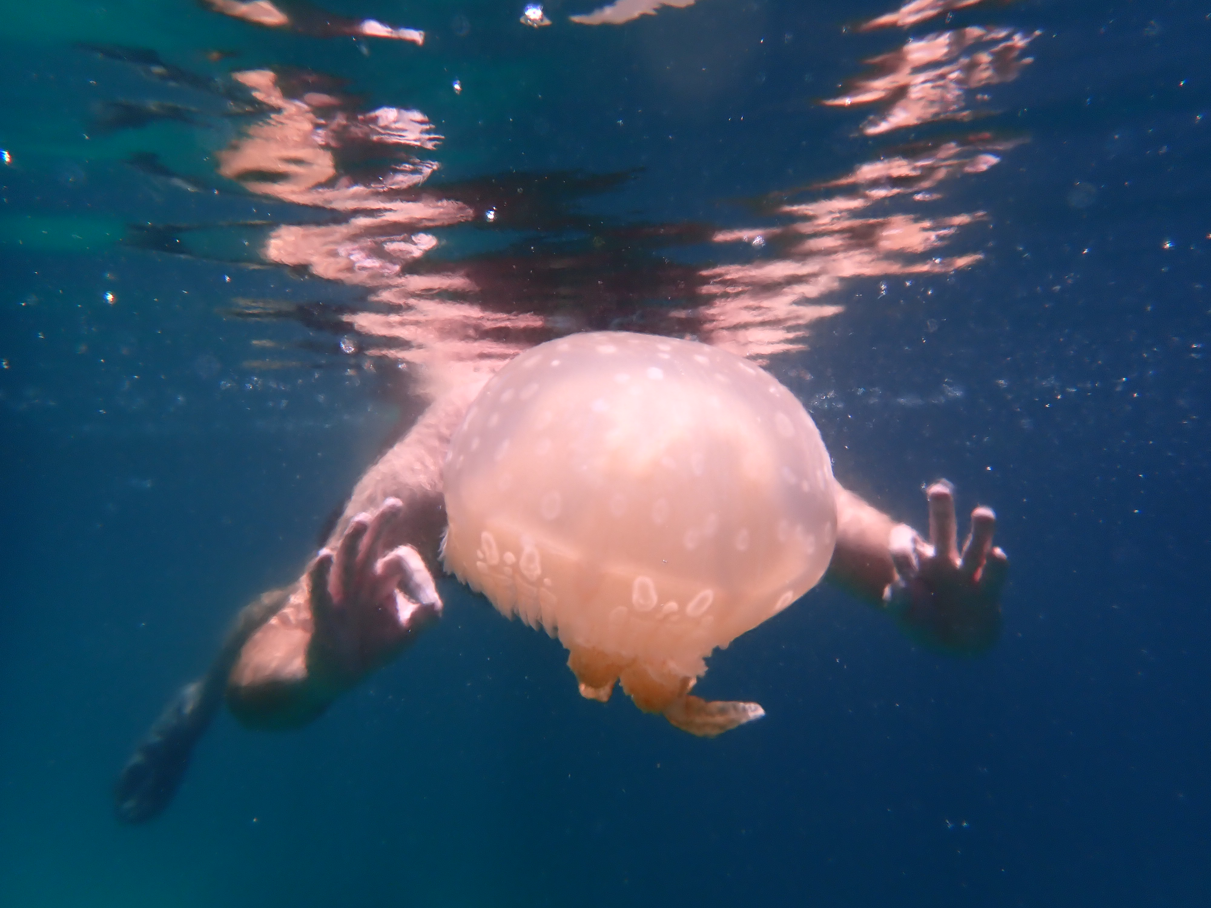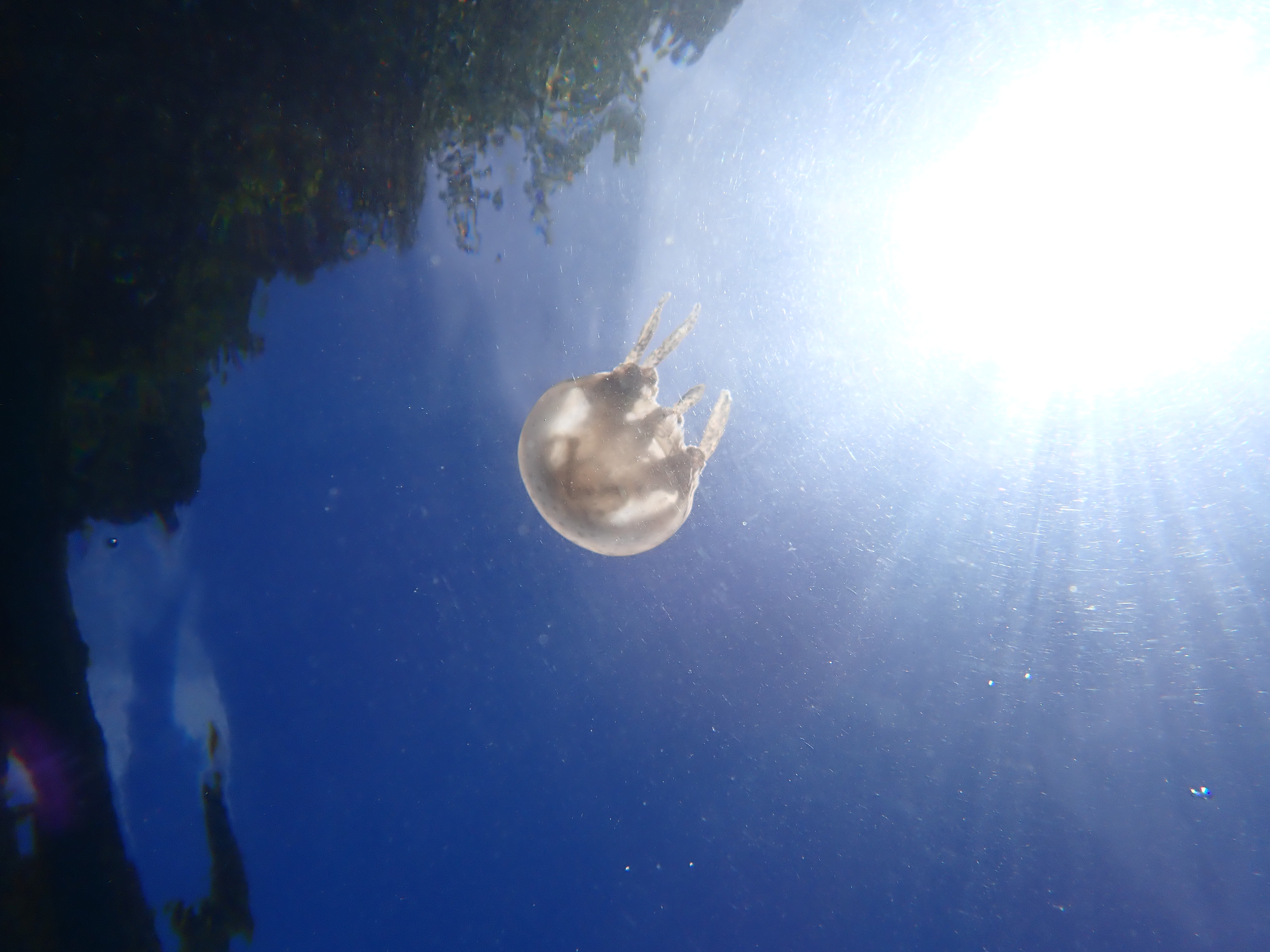 One jellyfish welcomed guests.Jellyfish are my favorite subject to photograph because they look like they are flying in the sky when photographed from underwater.