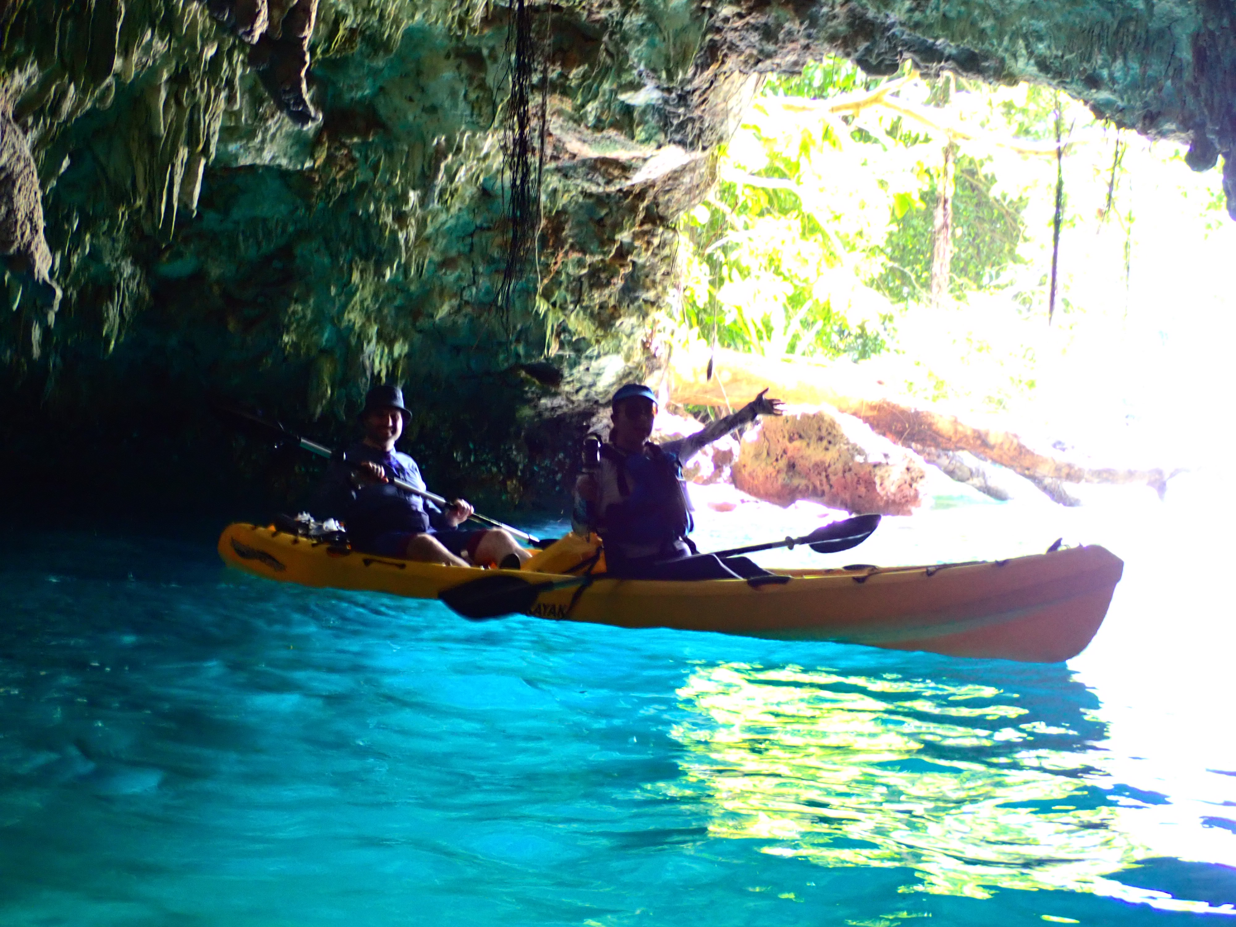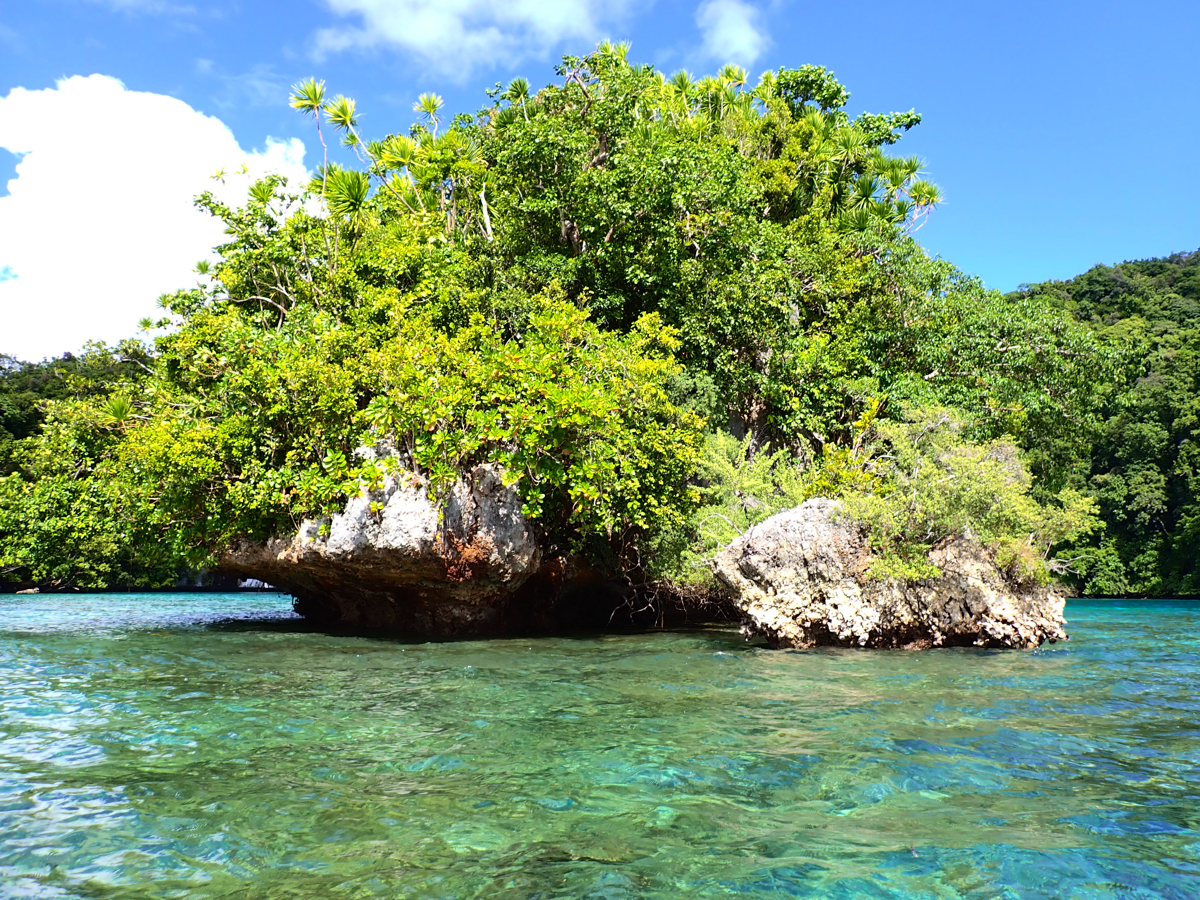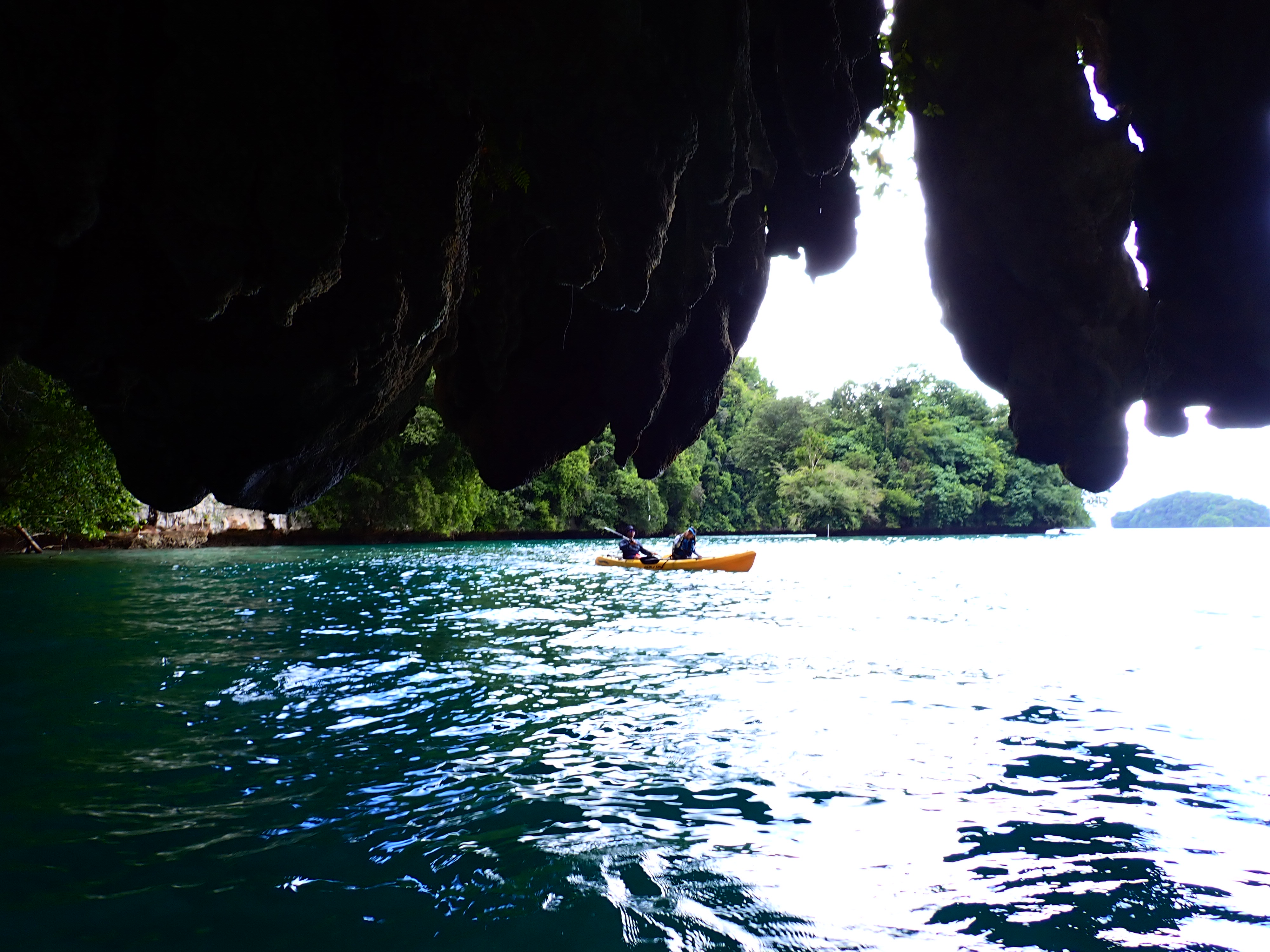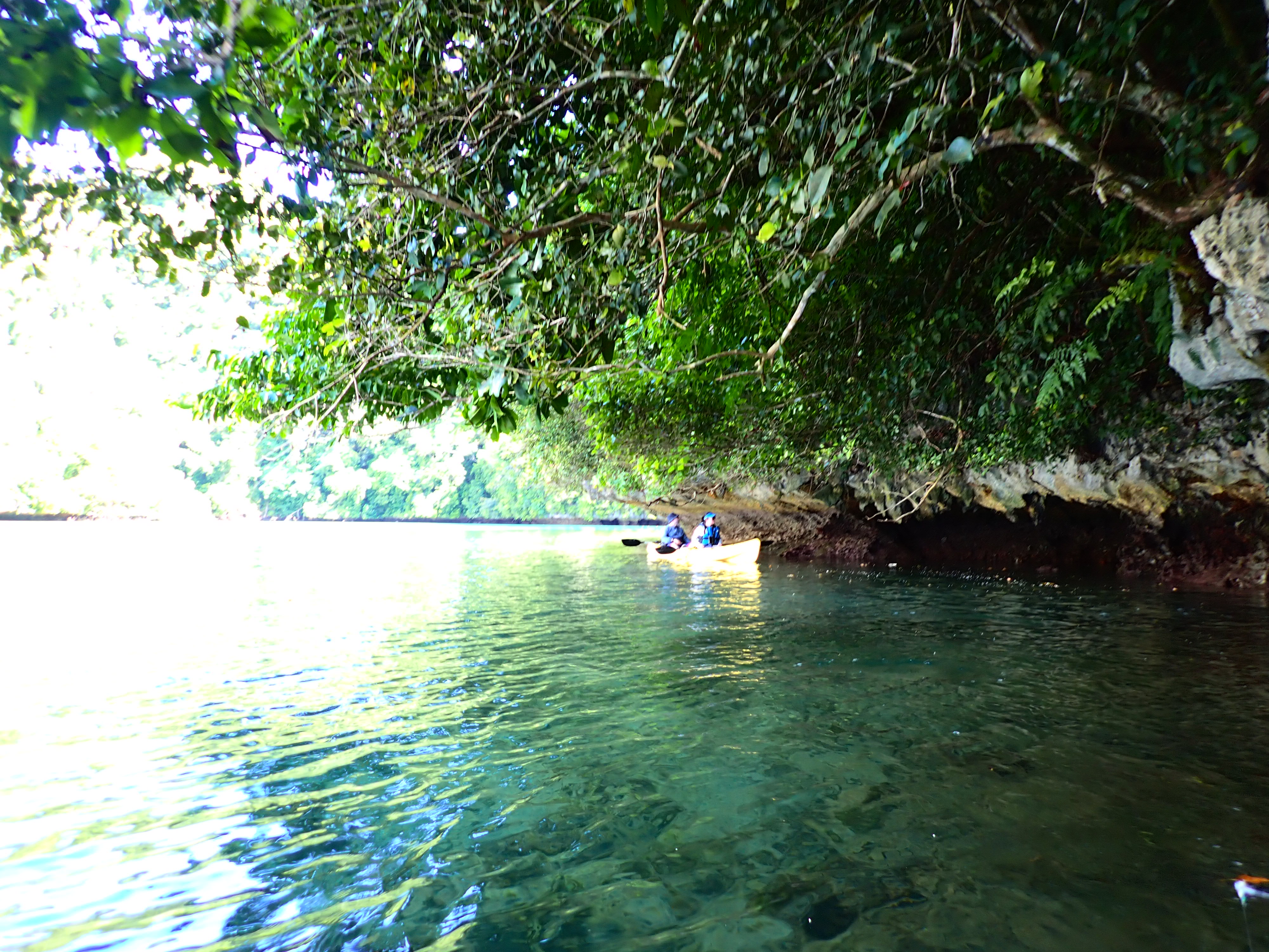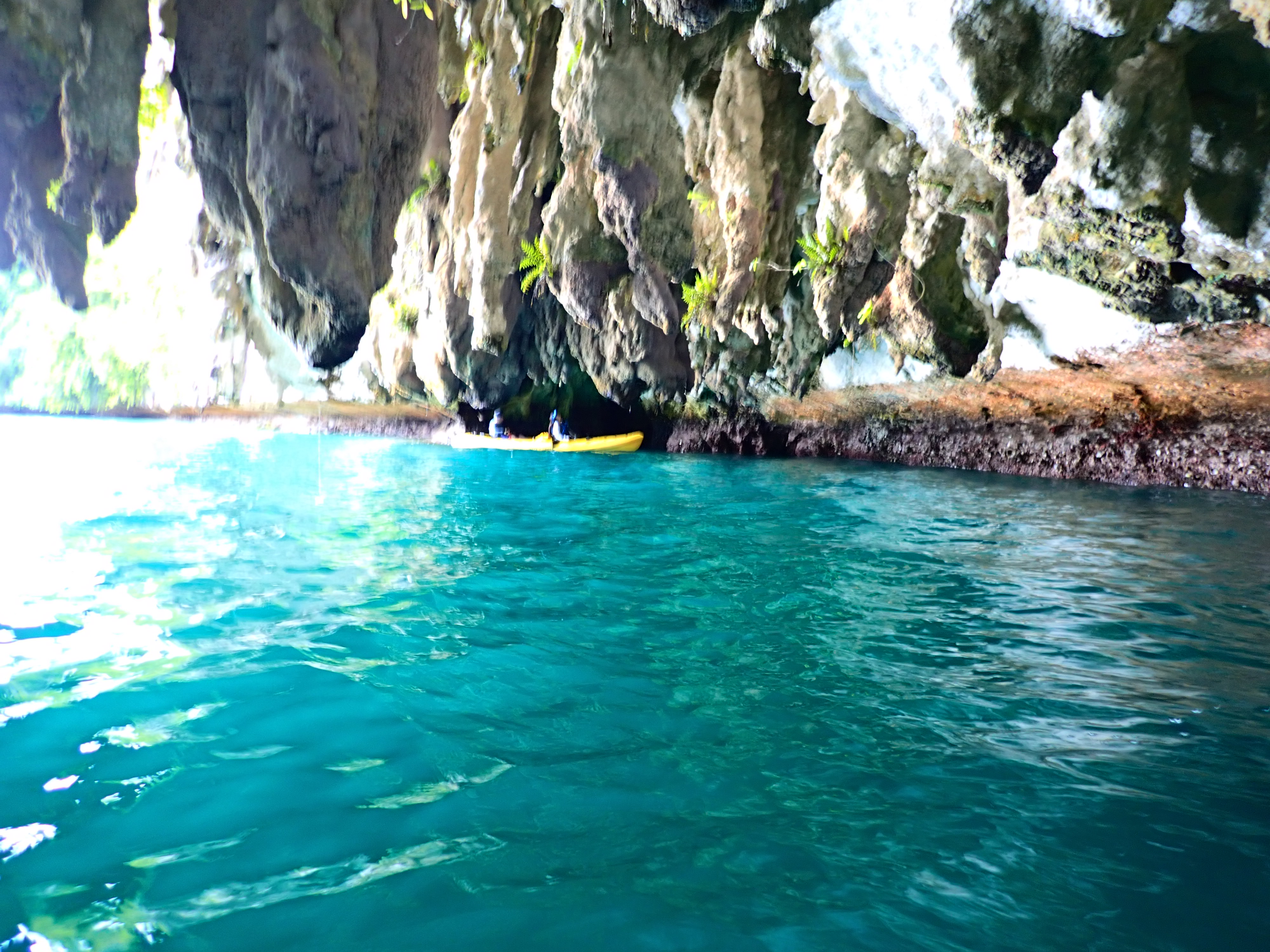 Rock Islands were once a coral reef that has been uplifted to form an island. The lower part of the island has been chipped away by various types of erosion. When kayakers pass under the rock island, if they observe carefully, they will see that one of the reasons for the erosion is that shellfish are eating and eroding the rock island.