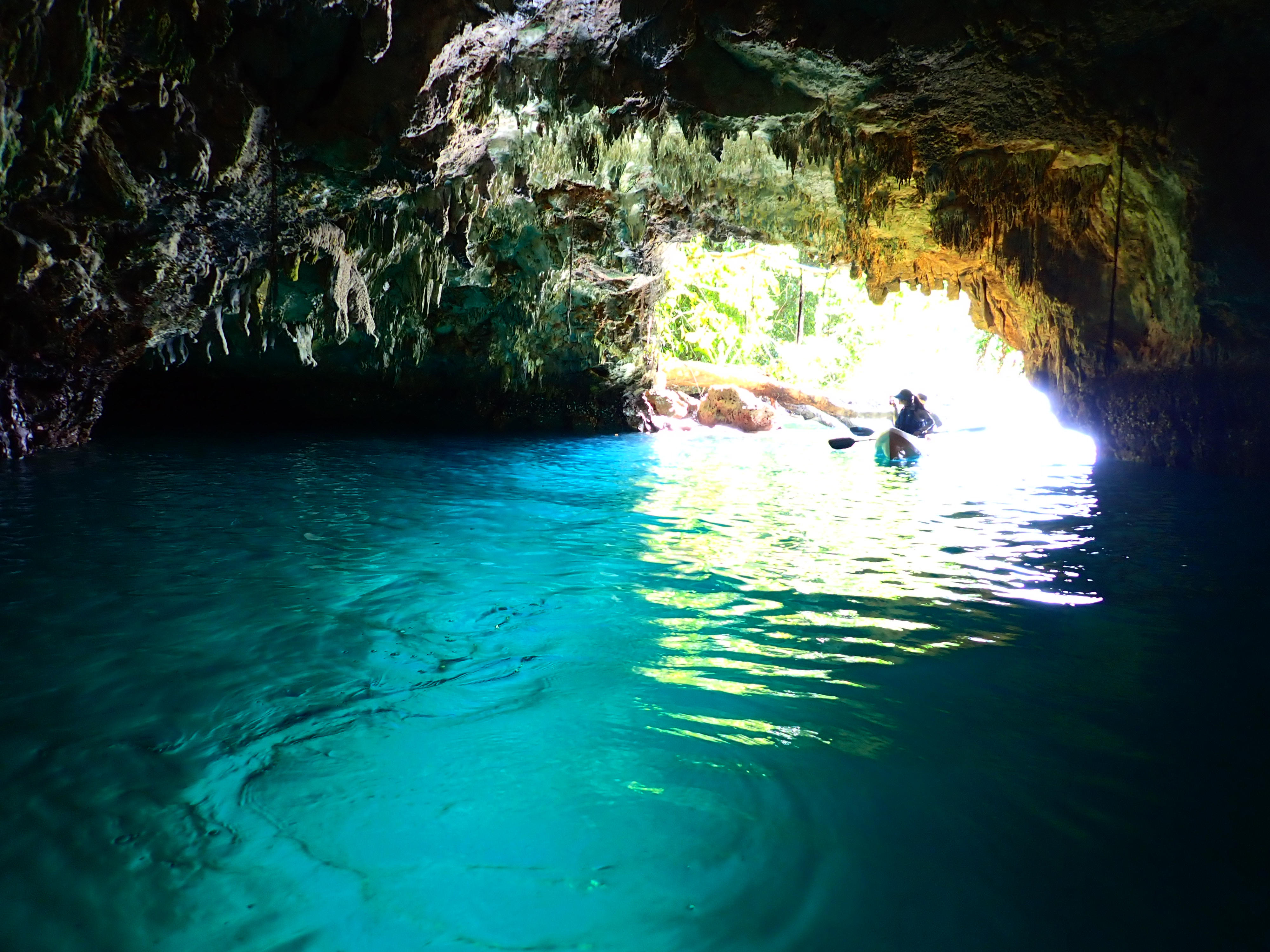 Next we visited one of the highlights of the Airai course, the Blue Cave. Today the sunlight was just right, shining into the cave, and the color of the sea was beautiful.
