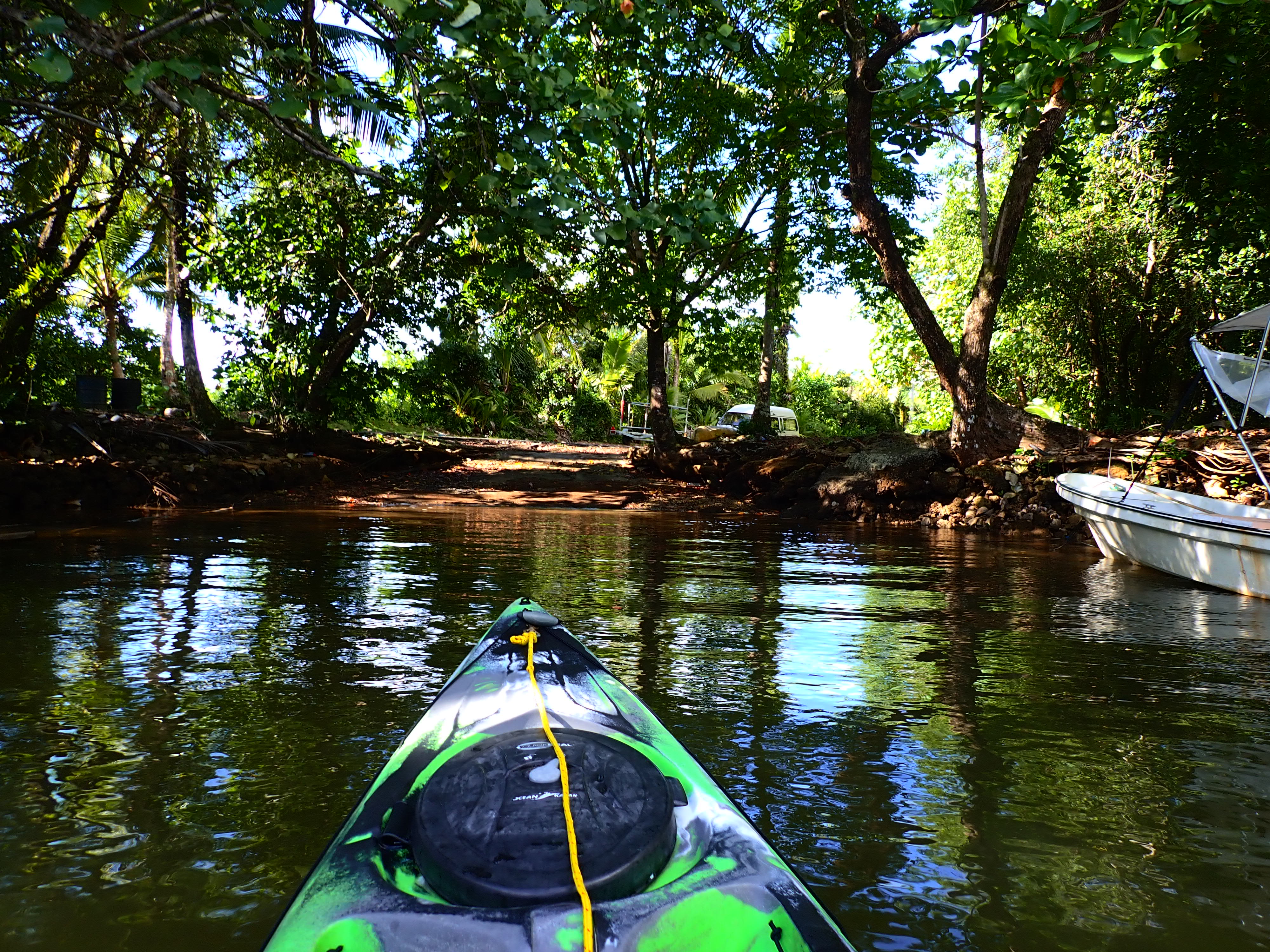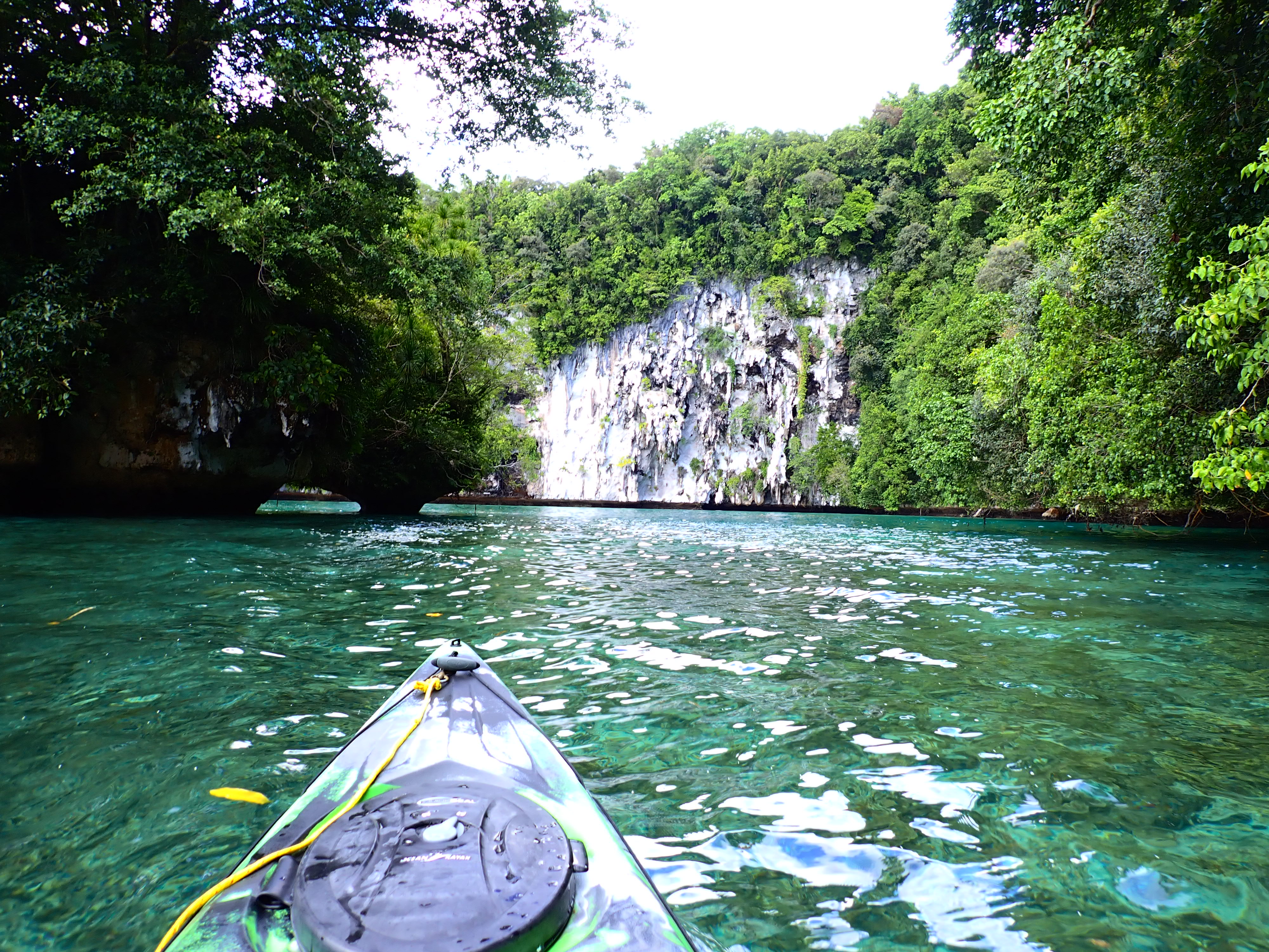 Paddling slowly and leisurely along Rock Island. Palau’s national flower, the White Rock Lily, was blooming on the island. The large bridge in the distance is the KB Bridge.