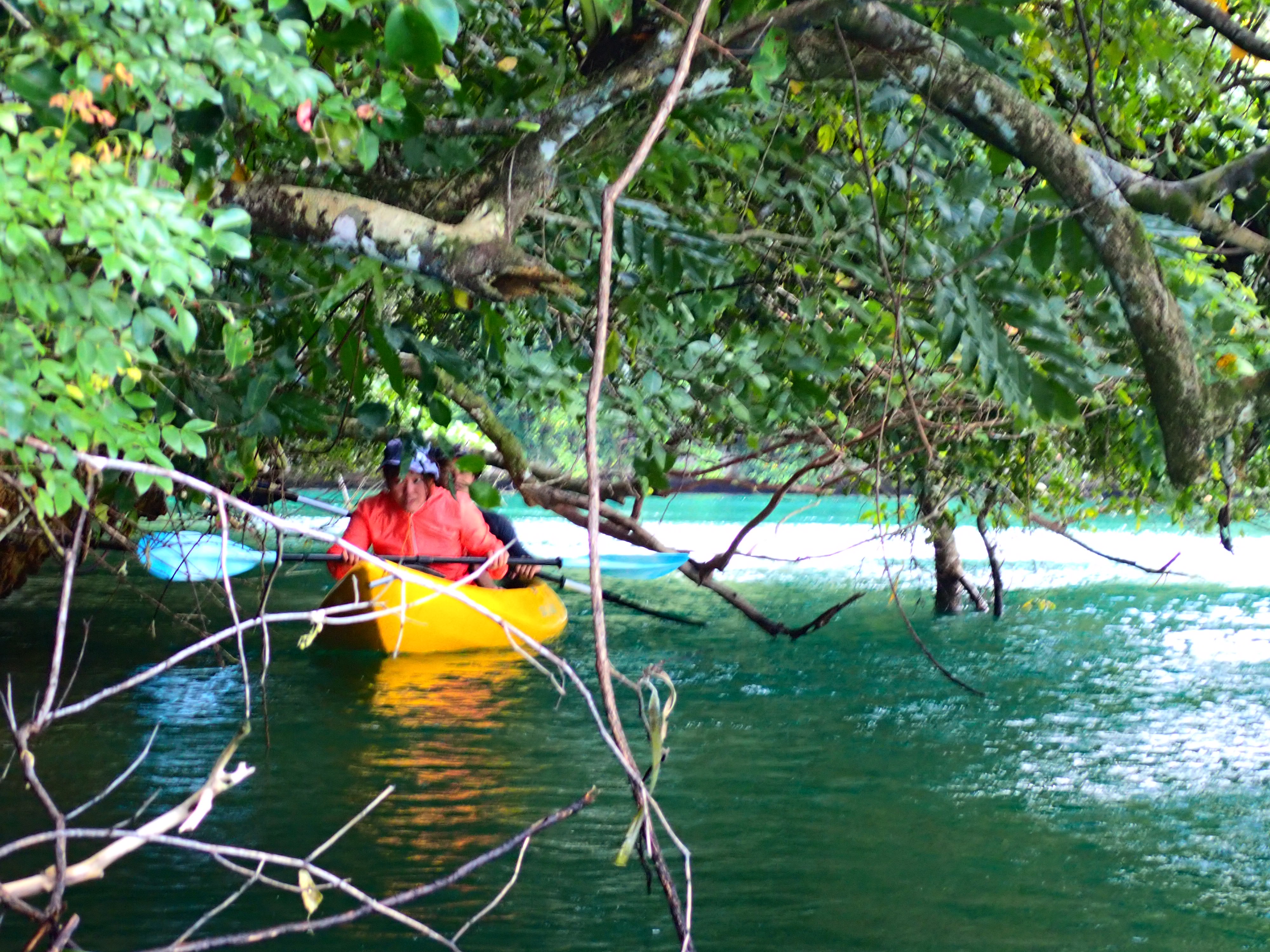 After paddling along the island of Rock Island, we took a short break in the shade of a jungle tree. The surface of the water in the cove was like a mirror, reflecting the rock island and the jungle.