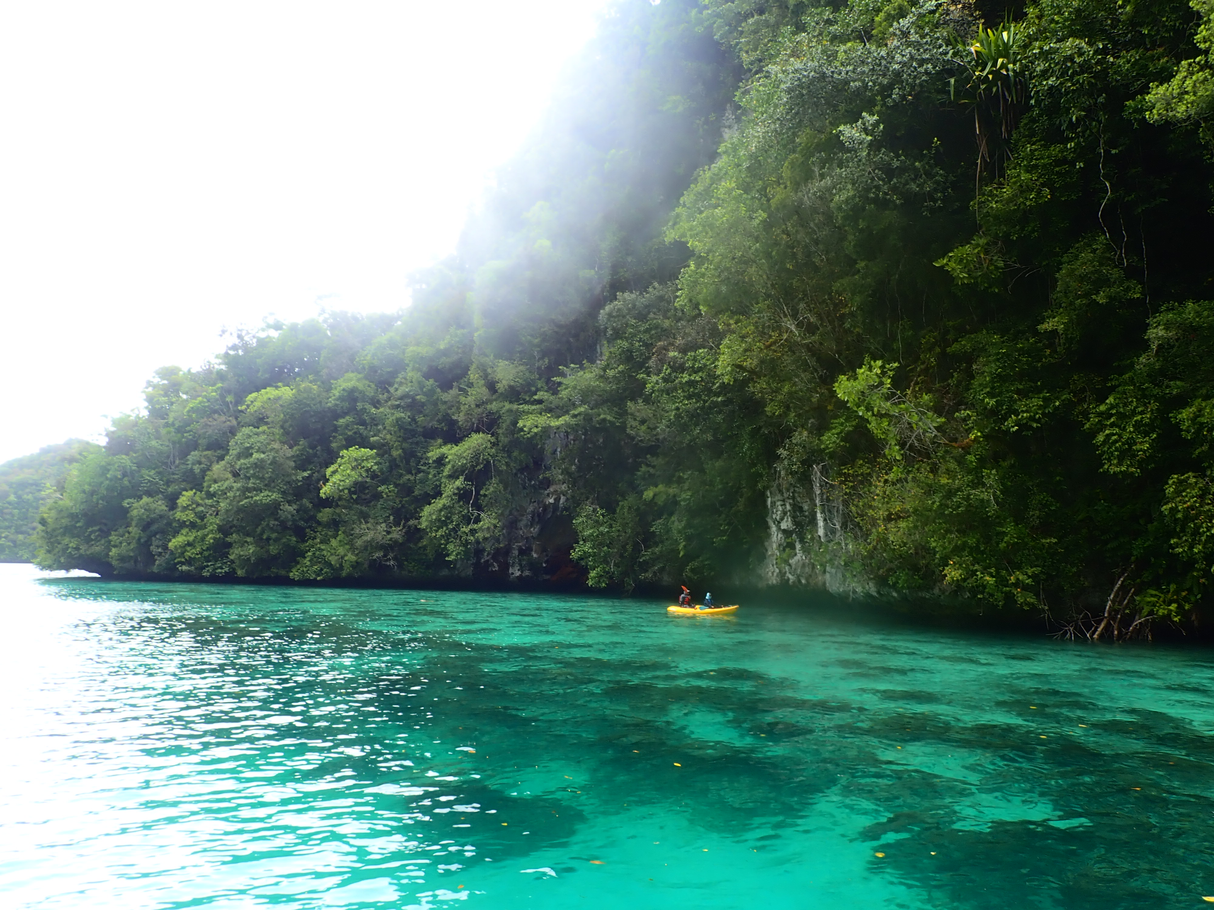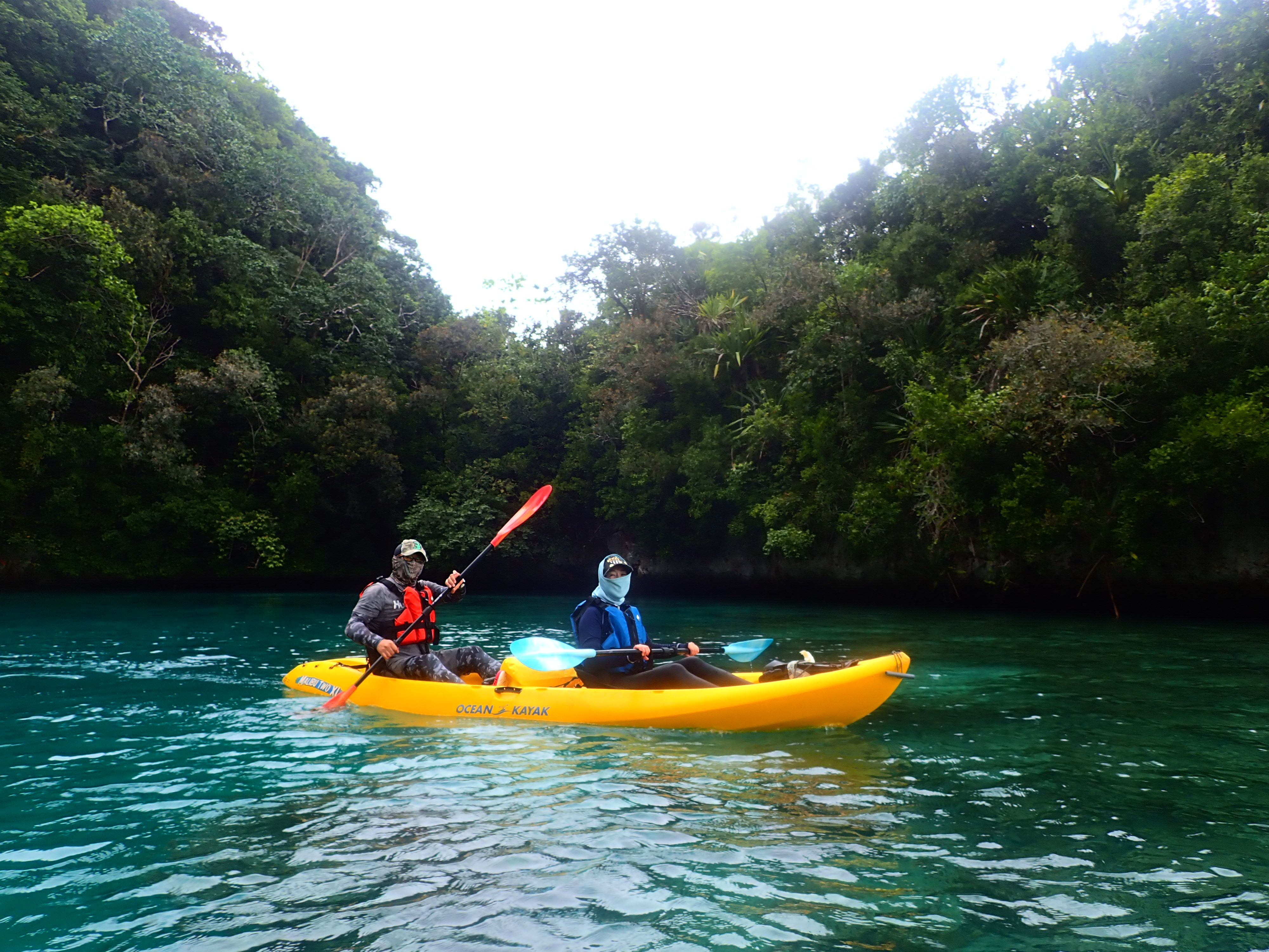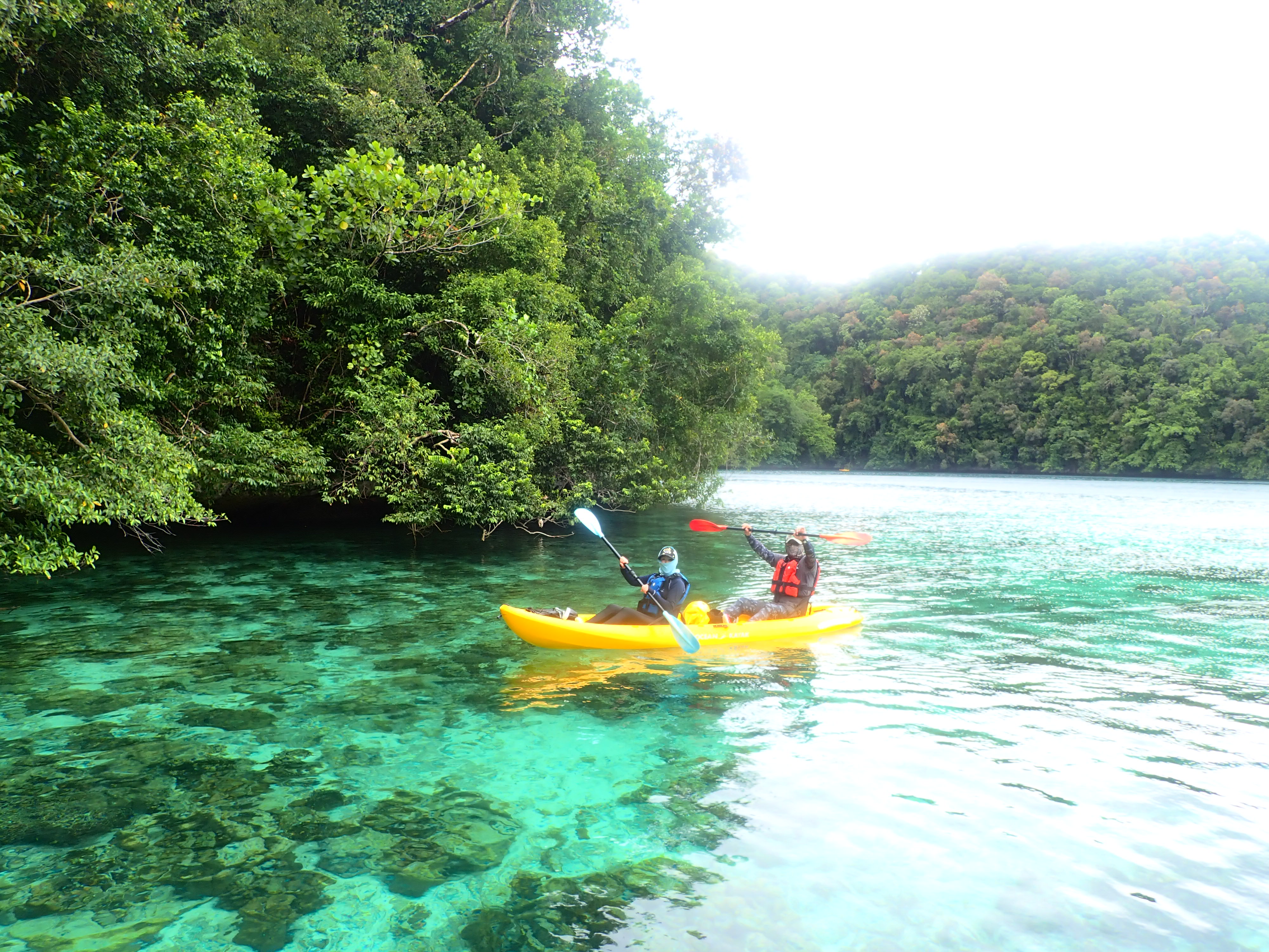 少々不安定な天気が続くパラオ、今日は朝から風も強く、曇り時々雨。ですがパラオ松島内はいつも通りの穏やかさ。風が当たっていない場所は透明度の良さをカヤックの上からでもわかります。