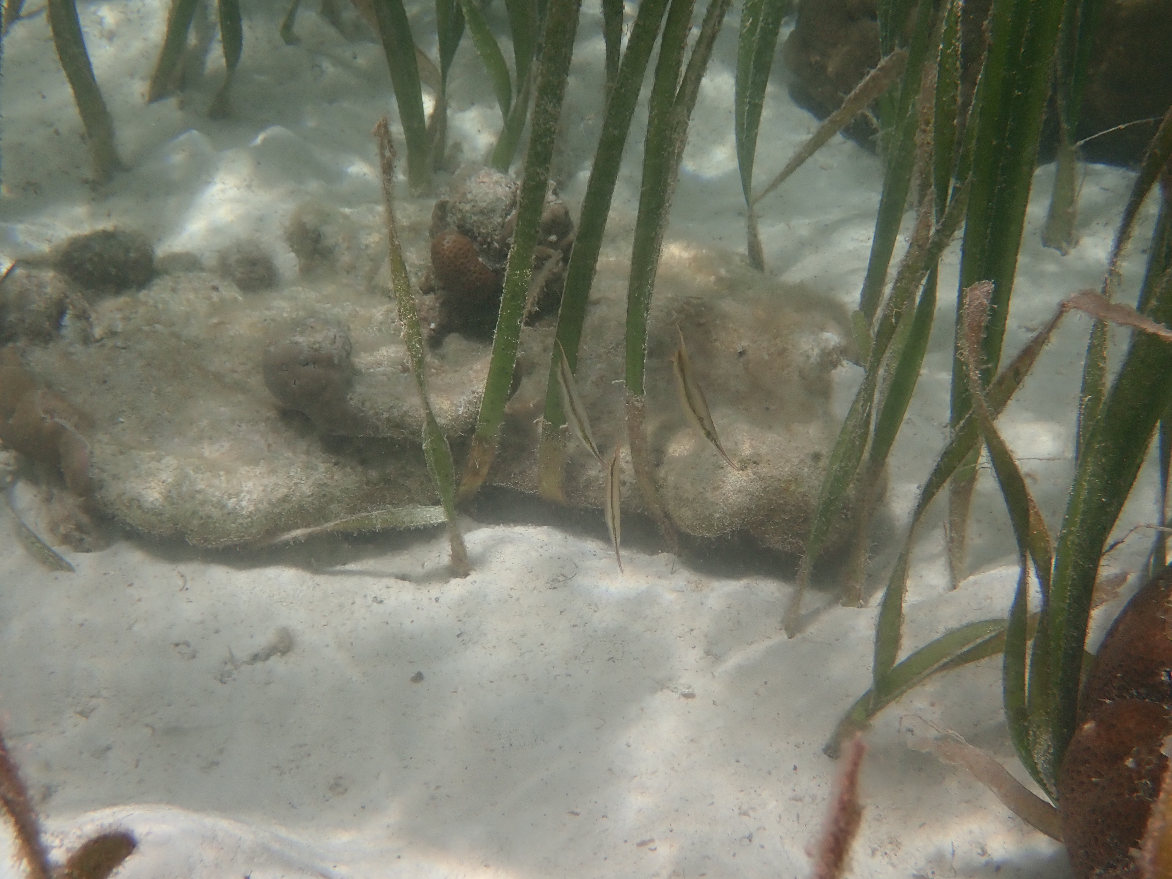 少々見ずらいですが、写真中央に縦向きで泳いでいる魚がいます。水族館の擬態コーナーによくいるヘコアユです。海草の切れ端に化けているんですね。上の写真にもよく見ると写っています。