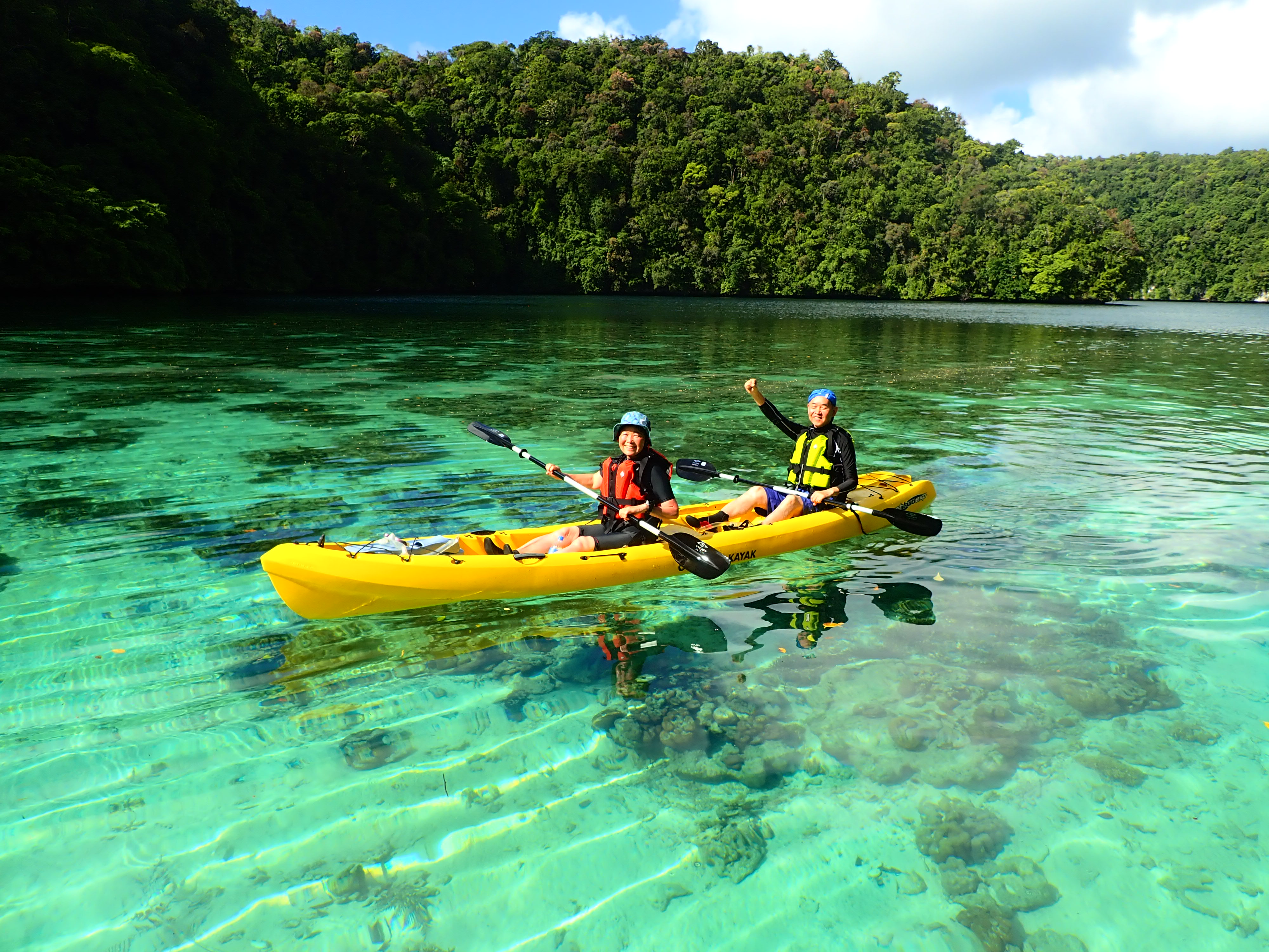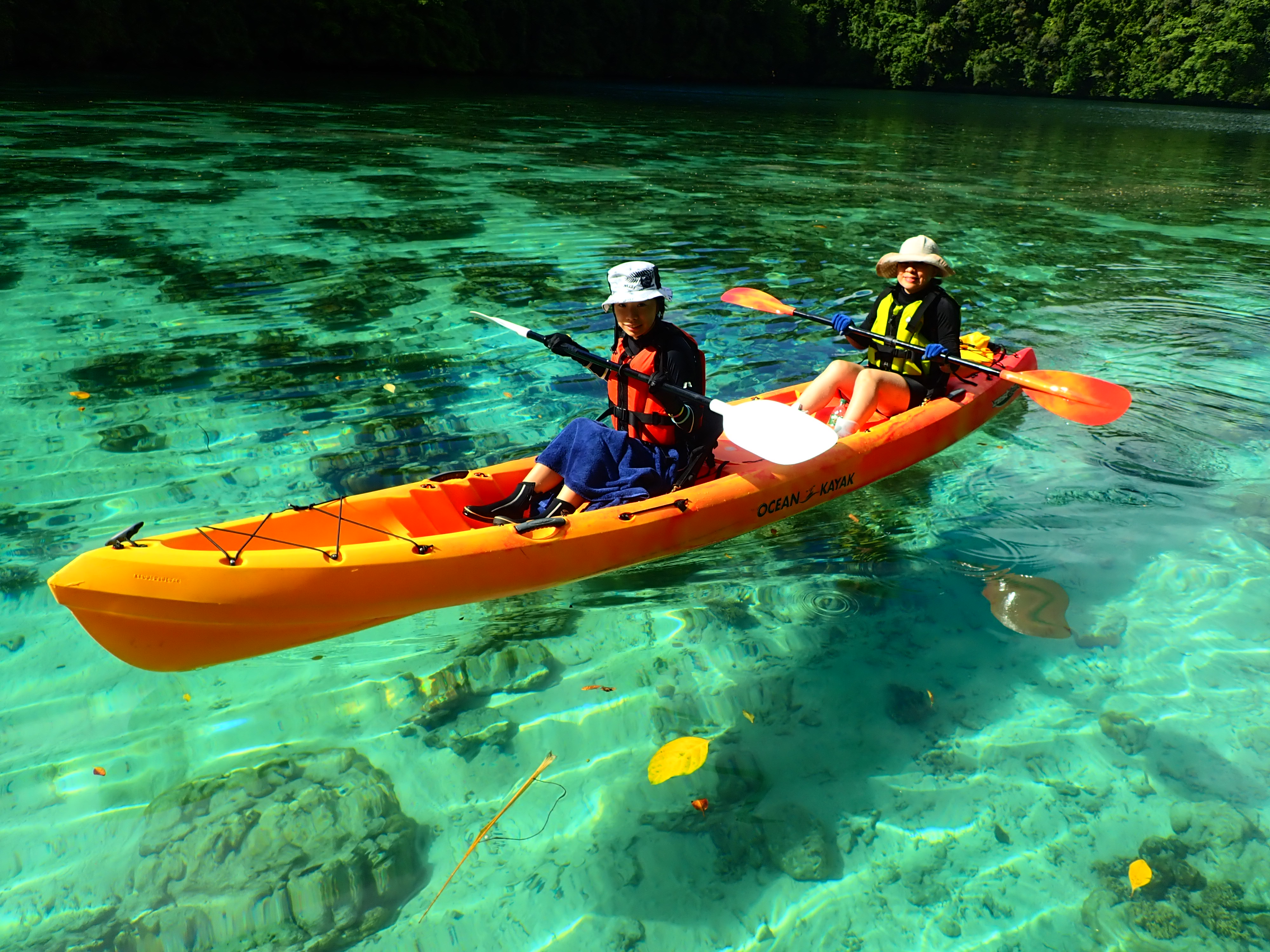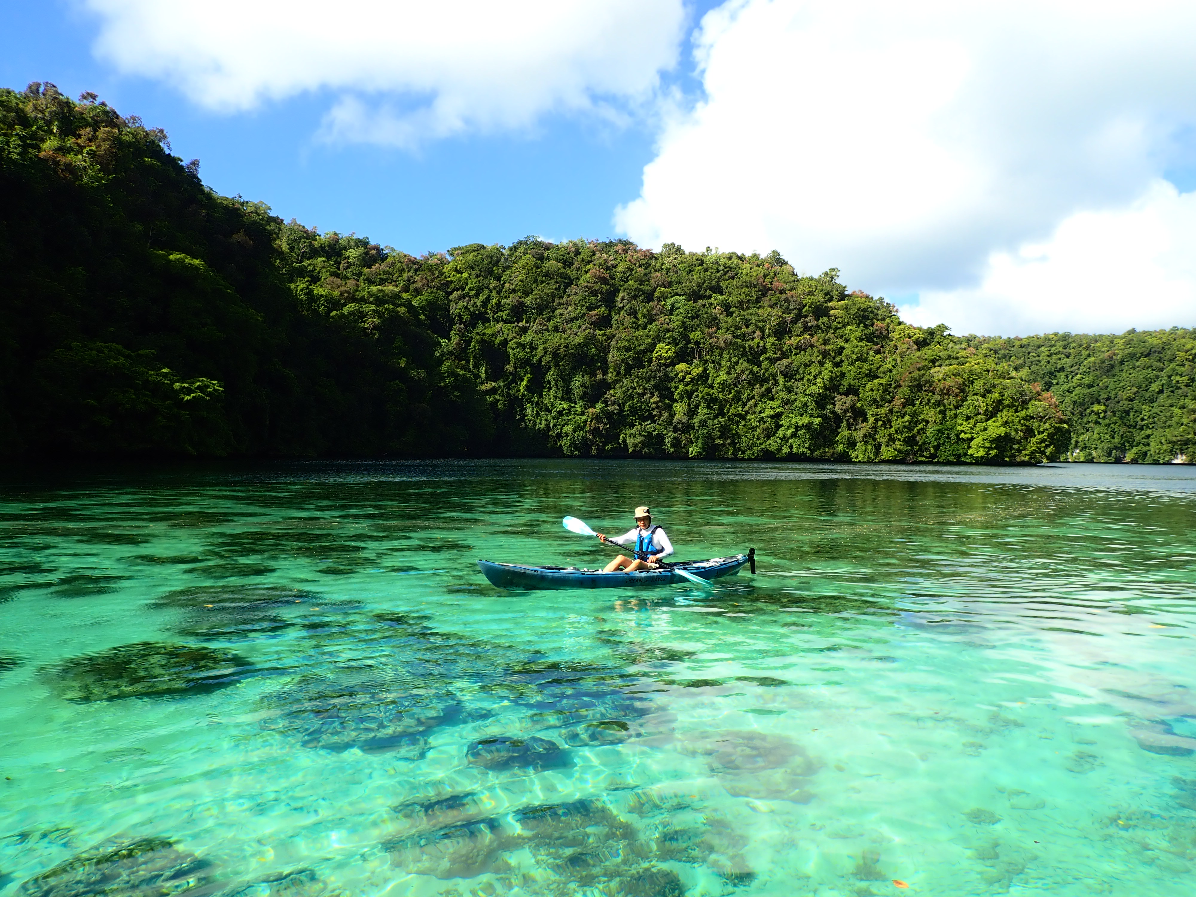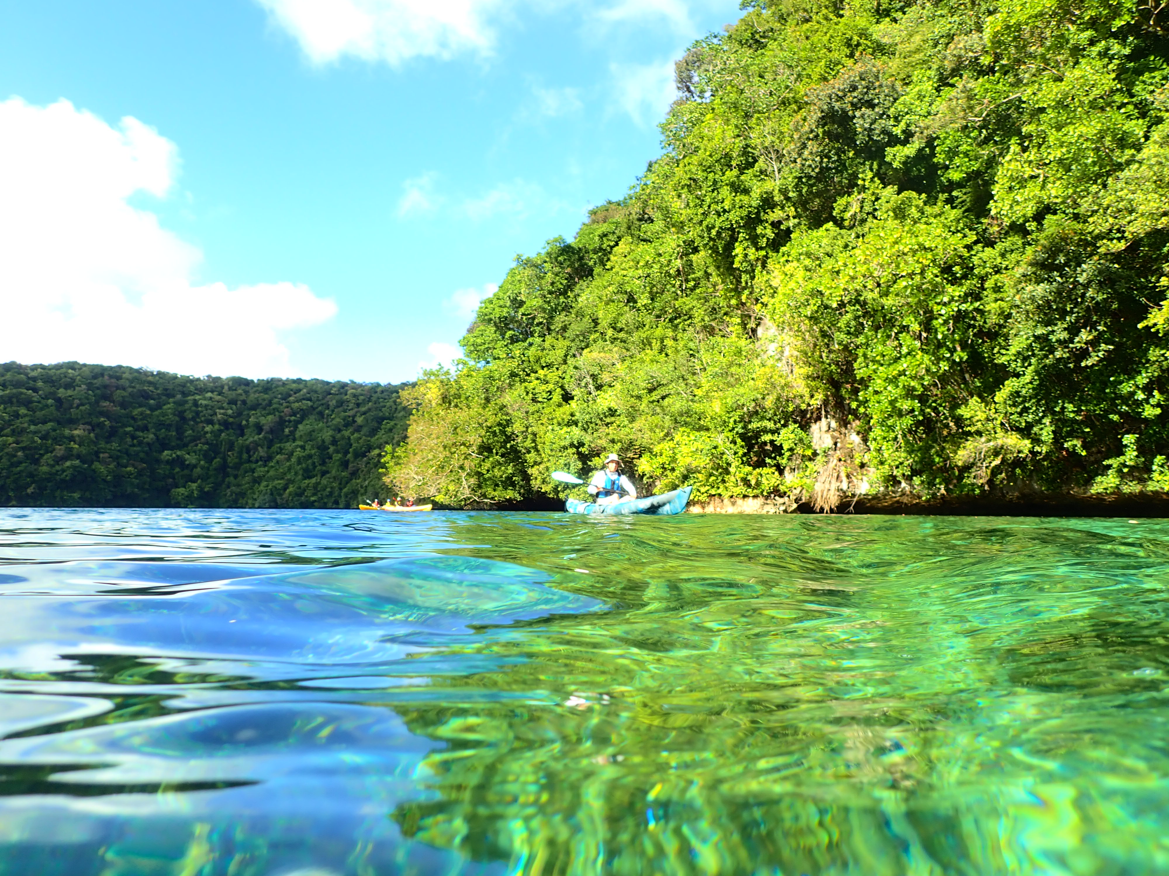 元々穏やかなパラオ松島、入り江に入ると風も弱まり、浅瀬ではこんな美しい景色が楽しめます。カヤックの上から海を覗くと珊瑚や魚達が綺麗です。