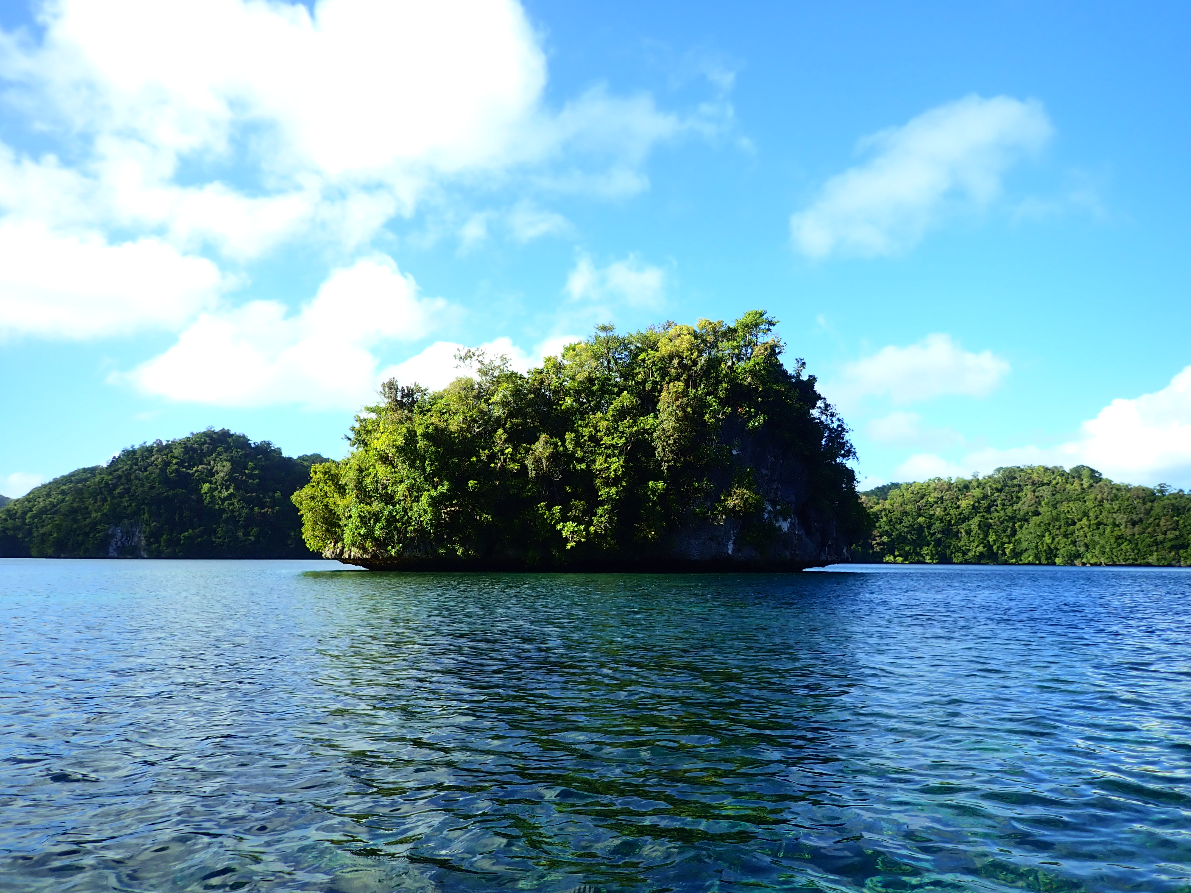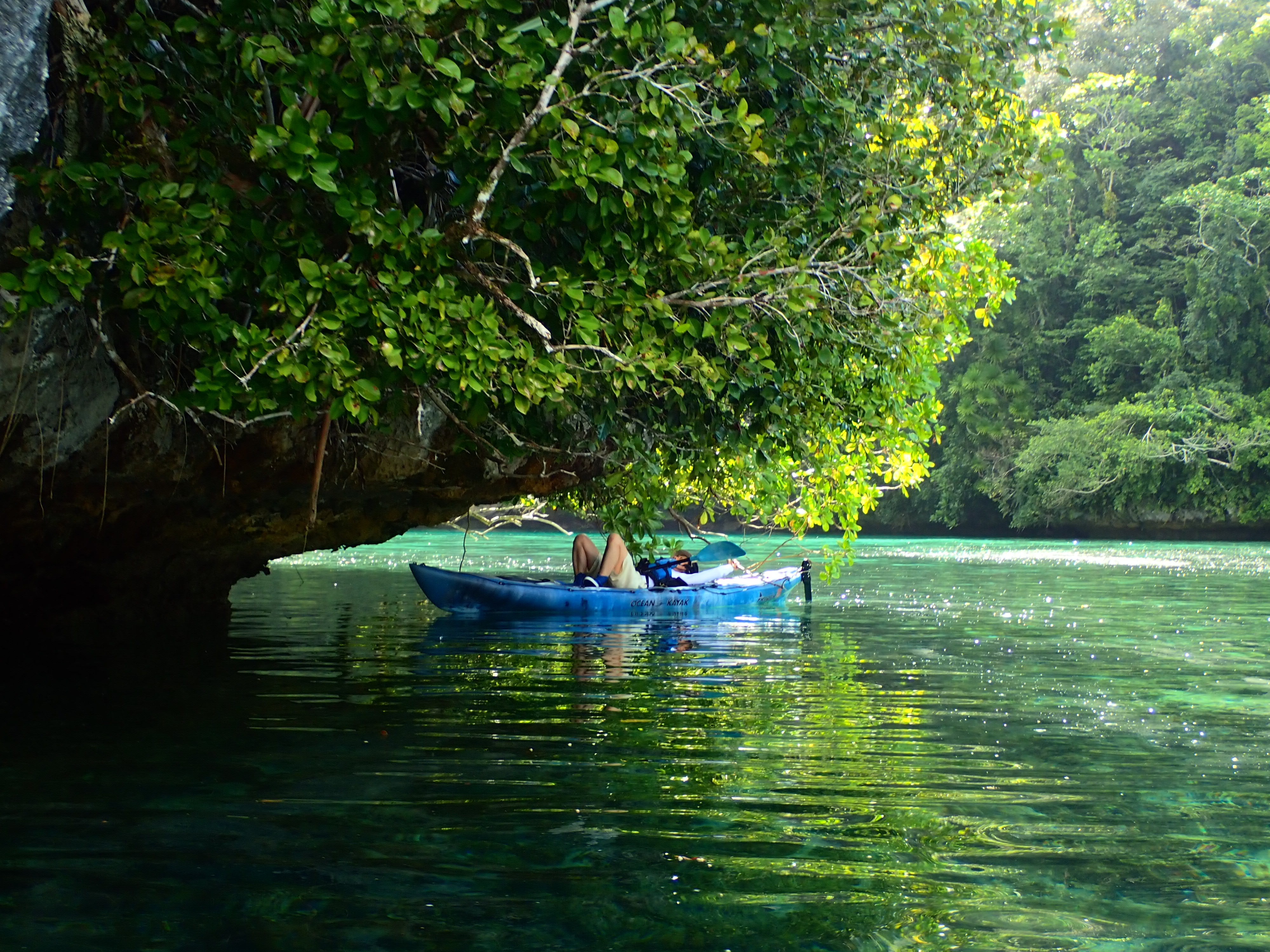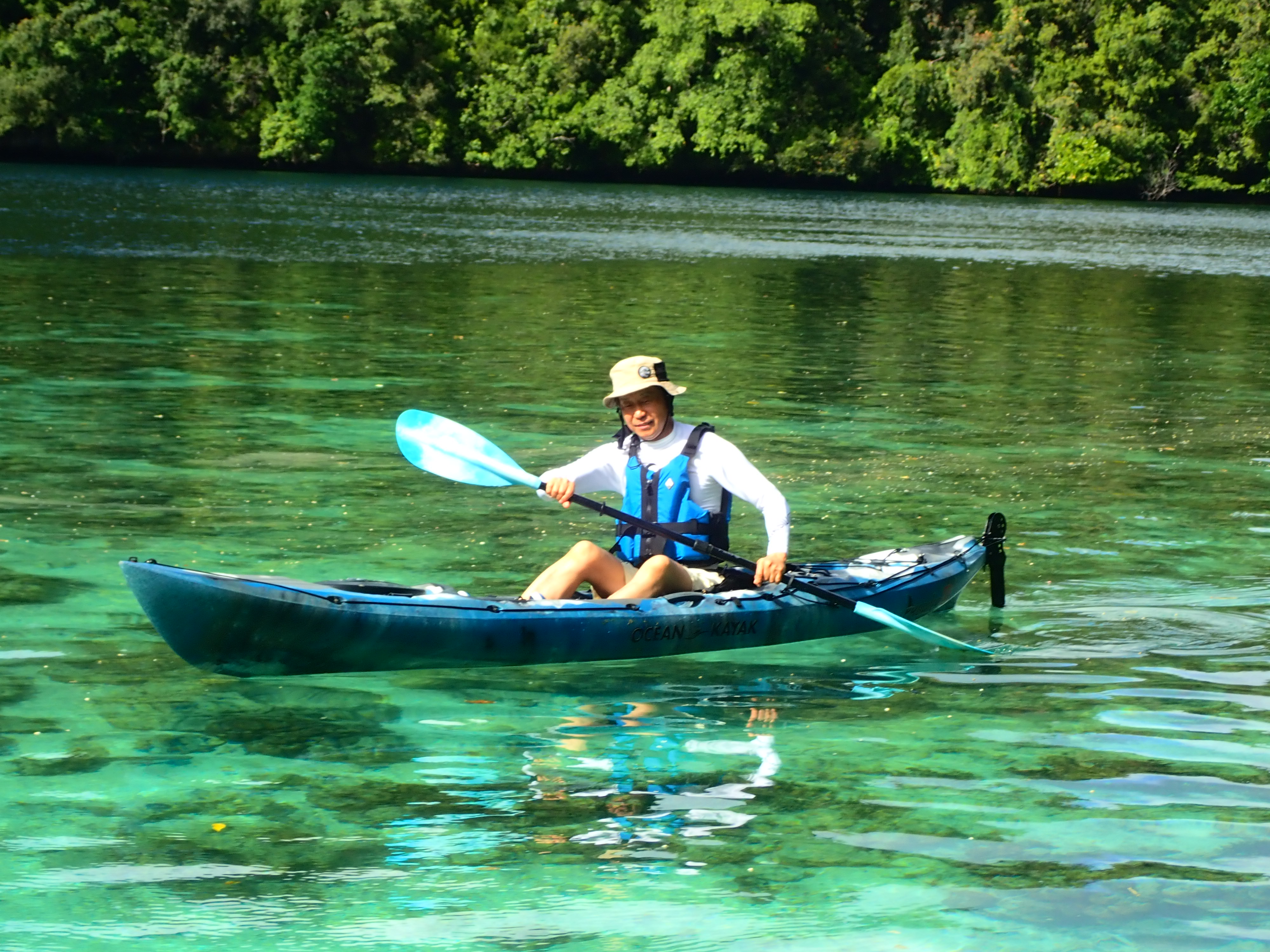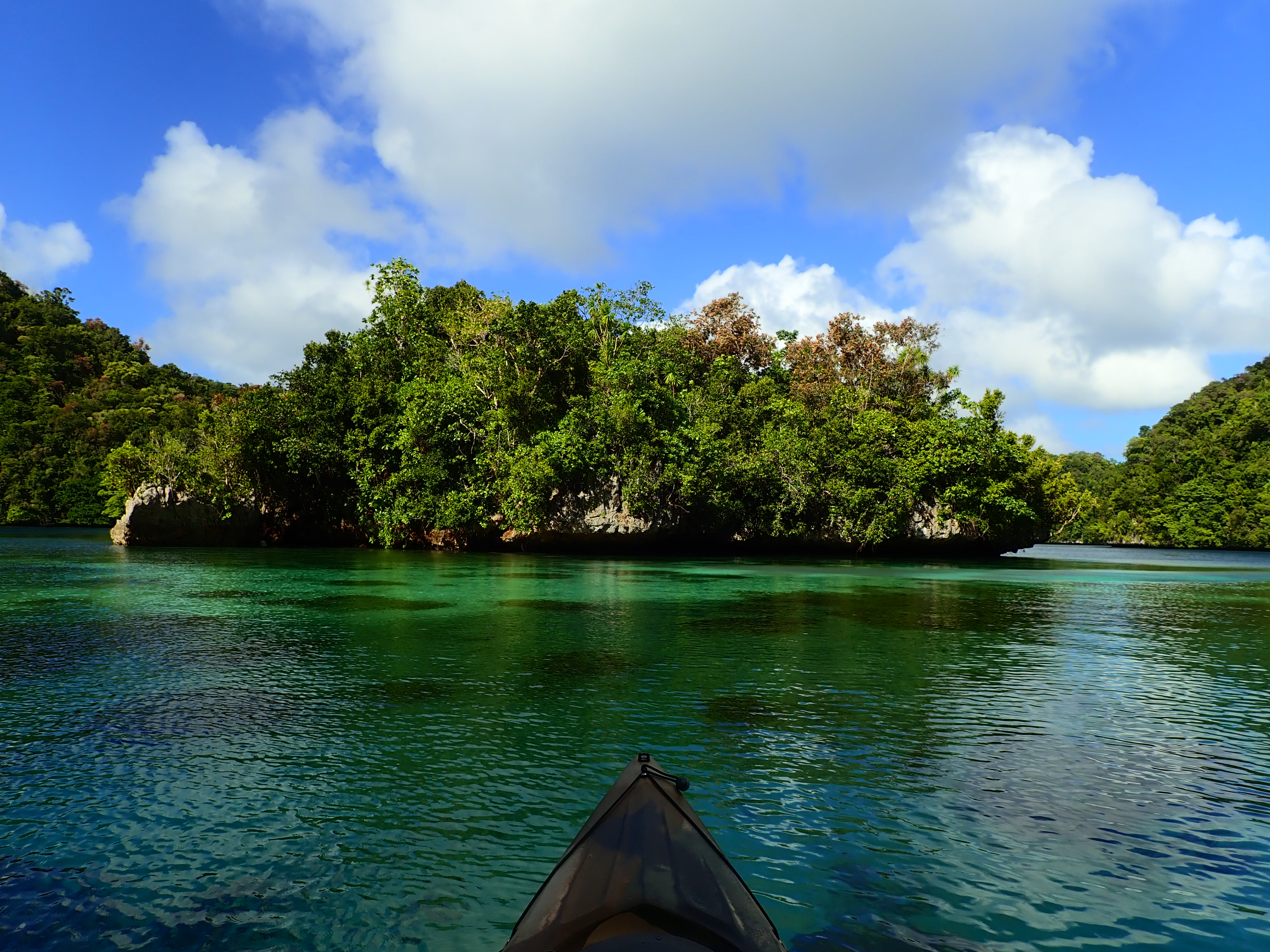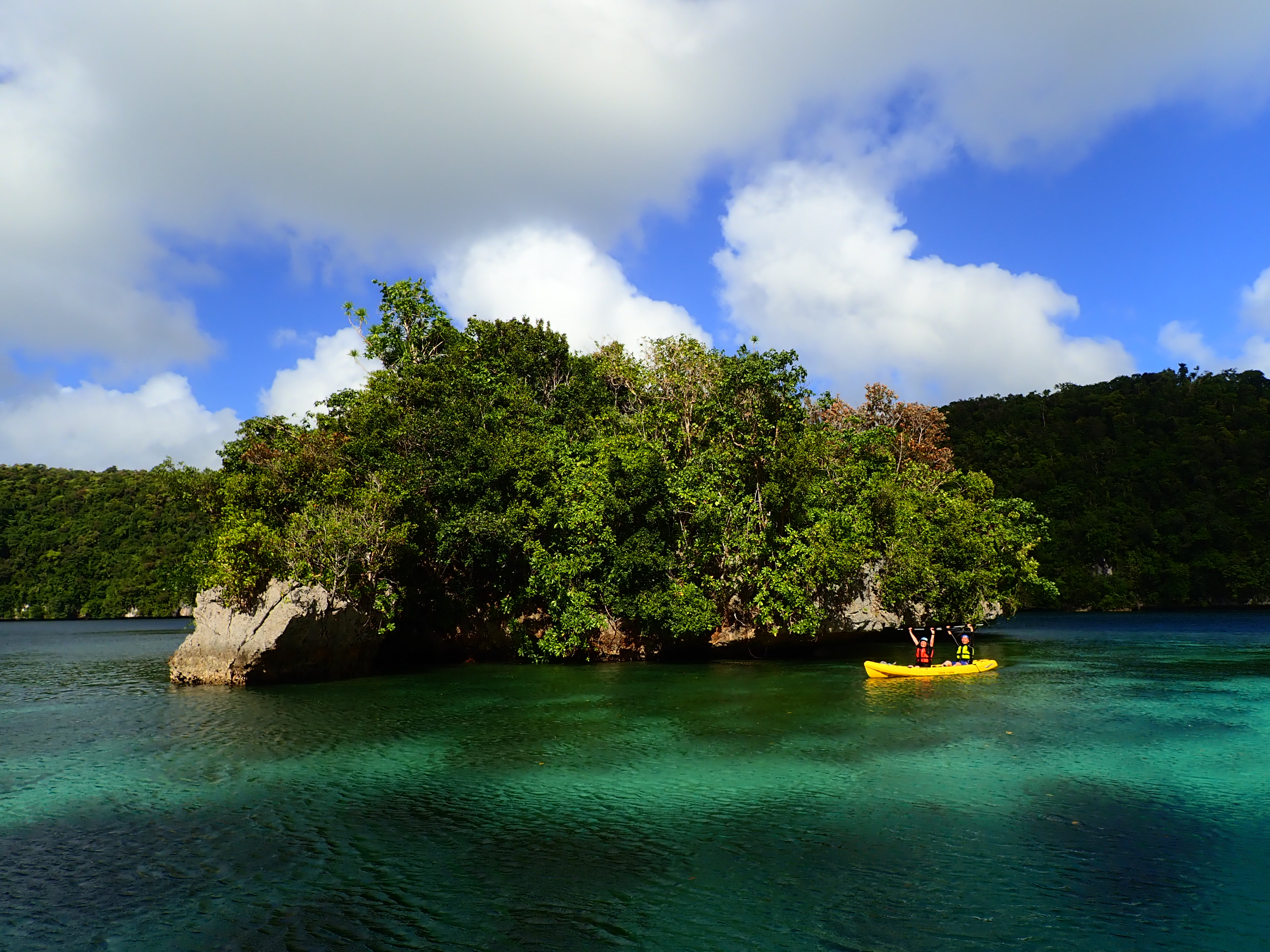元々穏やかなパラオ松島、入り江に入ると風も弱まり、浅瀬ではこんな美しい景色が楽しめます。カヤックの上から海を覗くと珊瑚や魚達が綺麗です。