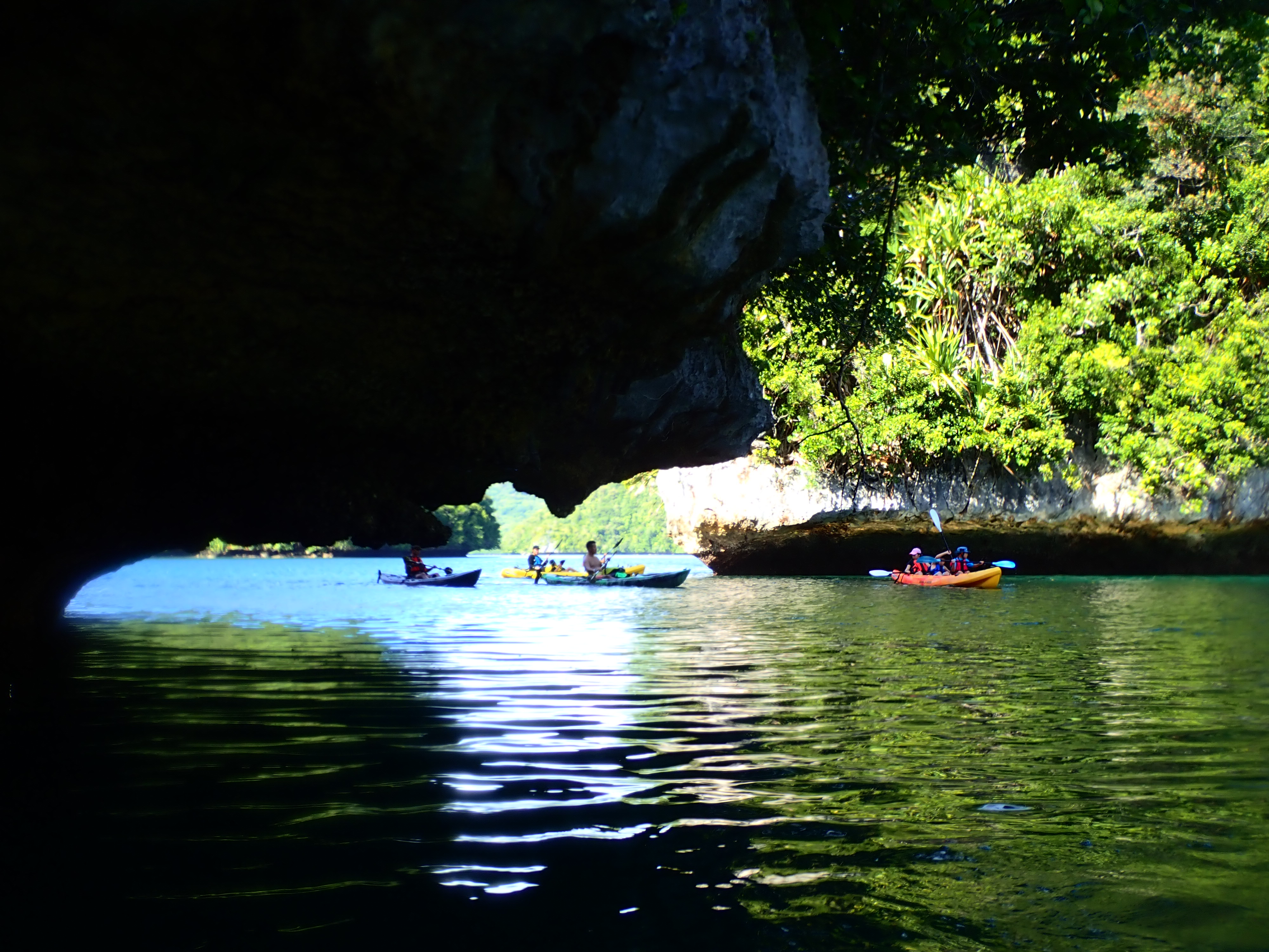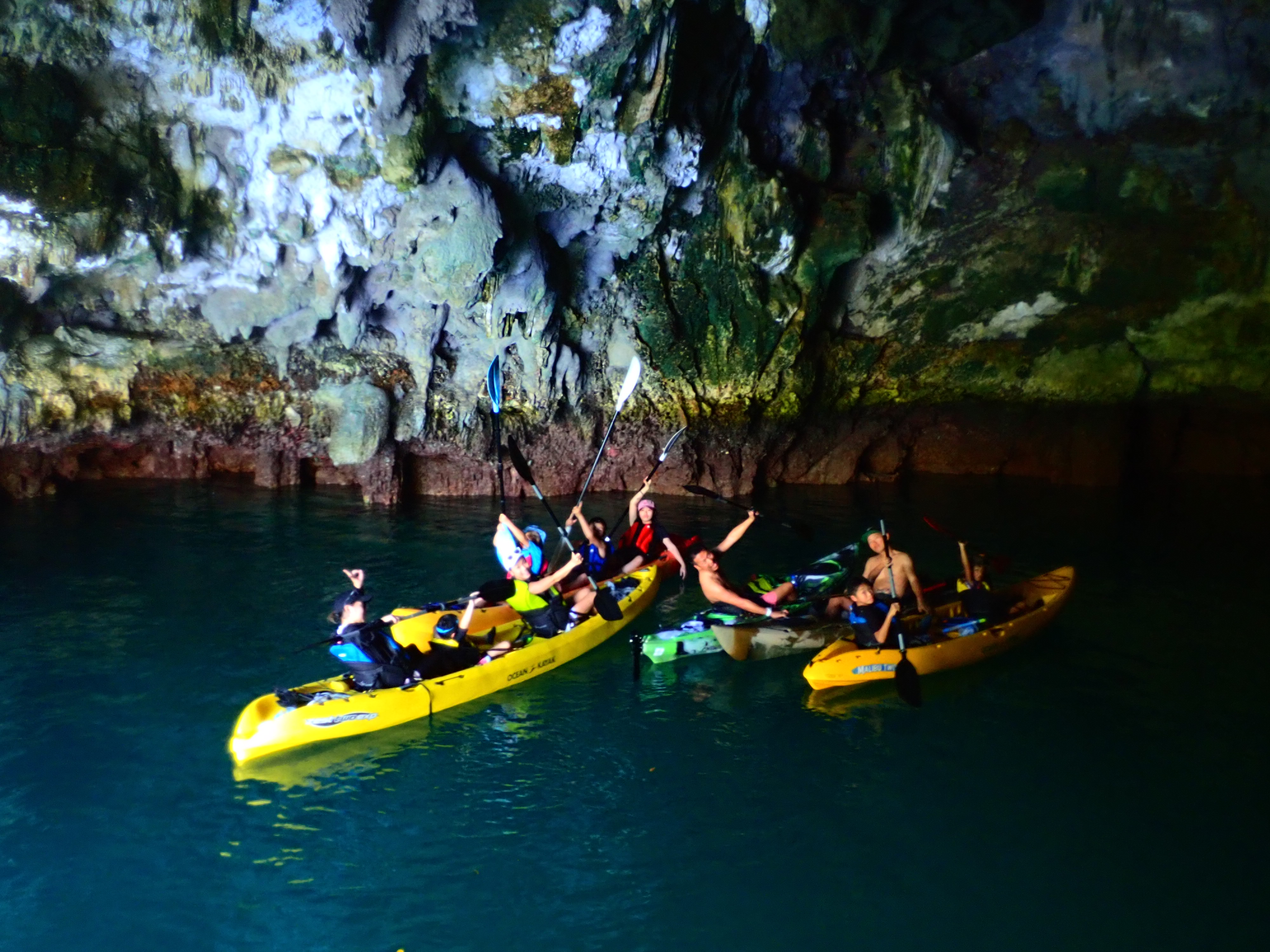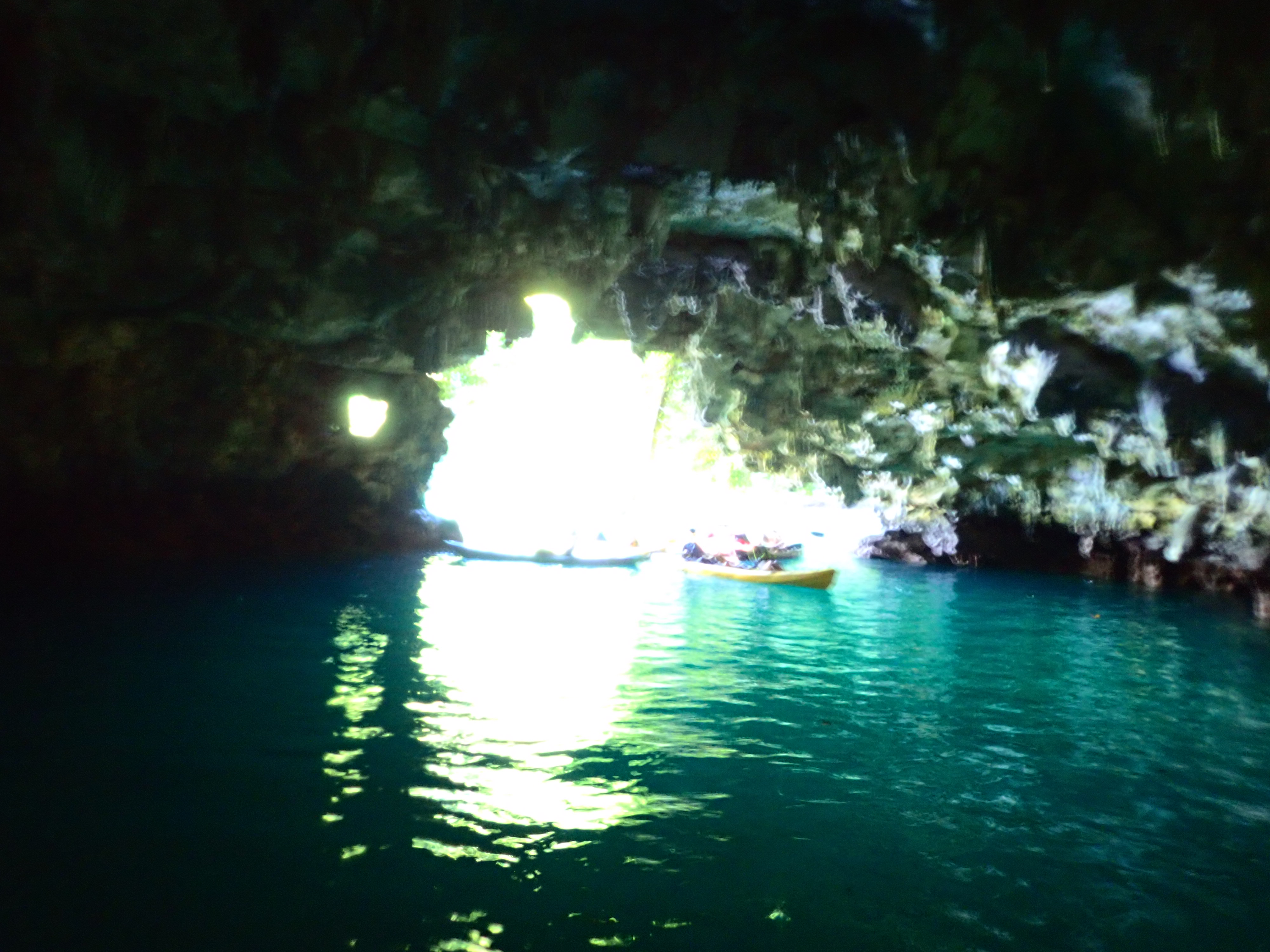 ガシガシ漕いで、入り江で休憩。暑かったので浅瀬で海に入りクールダウン。みんな元気が有り余っていたので、急遽、半日ではあまり行かないエメラルドケイヴ(洞窟)へ向かってしまおうと決定!