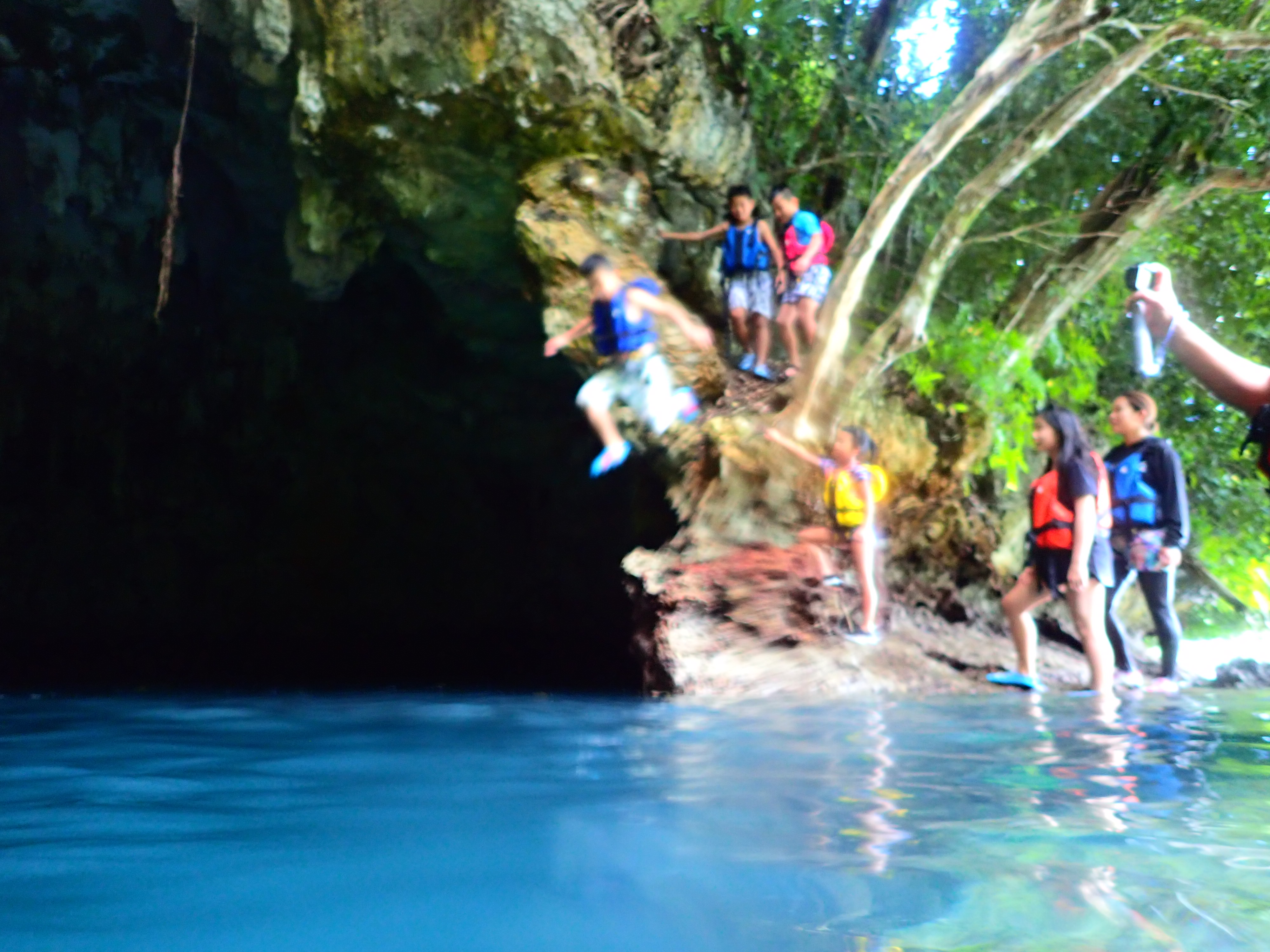エメラルドケイヴに到着。洞窟入り口でジャンプ大会。お子さん方は1人3回以上は飛んでましたね!