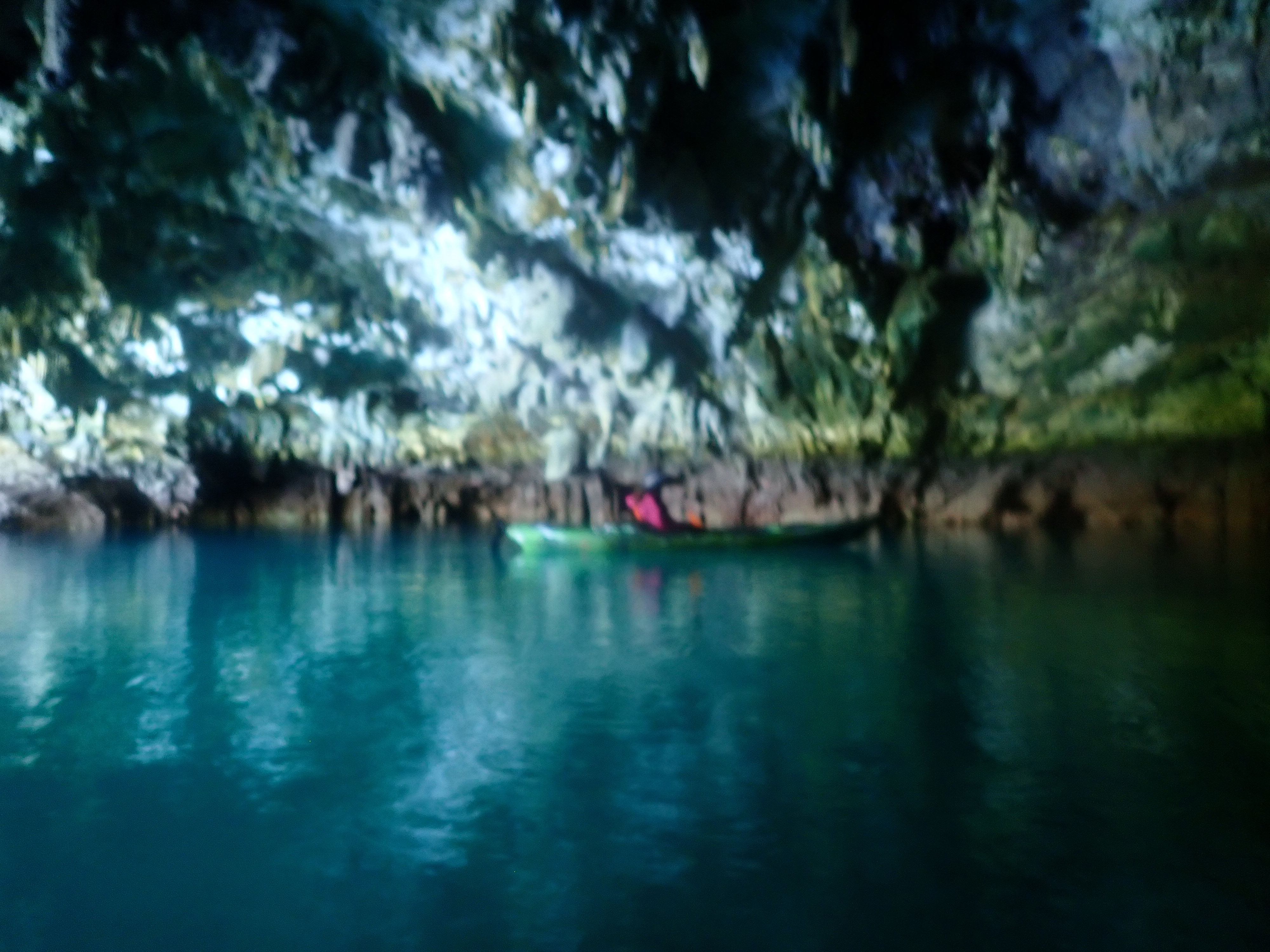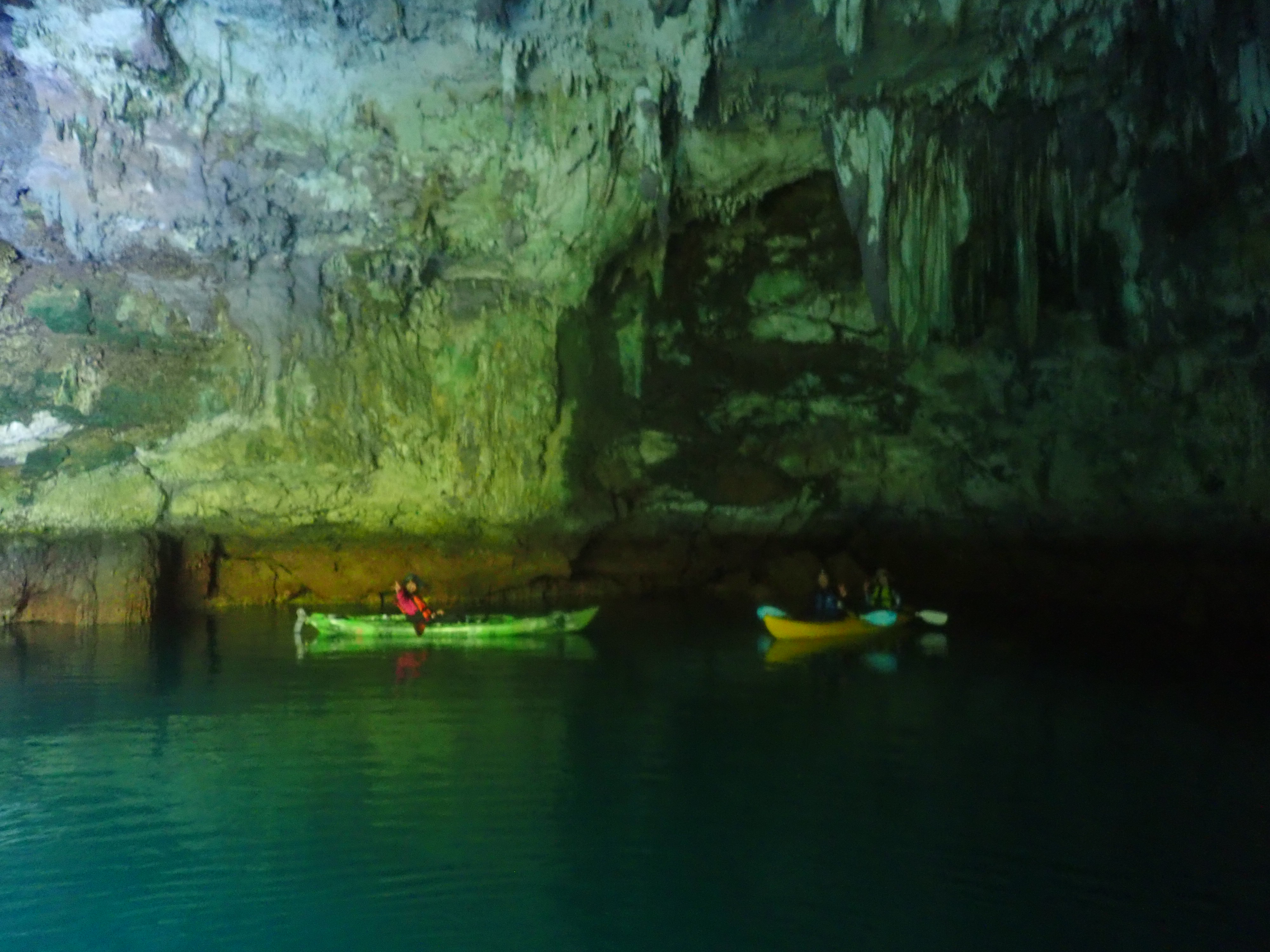 淡い緑色が美しい、エメラルドケイヴ。洞窟の奥ではライトで照らすとコウモリも見れます。