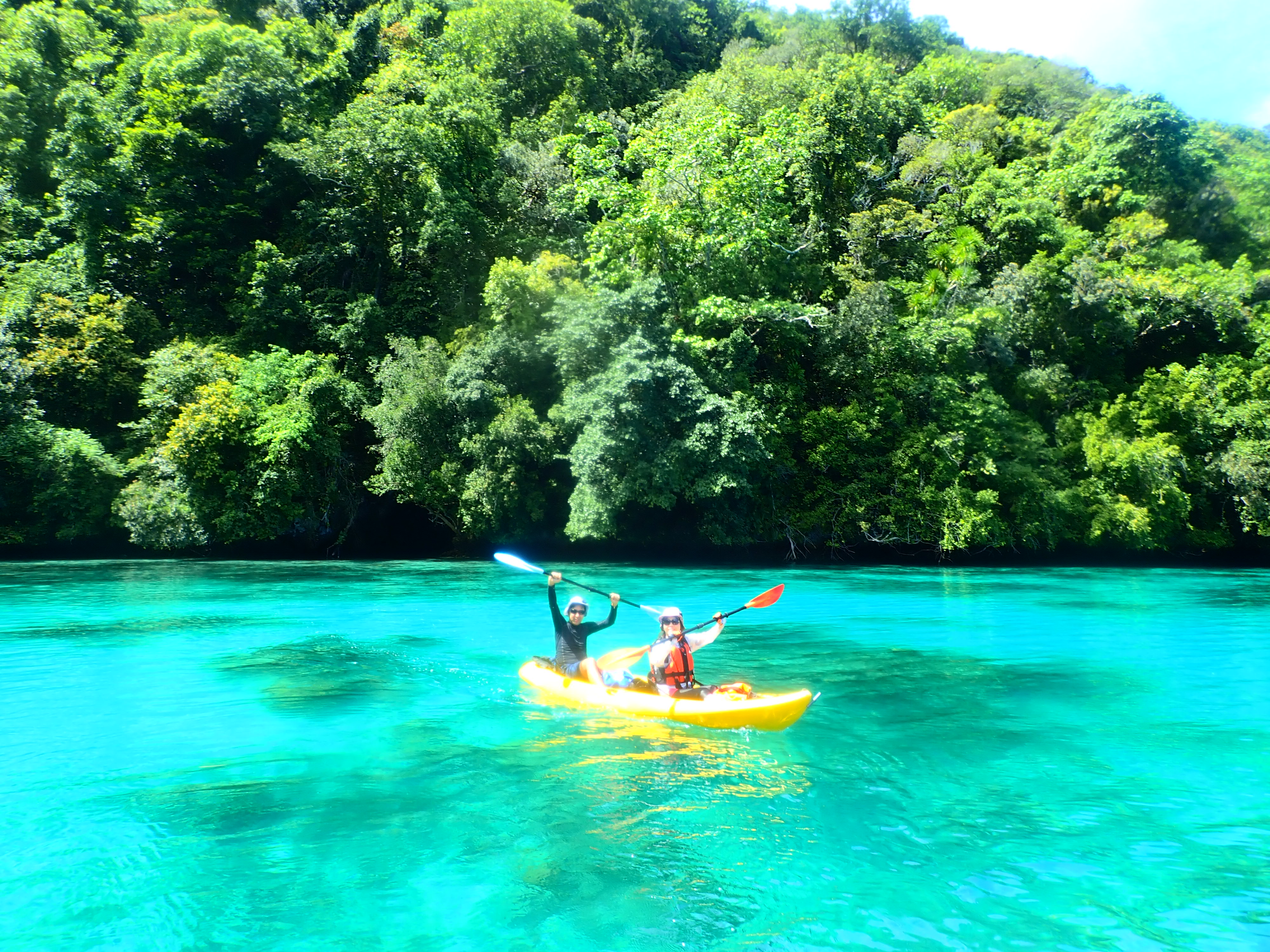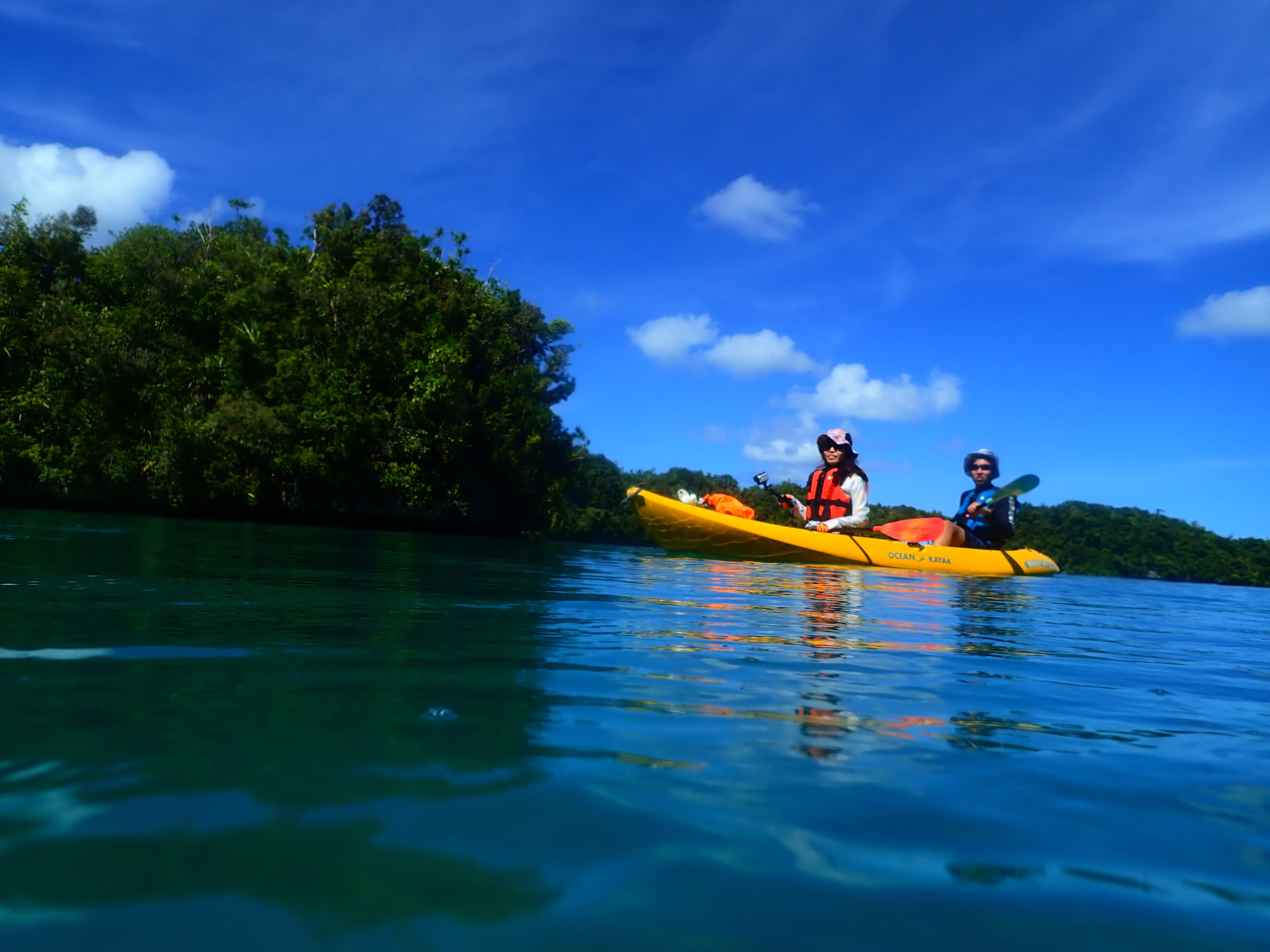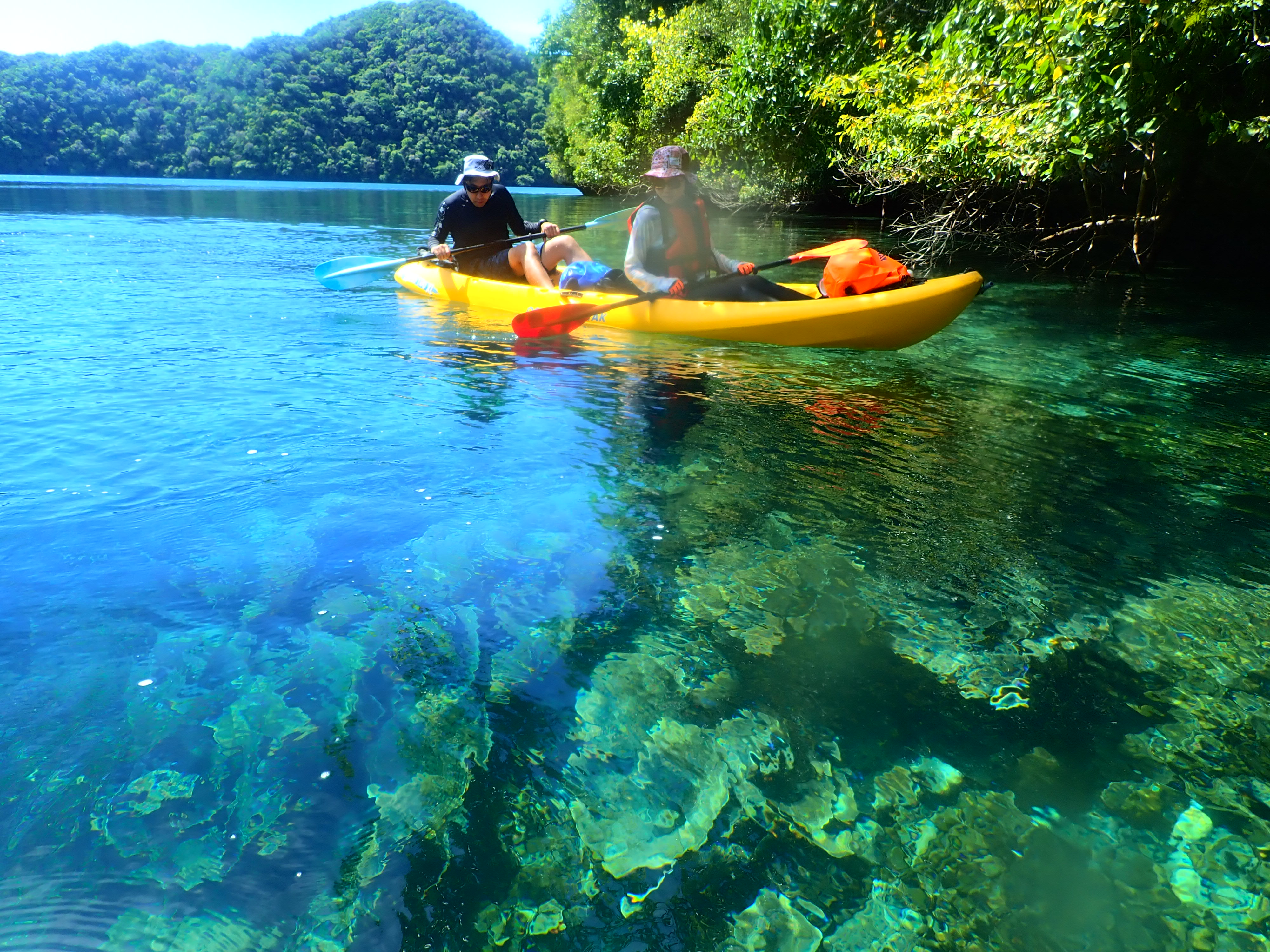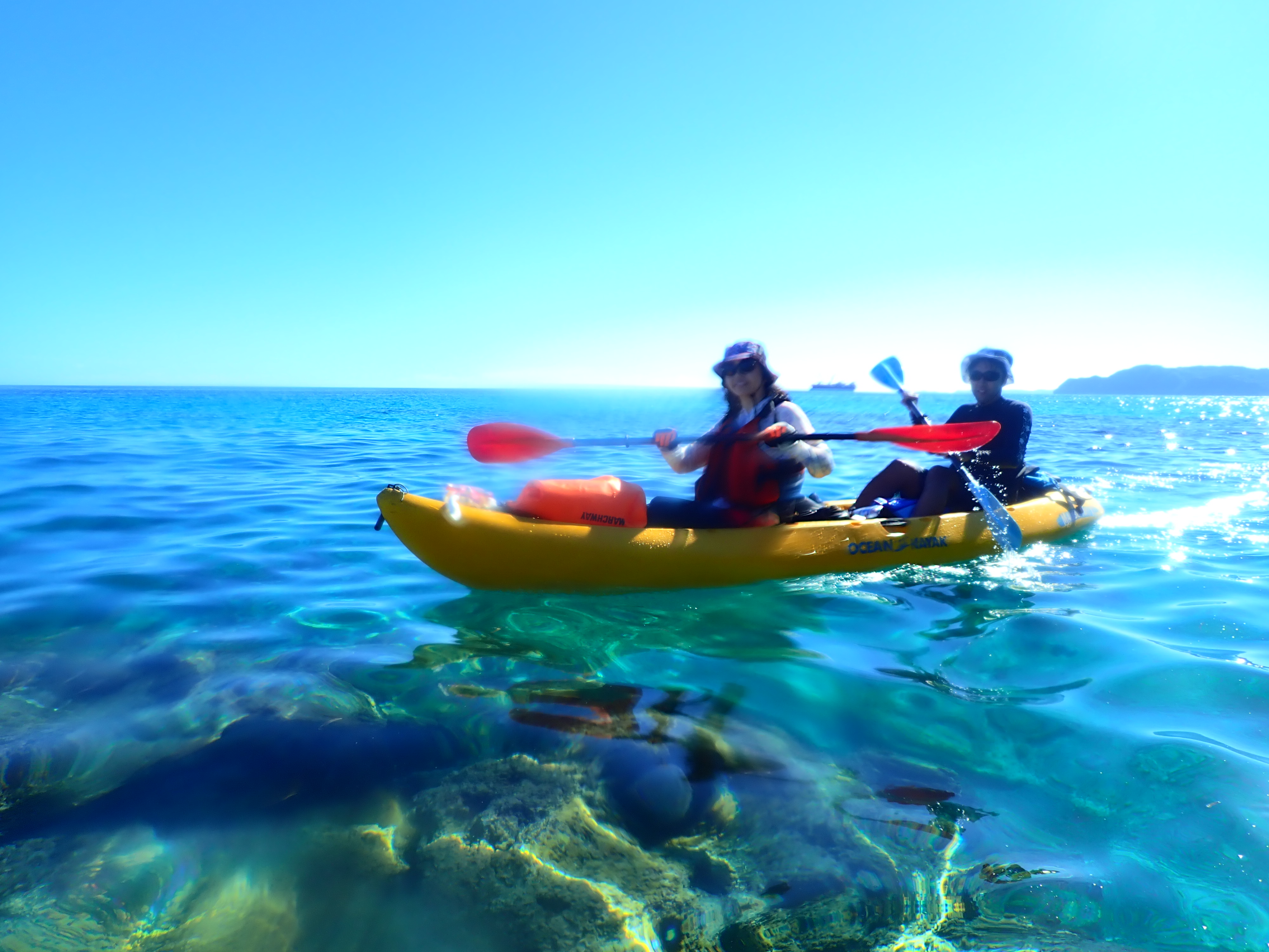 午前中が満潮につき、透明度抜群!クリスタルブルーの海をカヤックで漕ぐのは心地よい時間。