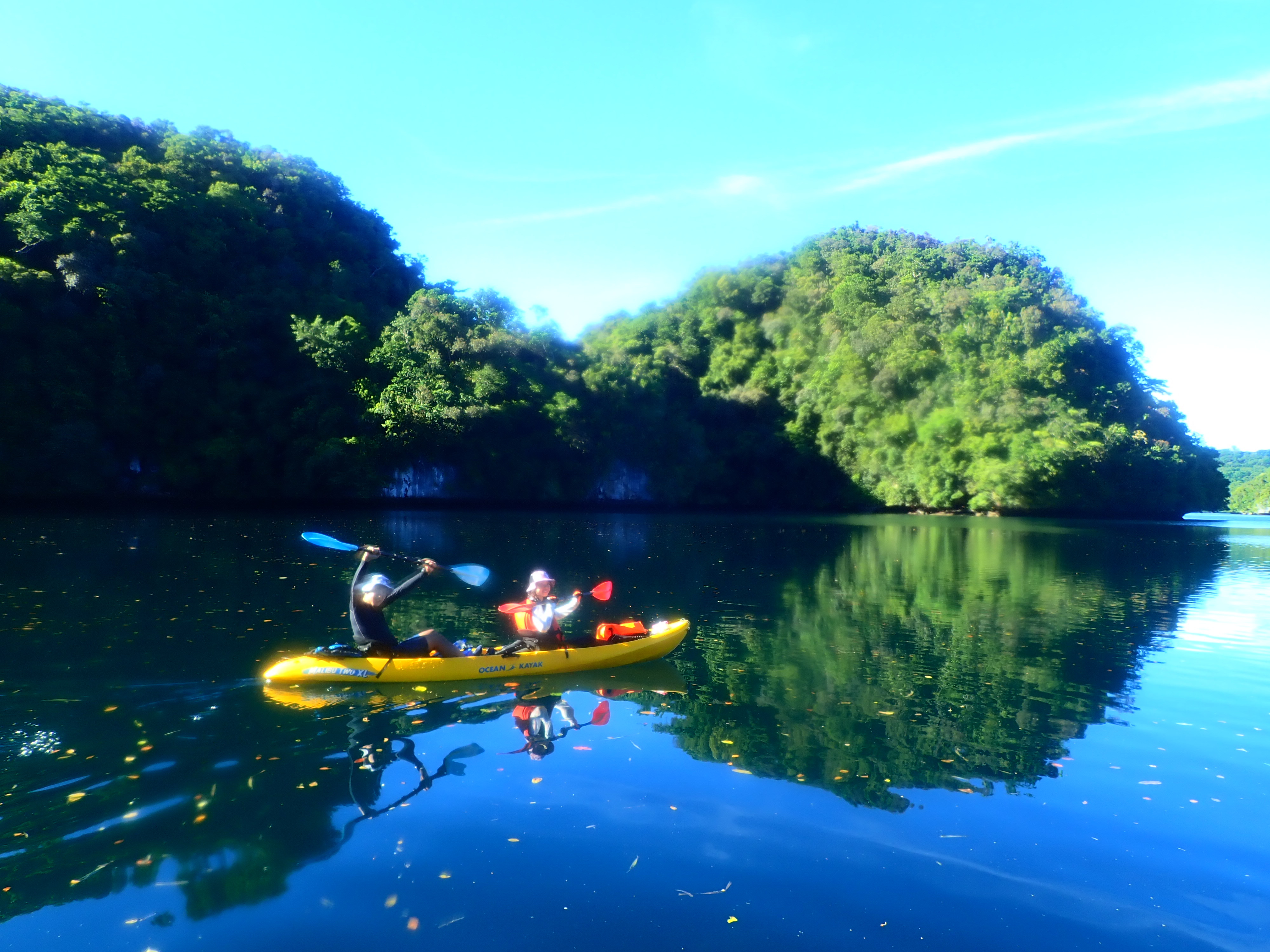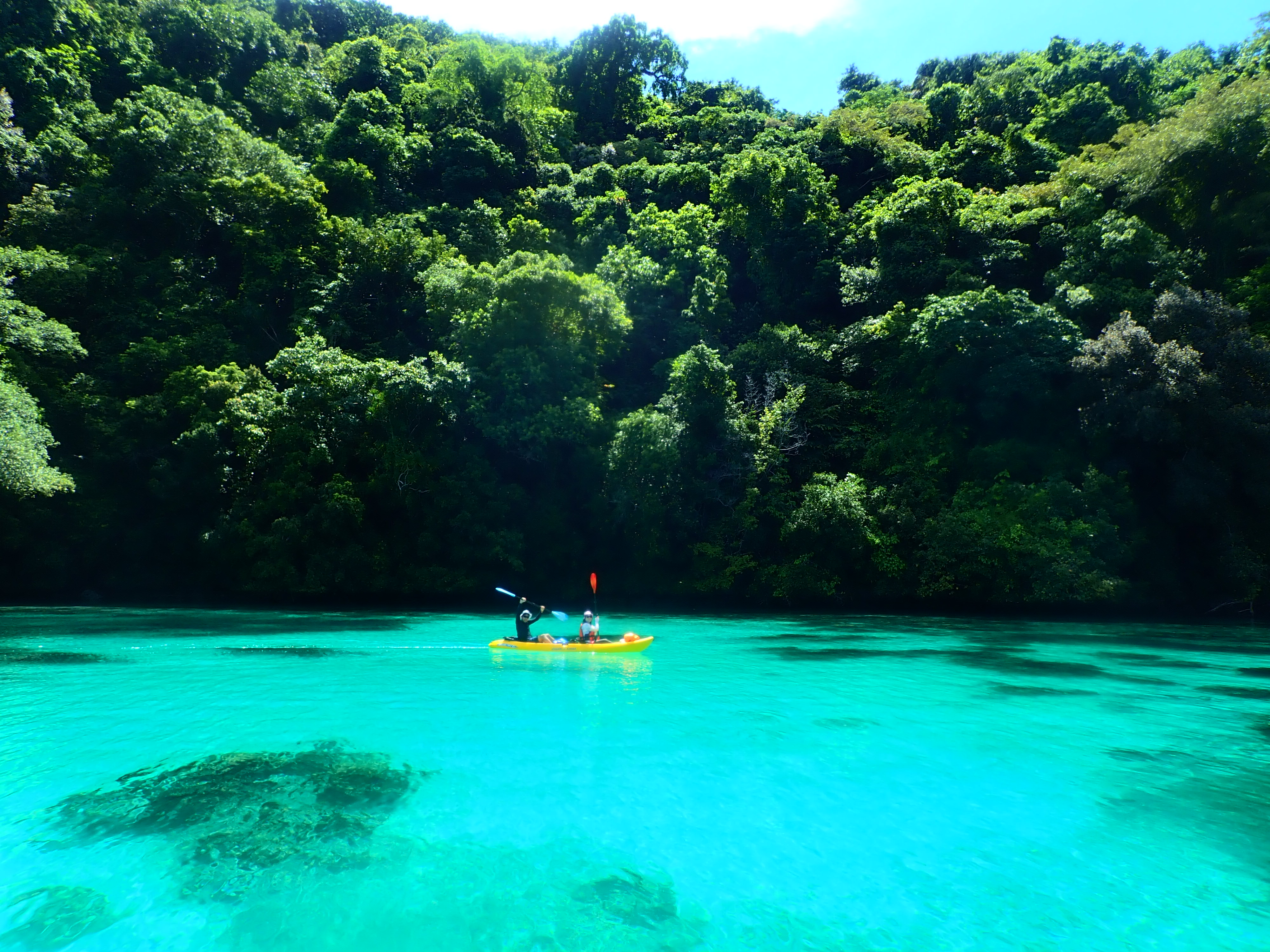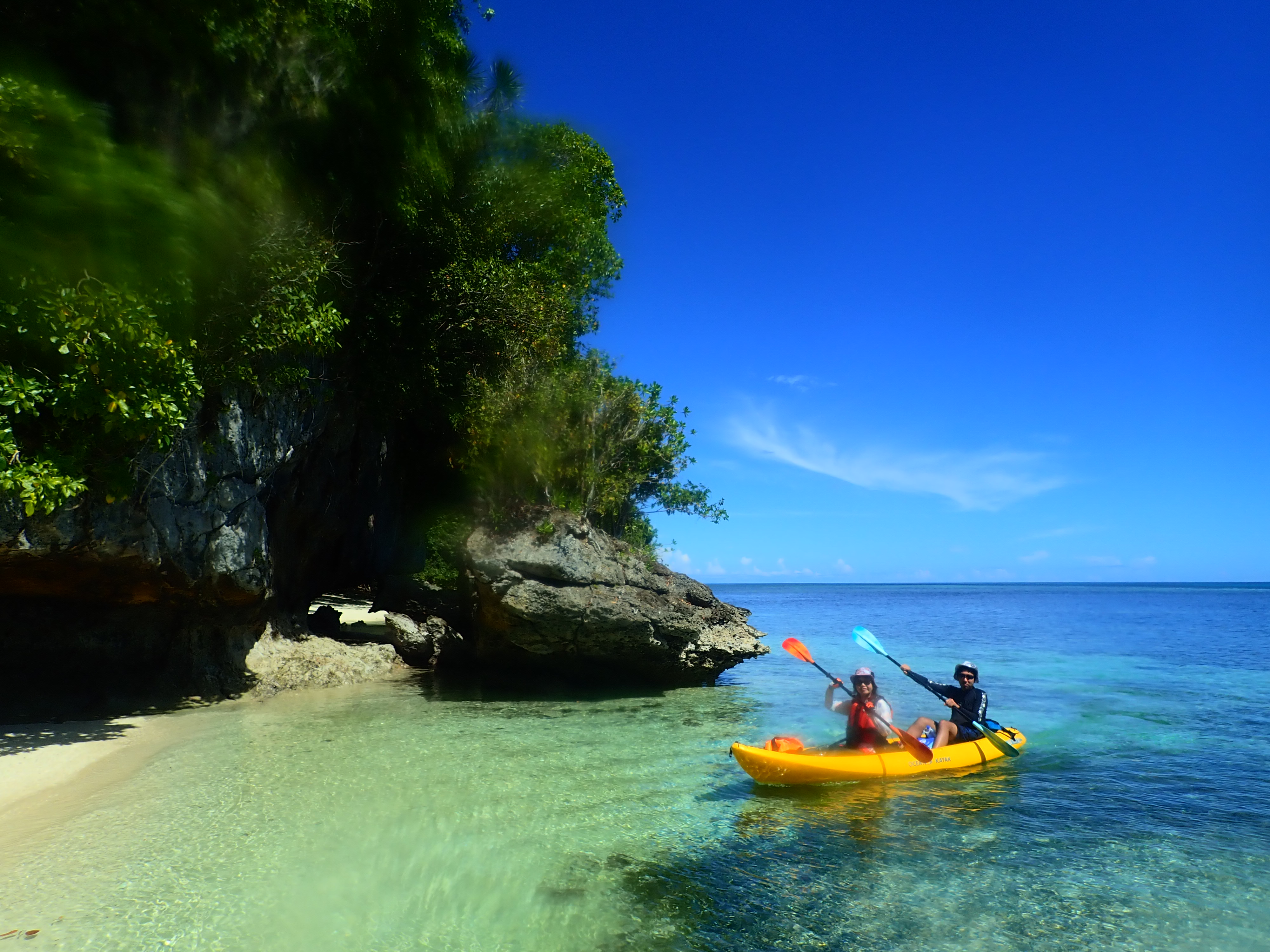 午前中が満潮につき、透明度抜群!クリスタルブルーの海をカヤックで漕ぐのは心地よい時間。