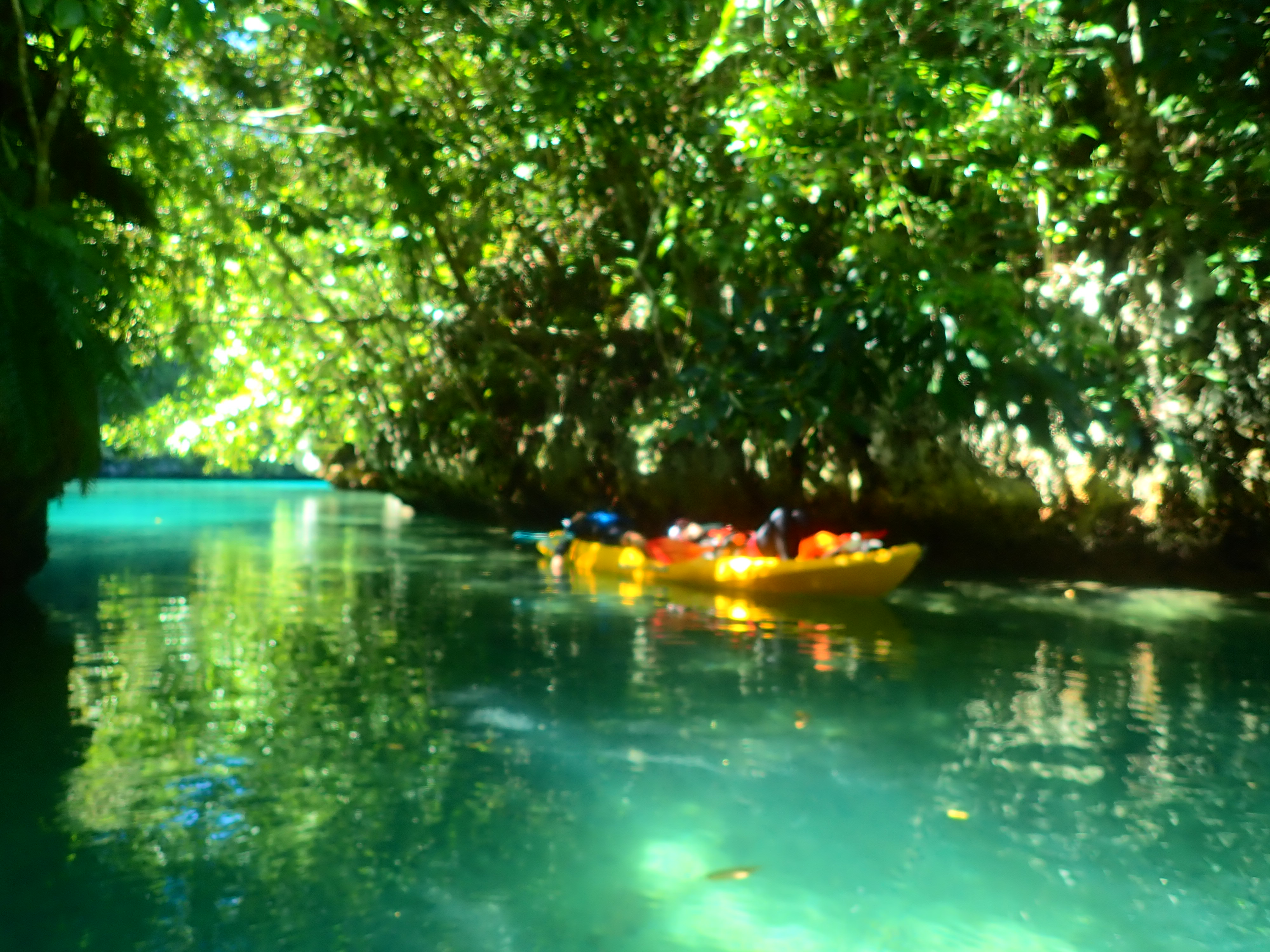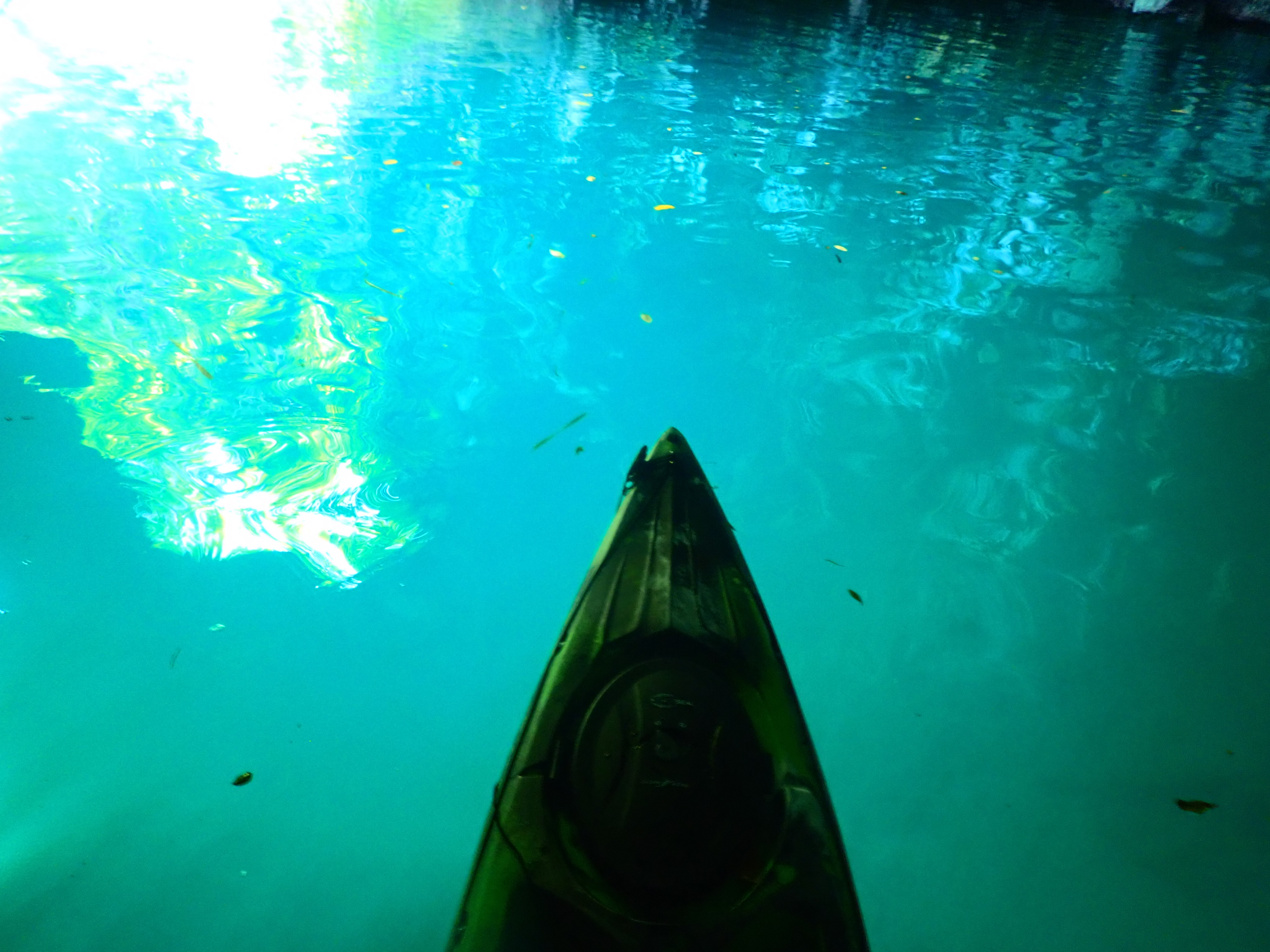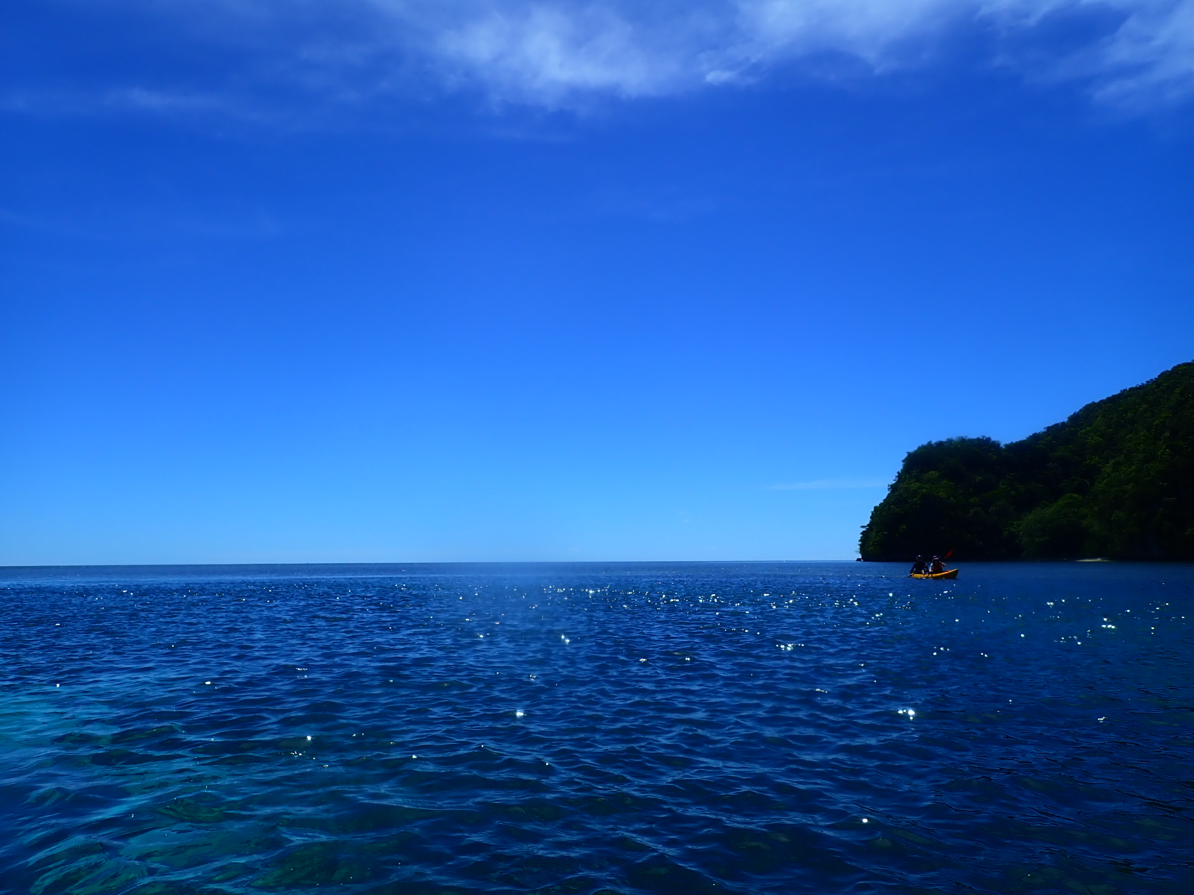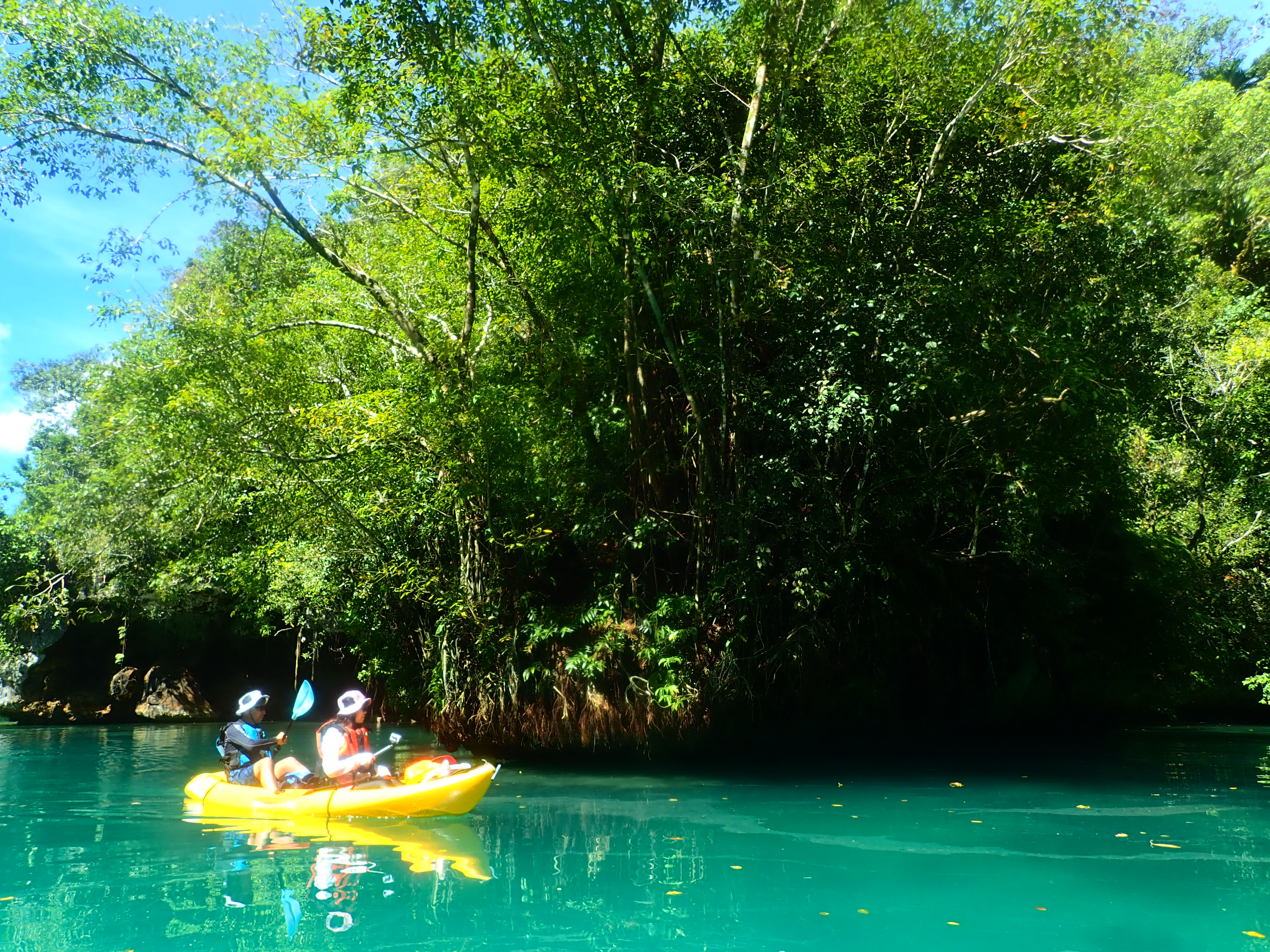 午前中が満潮につき、透明度抜群!クリスタルブルーの海をカヤックで漕ぐのは心地よい時間。