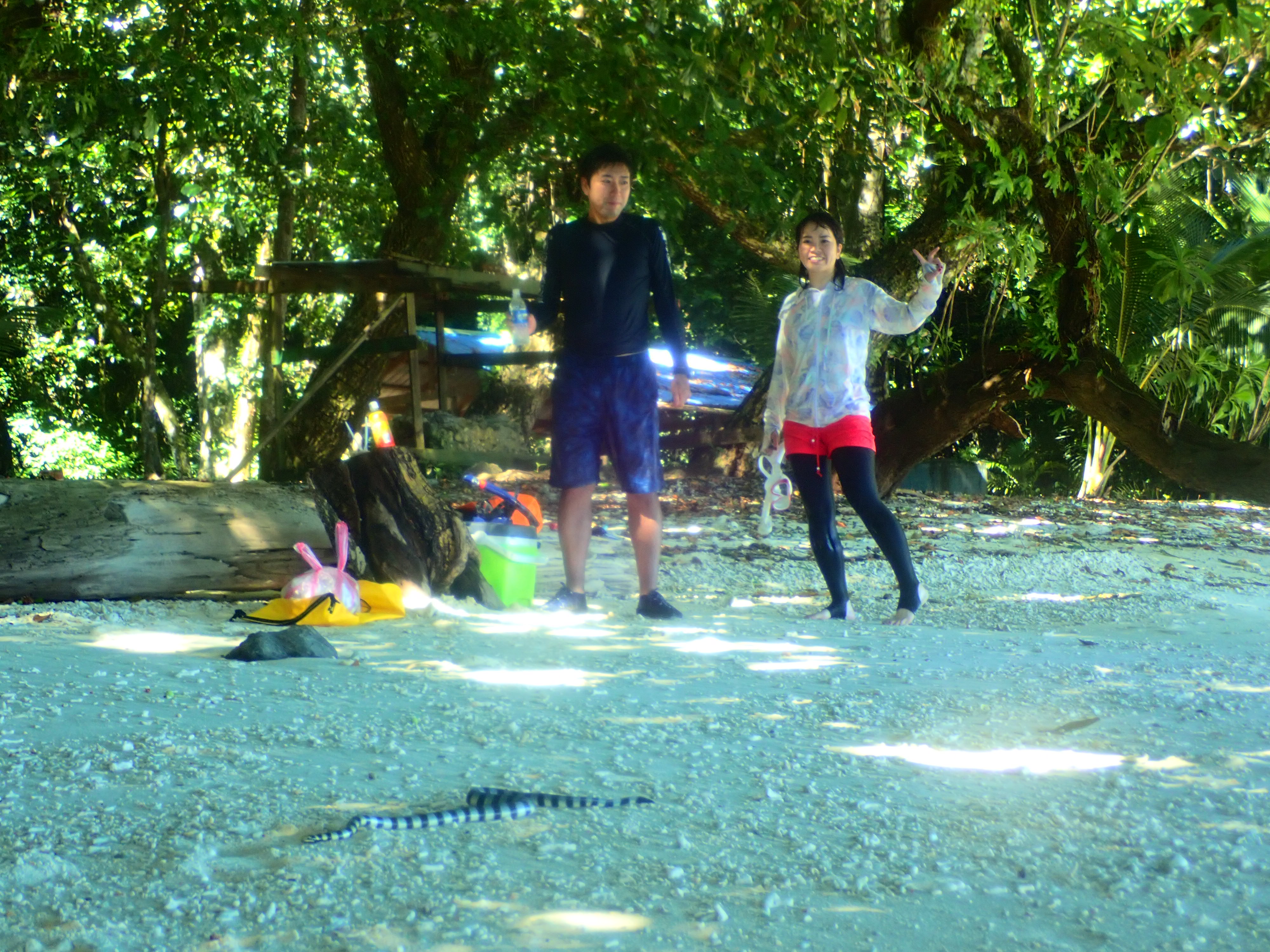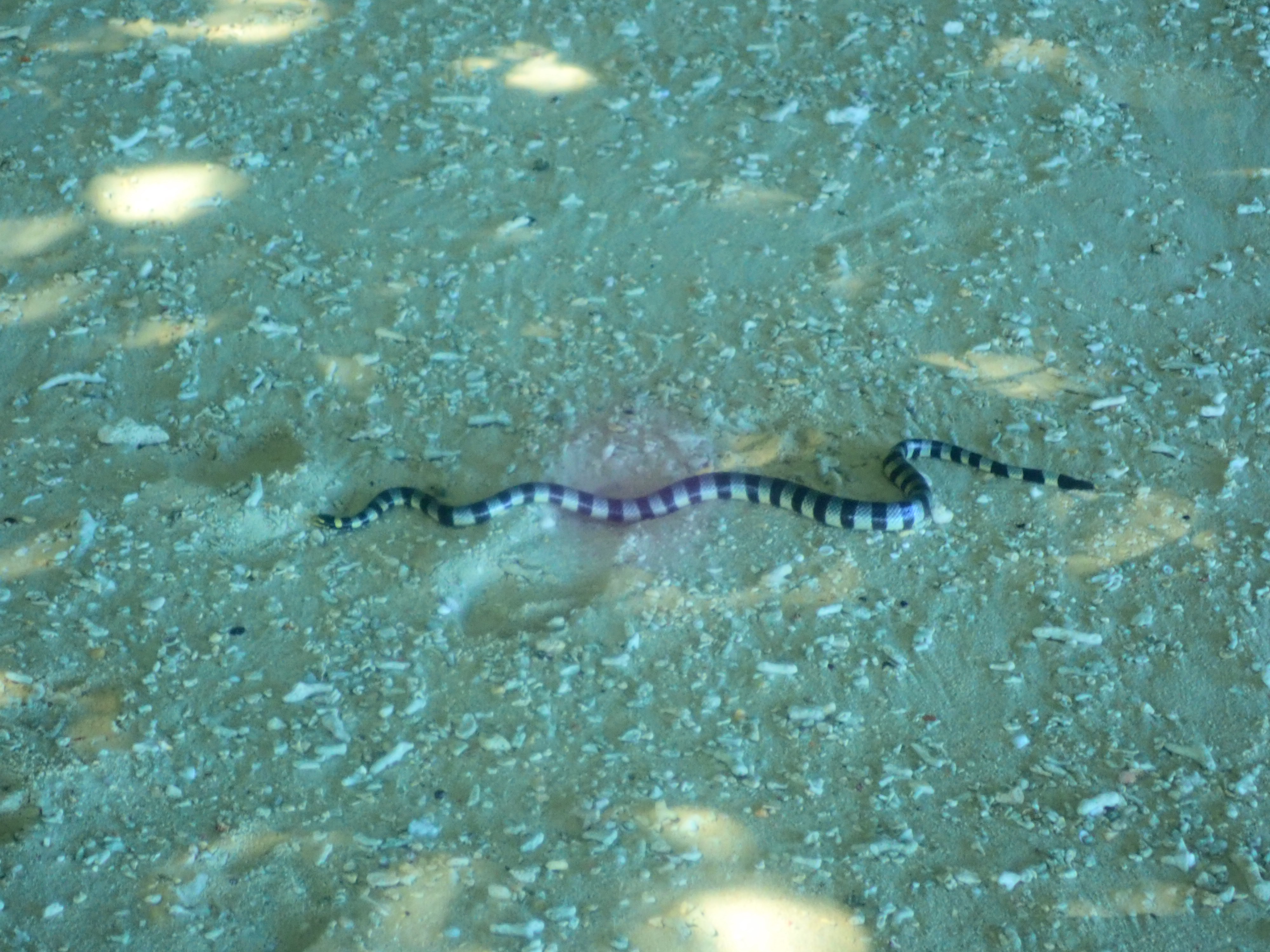 ビーチに珍入者現る!こちらシマウミヘビ。毒があるので見かけたらそっと観察しましょう。パラオではペリリュ―島の部族の神様でもあります。