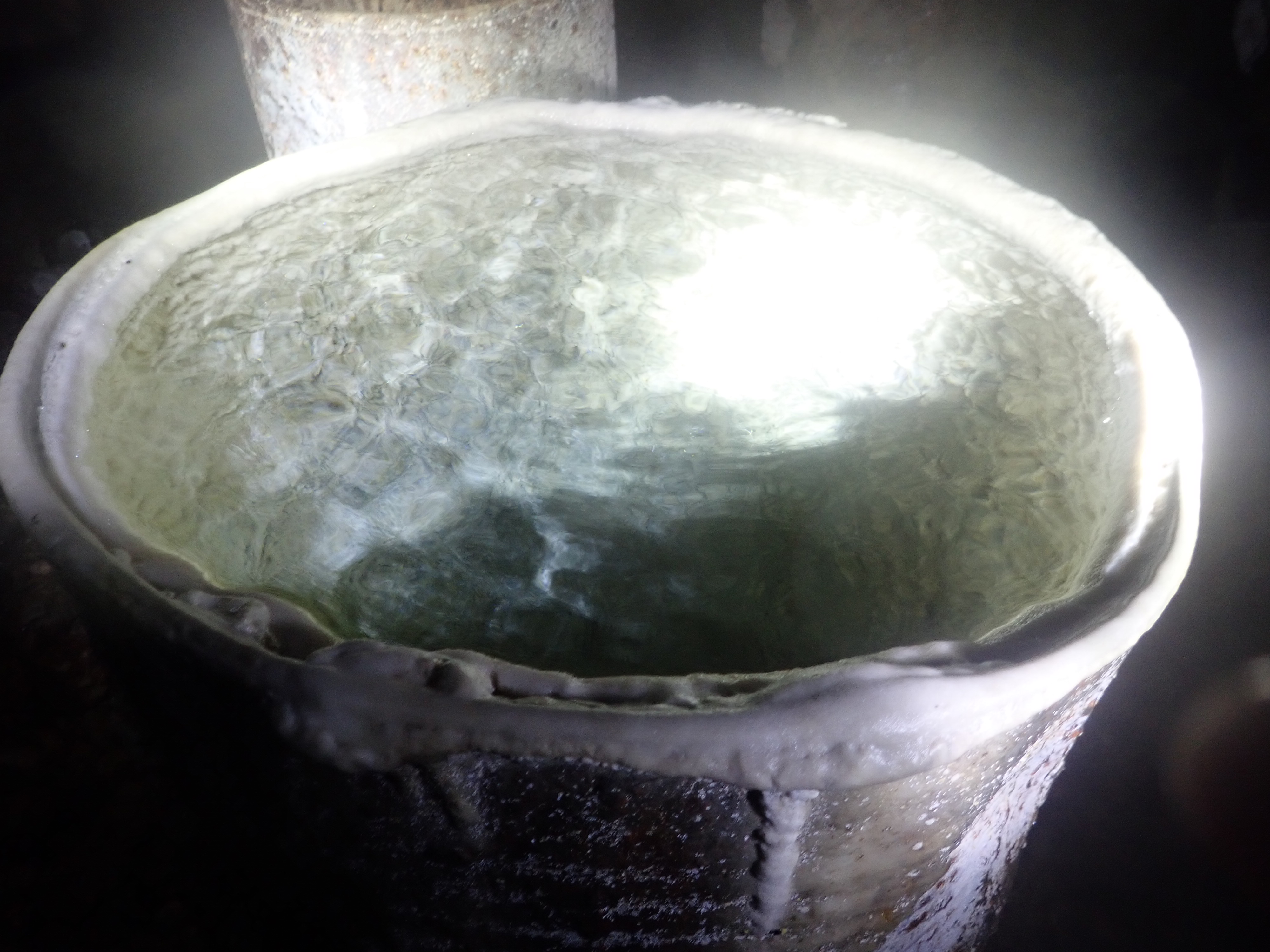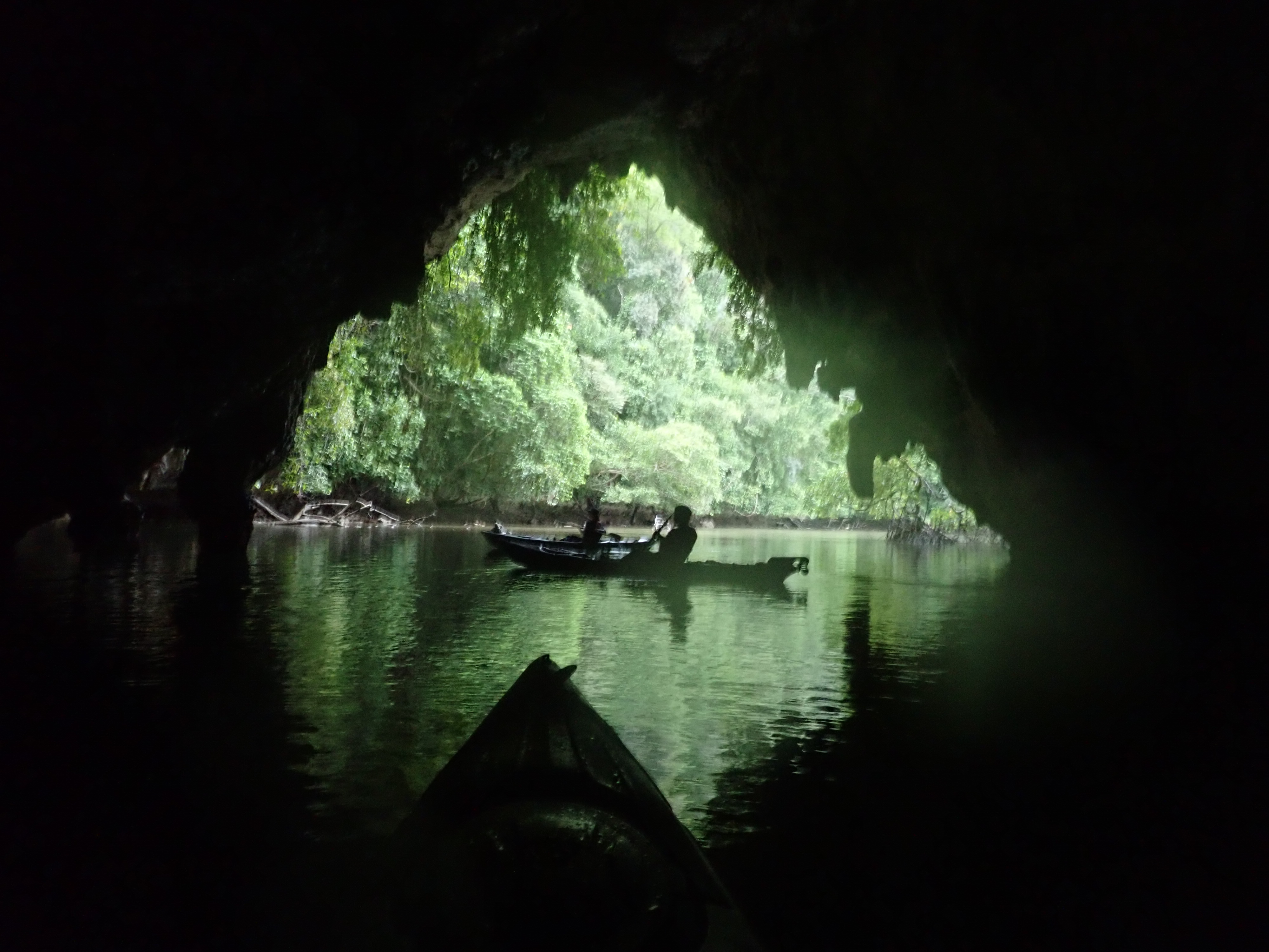 スタート地点から少し漕ぎ、先ずは日本統治時代に使っていた洞窟を訪れます。ここは当時、洞窟内で塩を作っていた為、潮工場跡と呼ばれる洞窟です。中は外の明かりも差し込まず、真っ暗!ライトで照らすと無数のコウモリも見る事ができます。