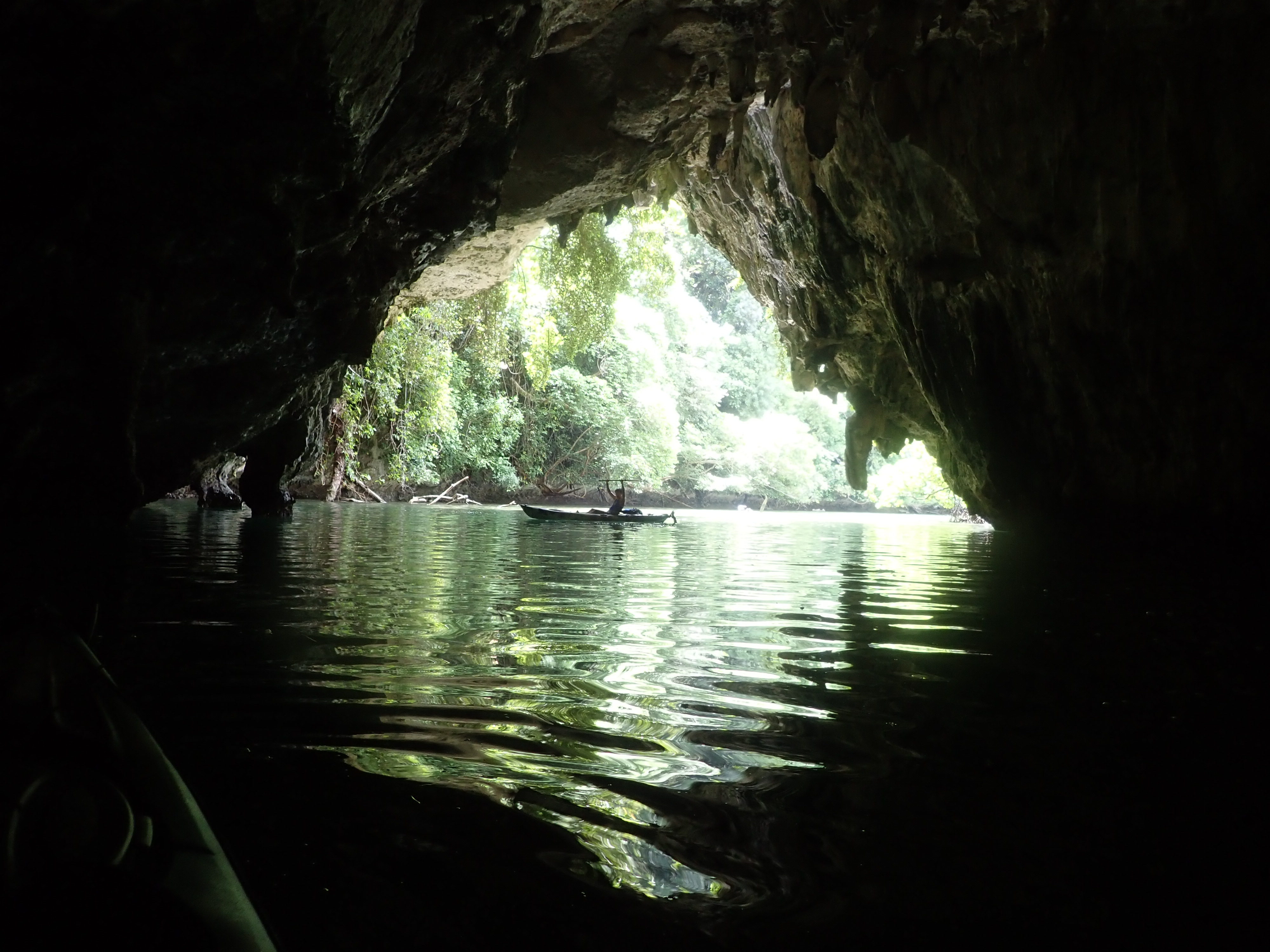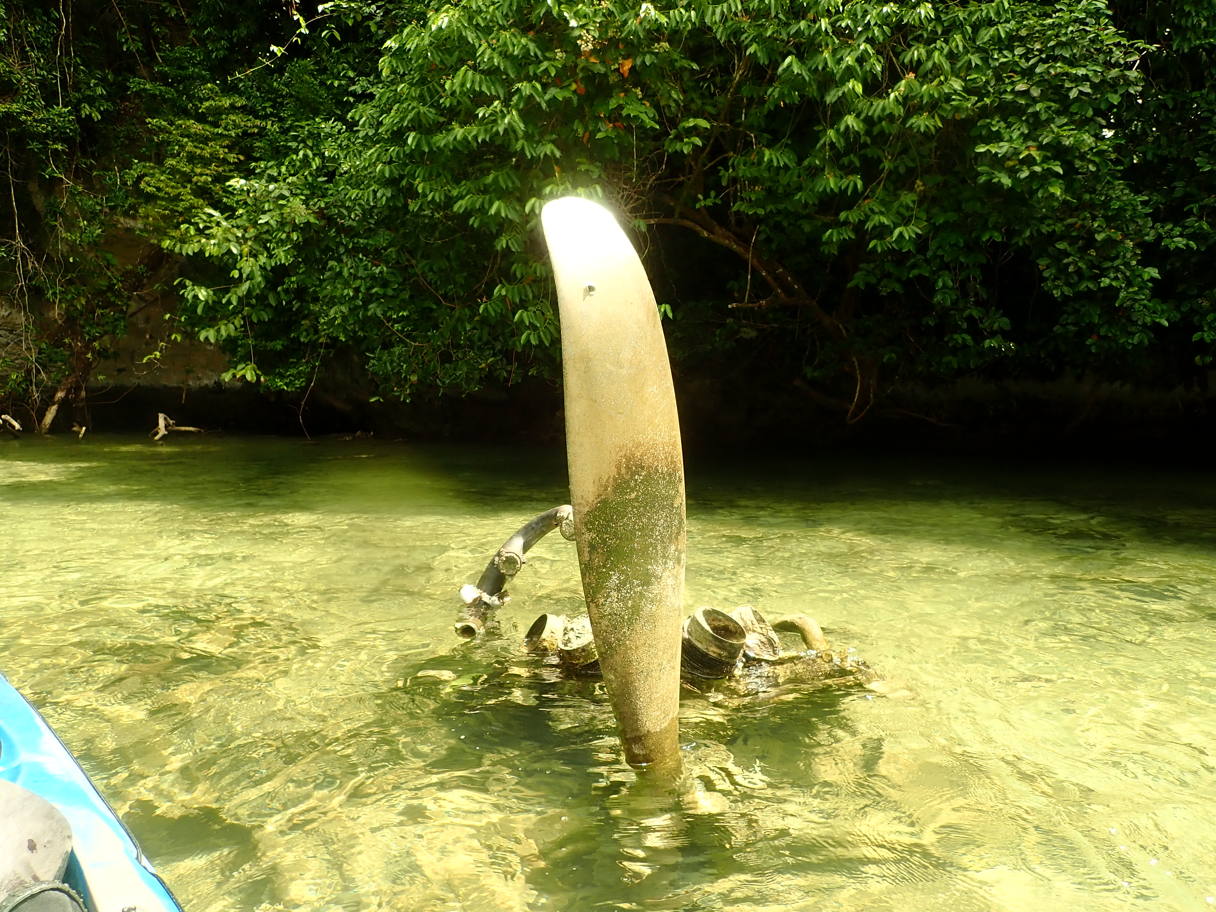 当時格納庫として使っていた洞窟。洞窟の外には朽ち果てた別の零式水偵のエンジンが残っています。