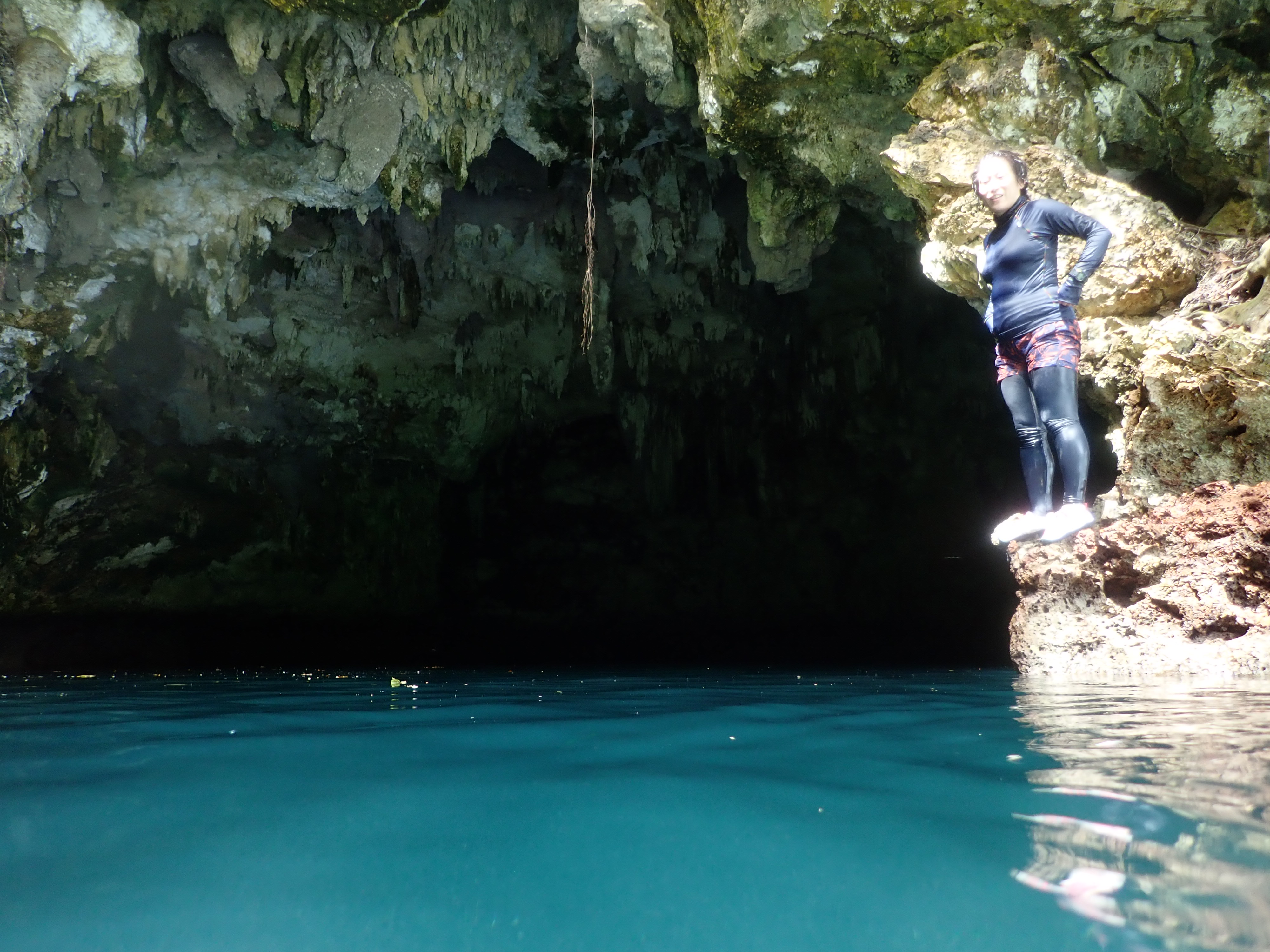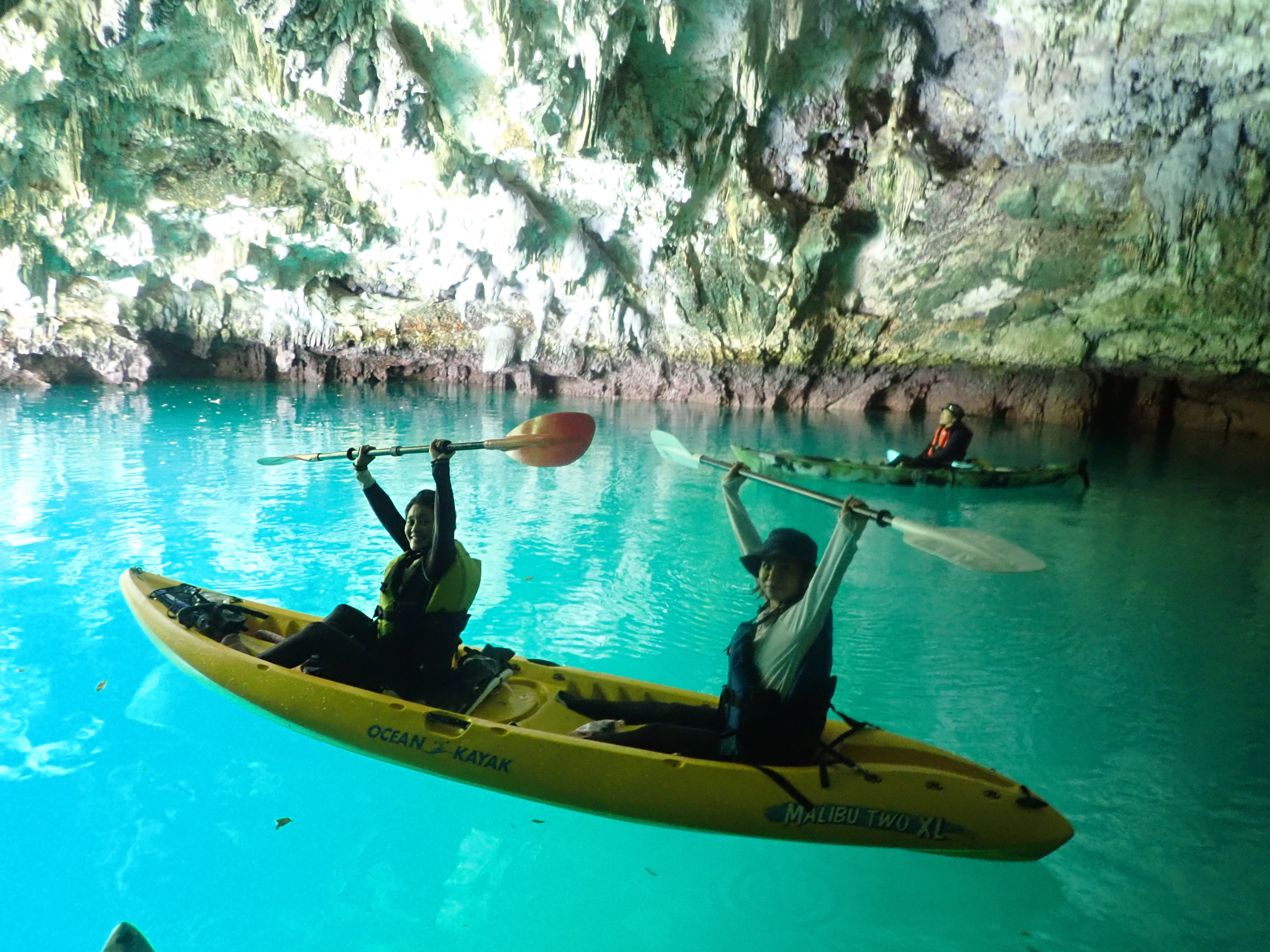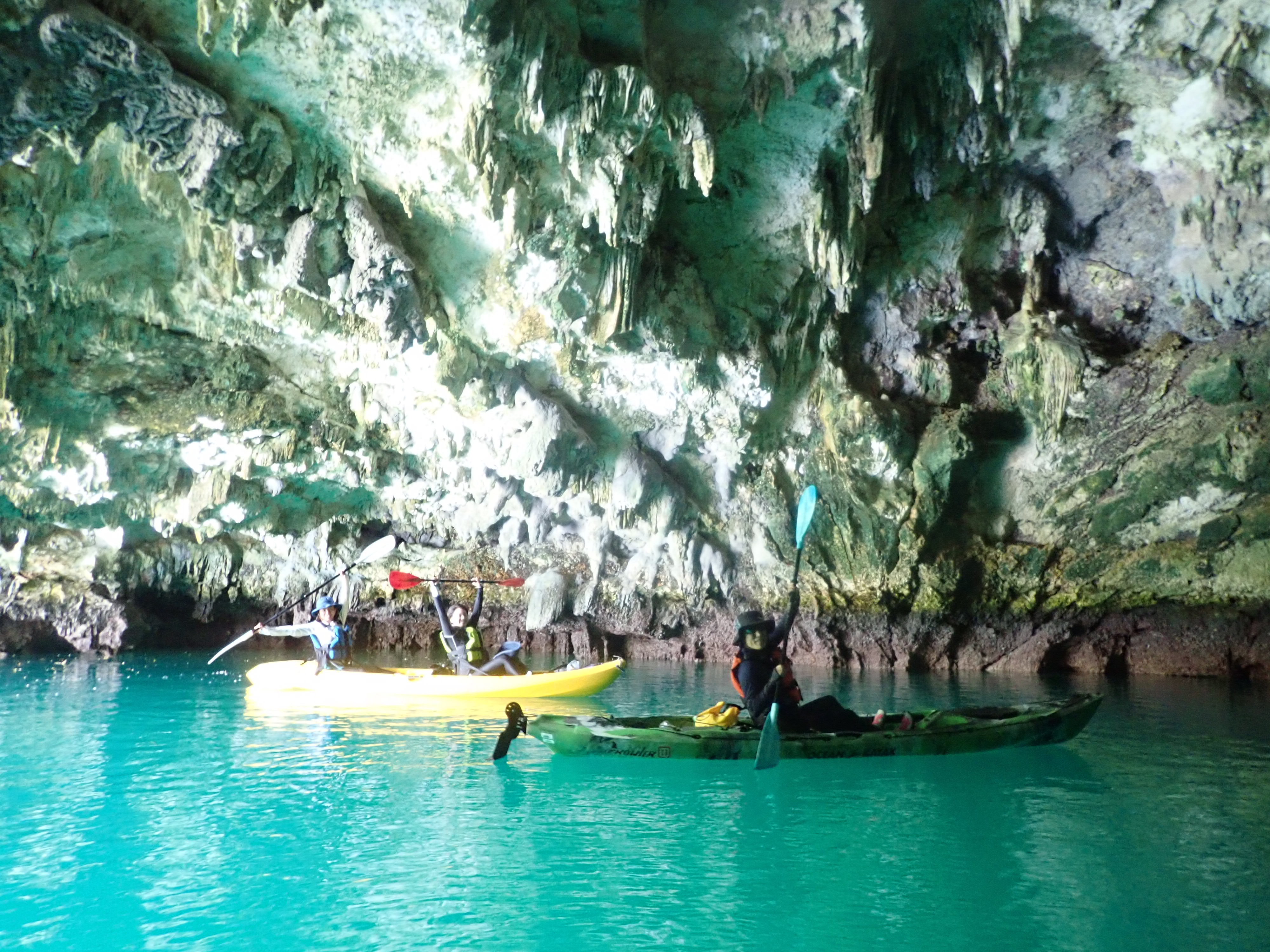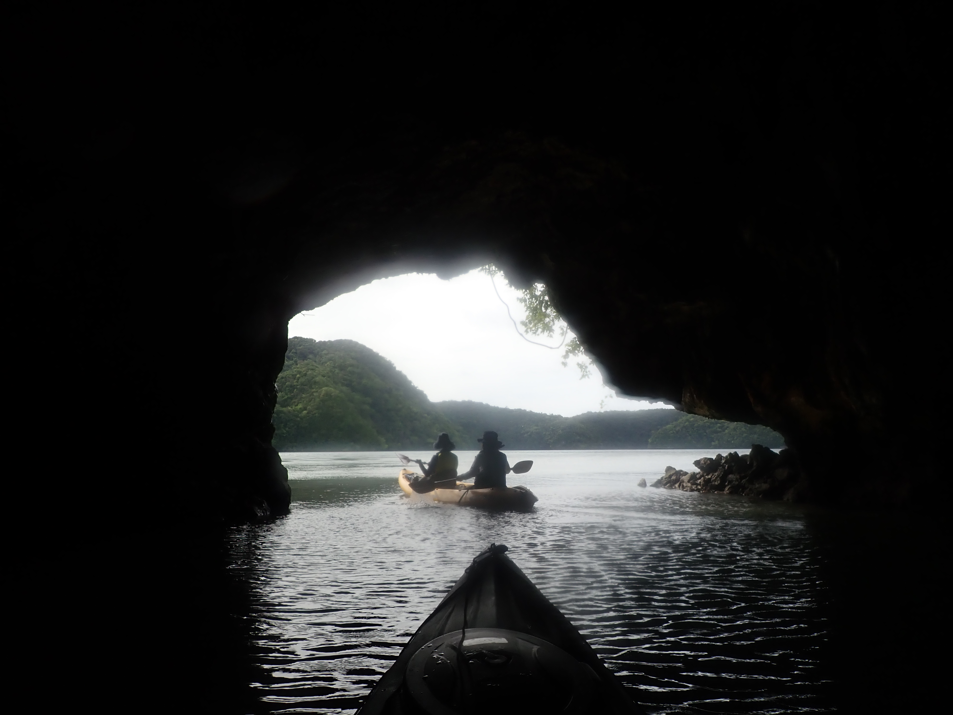 午後はいくつかの洞窟を訪れます。洞窟は潮位によってはボートでは行きにくい場所ですが、カヤックでは安定して訪れることが出来、波の影響も少ないパラオの海はカヤック初心者にもおすすめです。