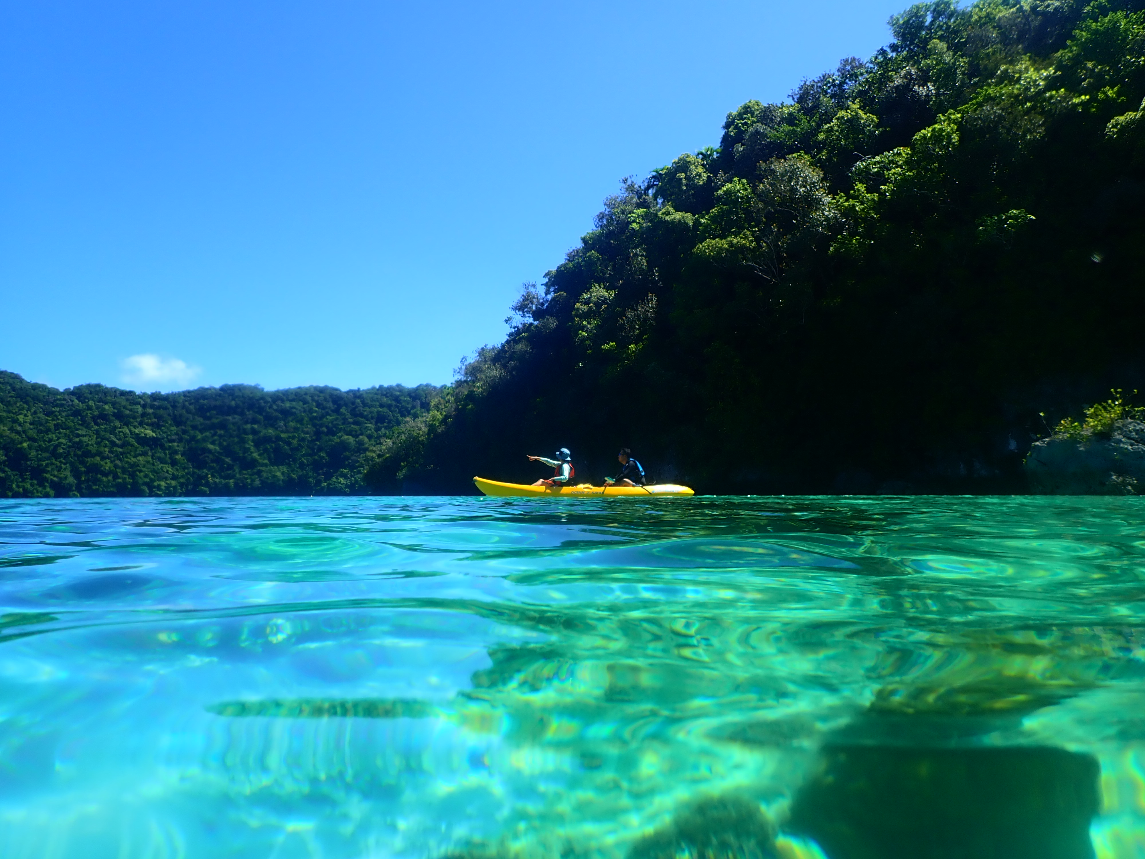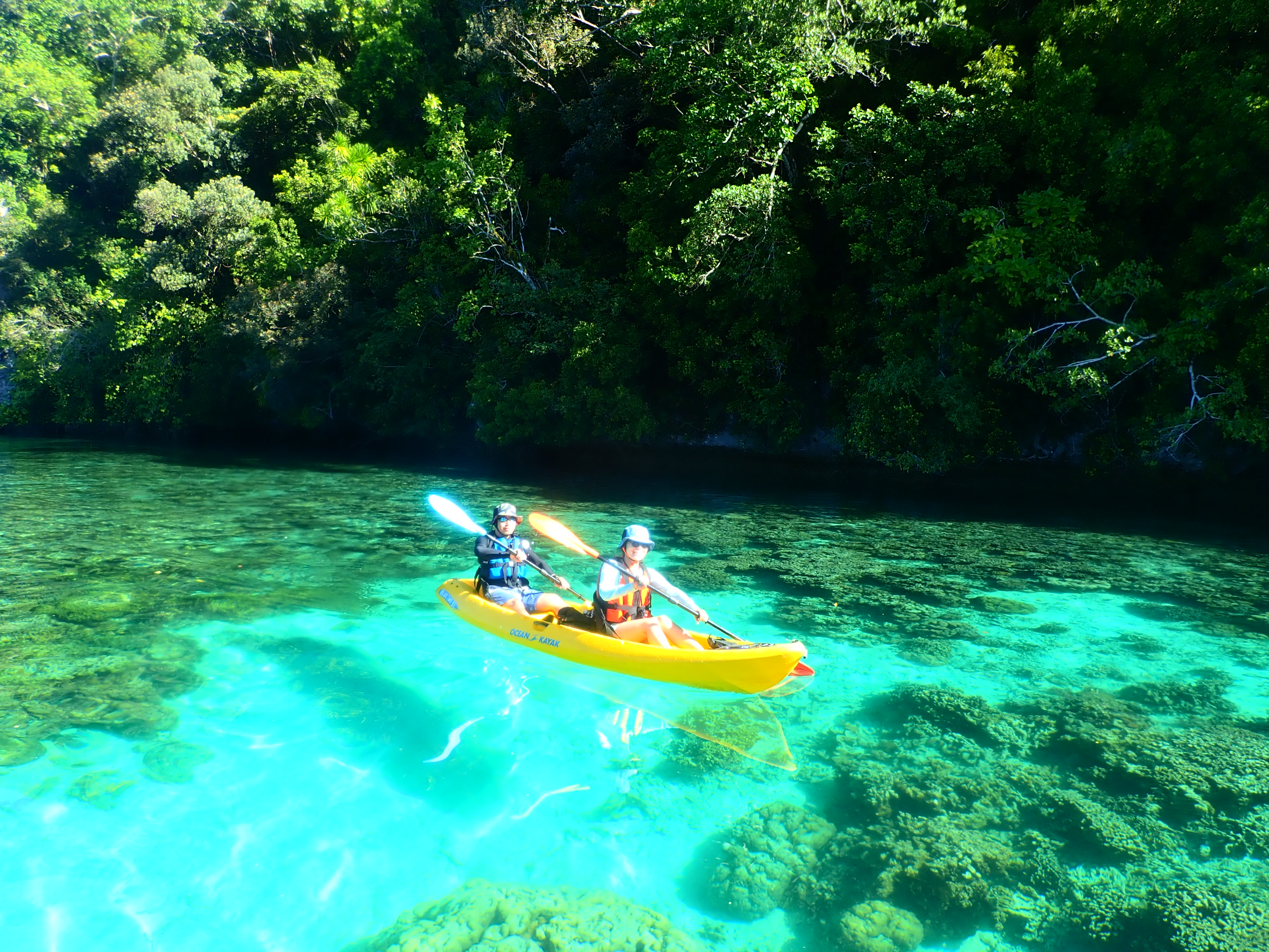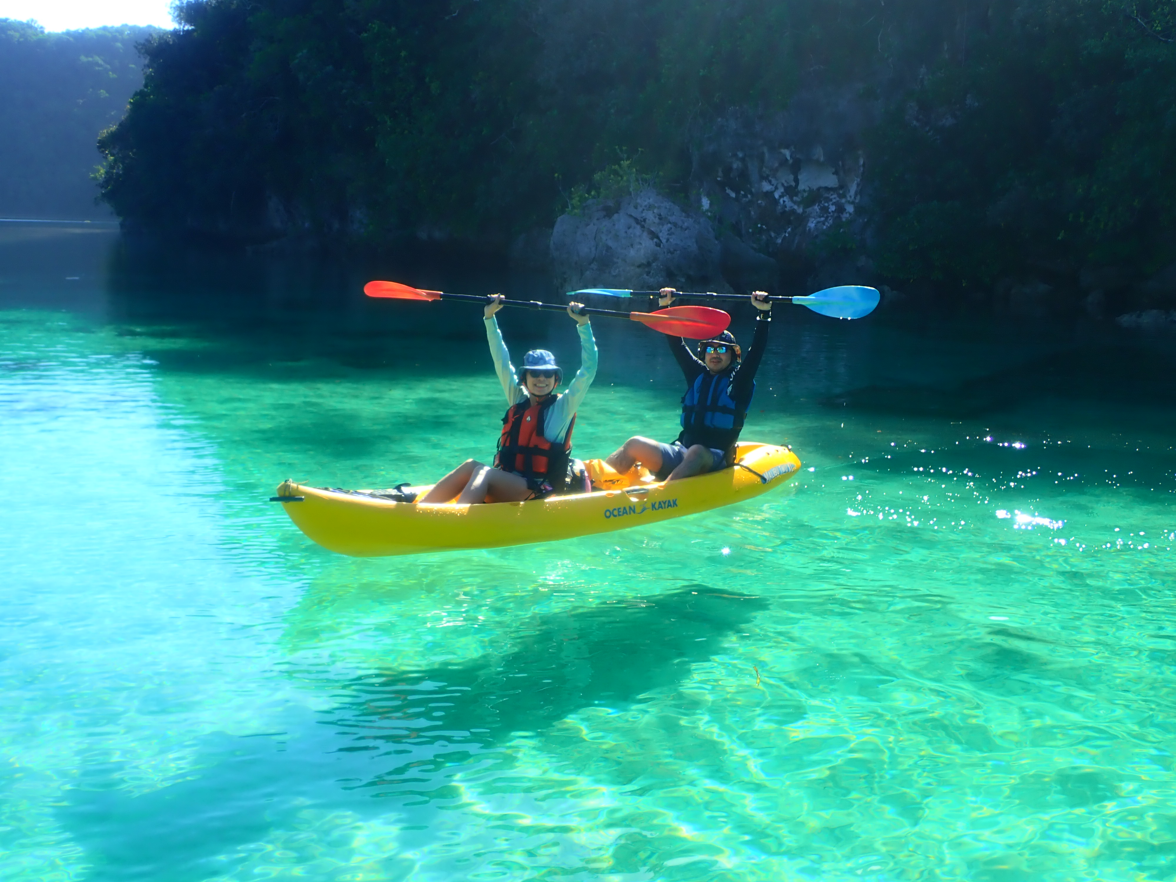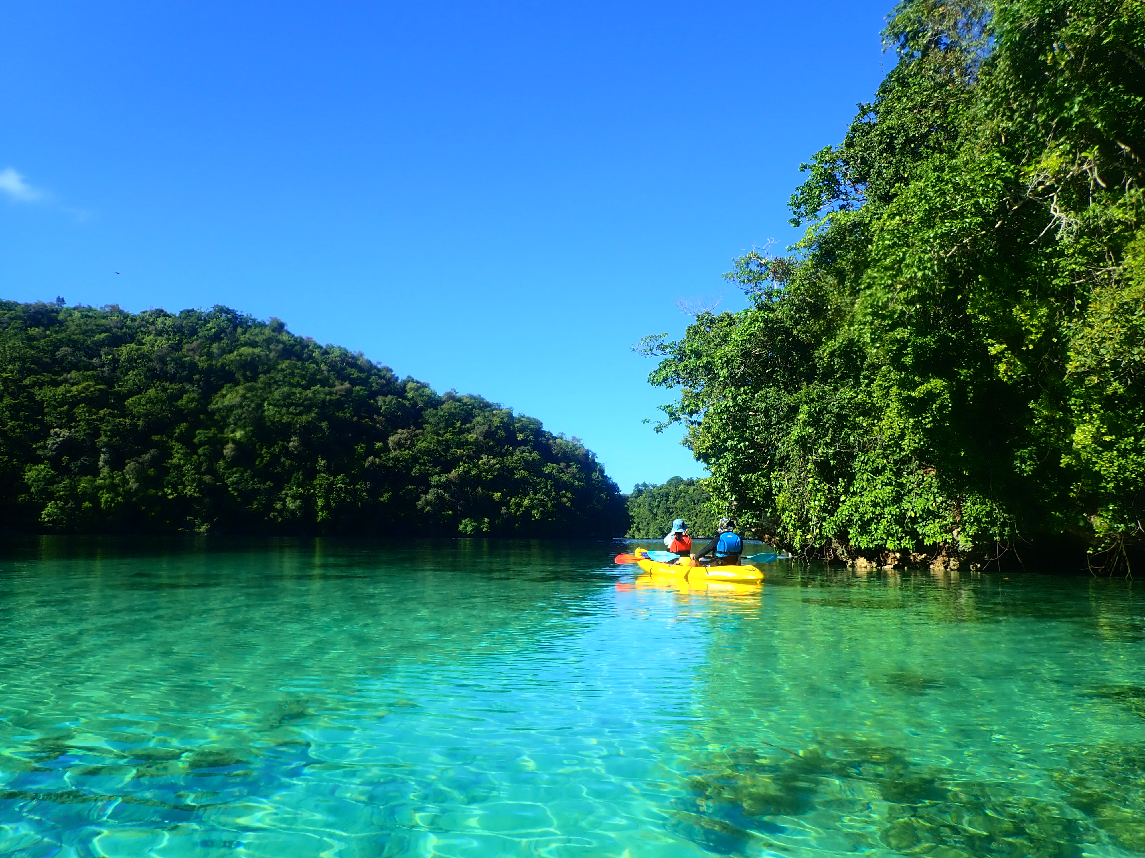 パラオ松島内の入り江をカヤッキング。透明度の良い海でのカヤックは楽しい一時。木陰での休憩もちょっと癖になります。