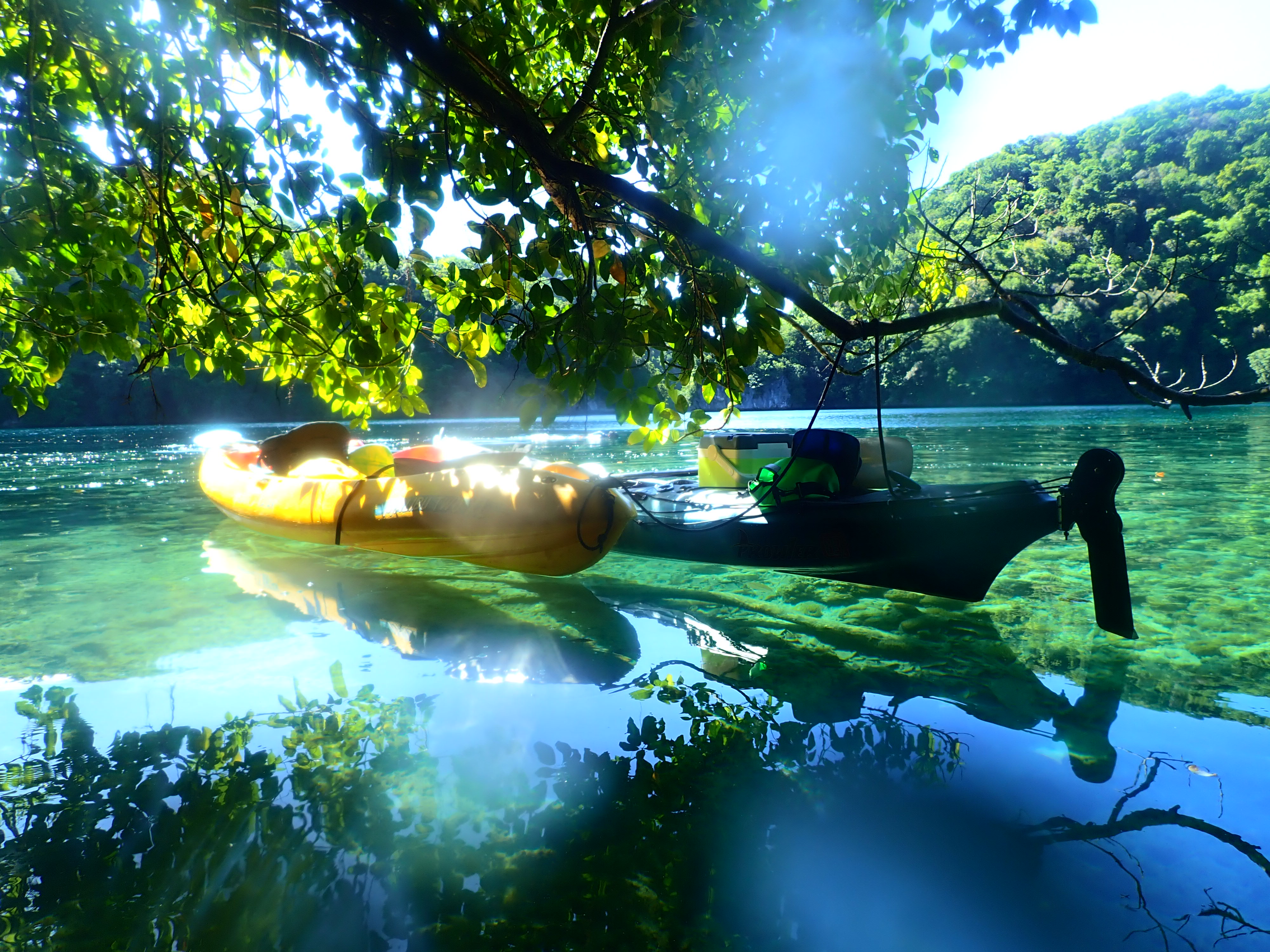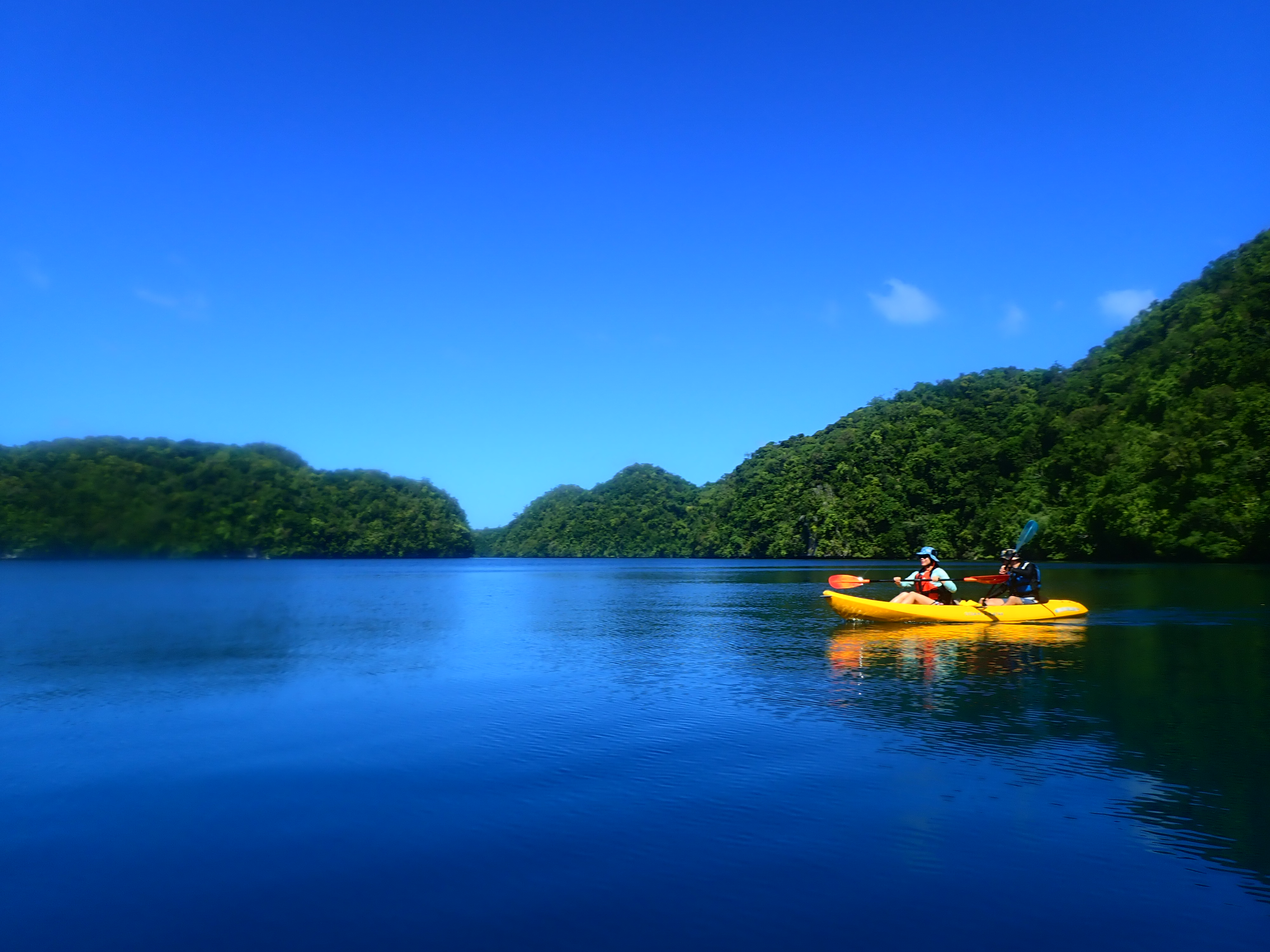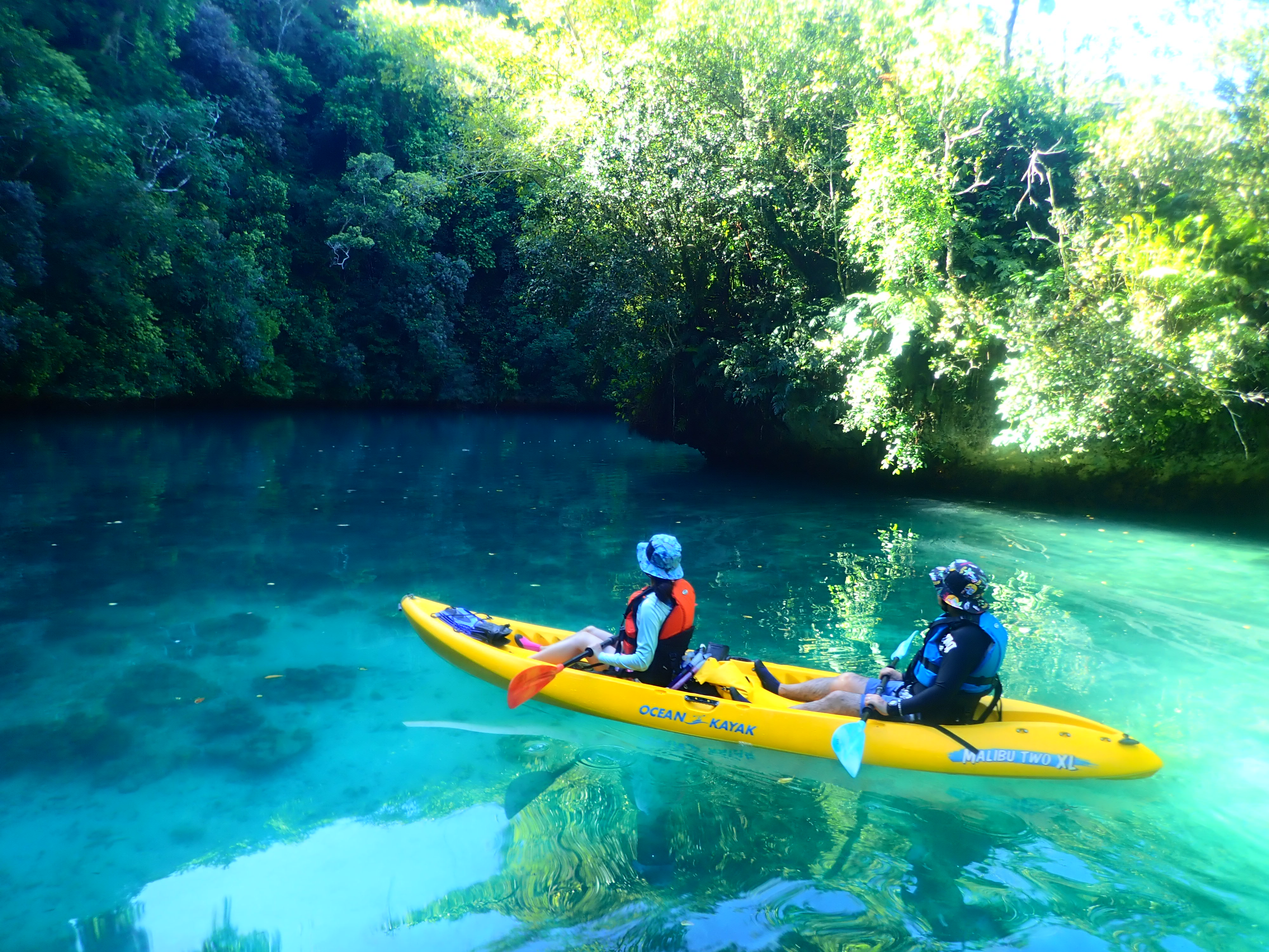 パラオ松島内の入り江をカヤッキング。透明度の良い海でのカヤックは楽しい一時。木陰での休憩もちょっと癖になります。