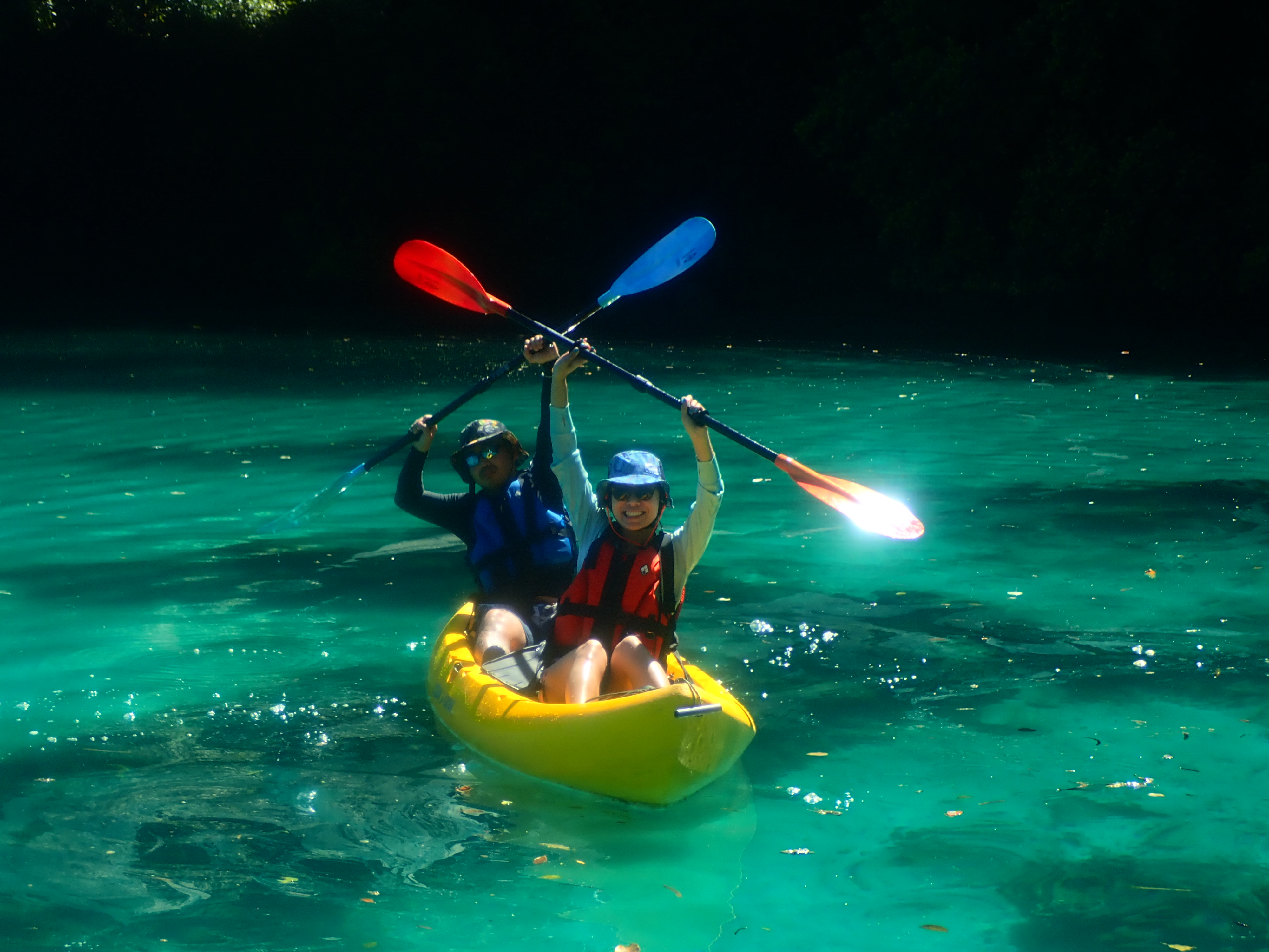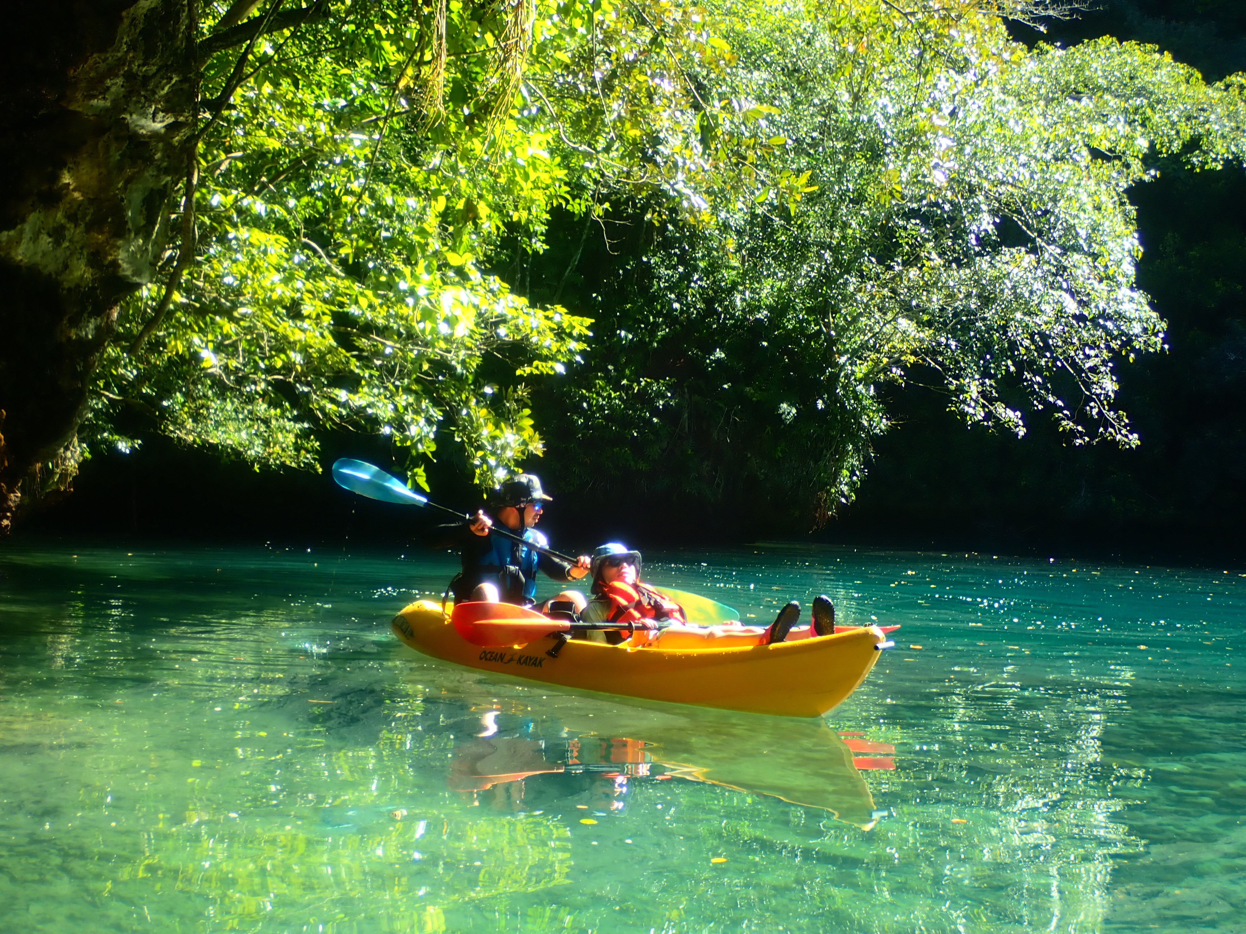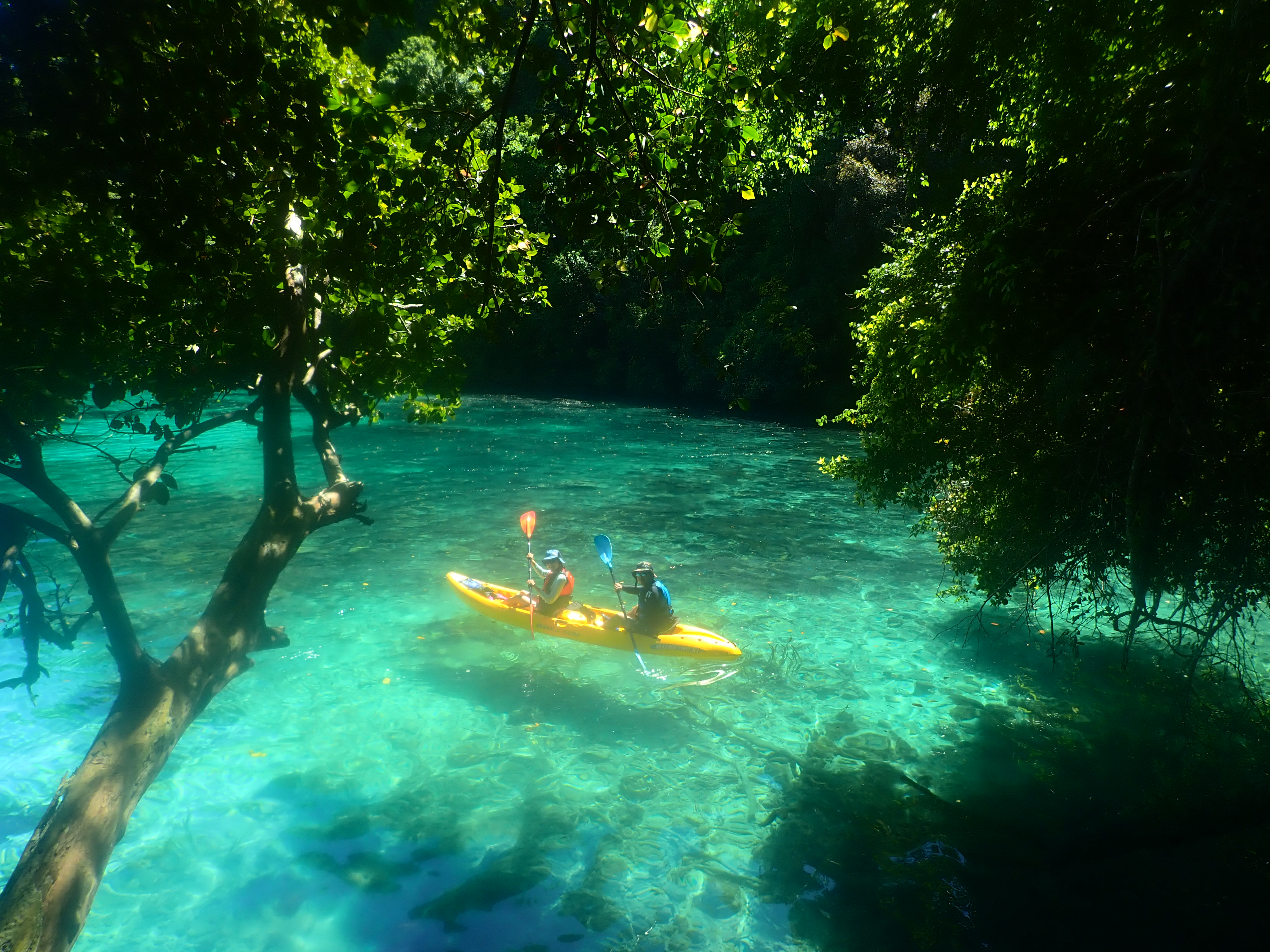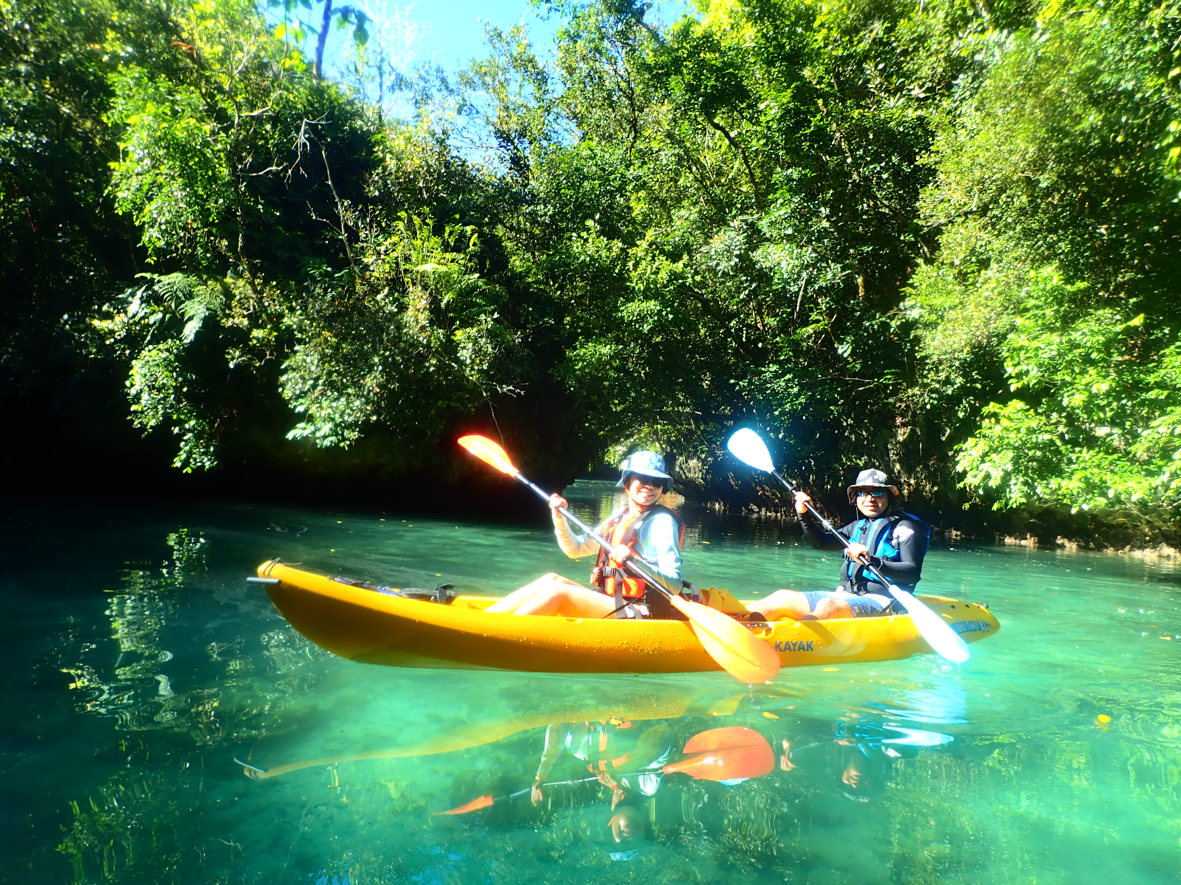 パラオ松島内の入り江をカヤッキング。透明度の良い海でのカヤックは楽しい一時。木陰での休憩もちょっと癖になります。