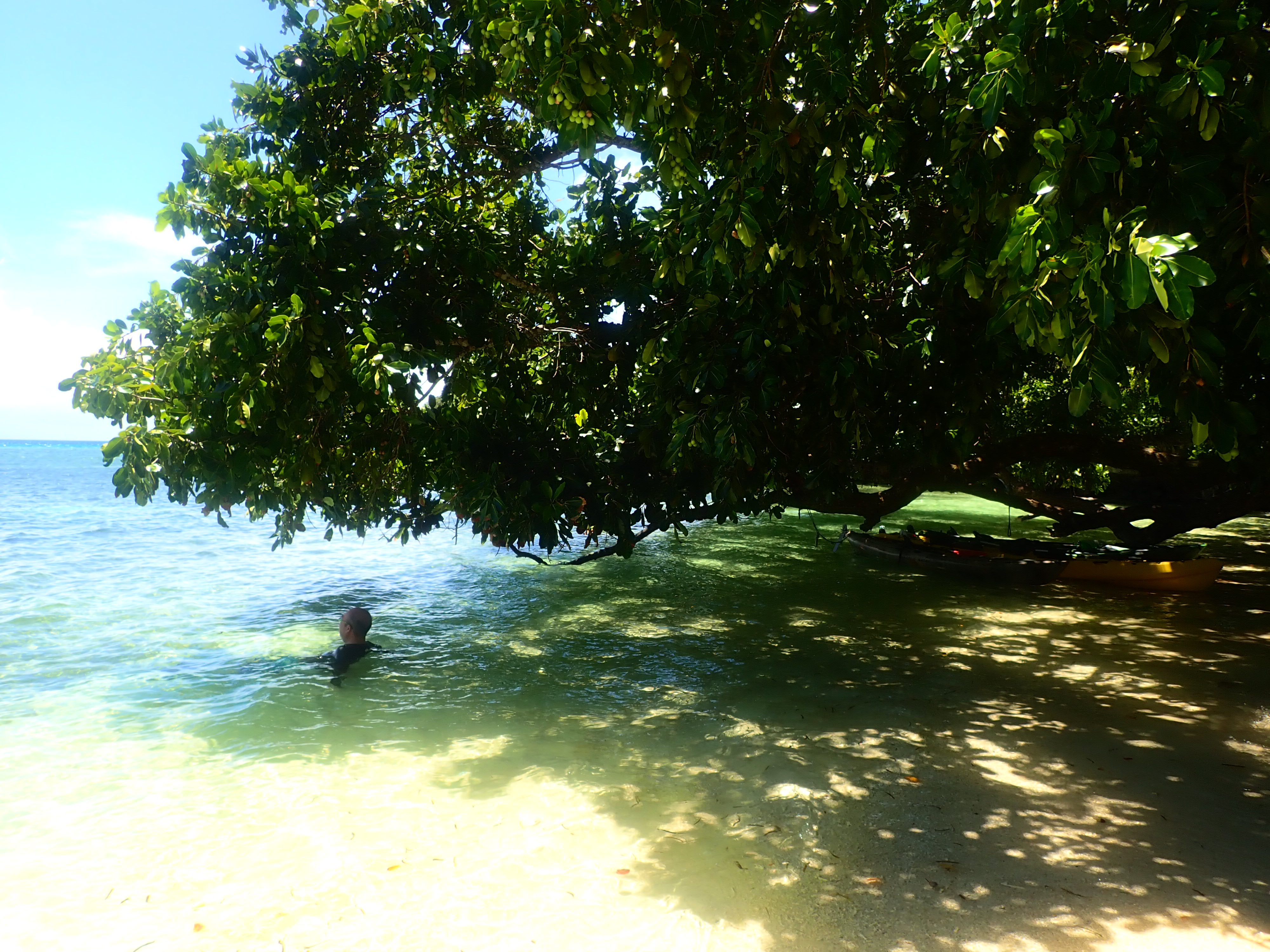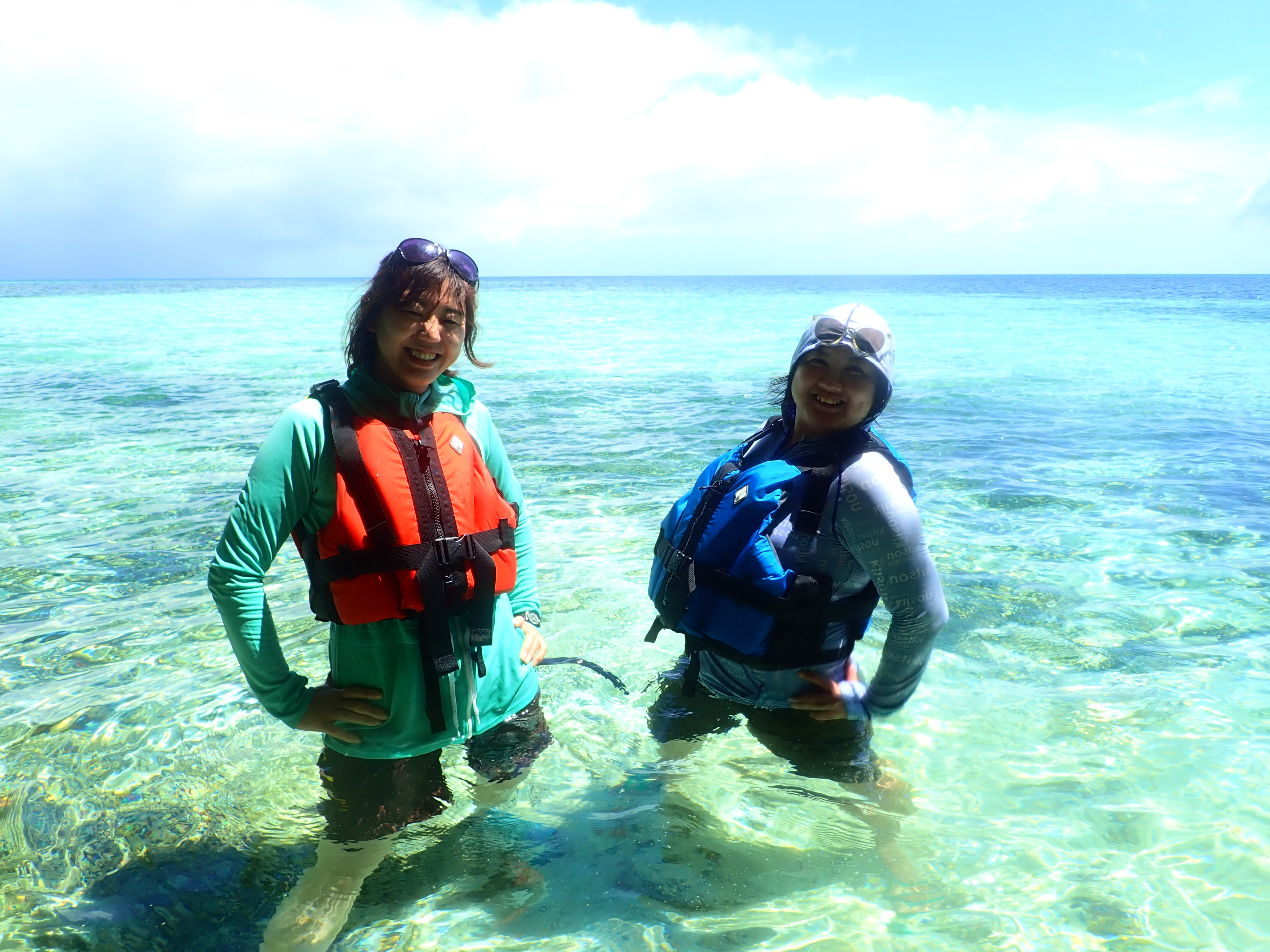 お昼休憩は無人島のビーチで。写真を撮ったり、のんびりと海を眺めたり。日本の季節は冬ですが、パラオはだいたい夏休み。