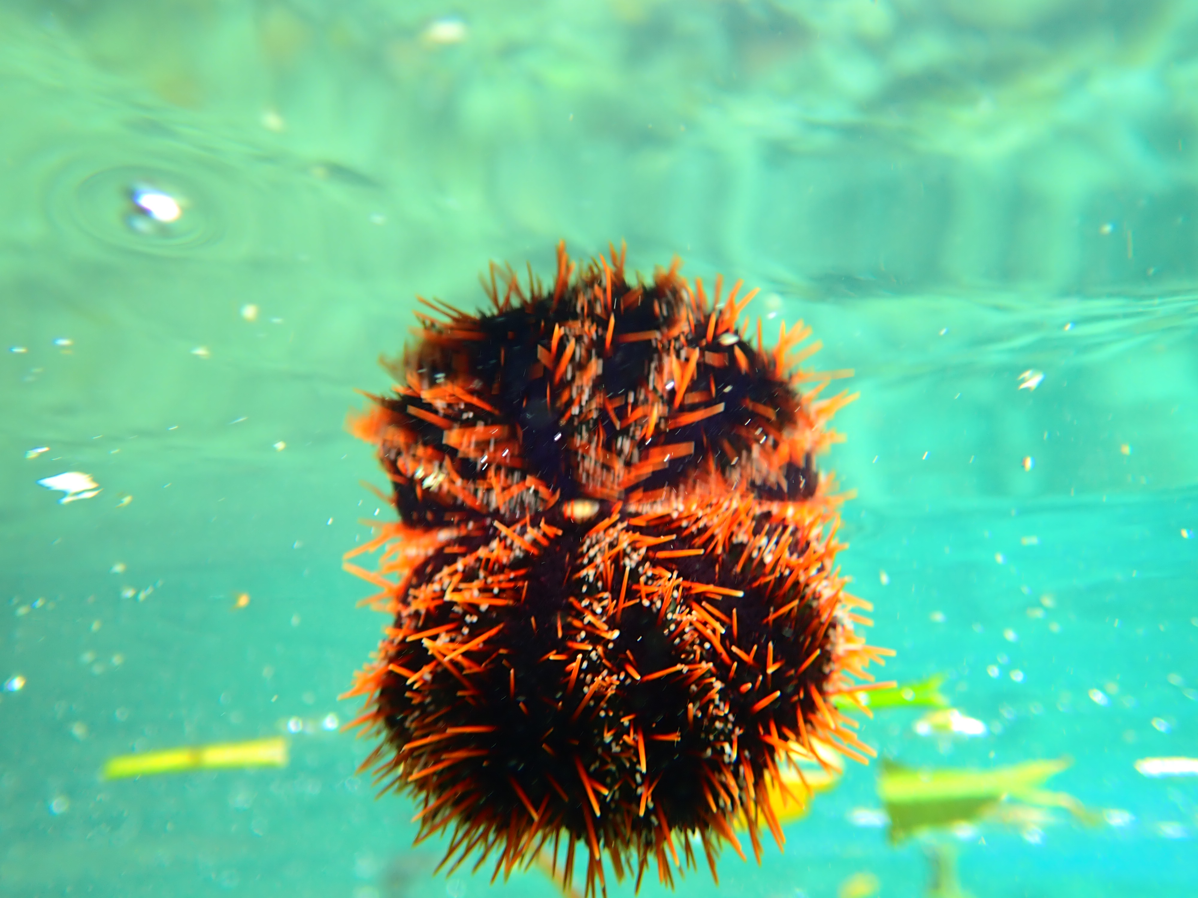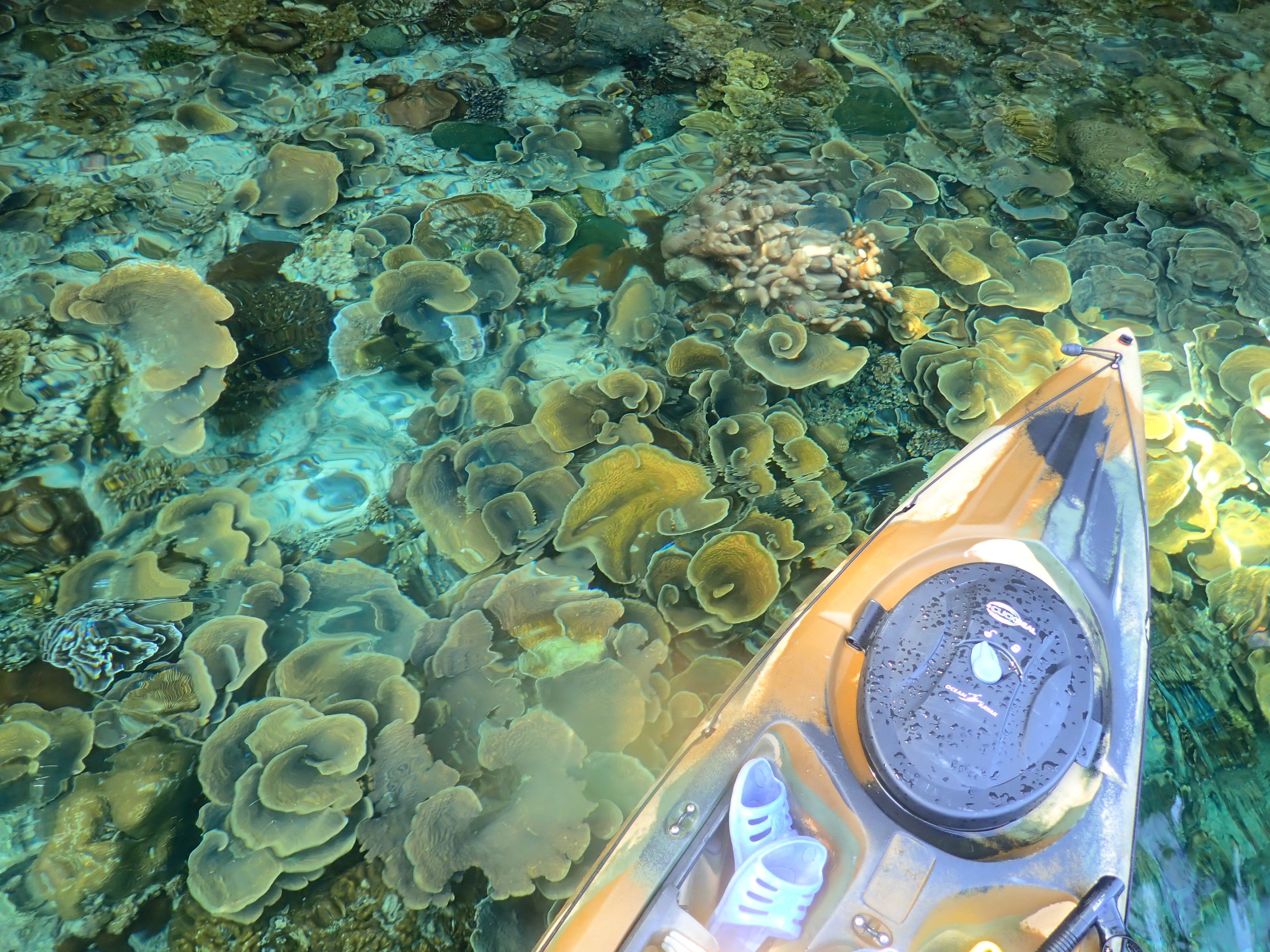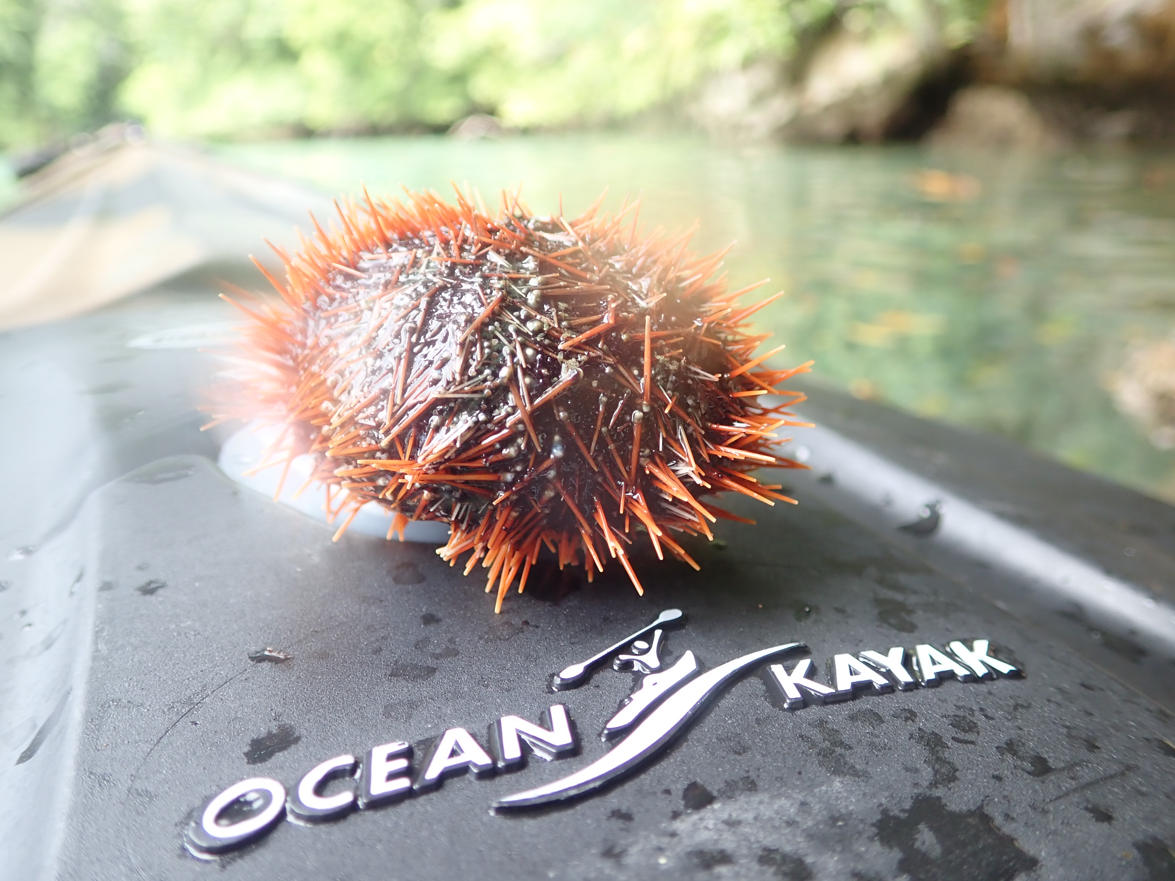 ん?何か見慣れない物体が浮いていました。まだ生きているウニが流れて浮いていたようです。カヤックの上に乗せるとモゾモゾと動いていました。小さなウニですが、ローカルはこのウニも食べます。実は極少量ですが、味はちゃんとウニです。