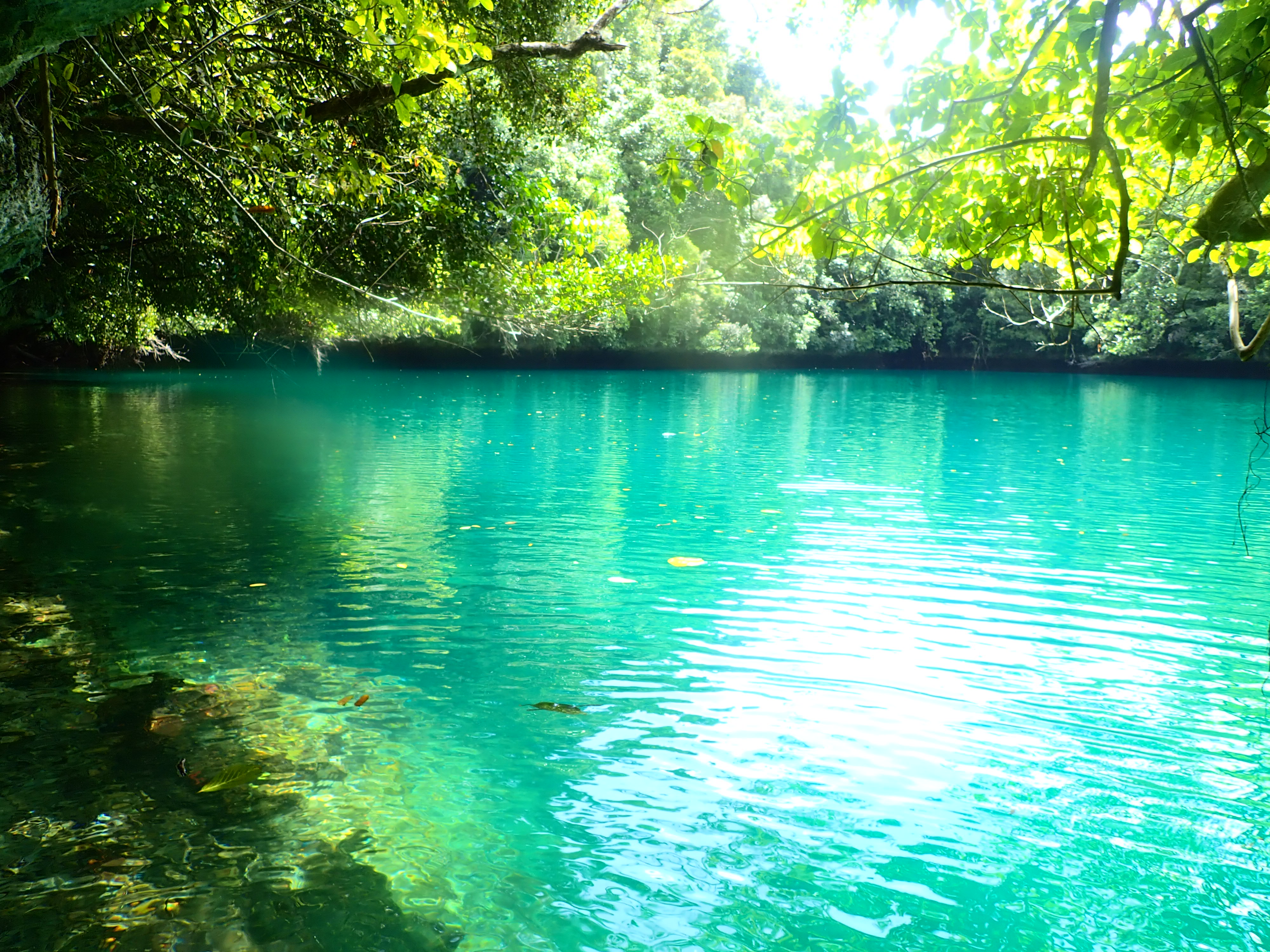 入り口付近の淡い色合いが美しいエメラルドケイヴ。洞窟内では耳を澄ますと、キィキィと鳴き声が聞こえるのはコウモリの鳴き声。