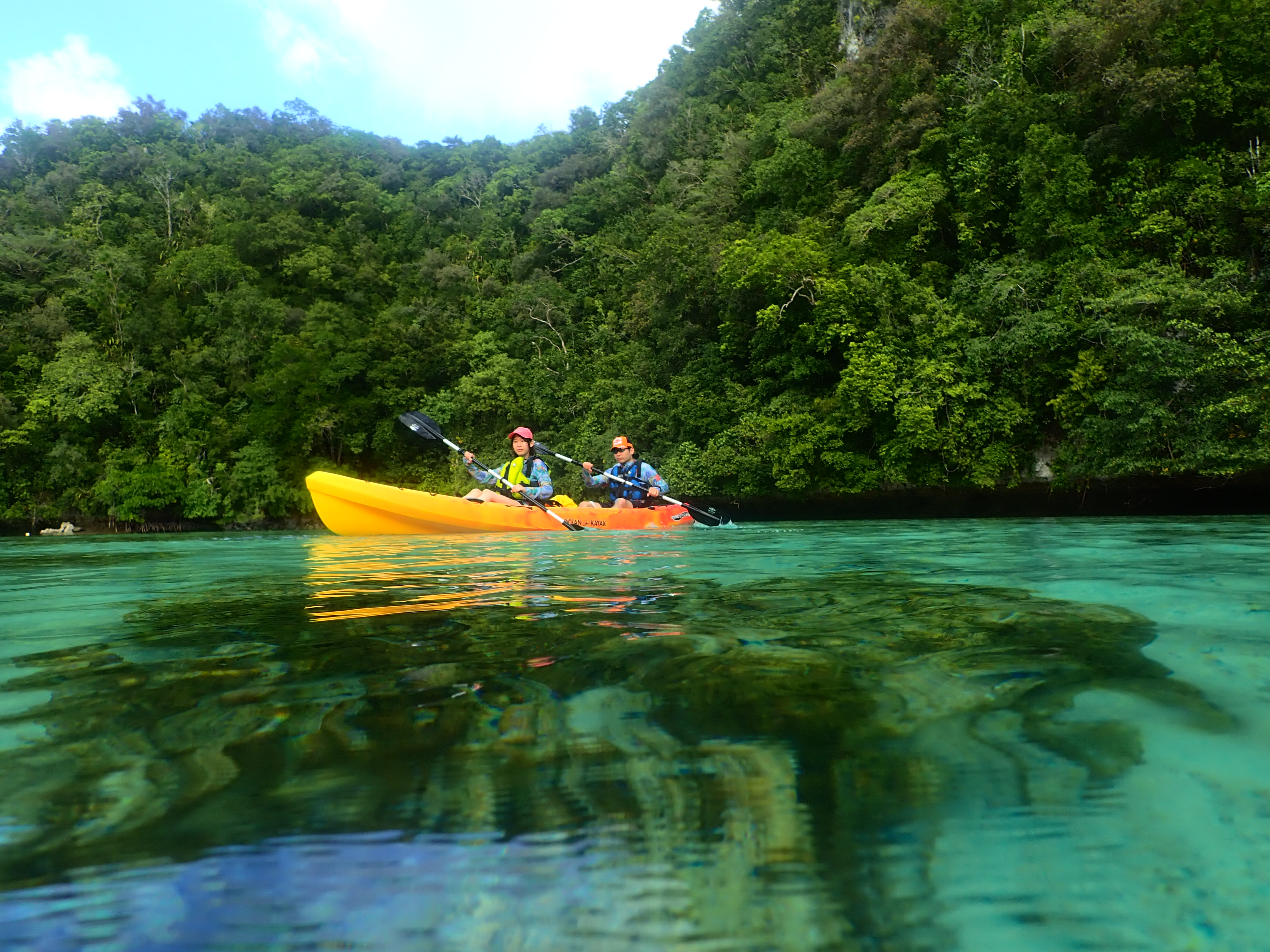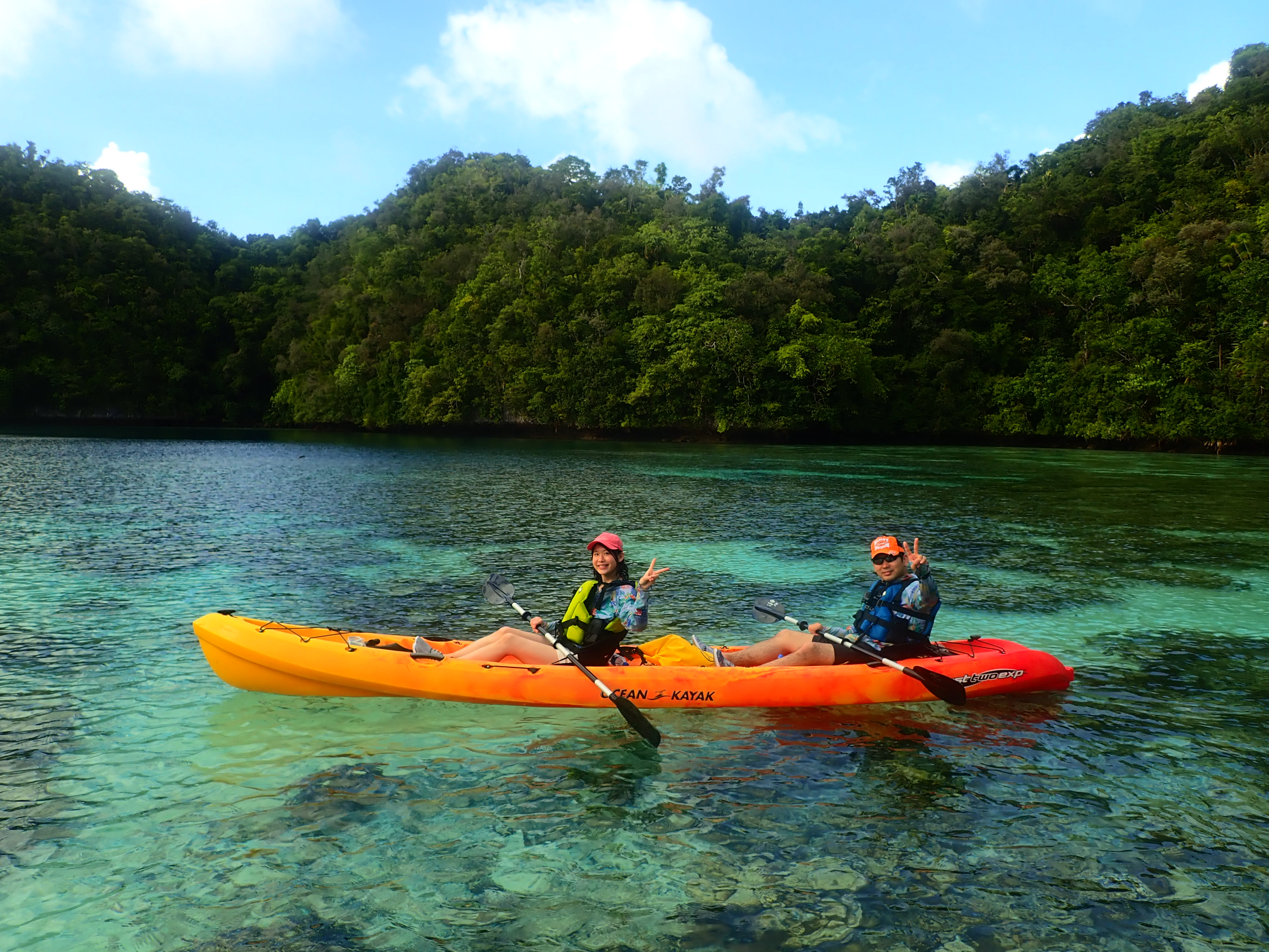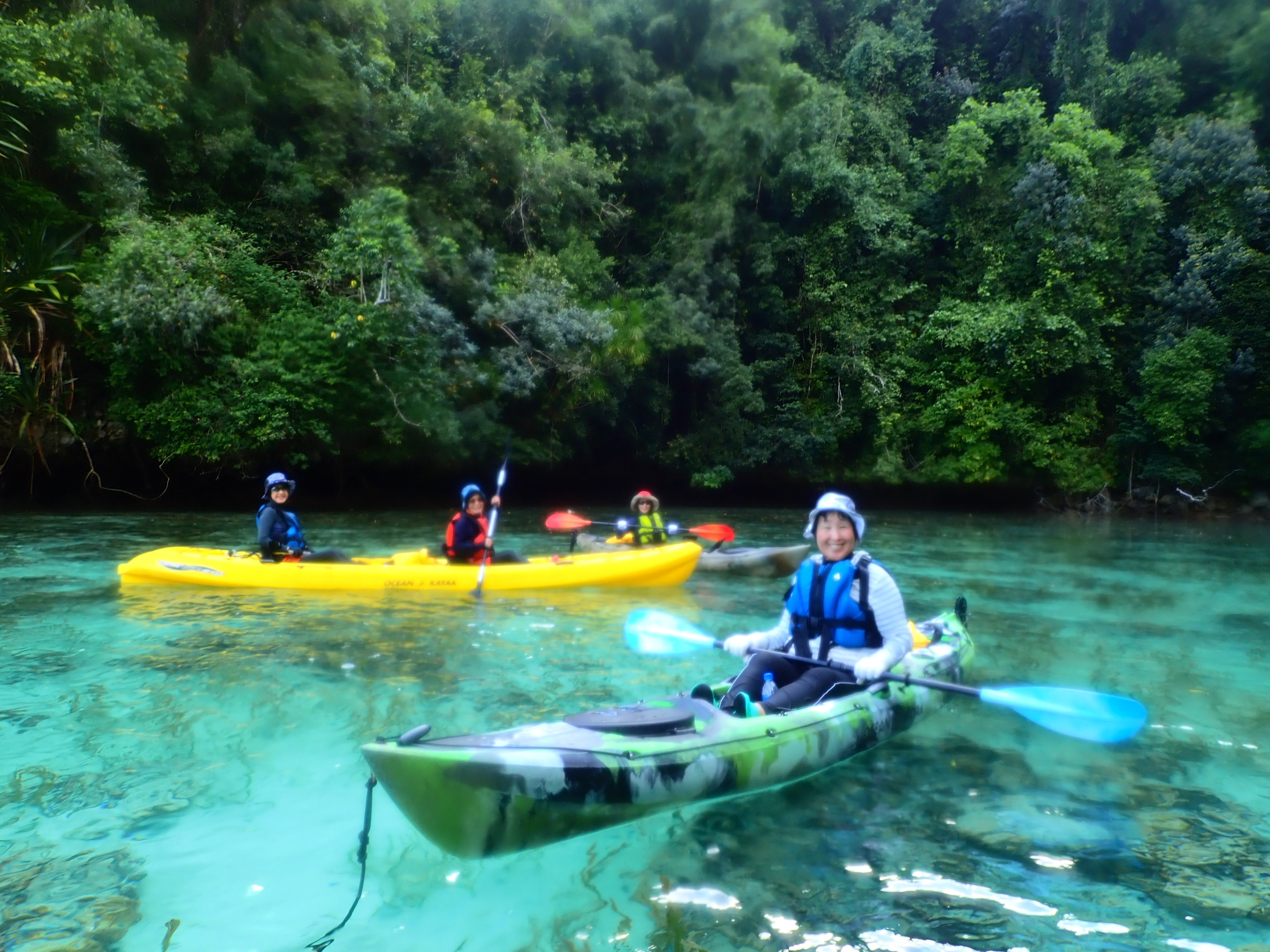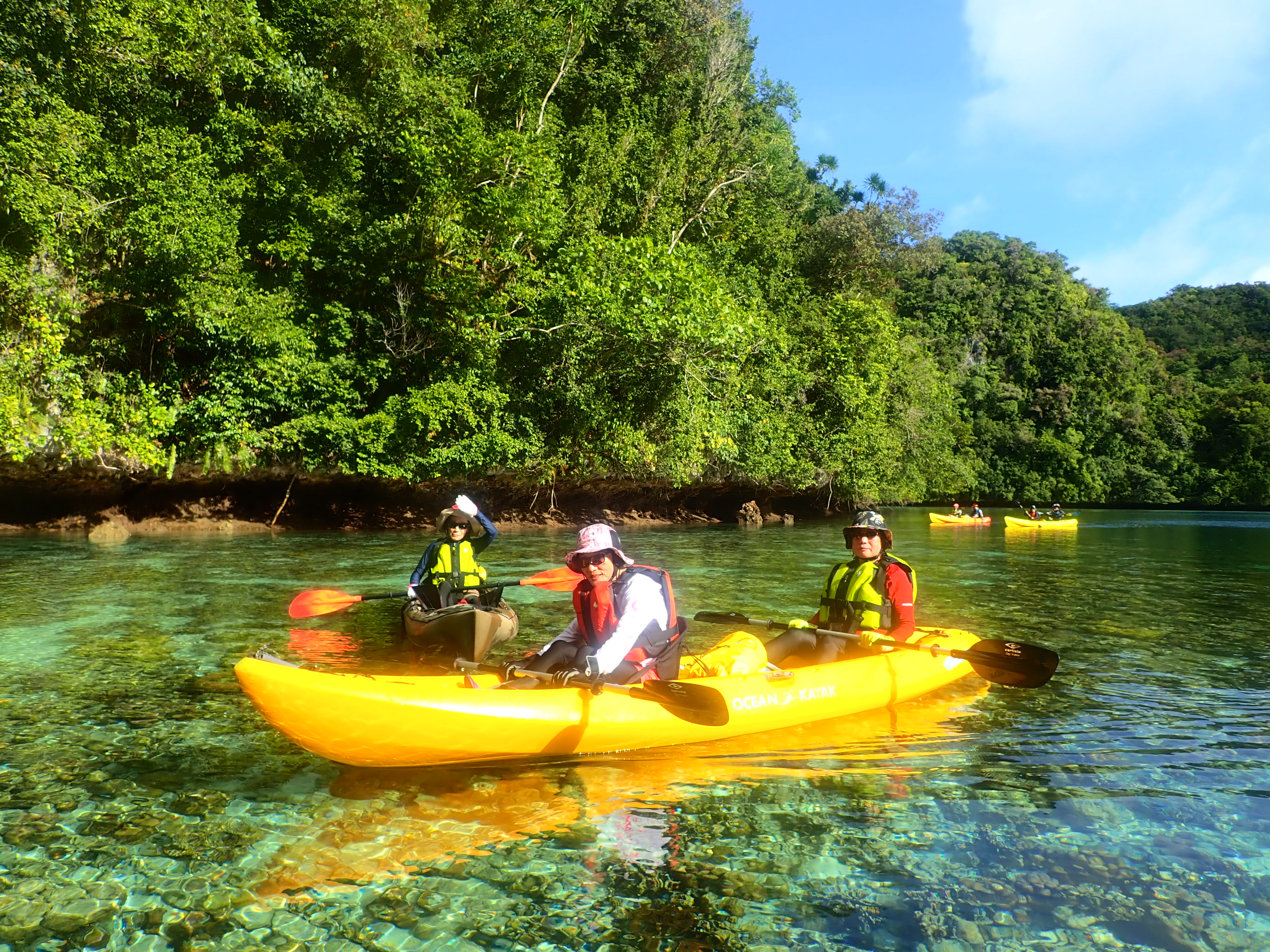 スノーケル後ももちろんカヤック。ひと泳ぎすると不思議と皆さん、上手く漕げるようになることが良くあります。おそらく、ひと泳ぎして、少し疲れると肩の力が抜けて自然体で漕げるからではないかと考えています。カヤックを漕ぐ際は少し力を抜いて自然体がおすすめです。