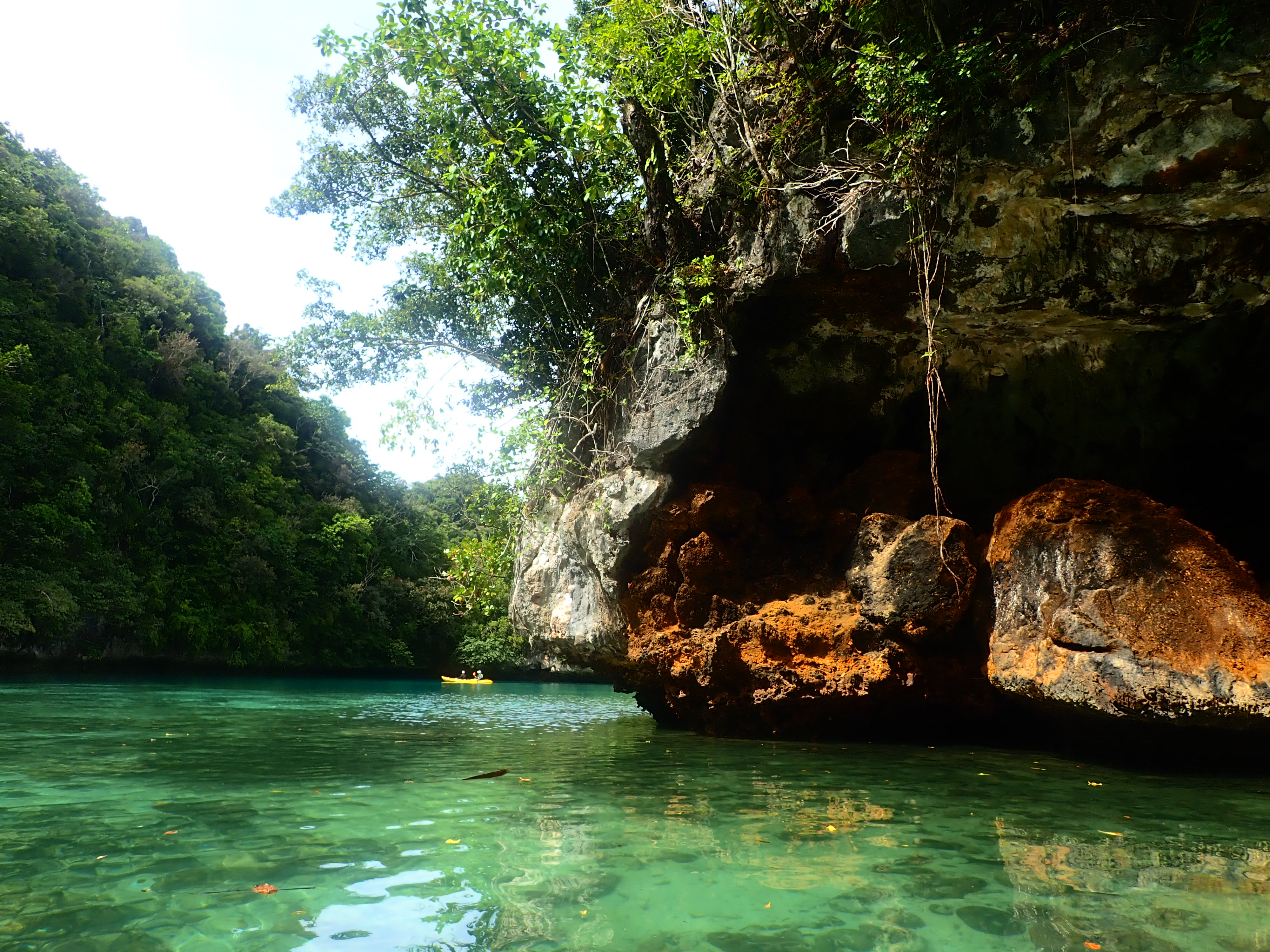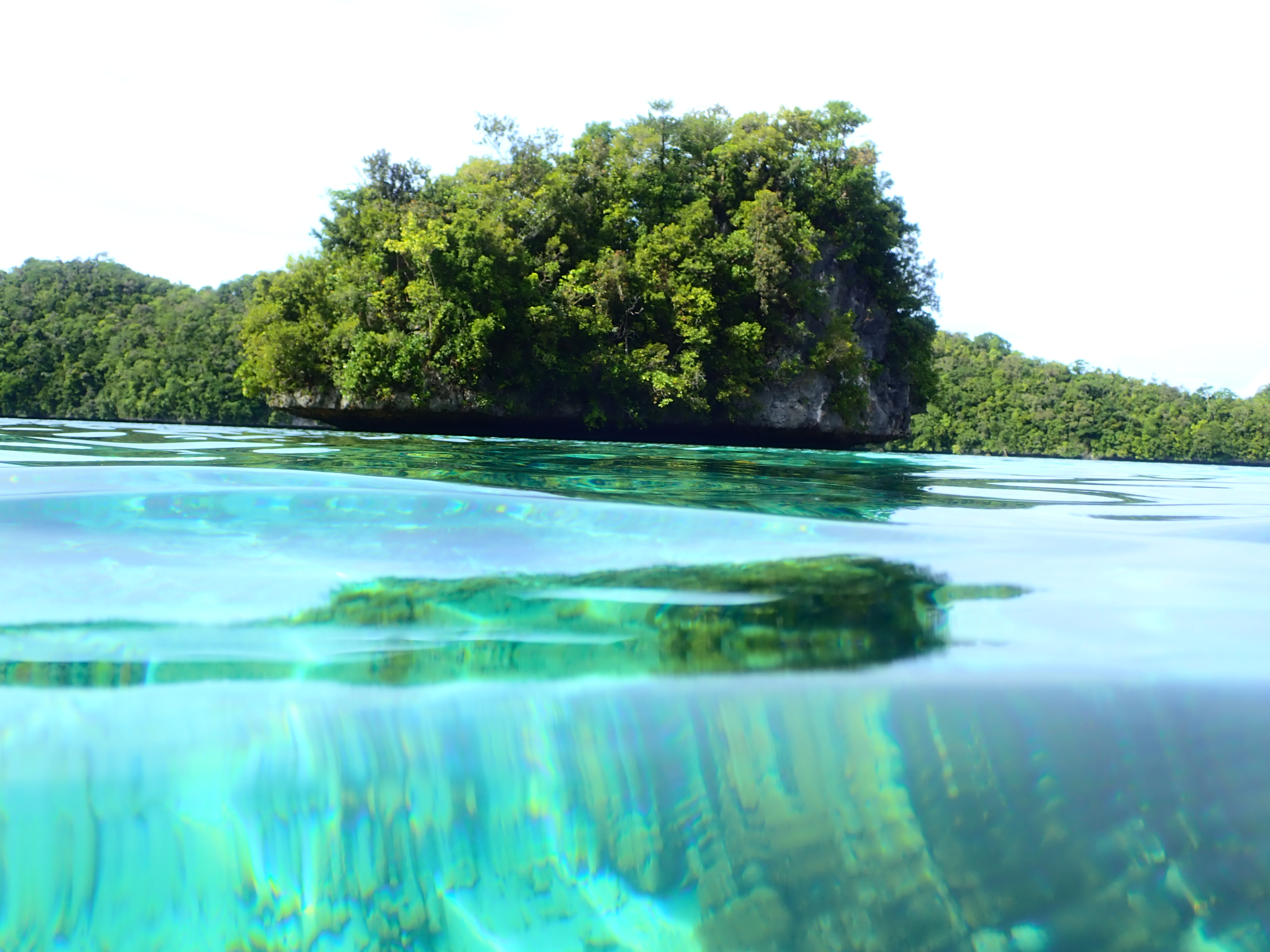 ロックアイランドの上には場所によってパラオの国花ホワイトトランペットフラワーが見えます。