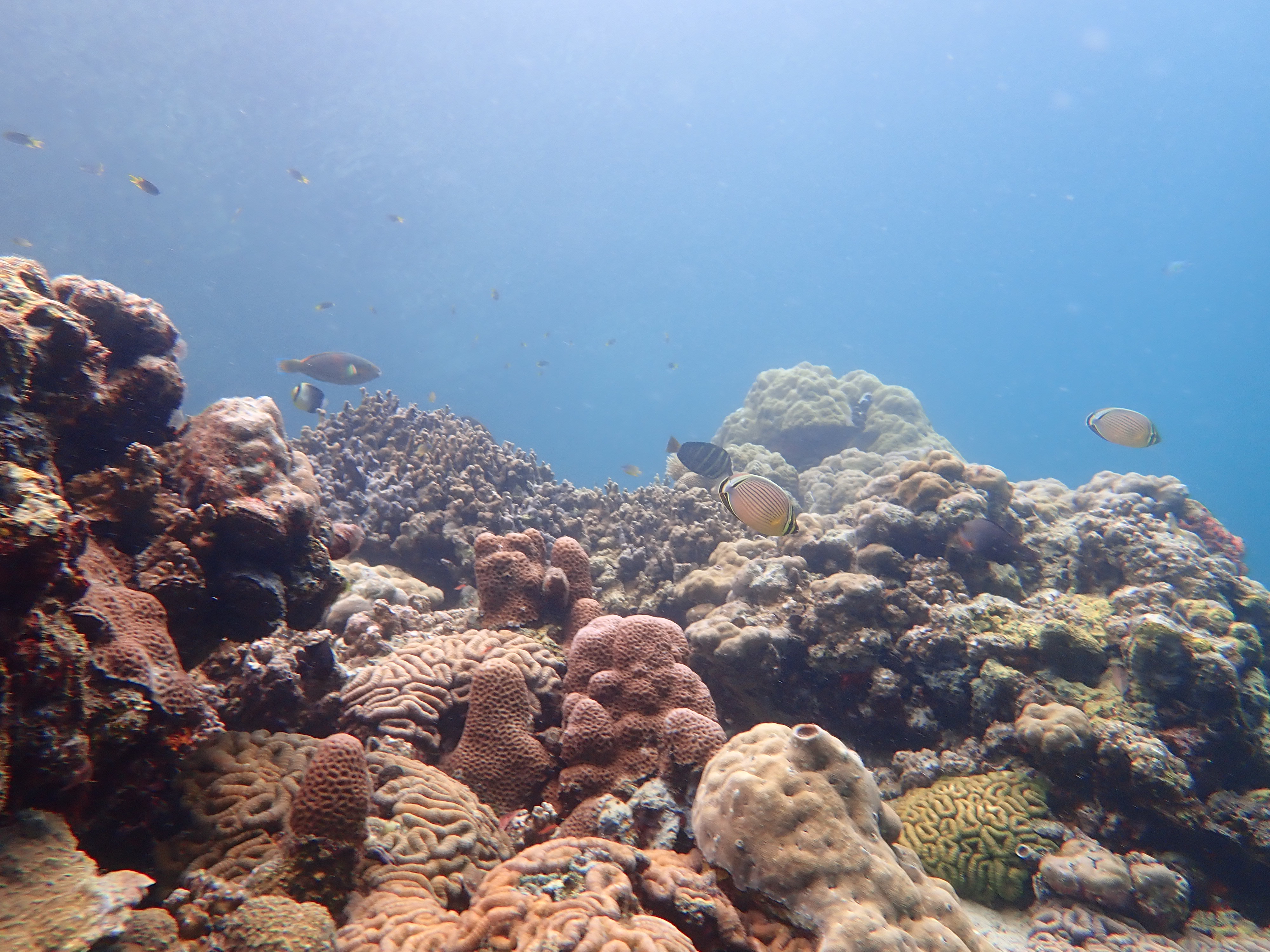 場所を変えてスノーケル。こちらも流れも少なく、穏やか。のんびりと魚や珊瑚を見る事ができます。