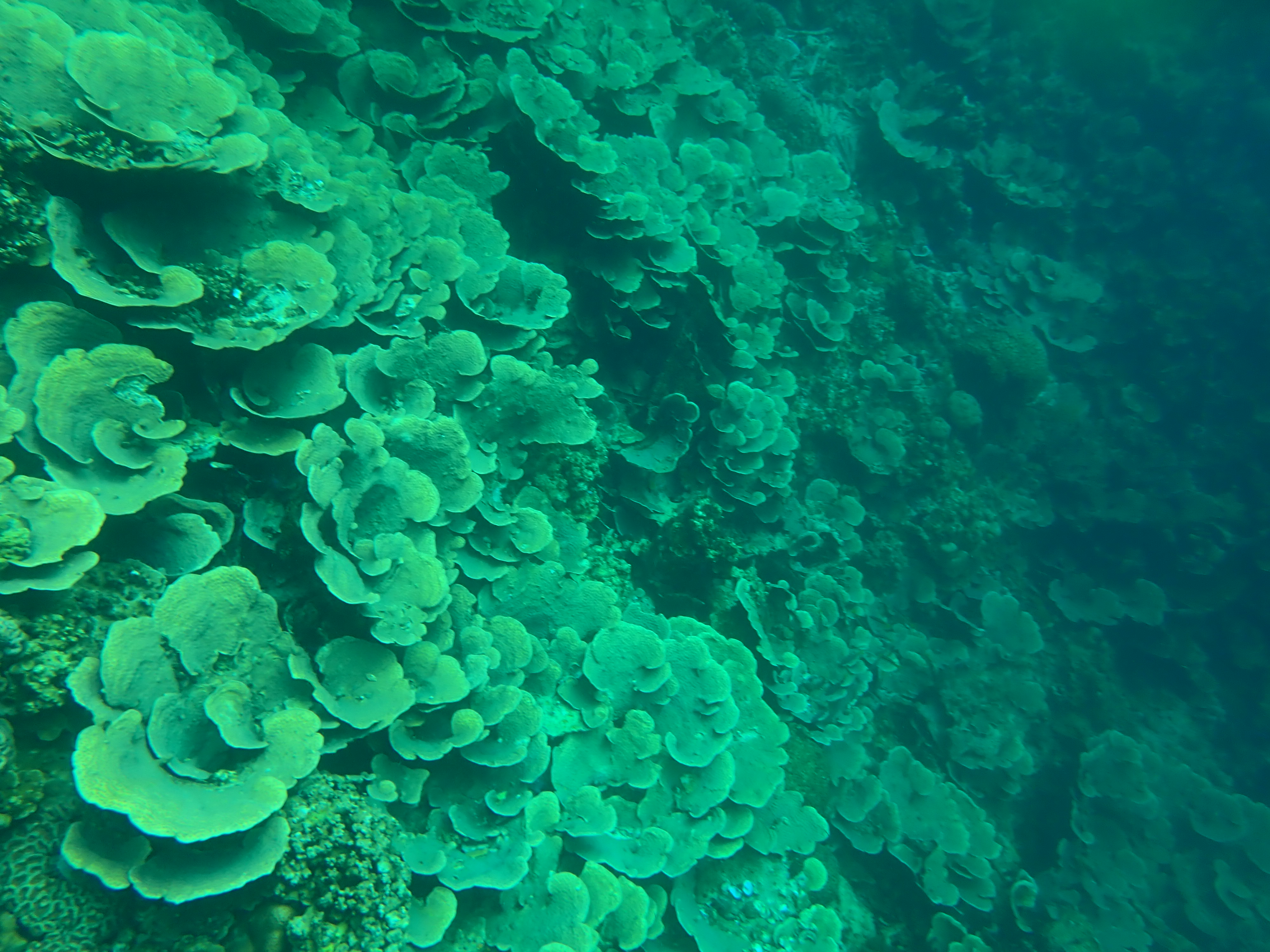 カヤックの上からでも綺麗に見えるキャベッジコーラル。水中を取ると海の中がキャベツ畑のようになっています。