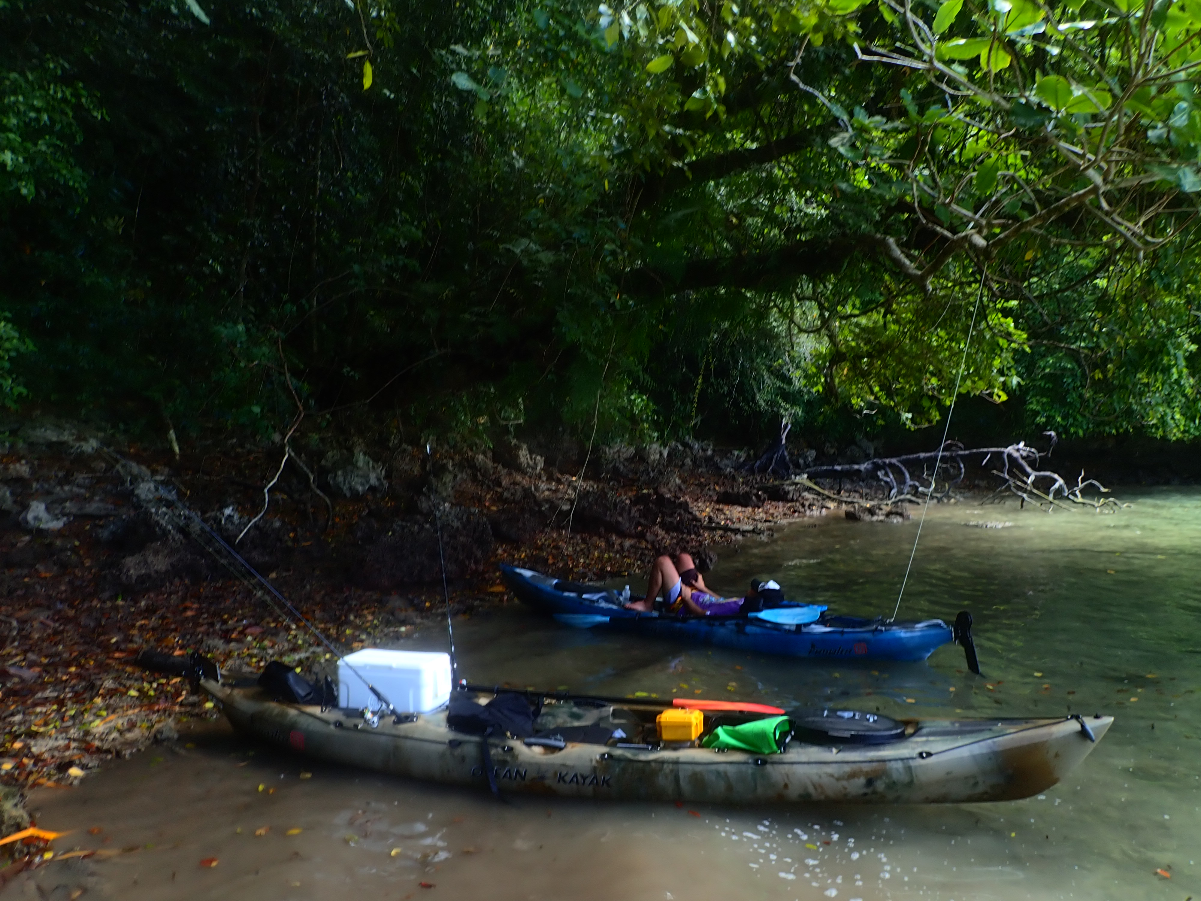 という訳で時間もお昼時だったので、ロックアイランドの岩場で釣った魚で天ぷら&ソーメンランチ。お昼の後は洞窟にも行きました。眠くなったら、ジャングルの木漏れ日が心地よいカヤックの上で昼寝。
