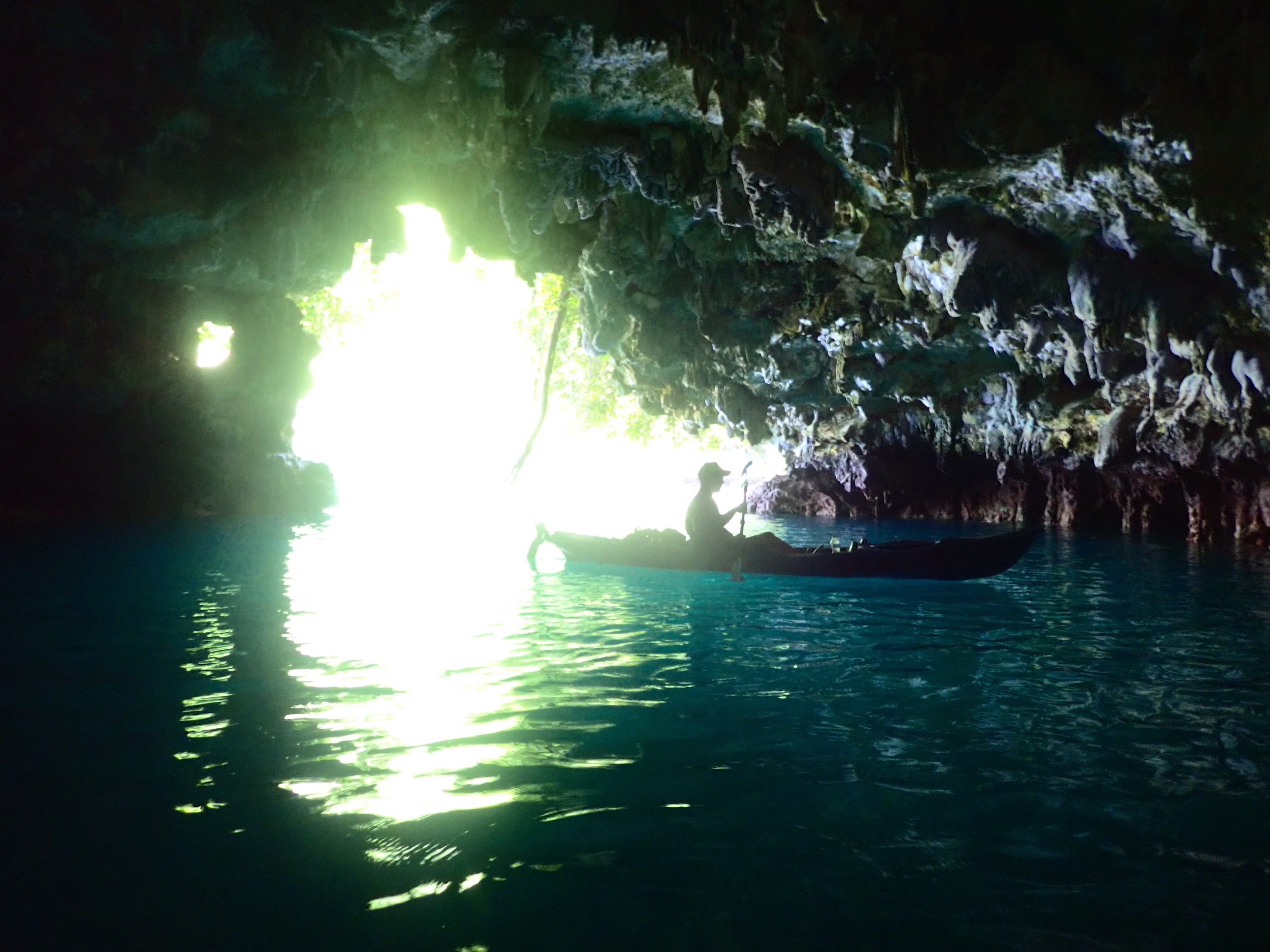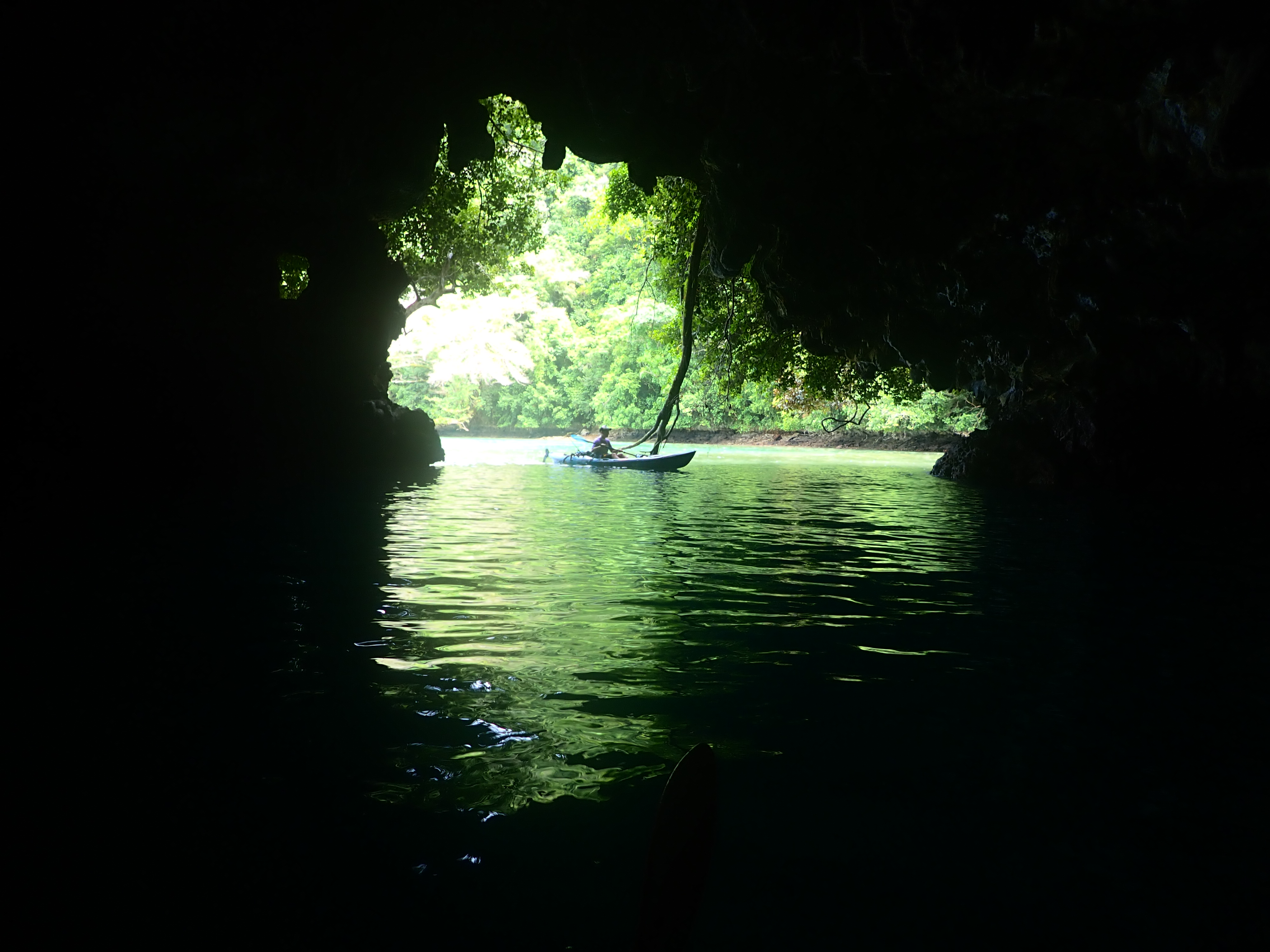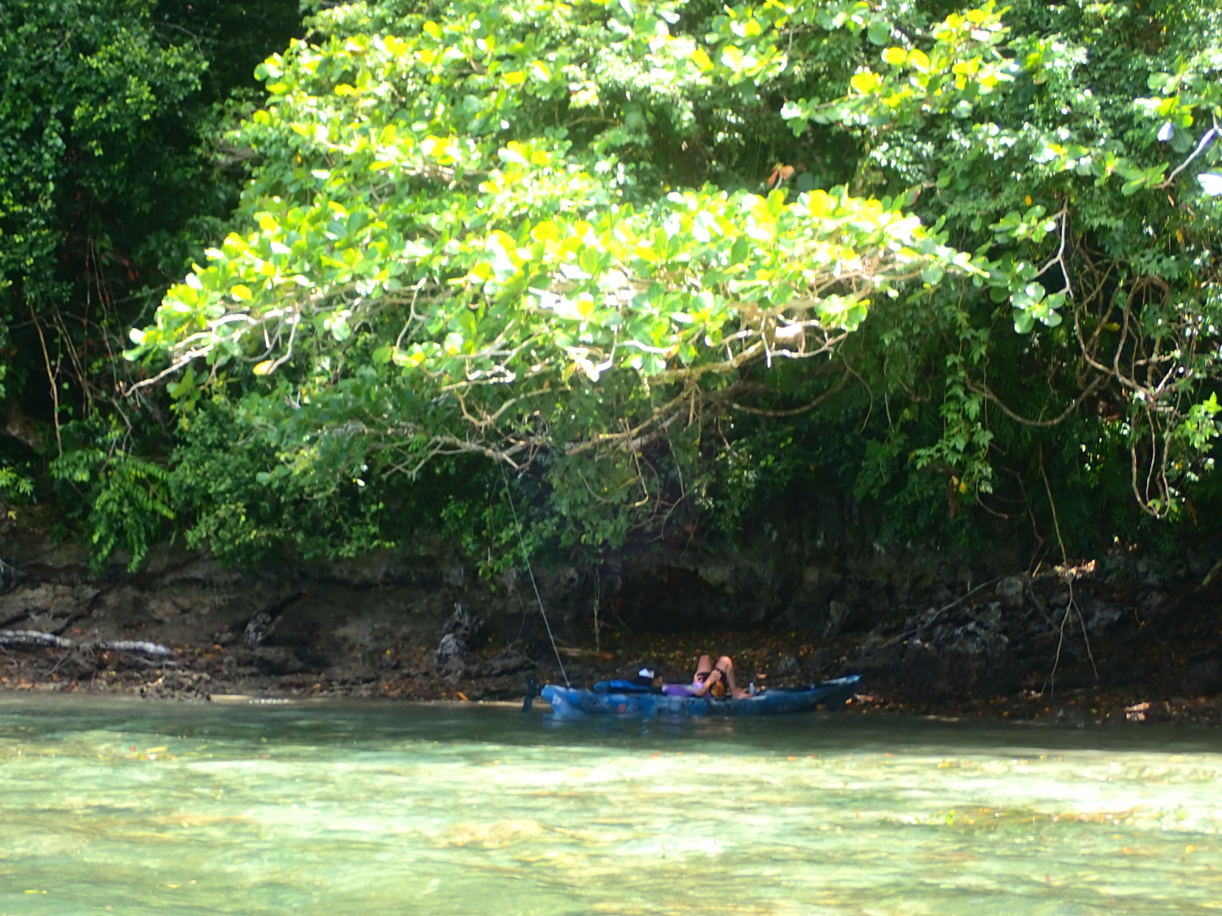 という訳で時間もお昼時だったので、ロックアイランドの岩場で釣った魚で天ぷら&ソーメンランチ。お昼の後は洞窟にも行きました。眠くなったら、ジャングルの木漏れ日が心地よいカヤックの上で昼寝。