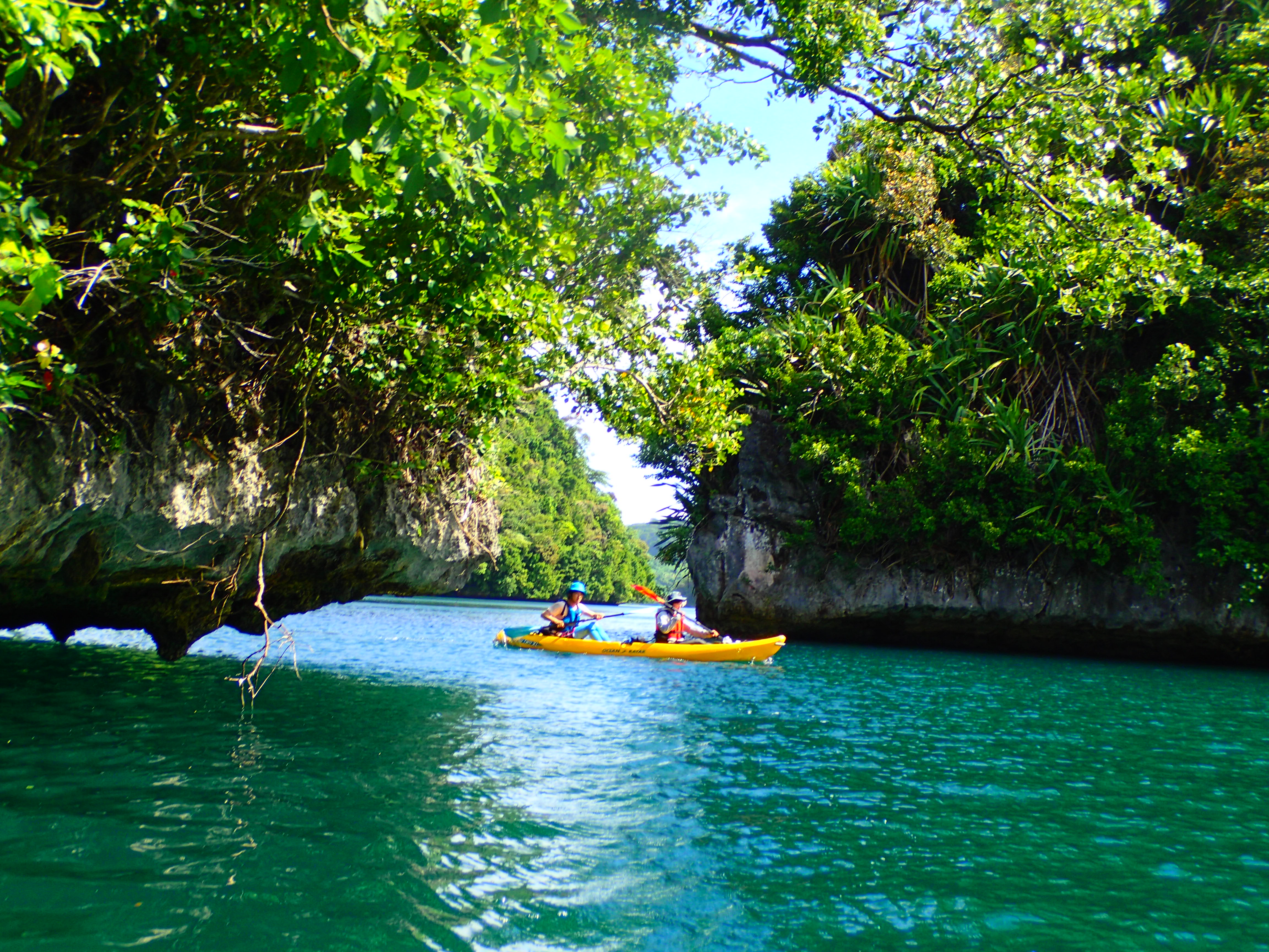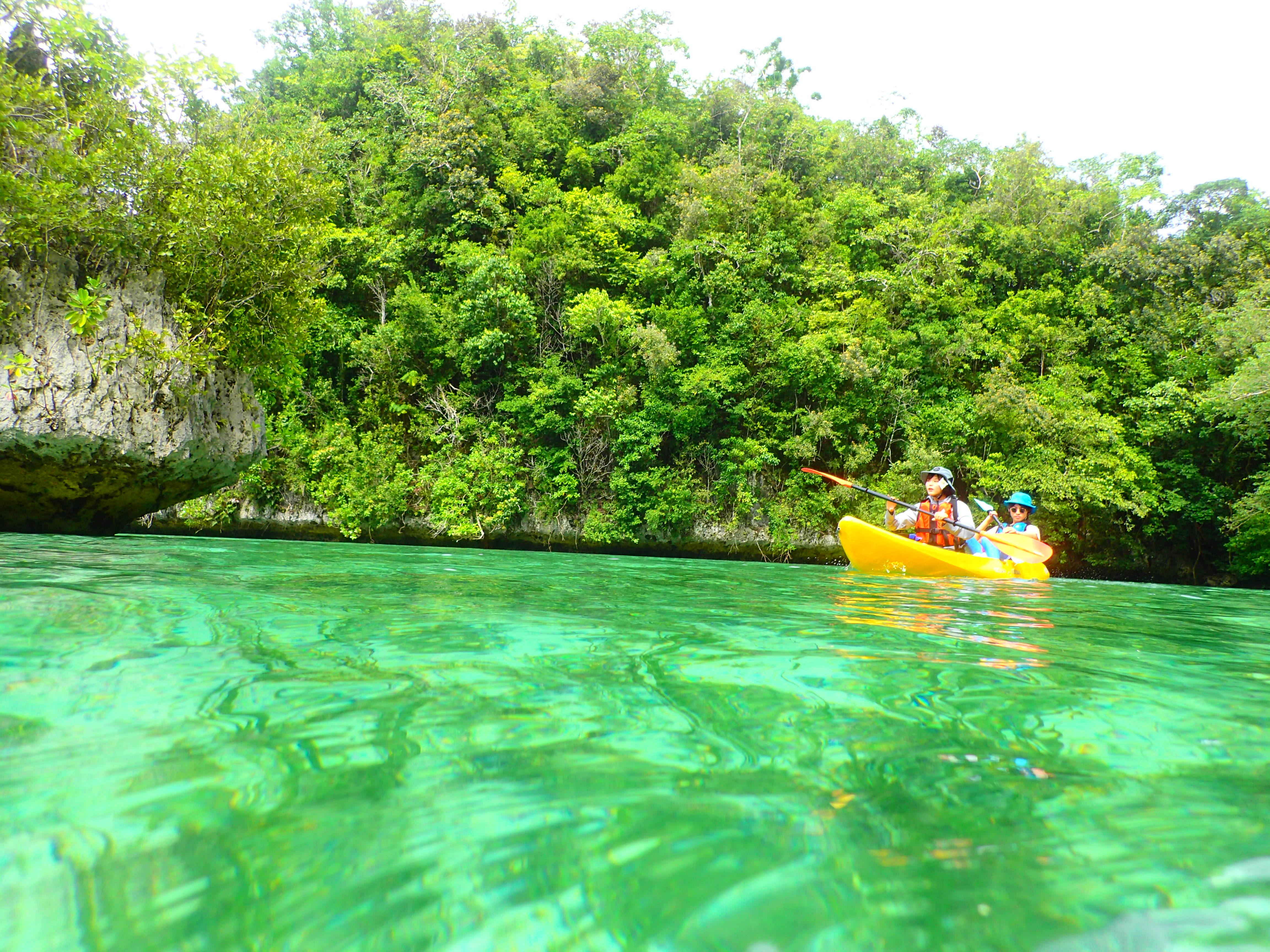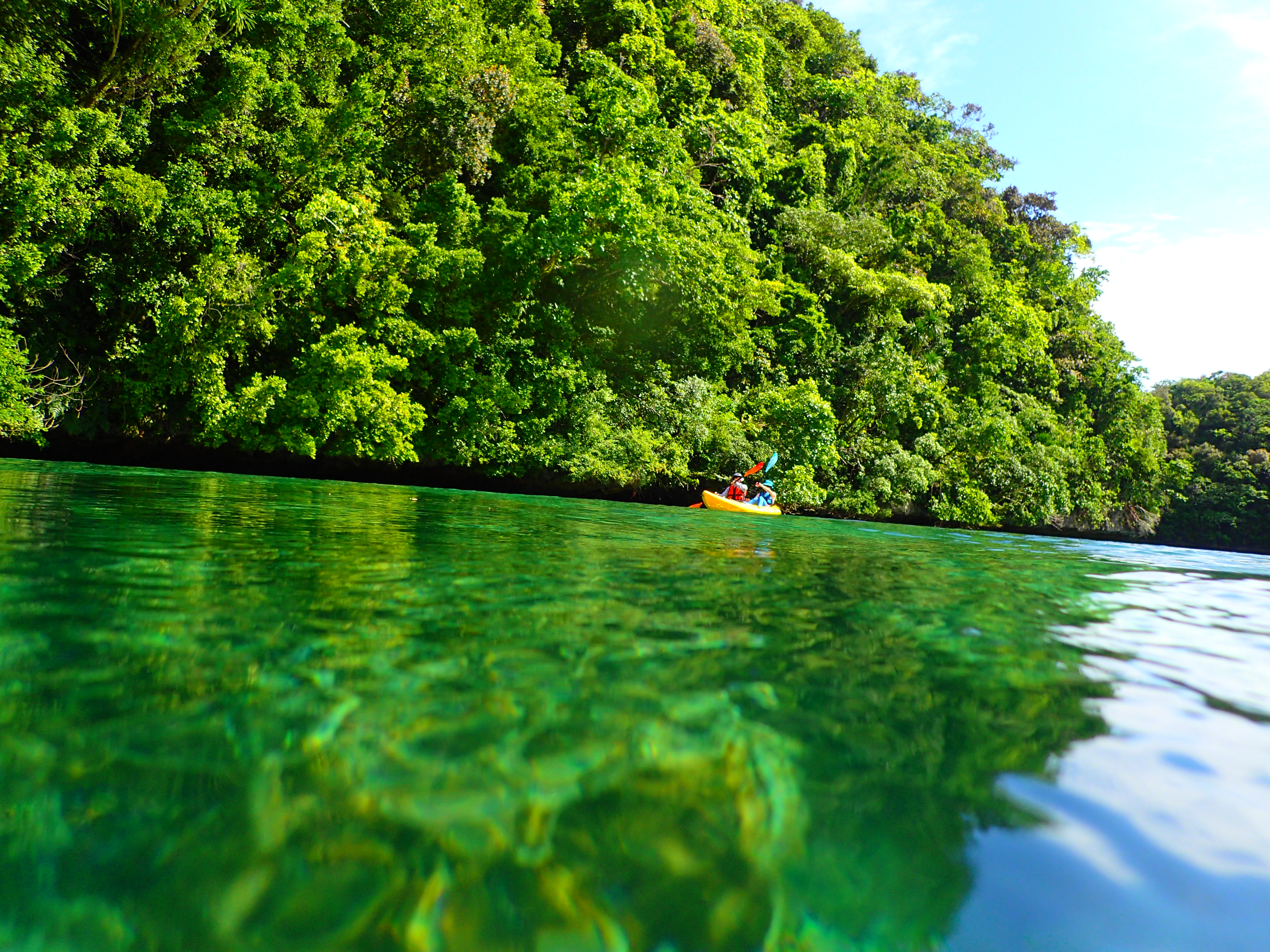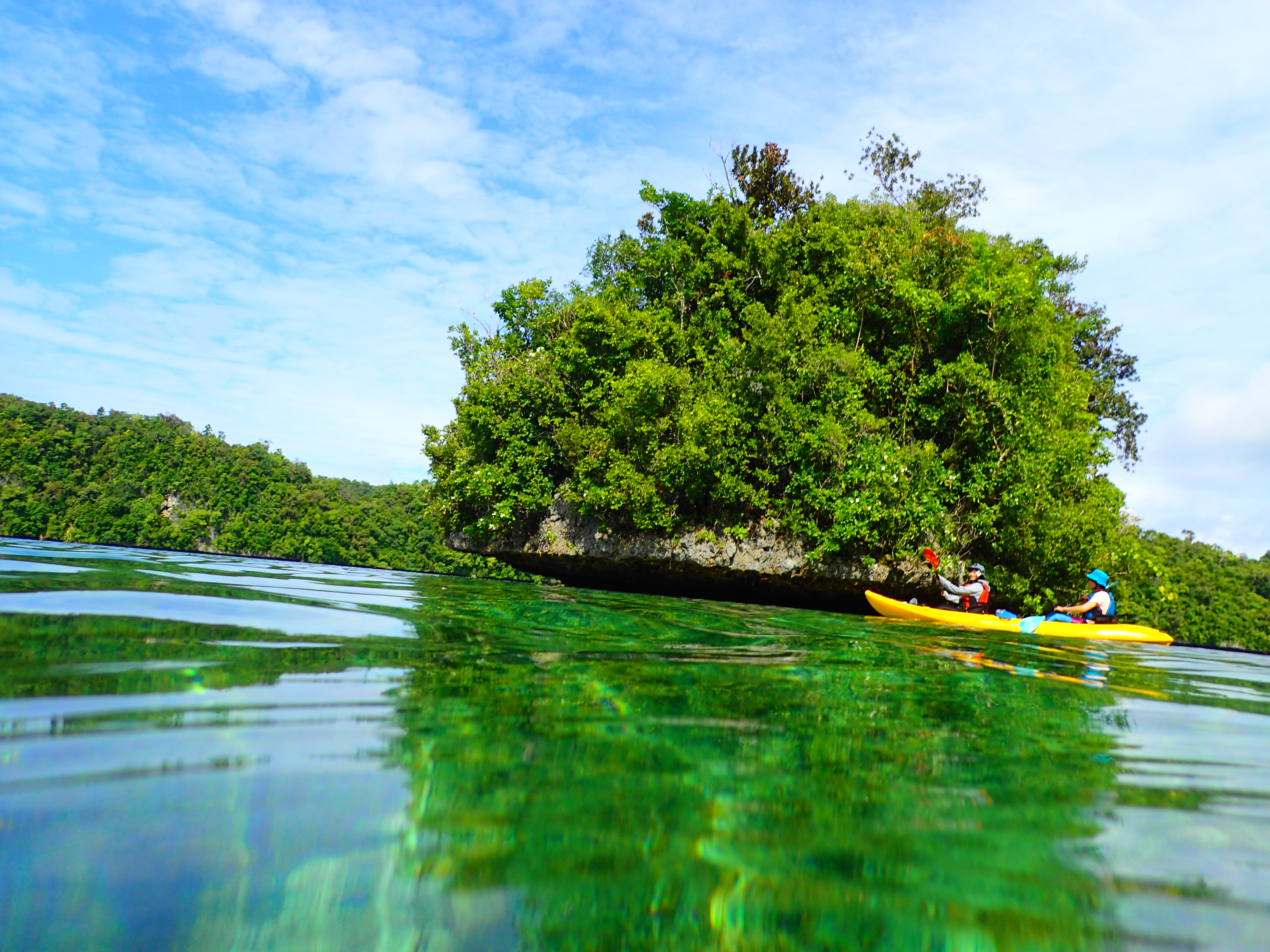 普段は半日ではここまで漕ぎませんが、コツを掴むと意外と進めちゃうんです、カヤック。またパラオ松島と呼ばれる穏やかな入江は波も無く、